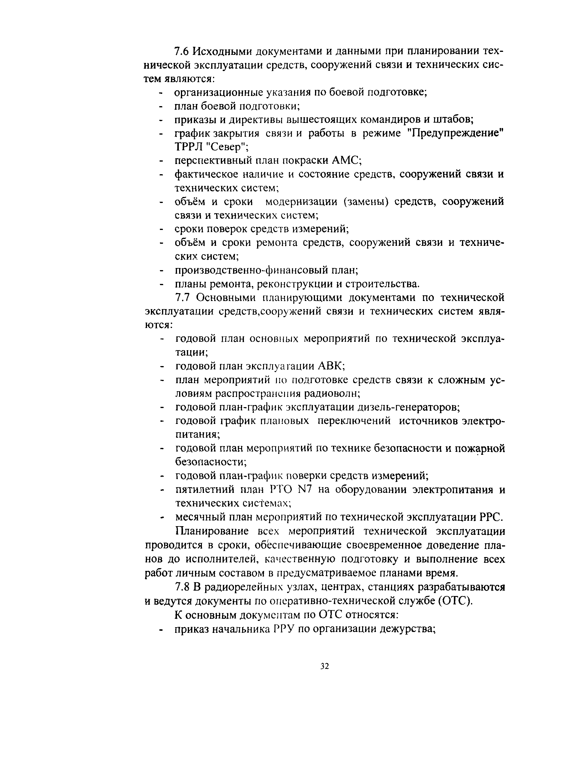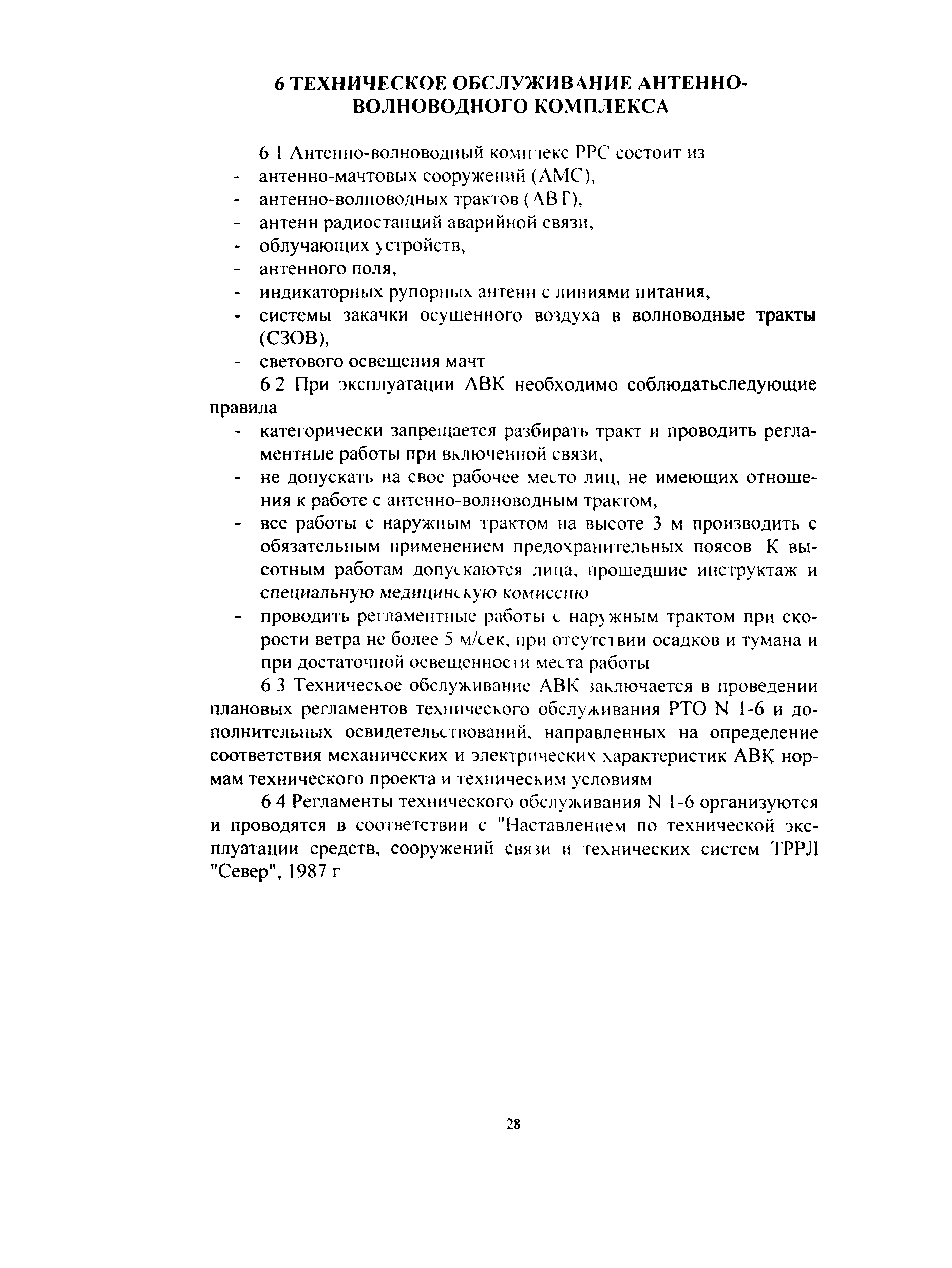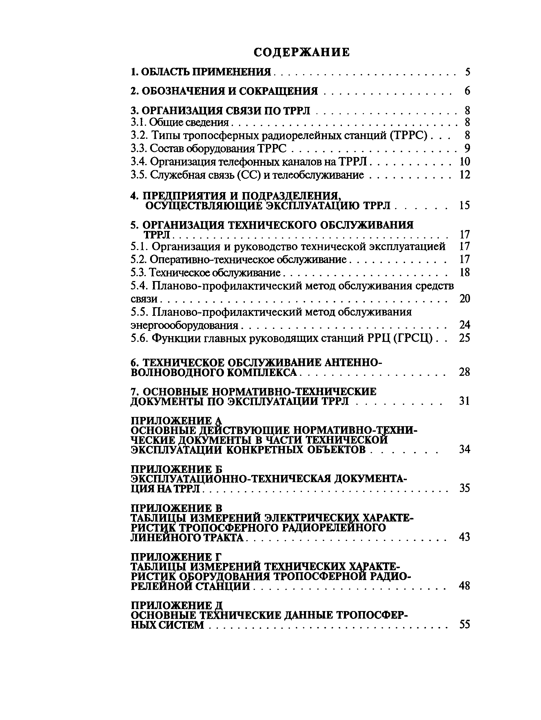 | Оглавление: | 1 Область применения 2 Обозначения и сокращения 3 Организация связи по ТРРЛ 4 Предприятия и подразделения, осуществляющие эксплуатацию ТРРЛ 5 Организация технического обслуживания ТРРЛ 6 Техническое обслуживание антенно-волноводного комплекса 7 основные нормативно-технические документы по эксплуатации ТРРЛ Приложение А. Основные действующие нормативно-технические документы в части технической эксплуатации конкретных объектов Приложение Б. Эксплуатационно-техническая документация на ТРРЛ Приложение В. Таблицы измерений электрических характеристик тропосферного радиорелейного линейного тракта Приложение Г. Таблицы измерений технических характеристик оборудования тропосферной радиорелейной станции Приложение Д. Основные технические данные тропосферных систем |