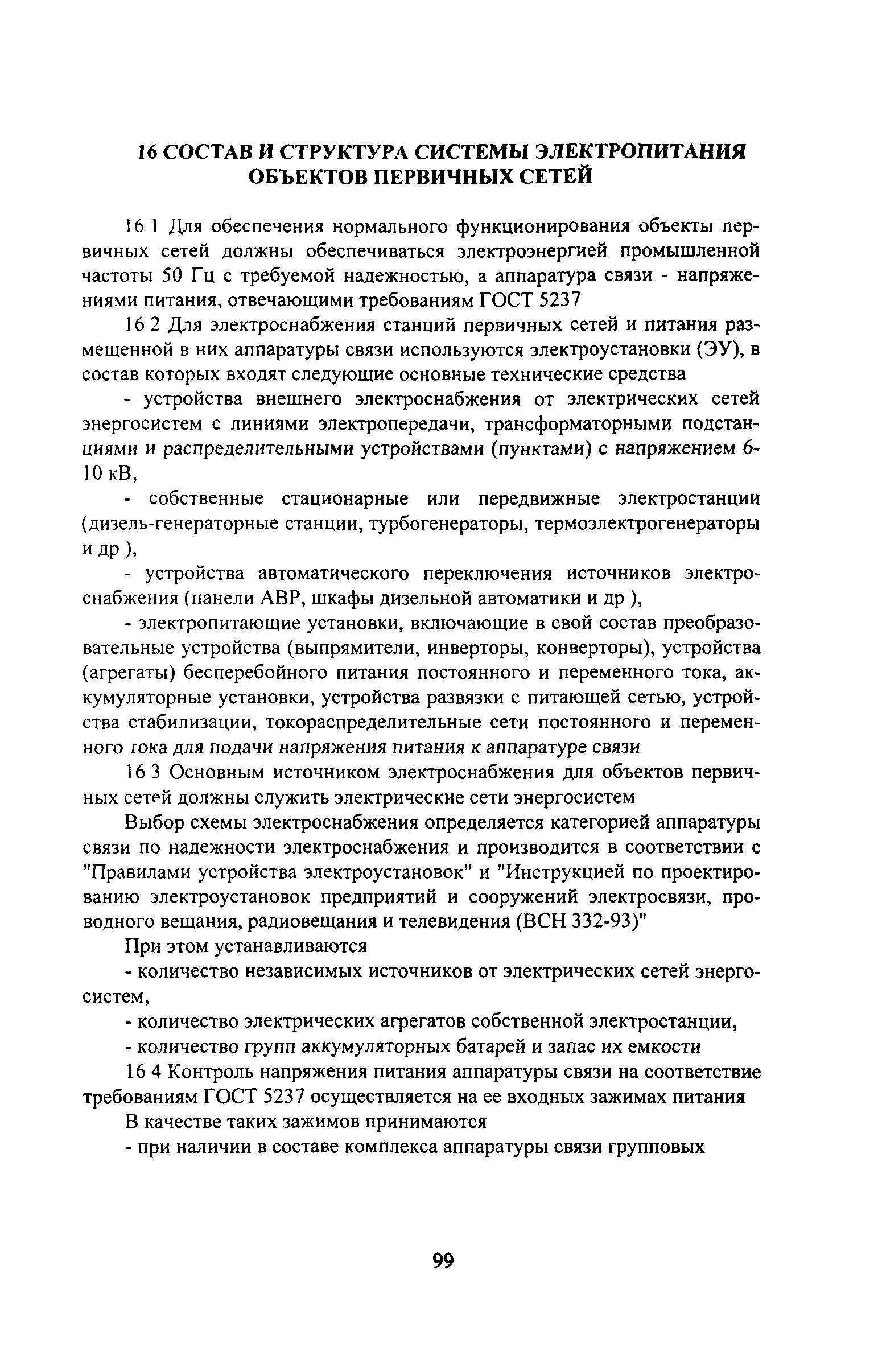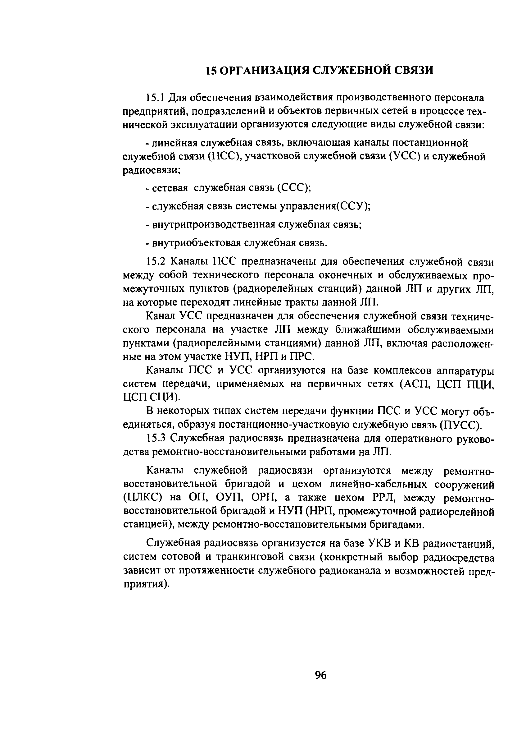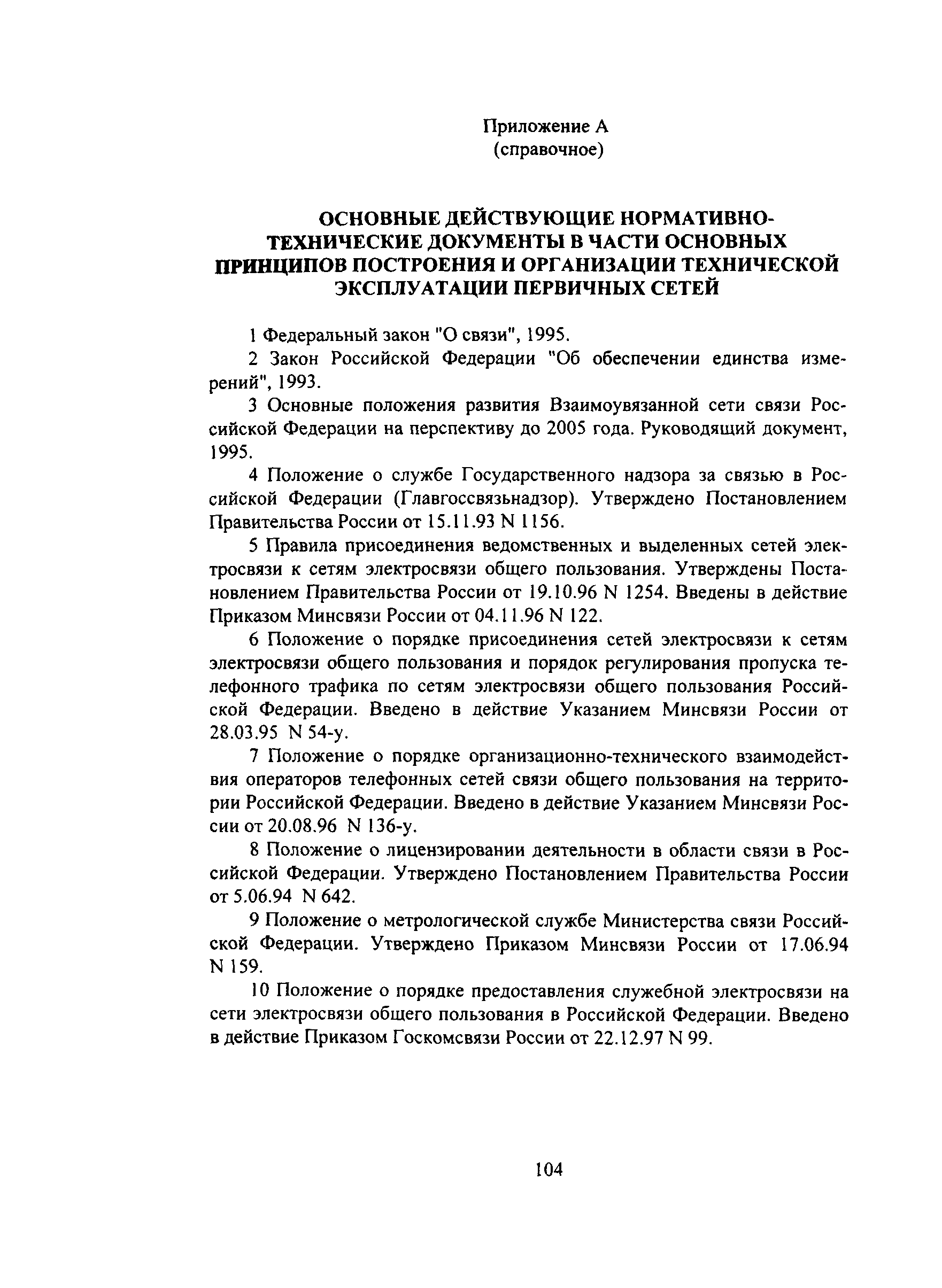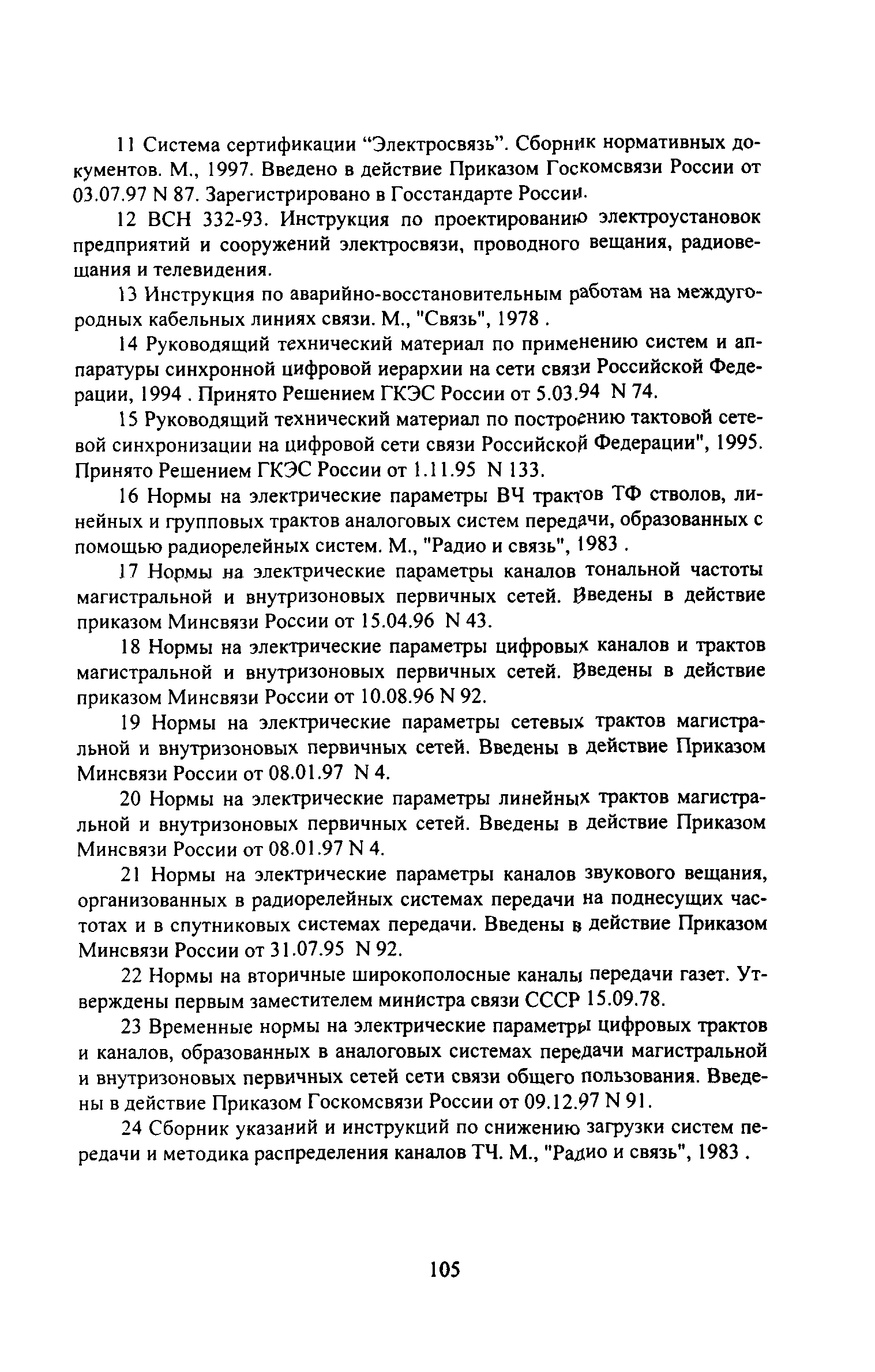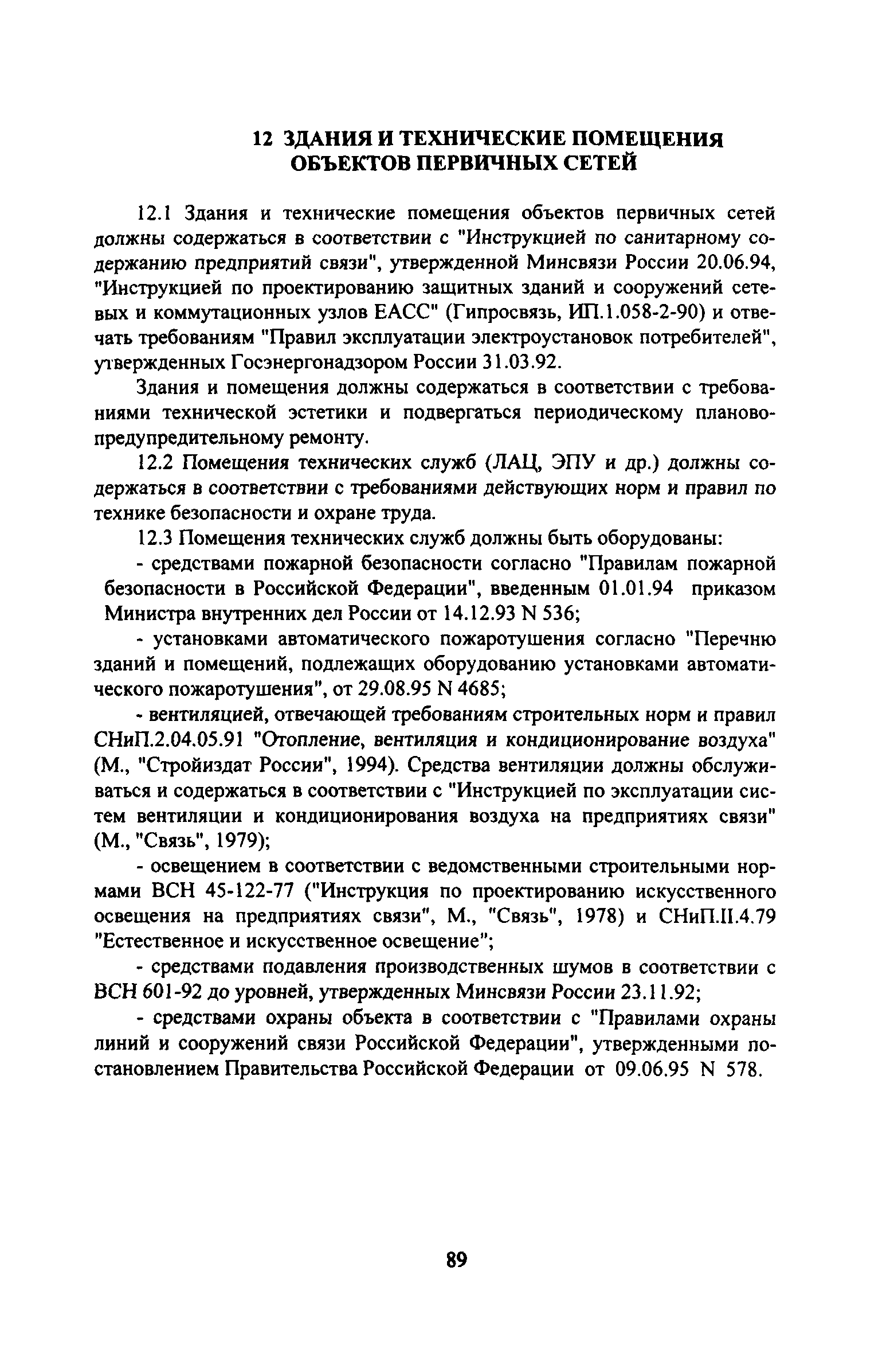 | | Нормативные ссылки: |   ОСТ 45.121-97 «Линии передачи кабельные магистральные и внутризоновые. Сооружения линейные. Термины и определения» СНиП II-4-79 «Естественное и искусственное освещение» ПР 50.2.014-96 «Государственная система обеспечения единства измерений. Правила проведения аккредитации метрологических служб юридических лиц на право поверки средств измерений»  ГОСТ 21.406-88 «Система проектной документации для строительства. Проводные средства связи. Обозначения условные графические на схемах и планах»  ГОСТ 19463-89 «Магистральные каналы изображения радиорелейных и спутниковых систем передачи. Основные параметры и методы измерений»  ГОСТ 26886-86 «Стыки цифровых каналов передачи и групповых трактов первичной сети ЕАСС. Основные параметры» ГОСТ 27908-88 «Стыки цифровых волоконно-оптических систем передачи первичной сети EACC. Номенклатура и основные параметры»  ГОСТ 12.1.005-88 «Система стандартов безопасности труда. Общие санитарно-гигиенические требования к воздуху рабочей зоны» ГОСТ Р 50712-94 «Соединительные линии и аппаратные звукового вещания. Технические характеристики. Методы измерений» ГОСТ Р 50725-94 «Соединительные линии в каналах изображения. Основные параметры. Методы измерений»  ГОСТ Р 50765-95 «Аппаратура радиорелейная. Классификация. Основные параметры цепей стыка»  ГОСТ Р 50933-96 «Каналы и тракты внутризоновых радиорелейных линий. Основные параметры и методы измерений»  ГОСТ Р 8.563-96 «Государственная система обеспечения единства измерений. Методики выполнения измерений» ВСН 332-93 «Инструкция по проектированию электроустановок предприятий и сооружений электросвязи, проводного вещания, радиовещания и телевидения» ВСН 333-93 «Инструкция по проектированию. Проводные средства связи и почтовая связь. Производственные здания» ВСН 45.122-77 «Инструкция по проектированию искусственного освещения предприятий связи» ВСН 601-92 «Допустимые уровни шума на предприятиях связи»  ГОСТ 22348-86 «Сеть связи автоматизированная единая. Термины и определения»  ГОСТ 27763-88 «Структуры циклов цифровых групповых сигналов первичной сети единой автоматизированной сети связи. Требования и нормы»  ГОСТ 28871-90 «Аппаратура линейных трактов цифровых волоконно-оптических систем передачи. Методы измерения основных параметров»  ГОСТ 28439-90 «Аппаратура волоконно-оптических систем передачи по линиям электропередач цифровая. Общие технические требования»  ГОСТ 5237-83 «Аппаратура электросвязи. Напряжения питания и методы измерений»  СНиП 2.09.04-87* «Административные и бытовые здания»  СНиП 2.04.01-85* «Внутренний водопровод и канализация зданий»  ГОСТ 11515-91 «Каналы и тракты звукового вещания. Основные параметры качества. Методы измерений»  СНиП 2.04.05-91* «Отопление, вентиляция и кондиционирование»  ГОСТ 21552-84 «Средства вычислительной техники. Общие технические требования, приемка, методы испытаний, маркировка, упаковка, транспортирование и хранение»  ПР 50.2.005-94 «Государственная система обеспечения единства измерений. Порядок лицензирования деятельности по изготовлению, ремонту, продаже и прокату средств измерений»