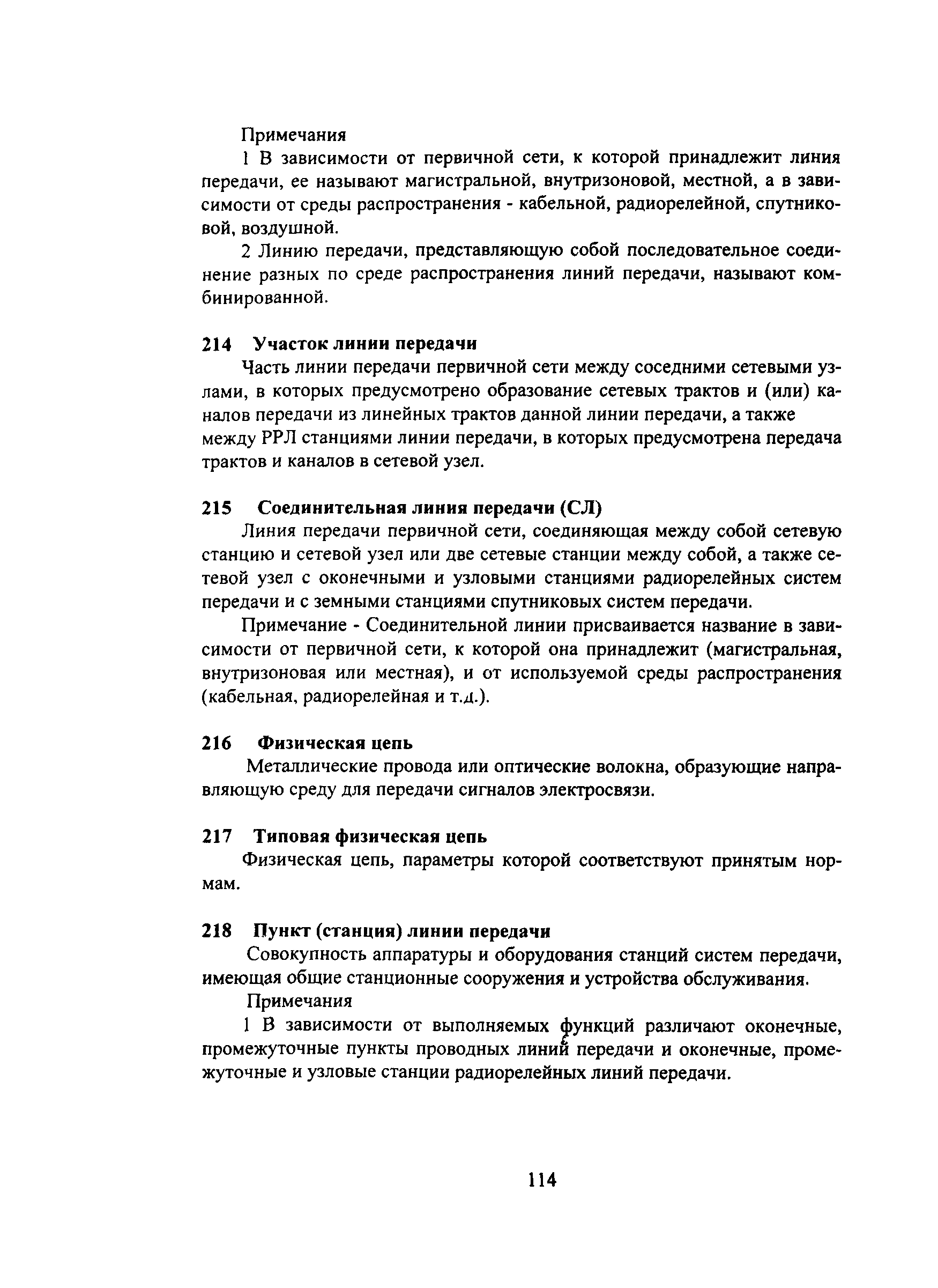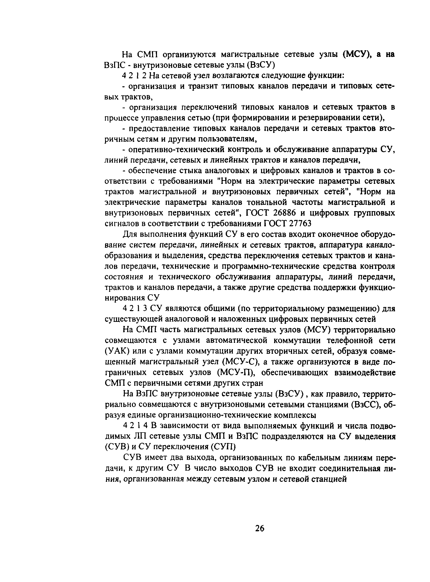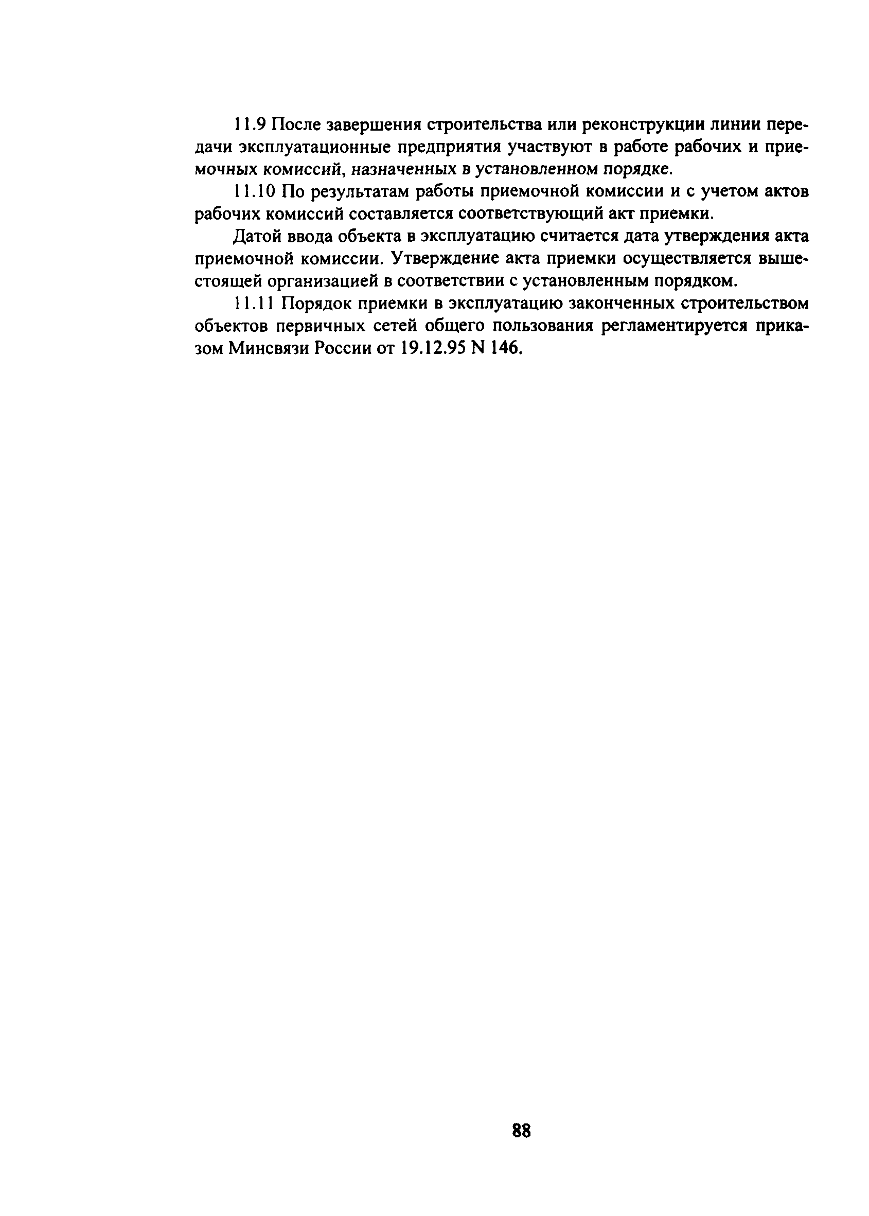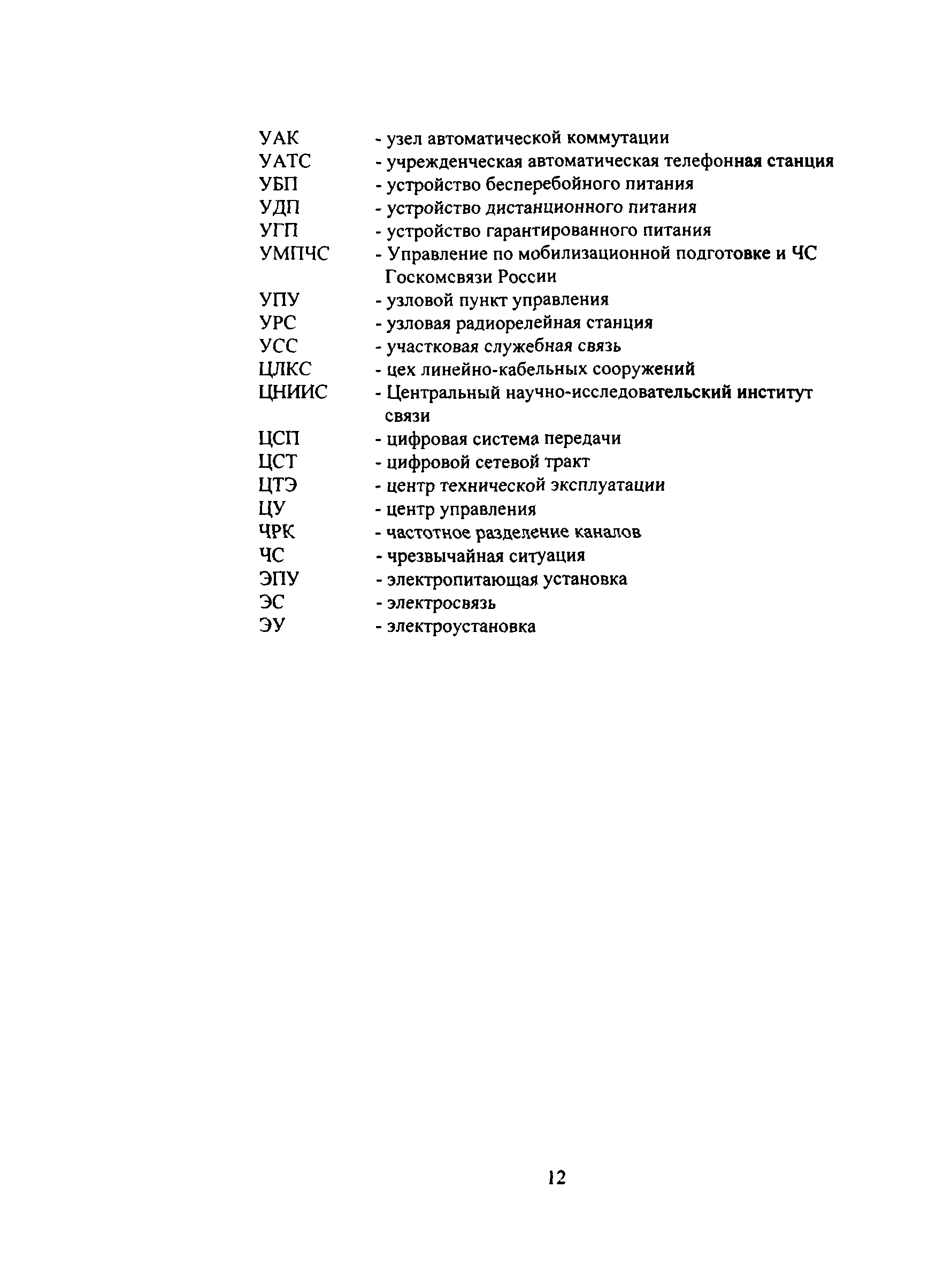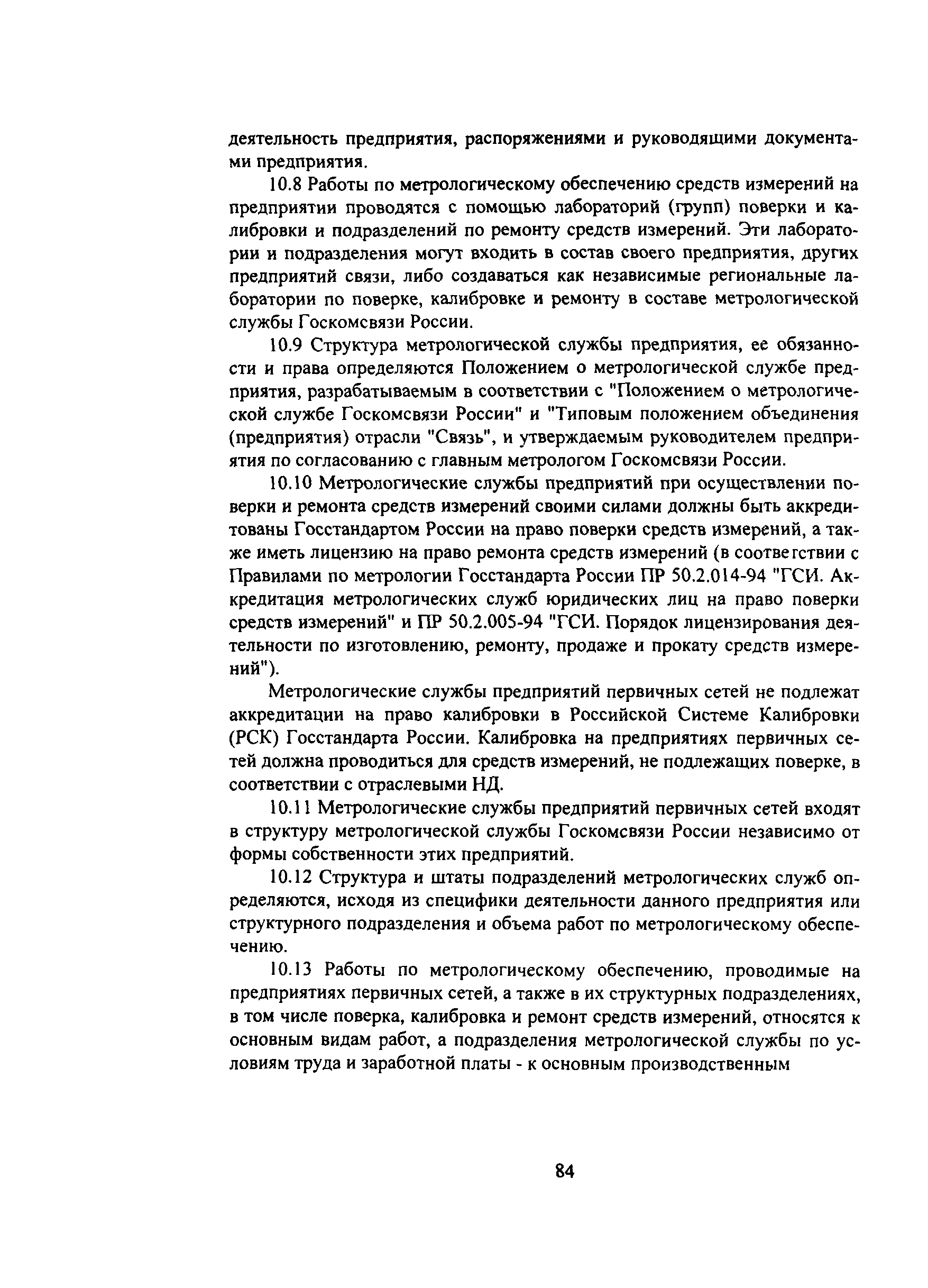 | | Нормативные ссылки: |   ОСТ 45.121-97 «Линии передачи кабельные магистральные и внутризоновые. Сооружения линейные. Термины и определения» СНиП II-4-79 «Естественное и искусственное освещение» ПР 50.2.014-96 «Государственная система обеспечения единства измерений. Правила проведения аккредитации метрологических служб юридических лиц на право поверки средств измерений»  ГОСТ 21.406-88 «Система проектной документации для строительства. Проводные средства связи. Обозначения условные графические на схемах и планах»  ГОСТ 19463-89 «Магистральные каналы изображения радиорелейных и спутниковых систем передачи. Основные параметры и методы измерений»  ГОСТ 26886-86 «Стыки цифровых каналов передачи и групповых трактов первичной сети ЕАСС. Основные параметры» ГОСТ 27908-88 «Стыки цифровых волоконно-оптических систем передачи первичной сети EACC. Номенклатура и основные параметры»  ГОСТ 12.1.005-88 «Система стандартов безопасности труда. Общие санитарно-гигиенические требования к воздуху рабочей зоны» ГОСТ Р 50712-94 «Соединительные линии и аппаратные звукового вещания. Технические характеристики. Методы измерений» ГОСТ Р 50725-94 «Соединительные линии в каналах изображения. Основные параметры. Методы измерений»  ГОСТ Р 50765-95 «Аппаратура радиорелейная. Классификация. Основные параметры цепей стыка»  ГОСТ Р 50933-96 «Каналы и тракты внутризоновых радиорелейных линий. Основные параметры и методы измерений»  ГОСТ Р 8.563-96 «Государственная система обеспечения единства измерений. Методики выполнения измерений» ВСН 332-93 «Инструкция по проектированию электроустановок предприятий и сооружений электросвязи, проводного вещания, радиовещания и телевидения» ВСН 333-93 «Инструкция по проектированию. Проводные средства связи и почтовая связь. Производственные здания» ВСН 45.122-77 «Инструкция по проектированию искусственного освещения предприятий связи» ВСН 601-92 «Допустимые уровни шума на предприятиях связи»  ГОСТ 22348-86 «Сеть связи автоматизированная единая. Термины и определения»  ГОСТ 27763-88 «Структуры циклов цифровых групповых сигналов первичной сети единой автоматизированной сети связи. Требования и нормы»  ГОСТ 28871-90 «Аппаратура линейных трактов цифровых волоконно-оптических систем передачи. Методы измерения основных параметров»  ГОСТ 28439-90 «Аппаратура волоконно-оптических систем передачи по линиям электропередач цифровая. Общие технические требования»  ГОСТ 5237-83 «Аппаратура электросвязи. Напряжения питания и методы измерений»  СНиП 2.09.04-87* «Административные и бытовые здания»  СНиП 2.04.01-85* «Внутренний водопровод и канализация зданий»  ГОСТ 11515-91 «Каналы и тракты звукового вещания. Основные параметры качества. Методы измерений»  СНиП 2.04.05-91* «Отопление, вентиляция и кондиционирование»  ГОСТ 21552-84 «Средства вычислительной техники. Общие технические требования, приемка, методы испытаний, маркировка, упаковка, транспортирование и хранение»  ПР 50.2.005-94 «Государственная система обеспечения единства измерений. Порядок лицензирования деятельности по изготовлению, ремонту, продаже и прокату средств измерений»