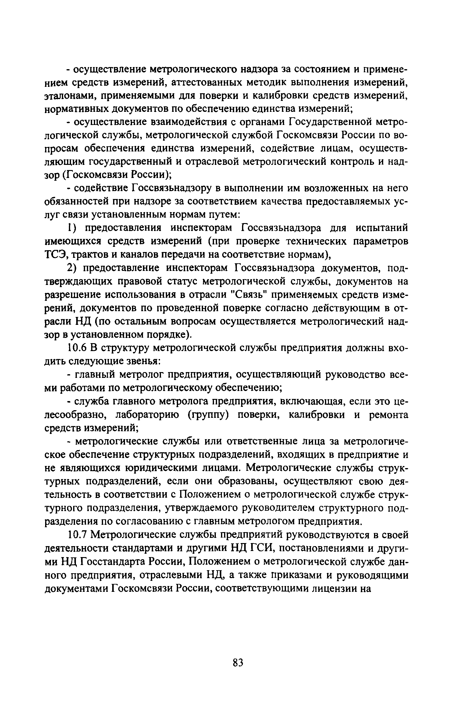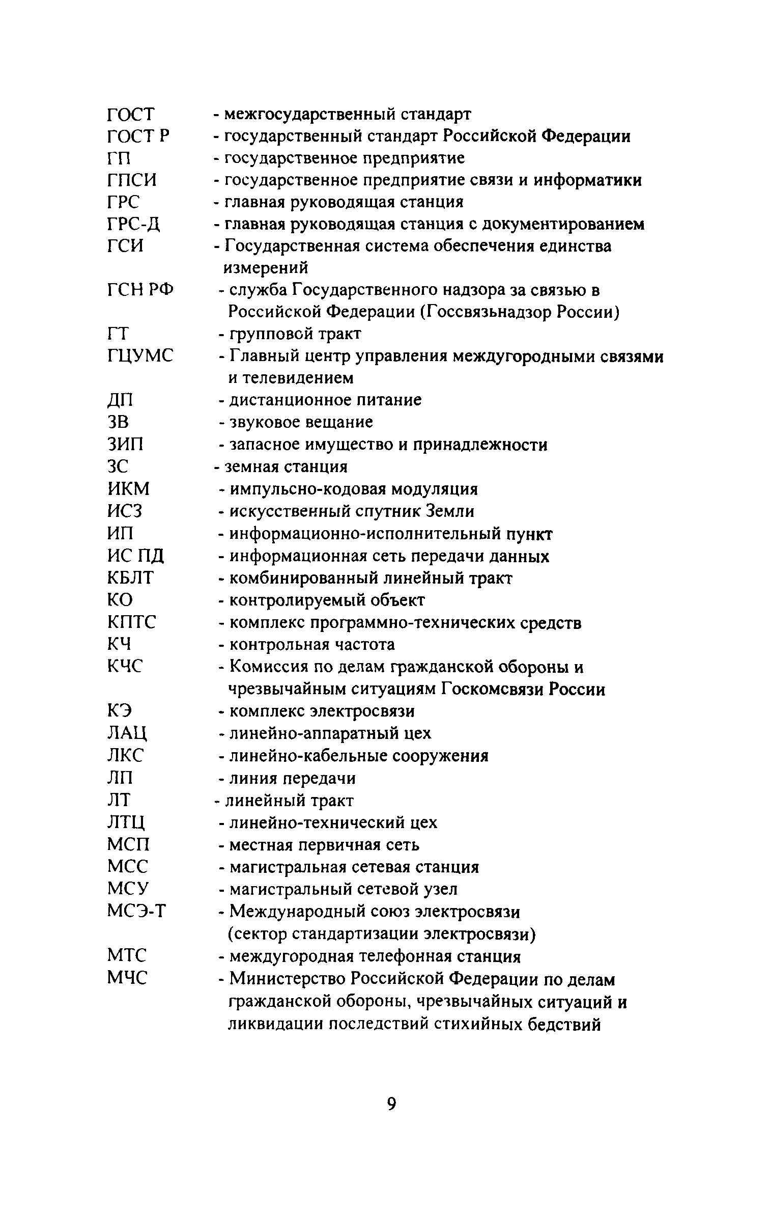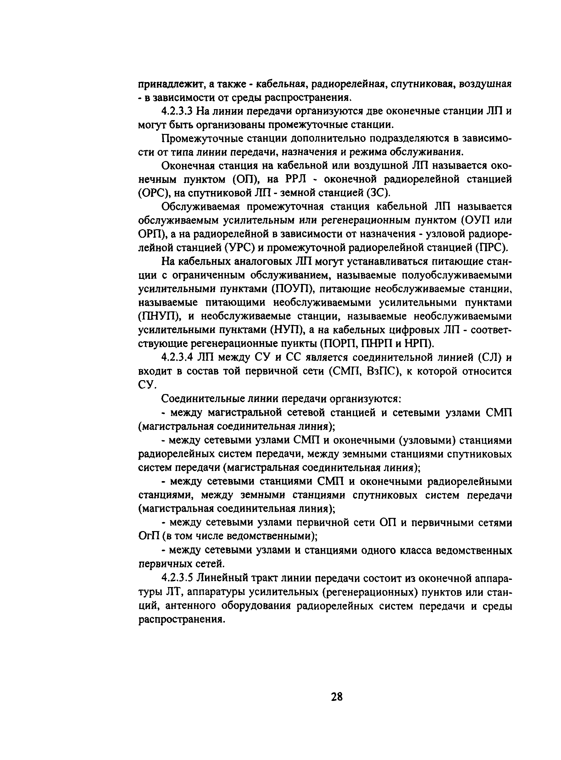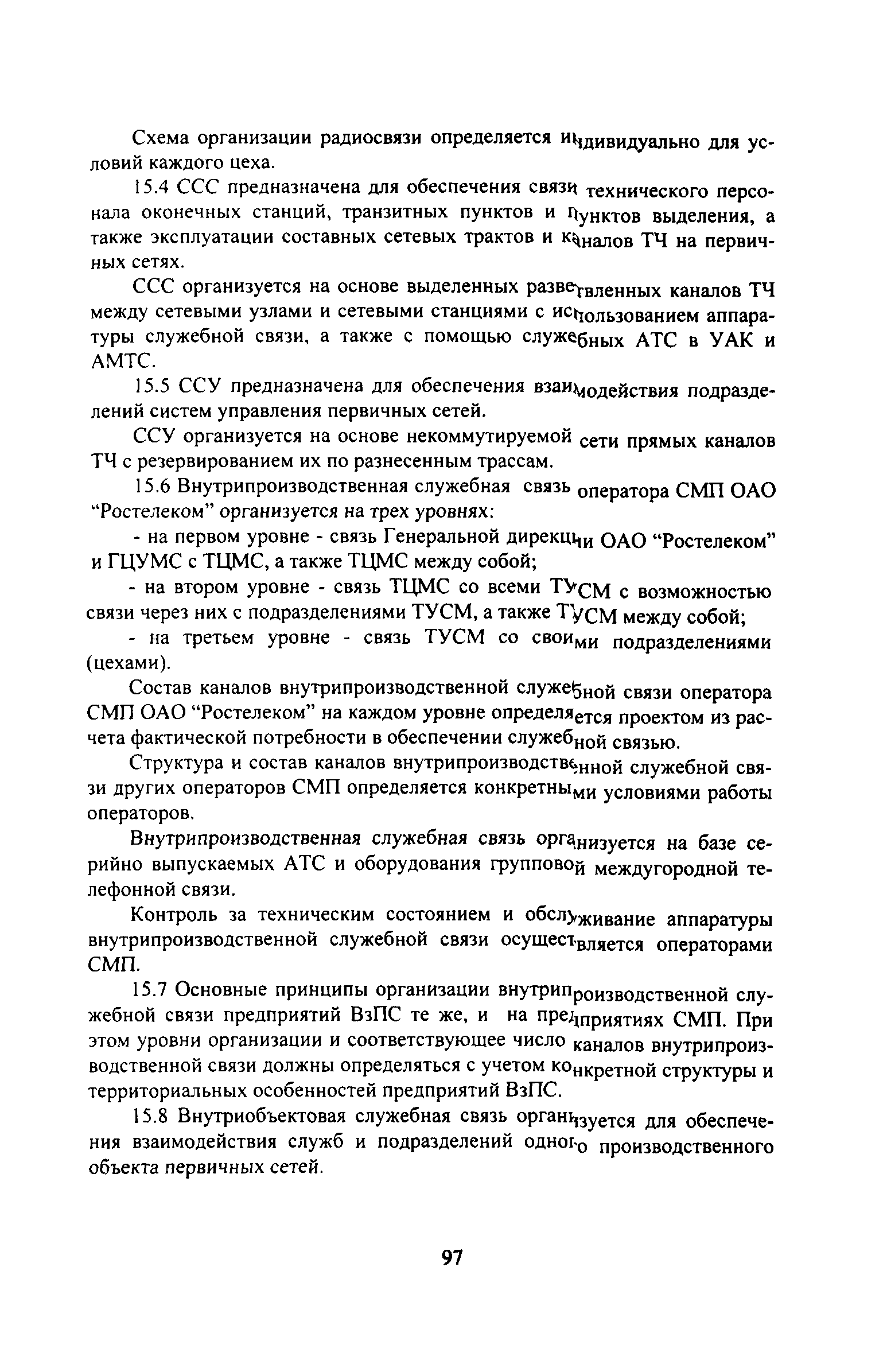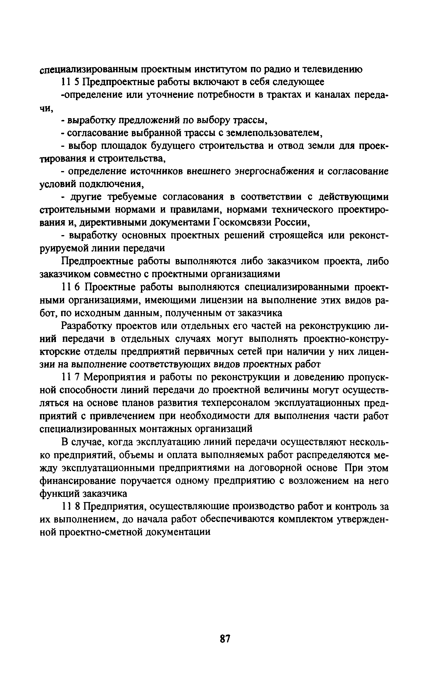 | | Нормативные ссылки: |   ОСТ 45.121-97 «Линии передачи кабельные магистральные и внутризоновые. Сооружения линейные. Термины и определения» СНиП II-4-79 «Естественное и искусственное освещение» ПР 50.2.014-96 «Государственная система обеспечения единства измерений. Правила проведения аккредитации метрологических служб юридических лиц на право поверки средств измерений»  ГОСТ 21.406-88 «Система проектной документации для строительства. Проводные средства связи. Обозначения условные графические на схемах и планах»  ГОСТ 19463-89 «Магистральные каналы изображения радиорелейных и спутниковых систем передачи. Основные параметры и методы измерений»  ГОСТ 26886-86 «Стыки цифровых каналов передачи и групповых трактов первичной сети ЕАСС. Основные параметры» ГОСТ 27908-88 «Стыки цифровых волоконно-оптических систем передачи первичной сети EACC. Номенклатура и основные параметры»  ГОСТ 12.1.005-88 «Система стандартов безопасности труда. Общие санитарно-гигиенические требования к воздуху рабочей зоны» ГОСТ Р 50712-94 «Соединительные линии и аппаратные звукового вещания. Технические характеристики. Методы измерений» ГОСТ Р 50725-94 «Соединительные линии в каналах изображения. Основные параметры. Методы измерений»  ГОСТ Р 50765-95 «Аппаратура радиорелейная. Классификация. Основные параметры цепей стыка»  ГОСТ Р 50933-96 «Каналы и тракты внутризоновых радиорелейных линий. Основные параметры и методы измерений»  ГОСТ Р 8.563-96 «Государственная система обеспечения единства измерений. Методики выполнения измерений» ВСН 332-93 «Инструкция по проектированию электроустановок предприятий и сооружений электросвязи, проводного вещания, радиовещания и телевидения» ВСН 333-93 «Инструкция по проектированию. Проводные средства связи и почтовая связь. Производственные здания» ВСН 45.122-77 «Инструкция по проектированию искусственного освещения предприятий связи» ВСН 601-92 «Допустимые уровни шума на предприятиях связи»  ГОСТ 22348-86 «Сеть связи автоматизированная единая. Термины и определения»  ГОСТ 27763-88 «Структуры циклов цифровых групповых сигналов первичной сети единой автоматизированной сети связи. Требования и нормы»  ГОСТ 28871-90 «Аппаратура линейных трактов цифровых волоконно-оптических систем передачи. Методы измерения основных параметров»  ГОСТ 28439-90 «Аппаратура волоконно-оптических систем передачи по линиям электропередач цифровая. Общие технические требования»  ГОСТ 5237-83 «Аппаратура электросвязи. Напряжения питания и методы измерений»  СНиП 2.09.04-87* «Административные и бытовые здания»  СНиП 2.04.01-85* «Внутренний водопровод и канализация зданий»  ГОСТ 11515-91 «Каналы и тракты звукового вещания. Основные параметры качества. Методы измерений»  СНиП 2.04.05-91* «Отопление, вентиляция и кондиционирование»  ГОСТ 21552-84 «Средства вычислительной техники. Общие технические требования, приемка, методы испытаний, маркировка, упаковка, транспортирование и хранение»  ПР 50.2.005-94 «Государственная система обеспечения единства измерений. Порядок лицензирования деятельности по изготовлению, ремонту, продаже и прокату средств измерений»