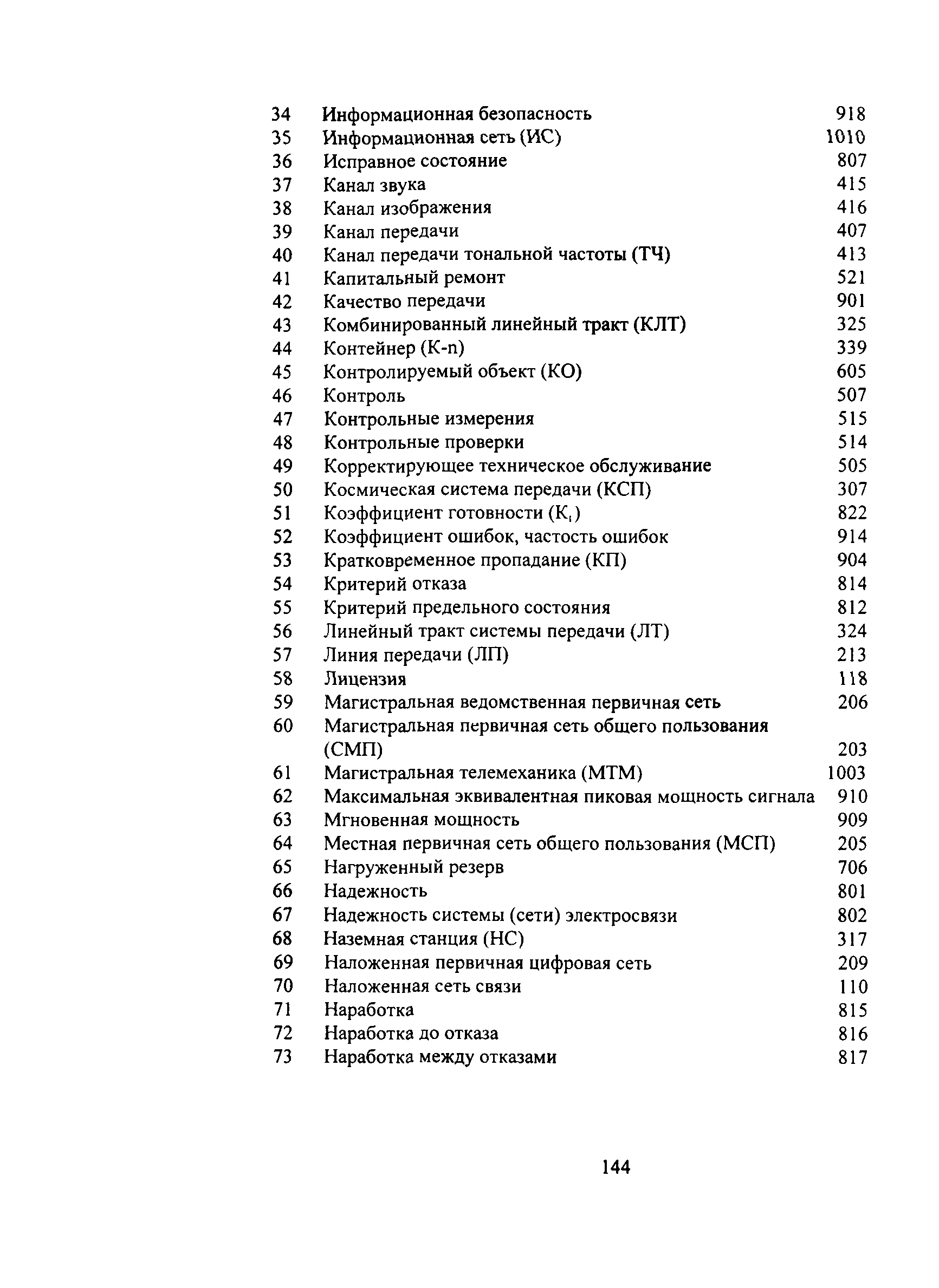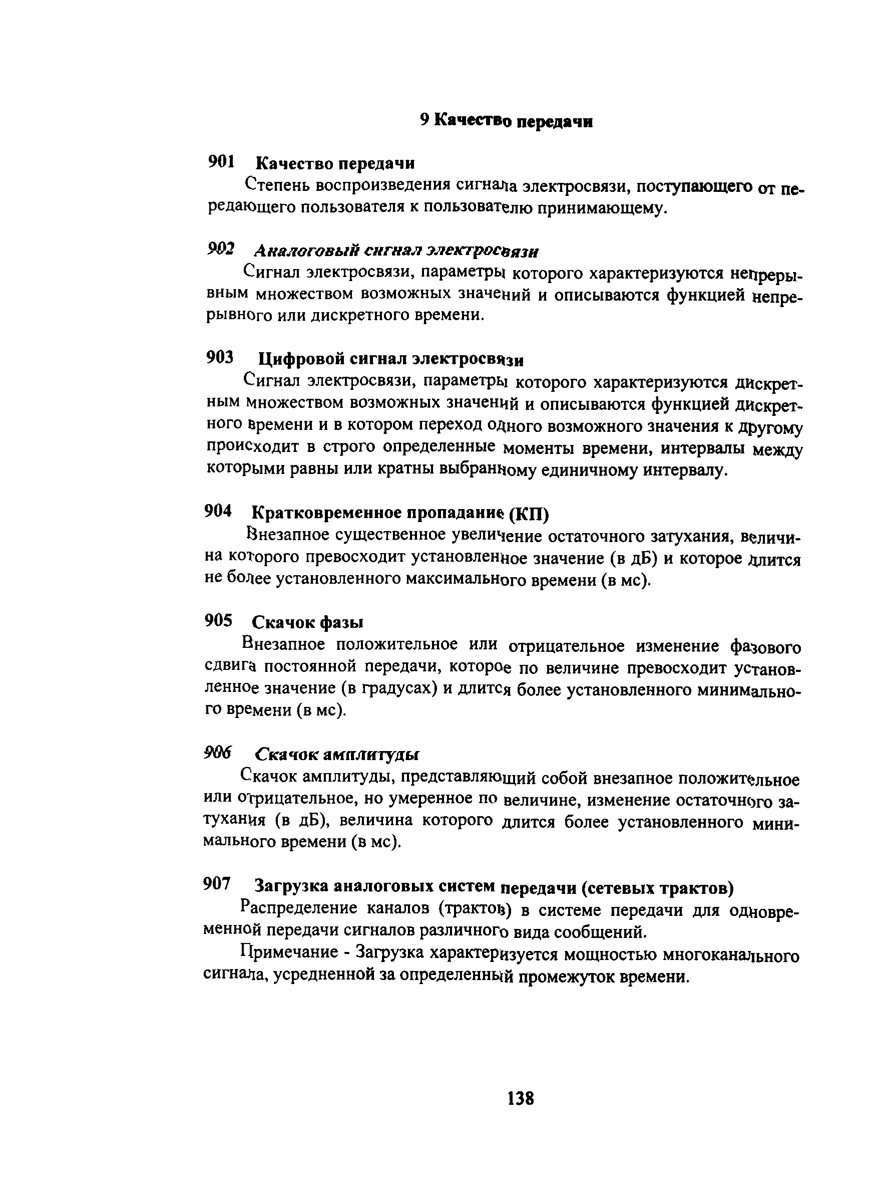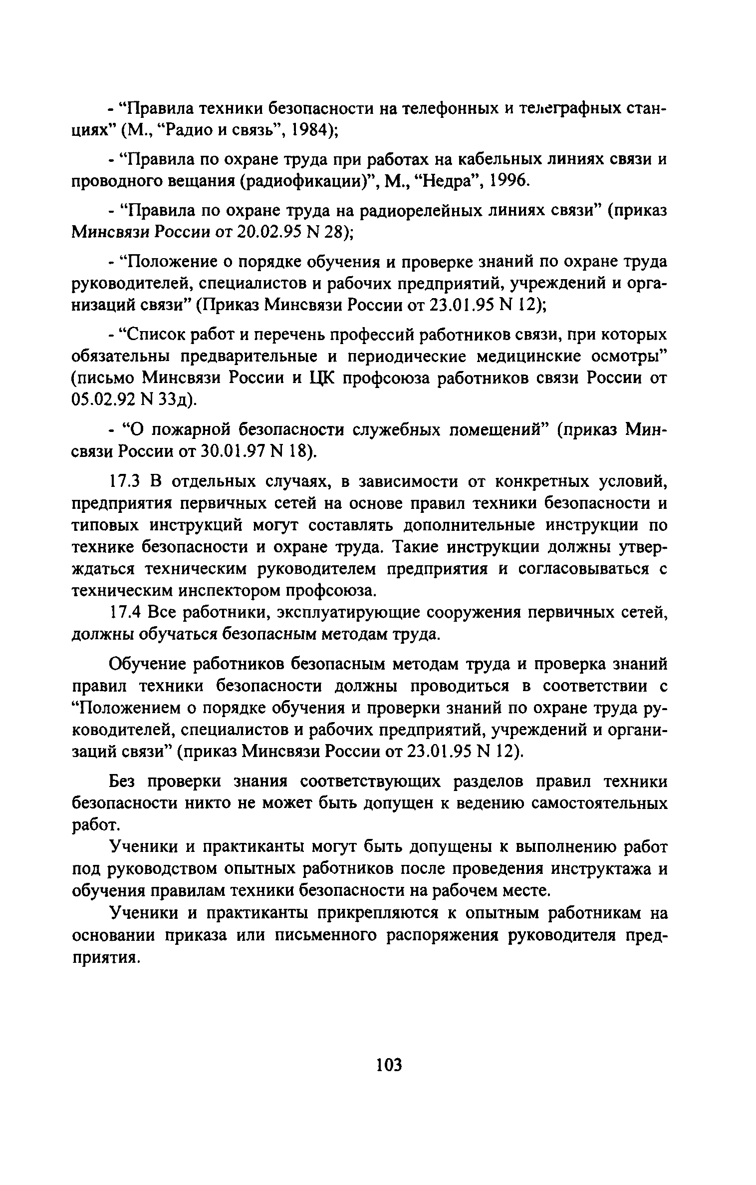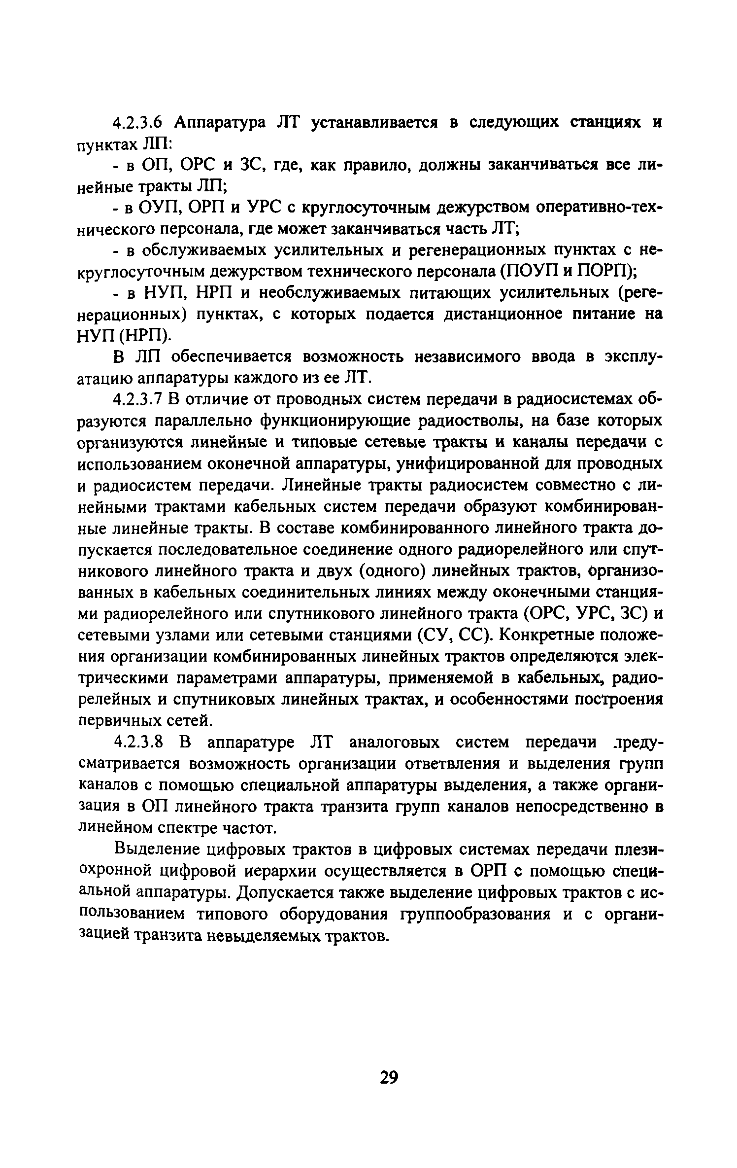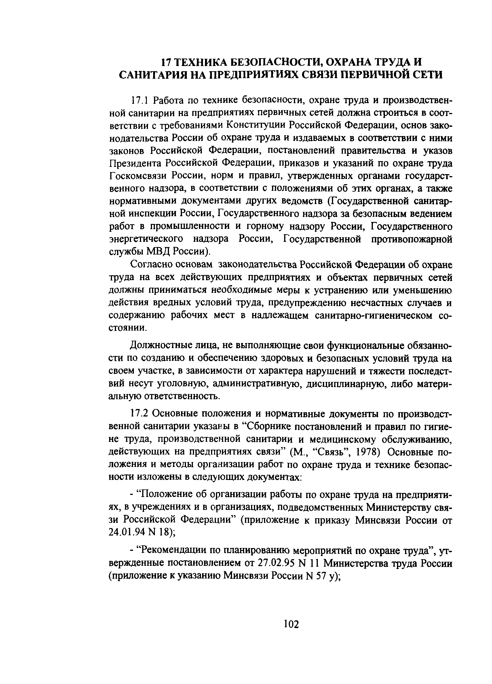 | | Нормативные ссылки: |   ОСТ 45.121-97 «Линии передачи кабельные магистральные и внутризоновые. Сооружения линейные. Термины и определения» СНиП II-4-79 «Естественное и искусственное освещение» ПР 50.2.014-96 «Государственная система обеспечения единства измерений. Правила проведения аккредитации метрологических служб юридических лиц на право поверки средств измерений»  ГОСТ 21.406-88 «Система проектной документации для строительства. Проводные средства связи. Обозначения условные графические на схемах и планах»  ГОСТ 19463-89 «Магистральные каналы изображения радиорелейных и спутниковых систем передачи. Основные параметры и методы измерений»  ГОСТ 26886-86 «Стыки цифровых каналов передачи и групповых трактов первичной сети ЕАСС. Основные параметры» ГОСТ 27908-88 «Стыки цифровых волоконно-оптических систем передачи первичной сети EACC. Номенклатура и основные параметры»  ГОСТ 12.1.005-88 «Система стандартов безопасности труда. Общие санитарно-гигиенические требования к воздуху рабочей зоны» ГОСТ Р 50712-94 «Соединительные линии и аппаратные звукового вещания. Технические характеристики. Методы измерений» ГОСТ Р 50725-94 «Соединительные линии в каналах изображения. Основные параметры. Методы измерений»  ГОСТ Р 50765-95 «Аппаратура радиорелейная. Классификация. Основные параметры цепей стыка»  ГОСТ Р 50933-96 «Каналы и тракты внутризоновых радиорелейных линий. Основные параметры и методы измерений»  ГОСТ Р 8.563-96 «Государственная система обеспечения единства измерений. Методики выполнения измерений» ВСН 332-93 «Инструкция по проектированию электроустановок предприятий и сооружений электросвязи, проводного вещания, радиовещания и телевидения» ВСН 333-93 «Инструкция по проектированию. Проводные средства связи и почтовая связь. Производственные здания» ВСН 45.122-77 «Инструкция по проектированию искусственного освещения предприятий связи» ВСН 601-92 «Допустимые уровни шума на предприятиях связи»  ГОСТ 22348-86 «Сеть связи автоматизированная единая. Термины и определения»  ГОСТ 27763-88 «Структуры циклов цифровых групповых сигналов первичной сети единой автоматизированной сети связи. Требования и нормы»  ГОСТ 28871-90 «Аппаратура линейных трактов цифровых волоконно-оптических систем передачи. Методы измерения основных параметров»  ГОСТ 28439-90 «Аппаратура волоконно-оптических систем передачи по линиям электропередач цифровая. Общие технические требования»  ГОСТ 5237-83 «Аппаратура электросвязи. Напряжения питания и методы измерений»  СНиП 2.09.04-87* «Административные и бытовые здания»  СНиП 2.04.01-85* «Внутренний водопровод и канализация зданий»  ГОСТ 11515-91 «Каналы и тракты звукового вещания. Основные параметры качества. Методы измерений»  СНиП 2.04.05-91* «Отопление, вентиляция и кондиционирование»  ГОСТ 21552-84 «Средства вычислительной техники. Общие технические требования, приемка, методы испытаний, маркировка, упаковка, транспортирование и хранение»  ПР 50.2.005-94 «Государственная система обеспечения единства измерений. Порядок лицензирования деятельности по изготовлению, ремонту, продаже и прокату средств измерений»