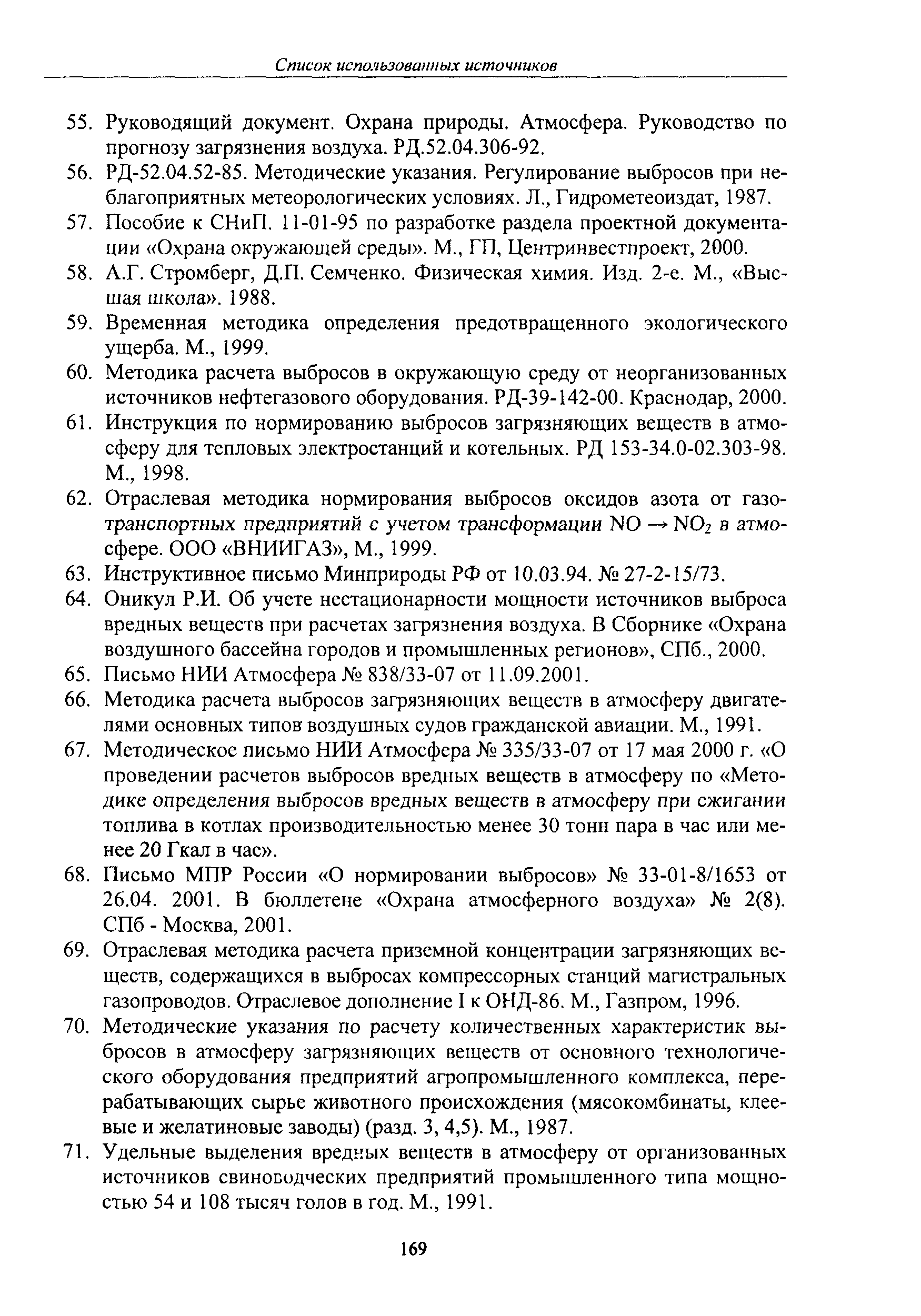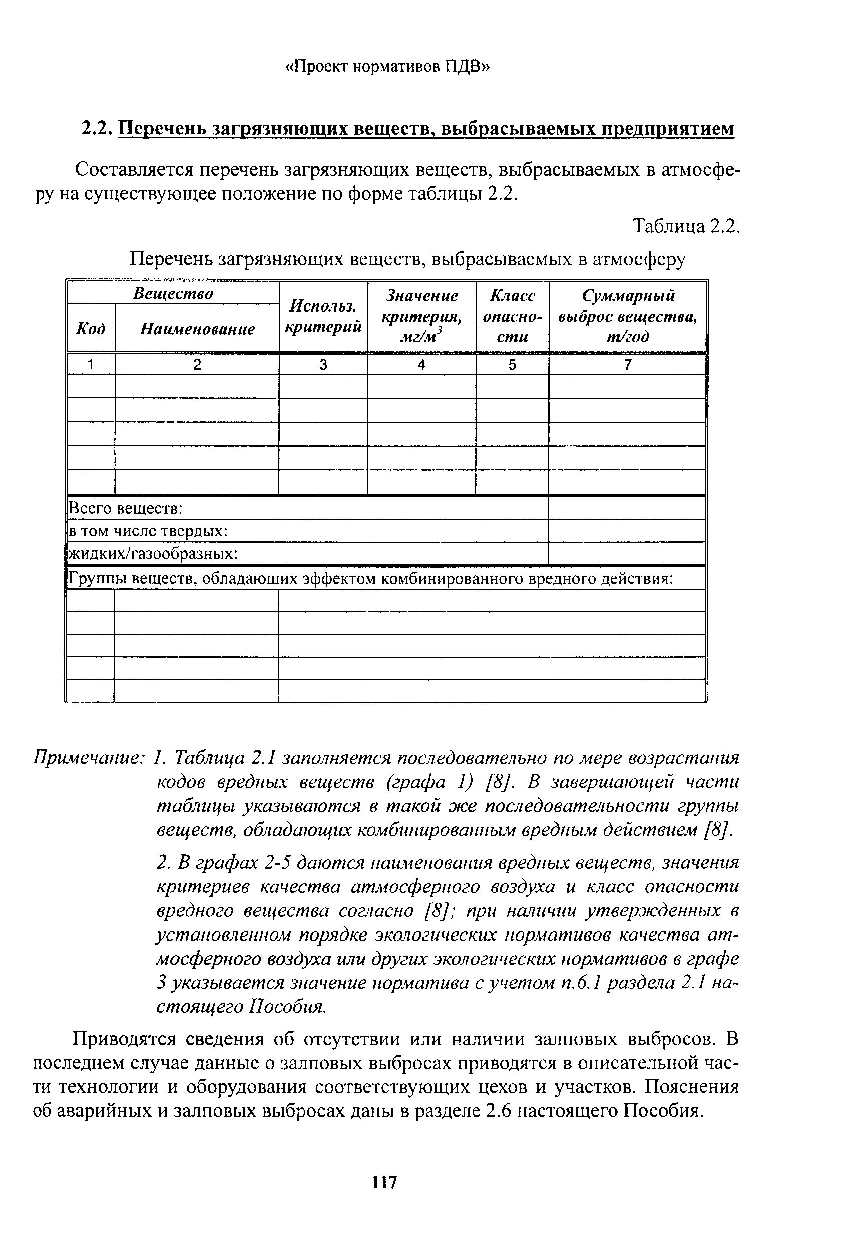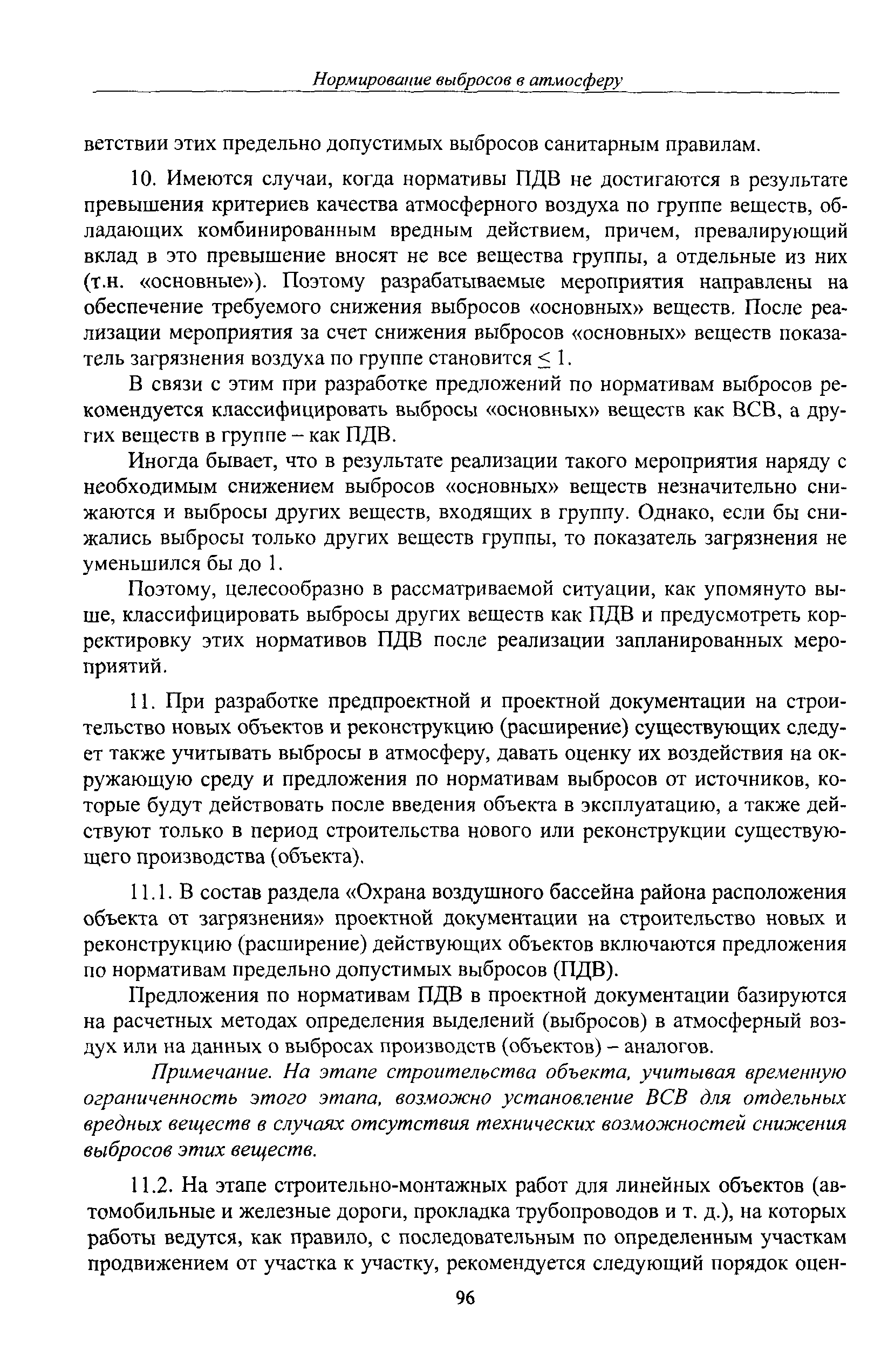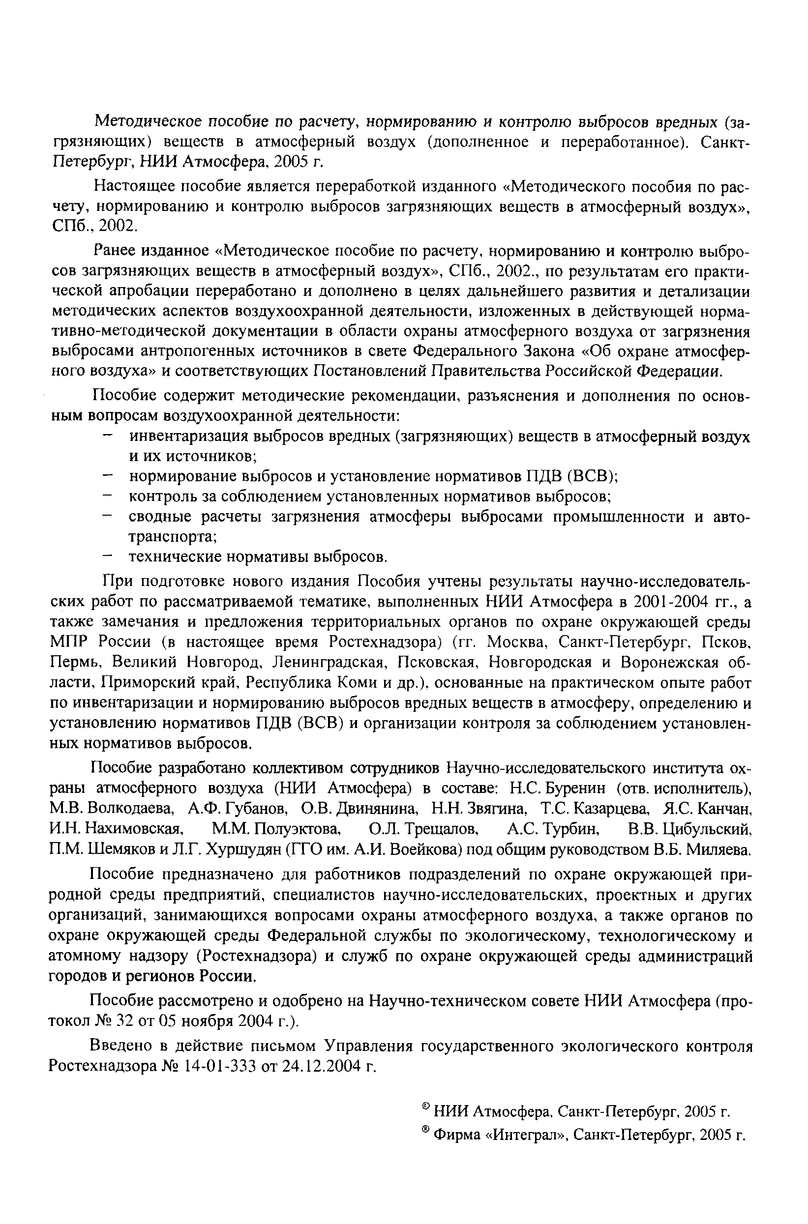 Методическое пособие по расчету, нормированию и контролю выбросов загрязняющих веществ в атмосферный воздух (Дополненное и переработанное)| Статус: | заменен | | Название рус.: | Методическое пособие по расчету, нормированию и контролю выбросов загрязняющих веществ в атмосферный воздух (Дополненное и переработанное) | | Дата добавления в базу: | 01.09.2013 | | Дата актуализации: | 01.09.2013 | | Дата введения: | 25.01.2002 | | Область применения: | Пособие предназначено для работников подразделений по охране окружающей природной среды предприятий, специалистов научно-исследовательских, проектных и других организаций, занимающихся вопросами охраны атмосферного воздуха, а также комитетов природных ресурсов МПР России и служб охраны окружающей среды администраций городов и регионов России. | | Оглавление: | Введение 1 Инвентаризация выбросов вредных (загрязняющих) веществ в атмосферный воздух 2 Нормирование выбросов в атмосферу 3 Контроль за соблюдением установленных нормативов выбросов 4 Мероприятия по регулированию выбросов в периоды неблагоприятных метеорологических условий (НМУ) 5 Сводные расчеты загрязнения атмосферы выбросами промышленности и автотранспорта и их применение при нормировании выбросов предприятий 6 Технические нормативы выбросов (ТНВ) вредных (загрязняющих) веществ в атмосферный воздух6. Технические нормативы выбросов (ТНВ)вредных (загрязняющих) веществ в атмосферный воздух6. Технические нормативы выбросов (ТНВ)вредных (загрязняющих) веществ в атмосферный воздух 7 Об использовании промышленных отходов в качестве добавки к основному топливу котельных Список использованных источников Приложение 1 Структура «Отчета по инвентаризации выбросов вредных (загрязняющих) веществ в атмосферный воздух предприятия» Приложение 2 Установление источников и перечня вредных веществ, подлежащих нормированию Приложение 3 Рекомендации по расчету выделений (выбросов) загрязняющих веществ в атмосферу от животноводческих комплексов и звероферм Приложение 4 Рекомендации по расчету максимальных и валовых выбросов в атмосферу вредных (загрязняющих) веществ при производстве металлопокрытий гальваническим способом для основных групп технологических процессов |