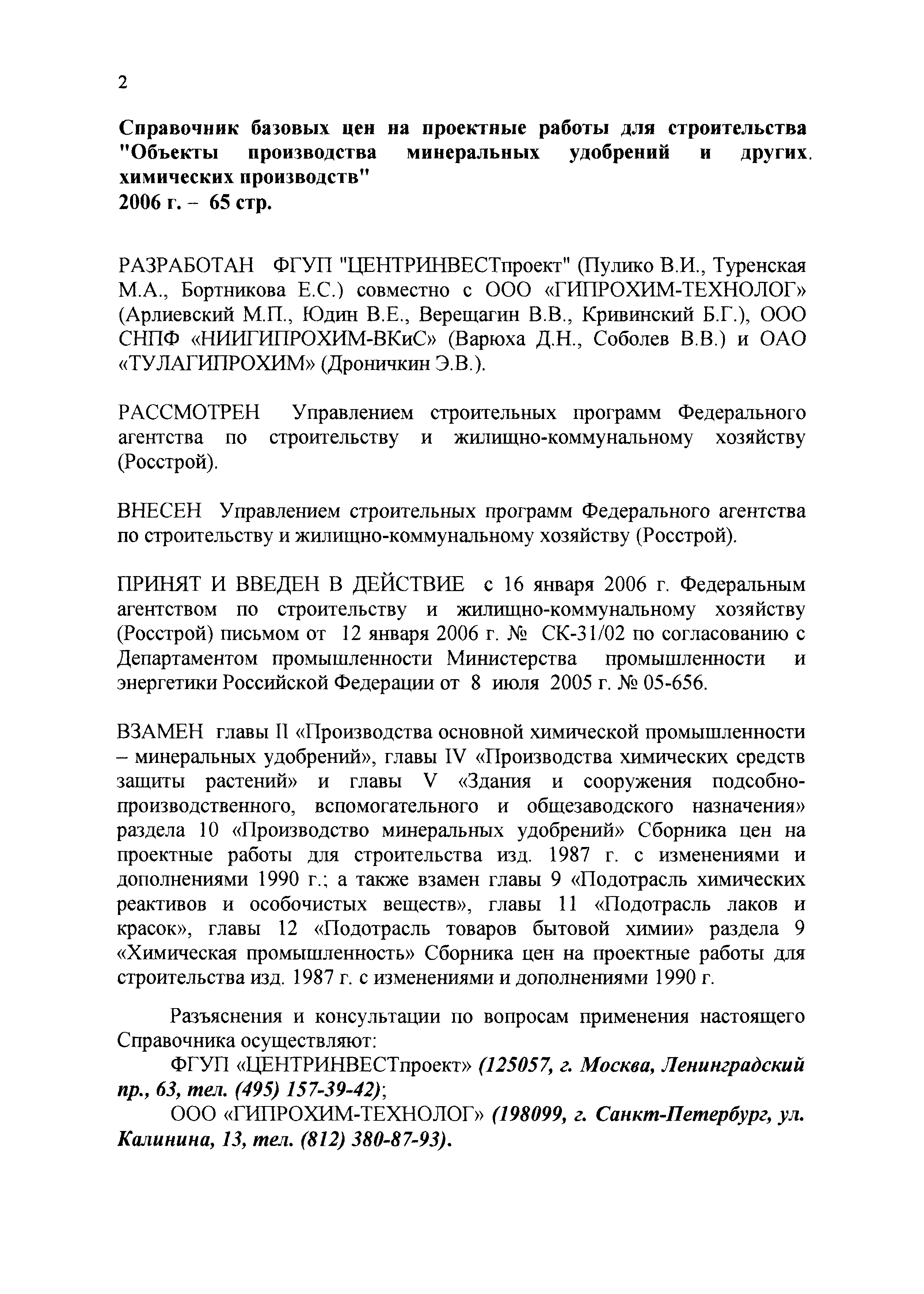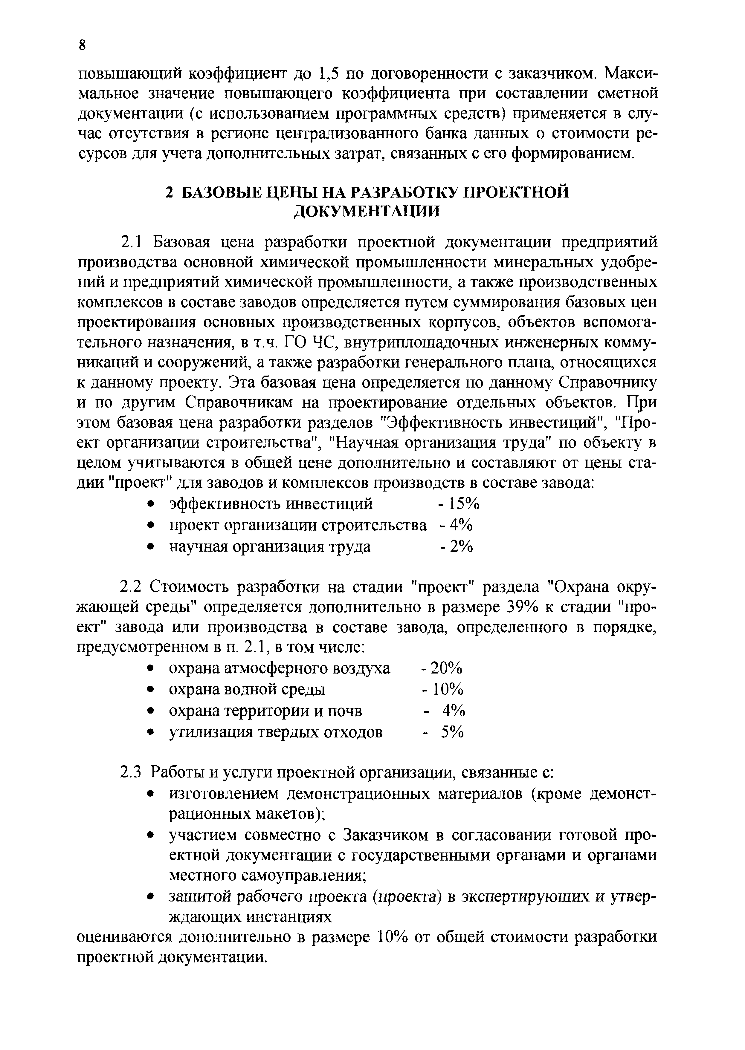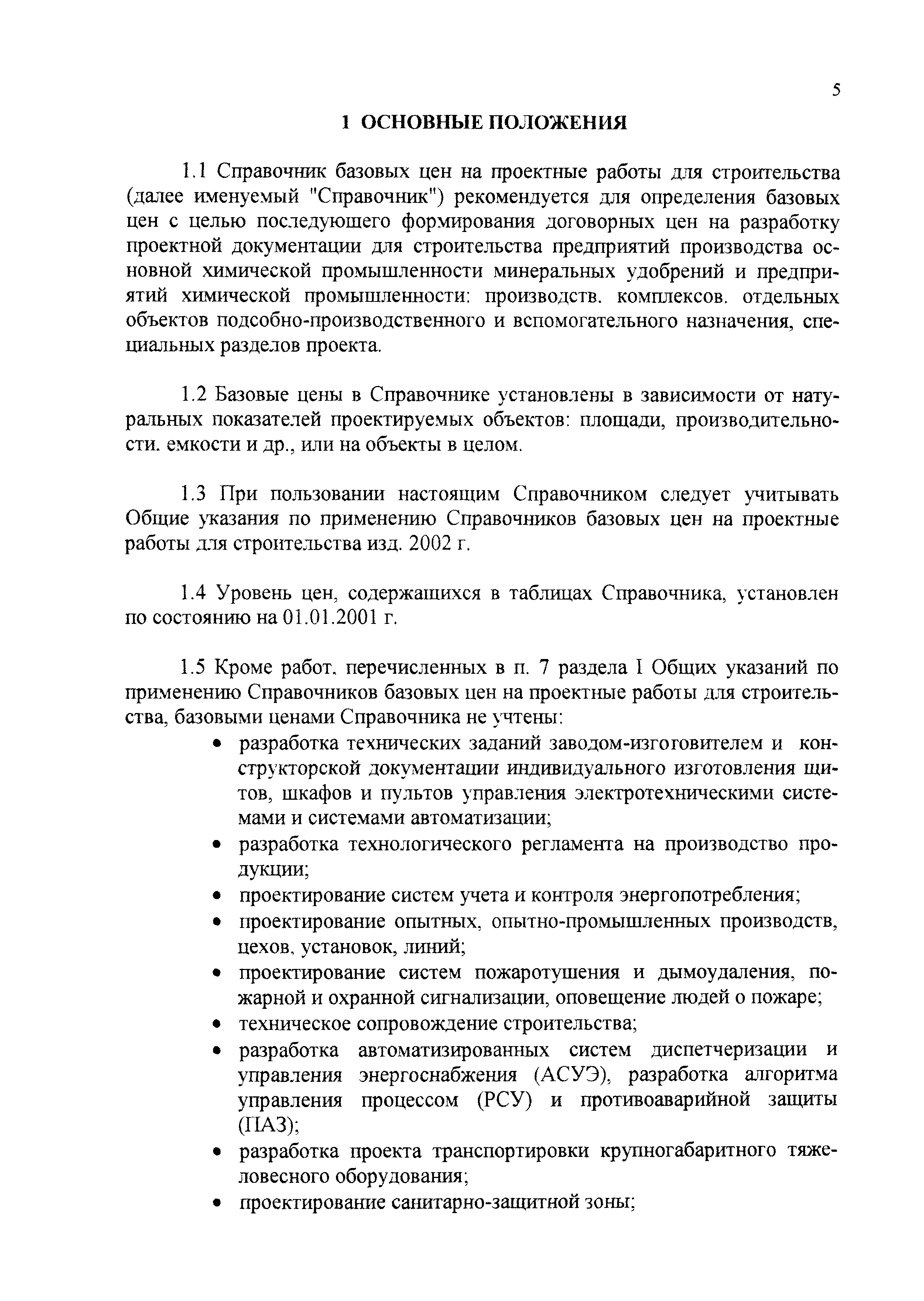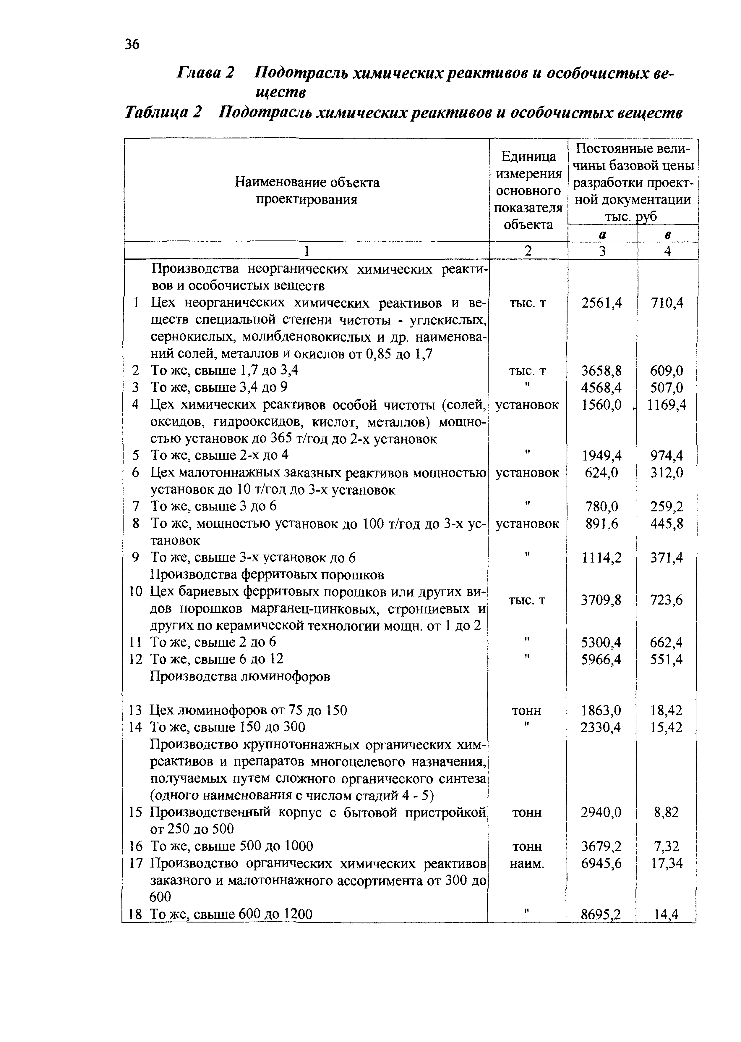 | Оглавление: | 1 Основные положения 2 Базовые цены на разработку проектной документации Глава 1 Производства основной химической промышленности - минеральных удобрений Глава 2 Подотрасль химических реактивов и особочистых веществ Глава 3 Подотрасль красок и лаков Глава 4 Производства химических средств защиты растений Глава 5 Подотрасль товаров бытовой химии Глава 6 Подотрасль производства карбида кальция и желтого фосфора Глава 7 Здания и сооружения подсобного и обслуживающего назначения Глава 8 Объекты водоснабжения, канализации и сети Глава 9 Специальные разделы проектной документации для строительства 3 Таблицы относительной стоимости разработки проектной документации (в процентах от цены) |