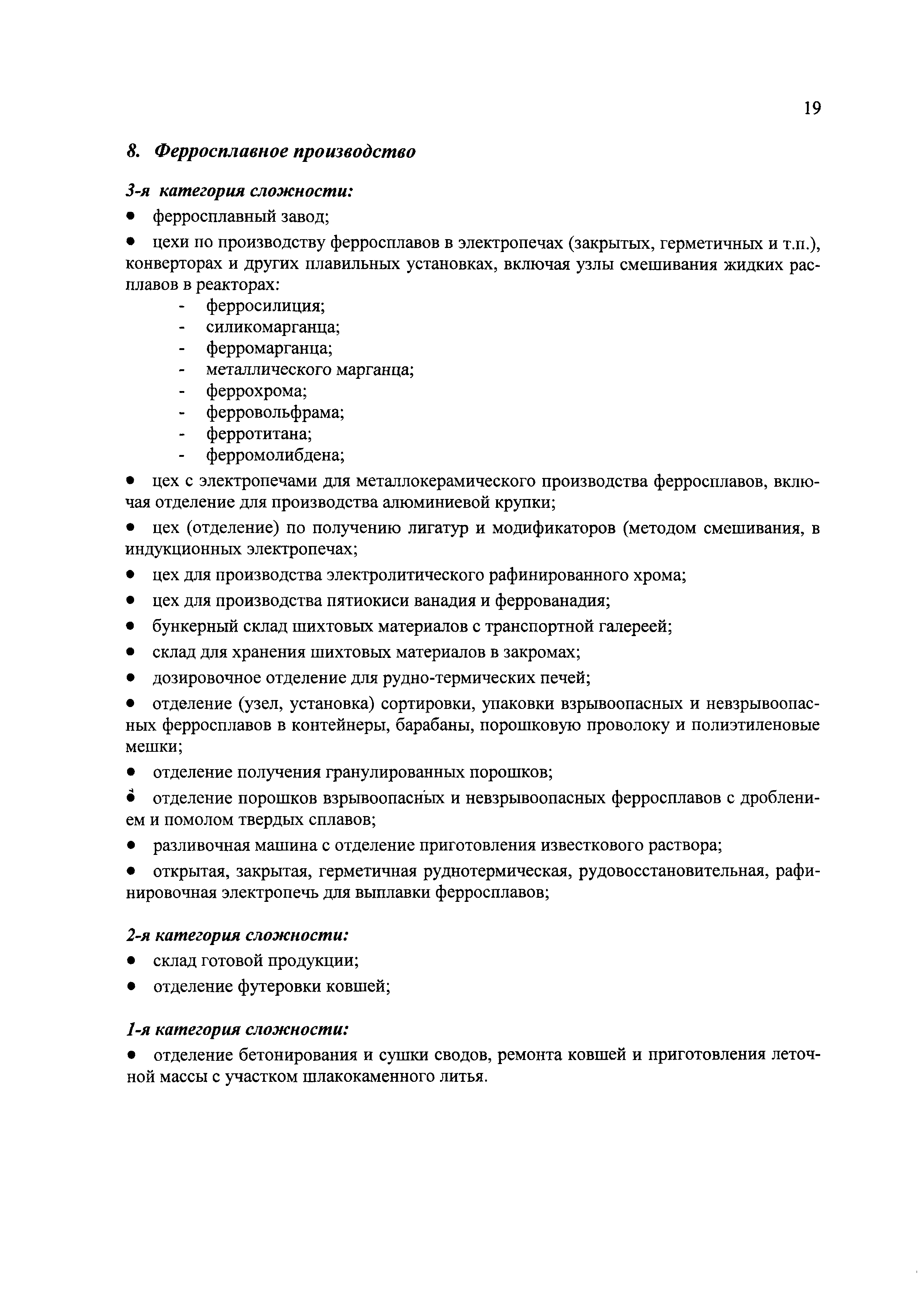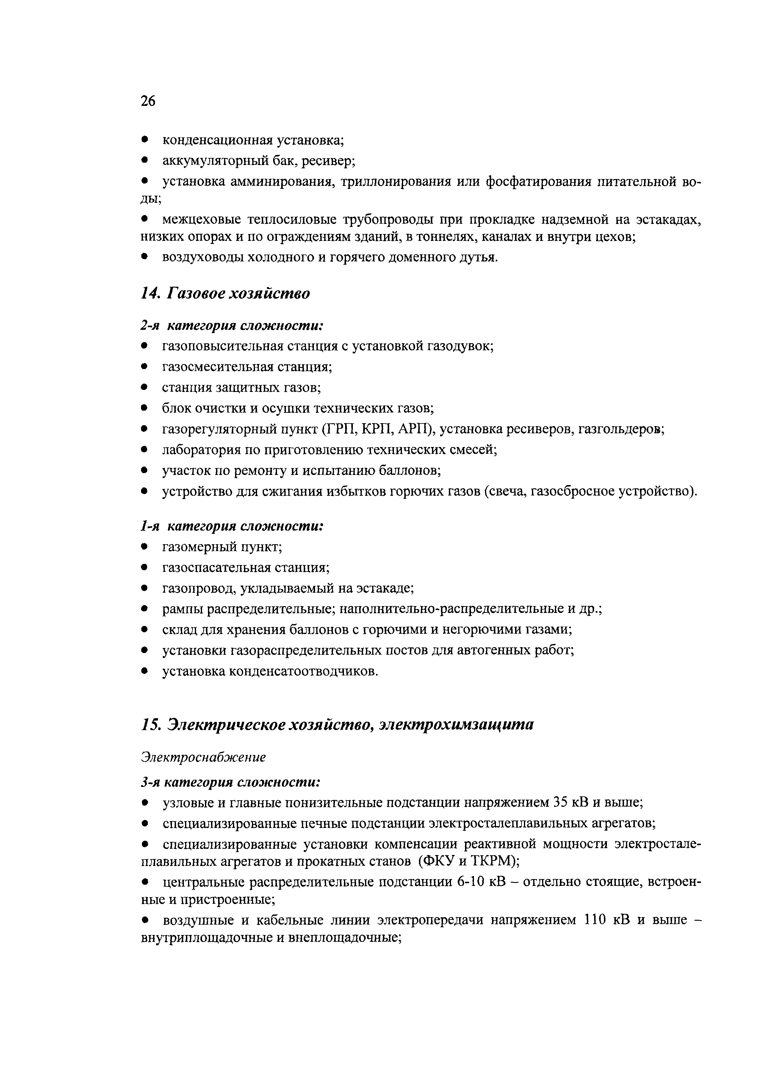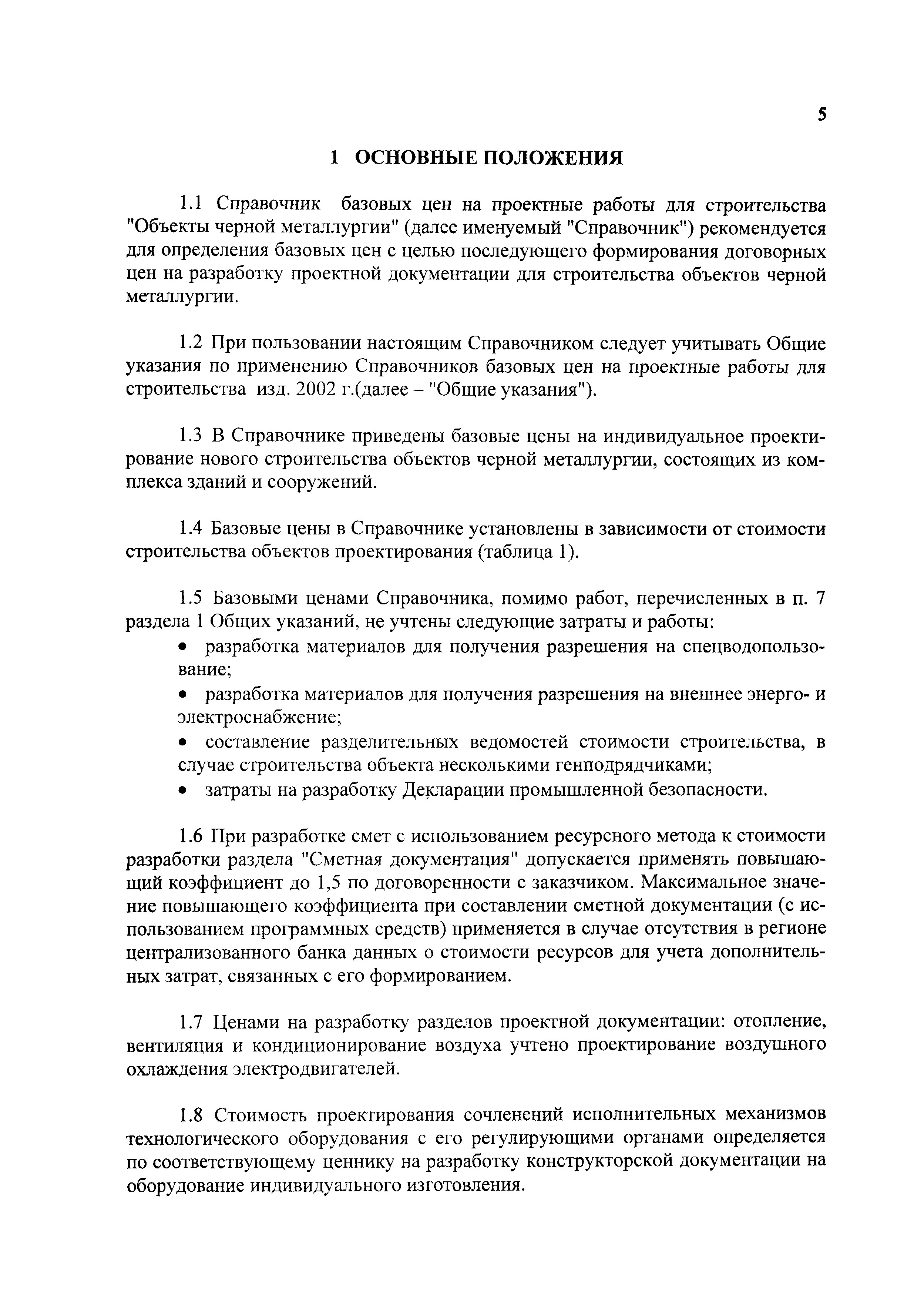 | Оглавление: | 1 Основные положения 2 Базовые цены на роектные работы 3 Порядок определения базовой цены разработки предпроектной документации Приложение 1 Номенклатура объектов черной металлургии А Объекты основного производственного назначения 1 Доменное производство 2 Бескоксовое производство жидкого металла 3 Производство металлизированного сырья 4 Сталеплавильное производство 5 Прокатное производство 6 Трубное и труболитейное производство 7 Производство железных, легированных порошков и изделий из них 8 Ферросплавное производство 9 Переработка шлаков металлургического и ферросплавного производств 10 Метизное производство Б Вспомогательные объекты металлургического и ферросплавного производств 11 Производство извести, шлакообразующих материалов, огнеупоров 12 Складское хозяйство и межцеховой механический транспорт 13 Теплосиловое хозяйство 14 Газовое хозяйство 15 Электрическое хозяйство, электрохимзащита 16 Сооружения и сети водоснабжения и канализации, очистки промышленных стоков 17 Объекты вентиляции 18 Ремонтное хозяйство, лаборатории 19 Административно-бытовые здания и сооружения 20 Оъекты транспорта 21 Объекты по переработке отходов металлургических предприятий В Агломерационное производство Г Коксохимическое производство Приложение 2 Относительная стоимость разработки разделов проектной документации в процентах от базовой цены Приложение 3 Пример определения базовой цены проектирования объекта, показатели стоимости строительства которого находятся между показателями, приведенными в таблице 1 Справочника базовых цен на проектные работы |