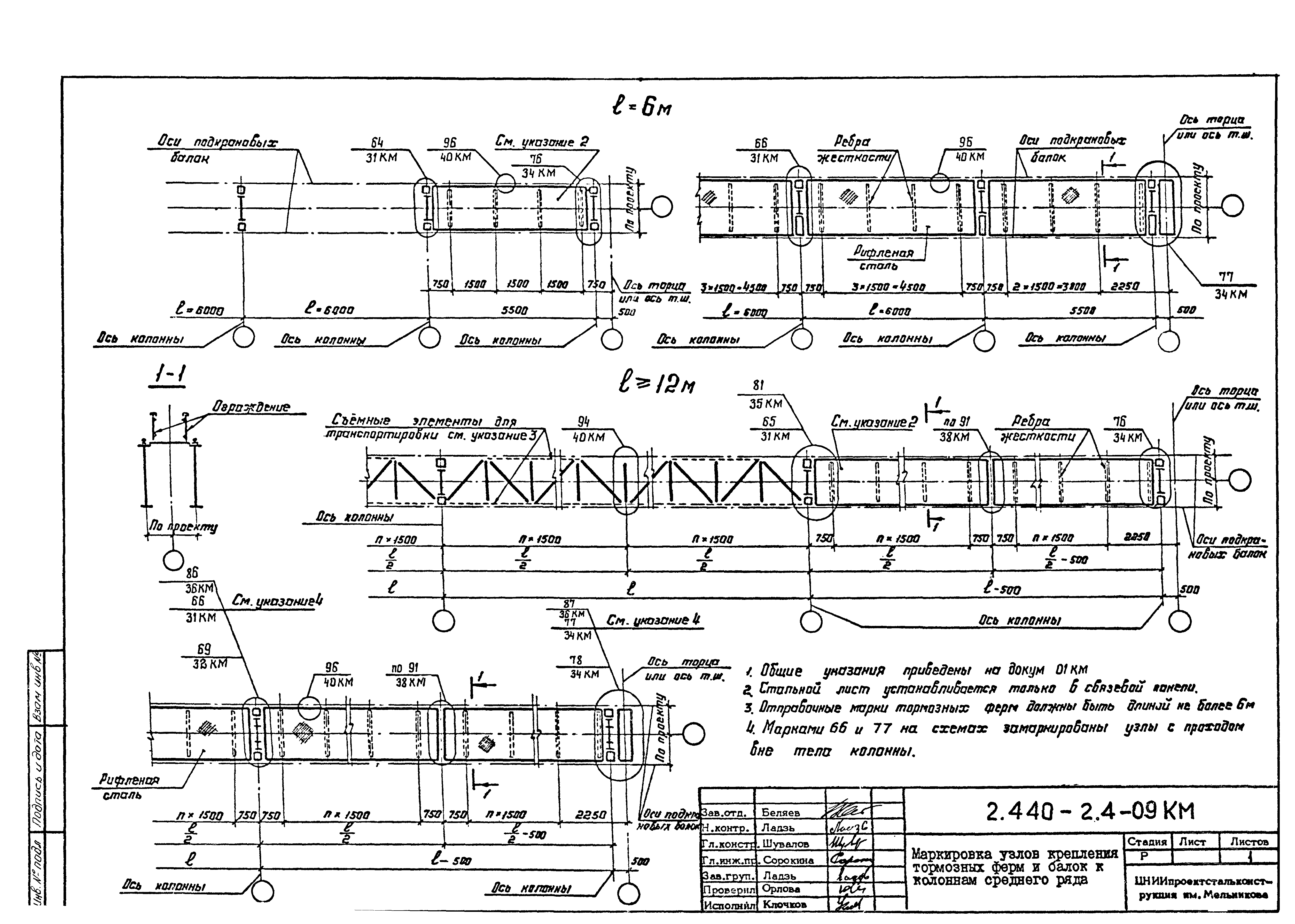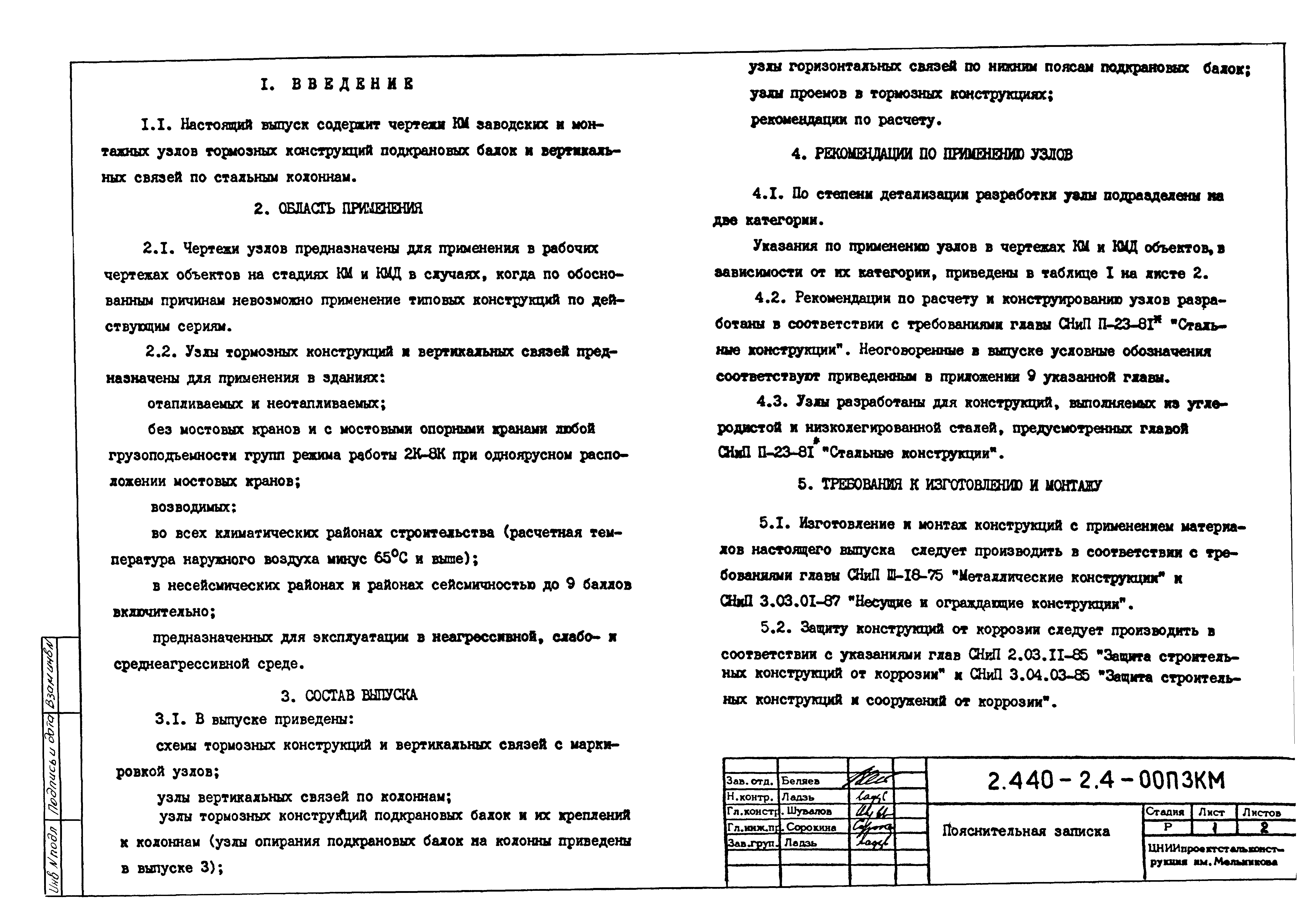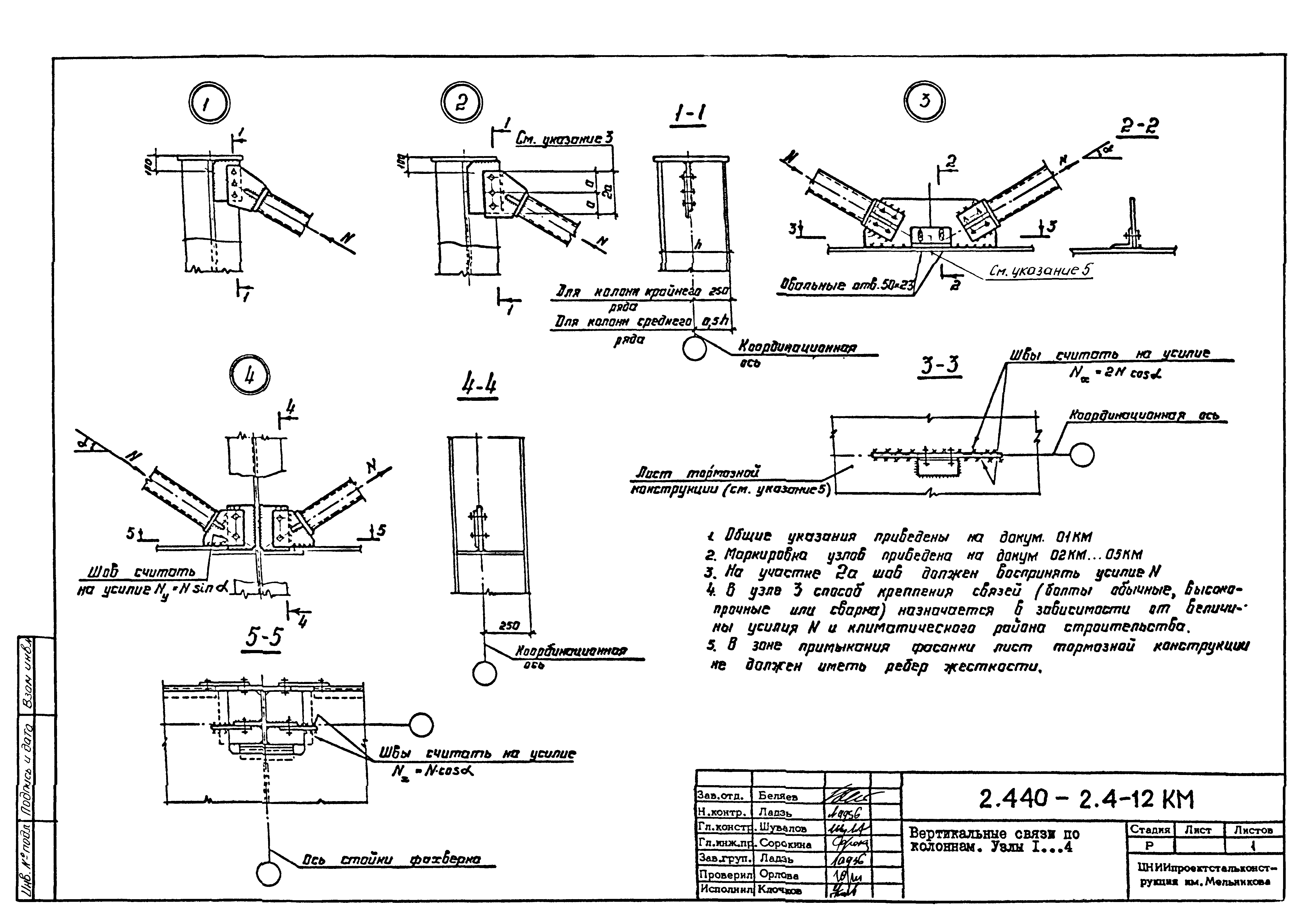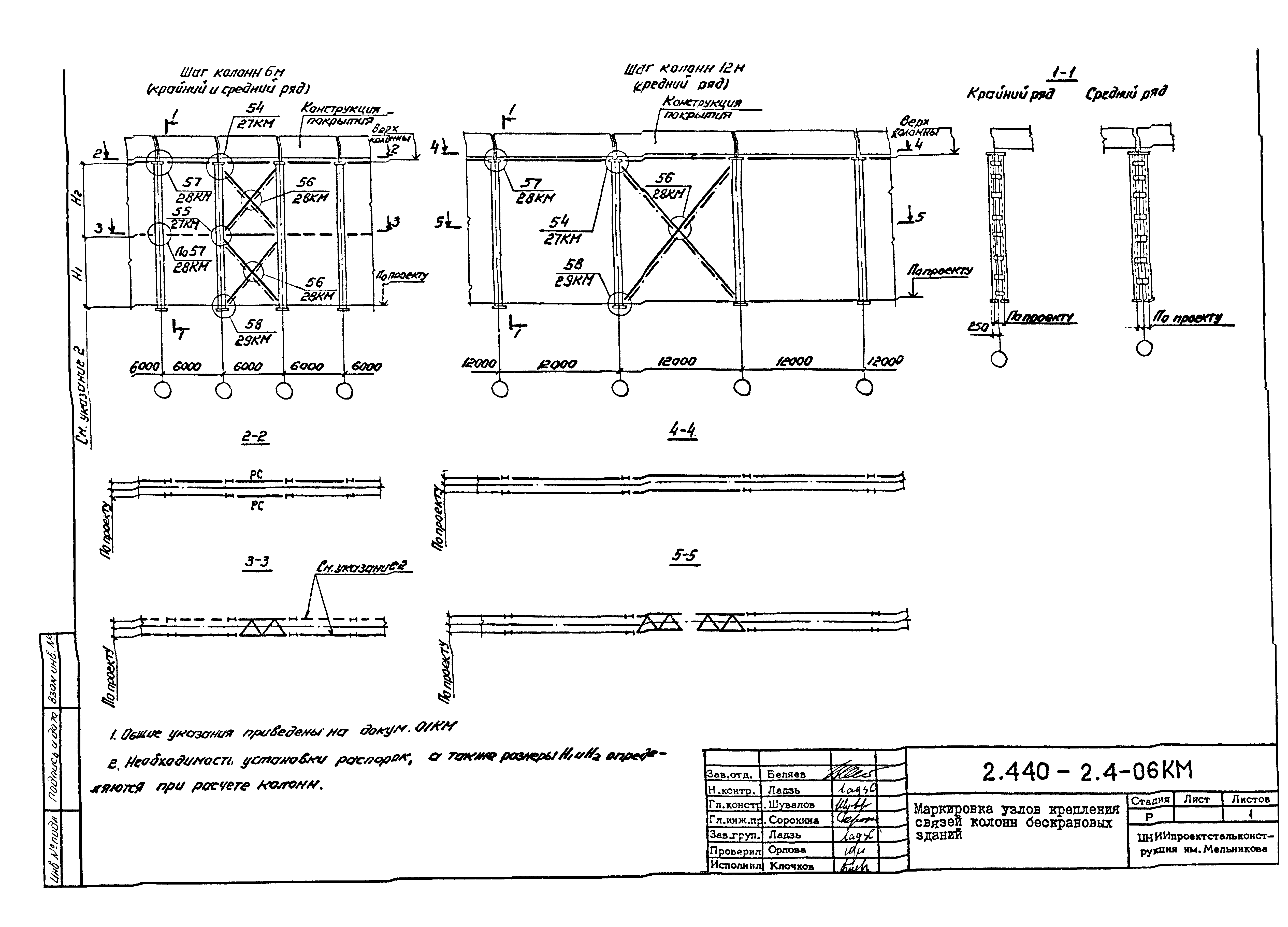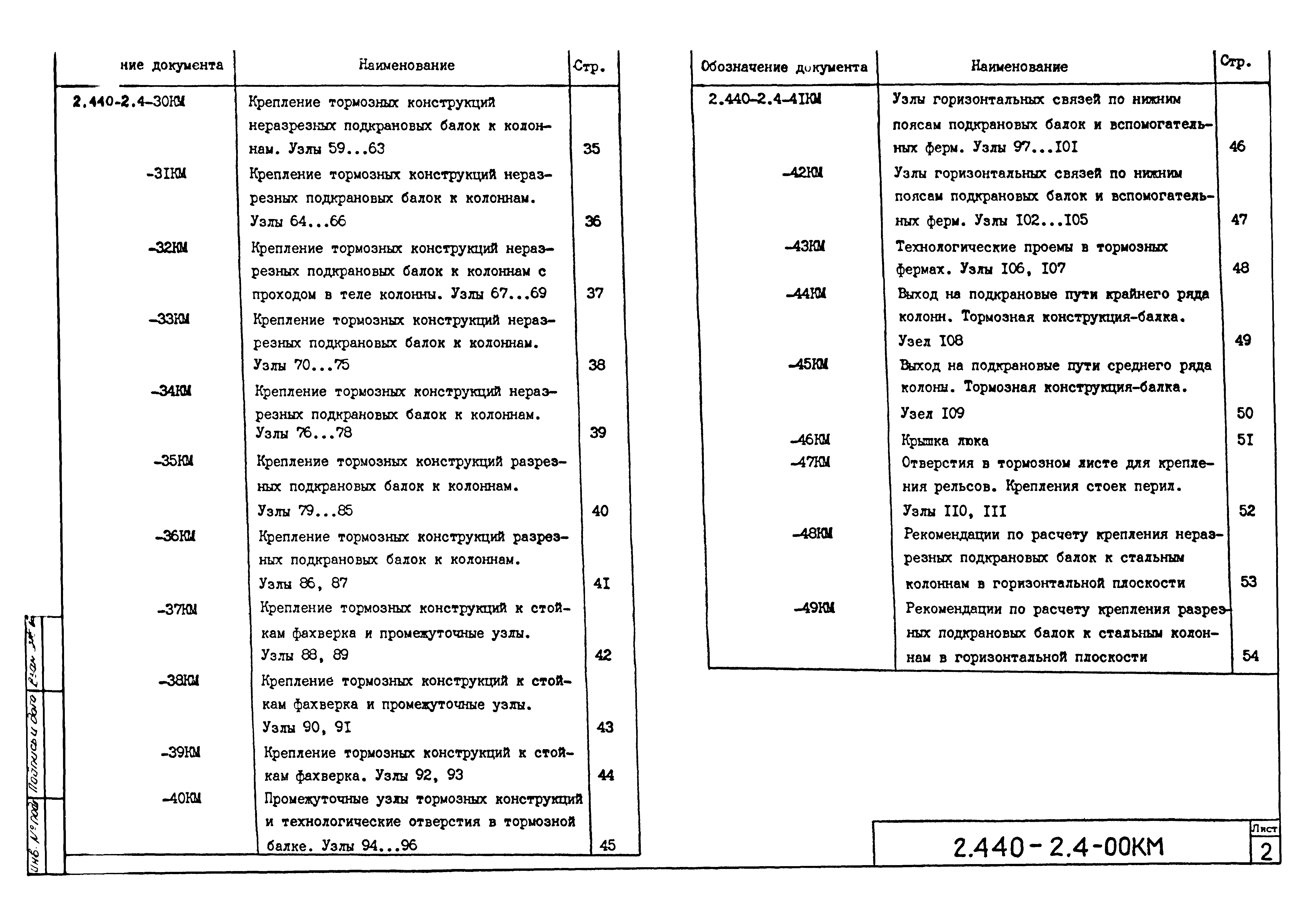 | Оглавление: | 2.440-2.4-00П3КМ Пояснительная записка 2.440-2.4-01КМ Общие указания 2.440-2.4-02КМ Маркировка узлов крепления связей по крайним рядам колонн постоянного сечения 2.440-2.4-03КМ Маркировка узлов крепления связей по средним рядам колонн постоянного сечения 2.440-2.4-04КМ Маркировка узлов крепления связей по крайним рядам ступенчатых колонн 2.440-2.4-05КМ Маркировка узлов крепления связей по средним рядам ступенчатых колонн 2.440-2.4-06КМ Маркировка узлов крепления связей колонн бескрановых зданий 2.440-2.4-07КМ Маркировка узлов крепления тормозных балок к колоннам крайнего ряда 2.440-2.4-08КМ Маркировка узлов крепления тормозных ферм к колоннам крайнего ряда 2.440-2.4-09КМ Маркировка узлов крепления тормозных ферм и балок к колоннам среднего ряда 2.440-2.4-10КМ Маркировка узлов связей по нижним поясам подкрановых балок и вспомогательных ферм 2.440-2.4-11КМ Маркировка узлов проемов и технологических отверстий в тормозных конструкциях 2.440-2.4-12КМ Вертикальные связи по колоннам. Узлы 1…4 2.440-2.4-13КМ Вертикальные связи по колоннам. Узлы 5…10 2.440-2.4-14КМ Вертикальные связи по колоннам.. Узлы 11…16 2.440-2.4-15КМ Вертикальные связи по колоннам. Узлы 18…24 2.440-2.4-16КМ Вертикальные связи по колоннам. Узлы 25…28 2.440-2.4-17КМ Вертикальные связи по колоннам. Узлы 29…32 2.440-2.4-18КМ Вертикальные связи по колоннам. Узлы 33…35 2.440-2.4-19КМ Вертикальные связи по колоннам. Узлы 36, 37 2.440-2.4-20КМ Вертикальные связи по колоннам. Узлы 38…41 2.440-2.4-21КМ Вертикальные связи по колоннам. Узлы 42, 43 2.440-2.4-22КМ Вертикальные связи по колоннам. Узлы 44, 45 2.440-2.4-23КМ Вертикальные связи по колоннам. Узлы 46, 47 2.440-2.4-24КМ Вертикальные связи по колоннам. Узлы 48, 49 2.440-2.4-25КМ Вертикальные связи по колоннам. Узлы 50, 51 2.440-2.4-26КМ Вертикальные связи по колоннам. Узлы 52, 53 2.440-2.4-27КМ Вертикальные связи по колоннам. Узлы 54, 55 2.440-2.4-28КМ Вертикальные связи по колоннам. Узлы 56, 57 2.440-2.4-29КМ Вертикальные связи, по колоннам. Узел 58 2.440-2.4-30КМ Крепление тормозных конструкций неразрезных подкрановых балок к колоннам. Узлы 59…63 2.440-2.4-31КМ Крепление тормозных конструкций неразрезных подкрановых балок к колоннам. Узлы 64…66 2.440-2.4-32КМ Крепление тормозных конструкций неразрезных подкрановых балок к колоннам с проходом в теле колонны. Узлы 67…69 2.440-2.4-33КМ Крепление тормозных конструкций неразрезных подкрановых балок к колоннам. Узлы 70…75 2.440-2.4-34КМ Крепление тормозных конструкций неразрезных подкрановых балок к колоннам. Узлы 76…78 2.440-2.4-35КМ Крепление тормозных конструкций разрезных подкрановых балок к колоннам. Узлы 79…85 2.440-2.4-36КМ Крепление тормозных конструкций разрезных подкрановых балок к колоннам. Узлы 86, 87 2.440-2.4-37КМ Крепление тормозных конструкций к стойкам фахверка и промежуточные узлы. Узлы 88, 89 2.440-2.4-38КМ Крепление тормозных конструкций к стойкам фахверка и промежуточные узлы. Узлы 90, 91 2.440-2.4-39КМ Крепление тормозных конструкций к стойкам фахверка. Узлы 92, 93 2.440-2.4-40КМ Промежуточные узлы тормозных конструкций и технологические отверстия в тормозной балке. Узлы 94…96 2.440-2.4-41КМ Узлы горизонтальных связей по нижним поясам подкрановых балок и вспомогательных ферм. Узлы 97…101 2.440-2.4-42КМ Узлы горизонтальных связей по нижним поясам подкрановых балок и вспомогательных ферм. Узлы 102…105 2.440-2.4-43КМ Технологические проемы в тормозных фермах. Узлы 106, 107 2.440-2.4-44КМ Выход на подкрановые пути крайнего ряда колонн. Тормозная конструкция-балка. Узел 108 2.440-2.4-45КМ Выход на подкрановые пути среднего ря