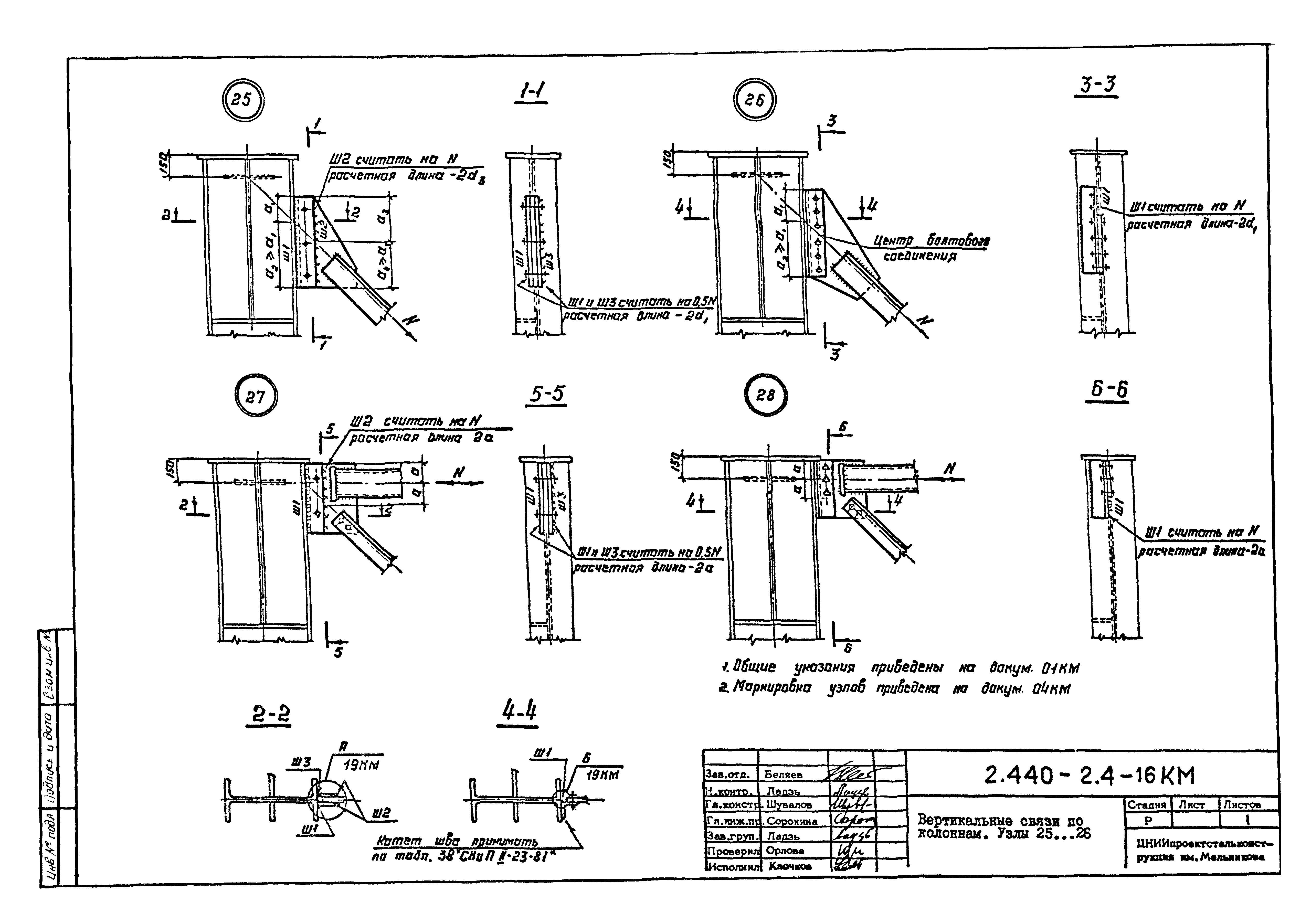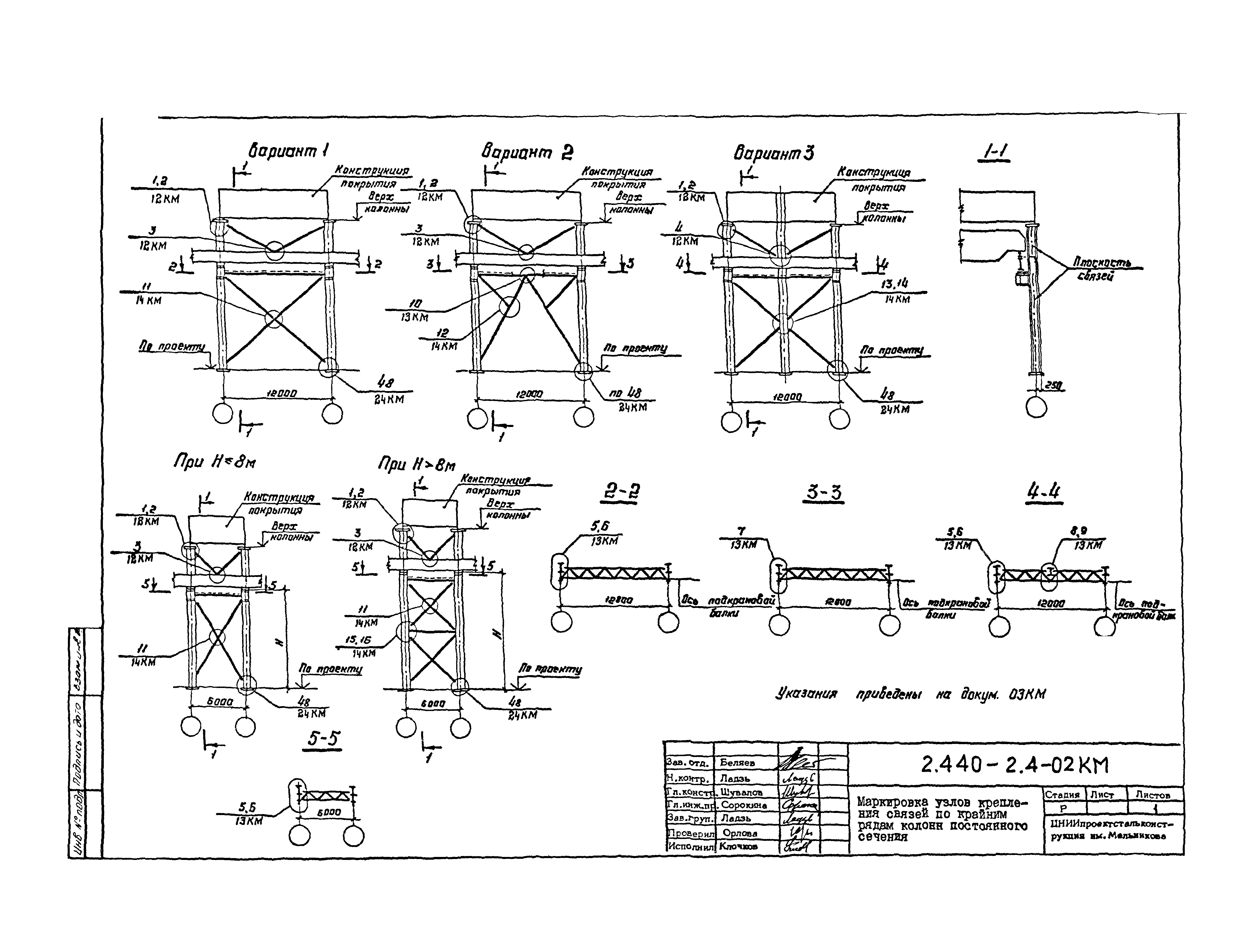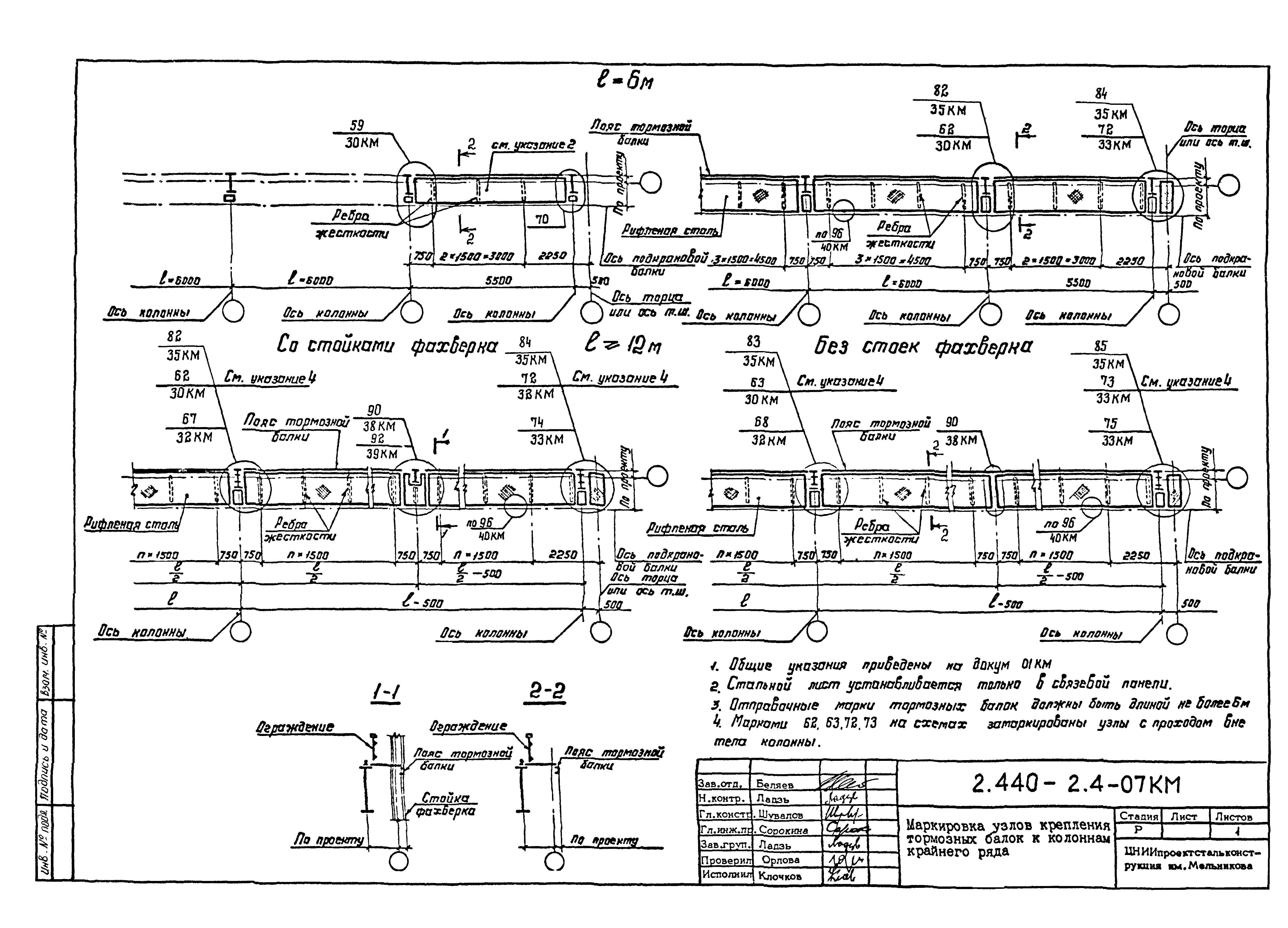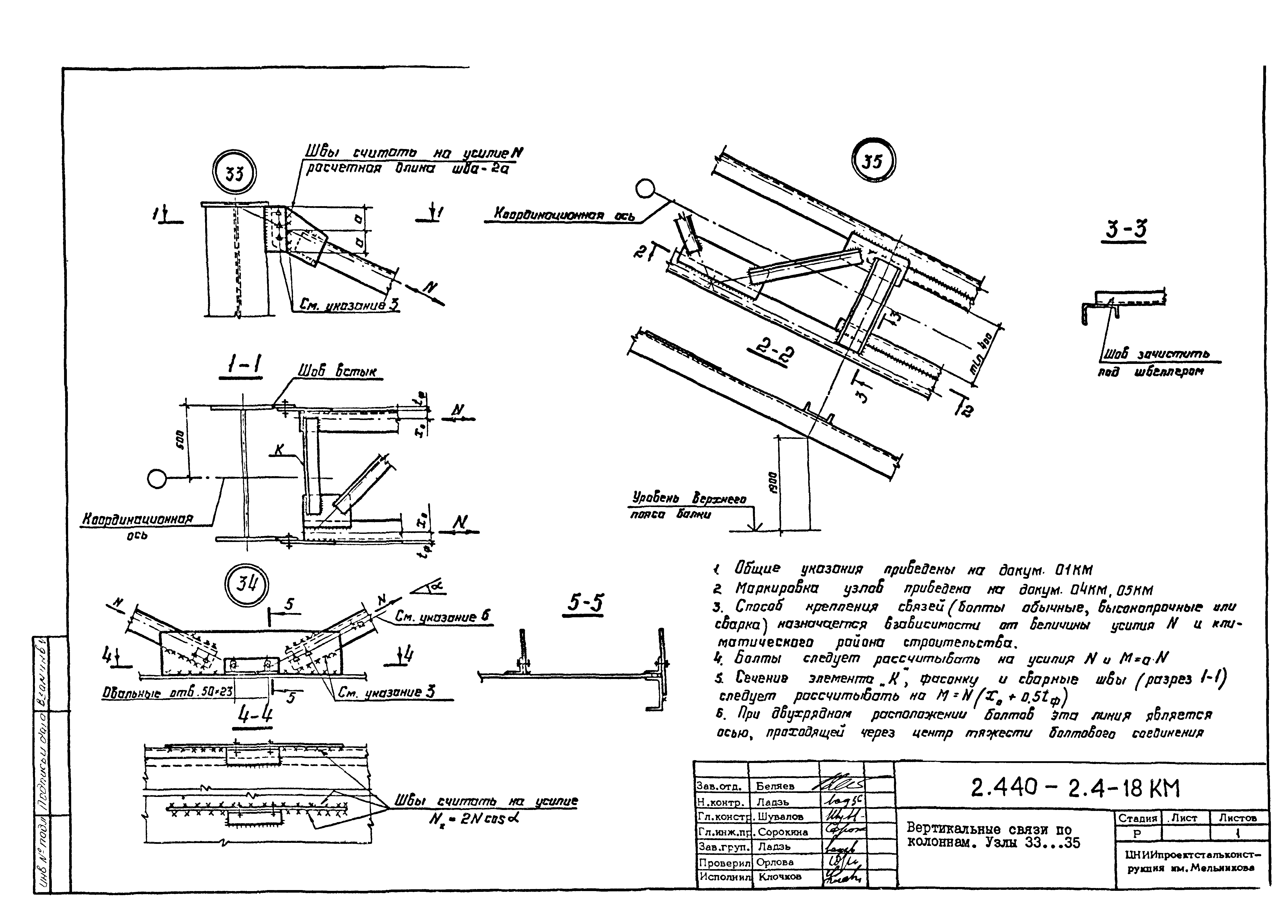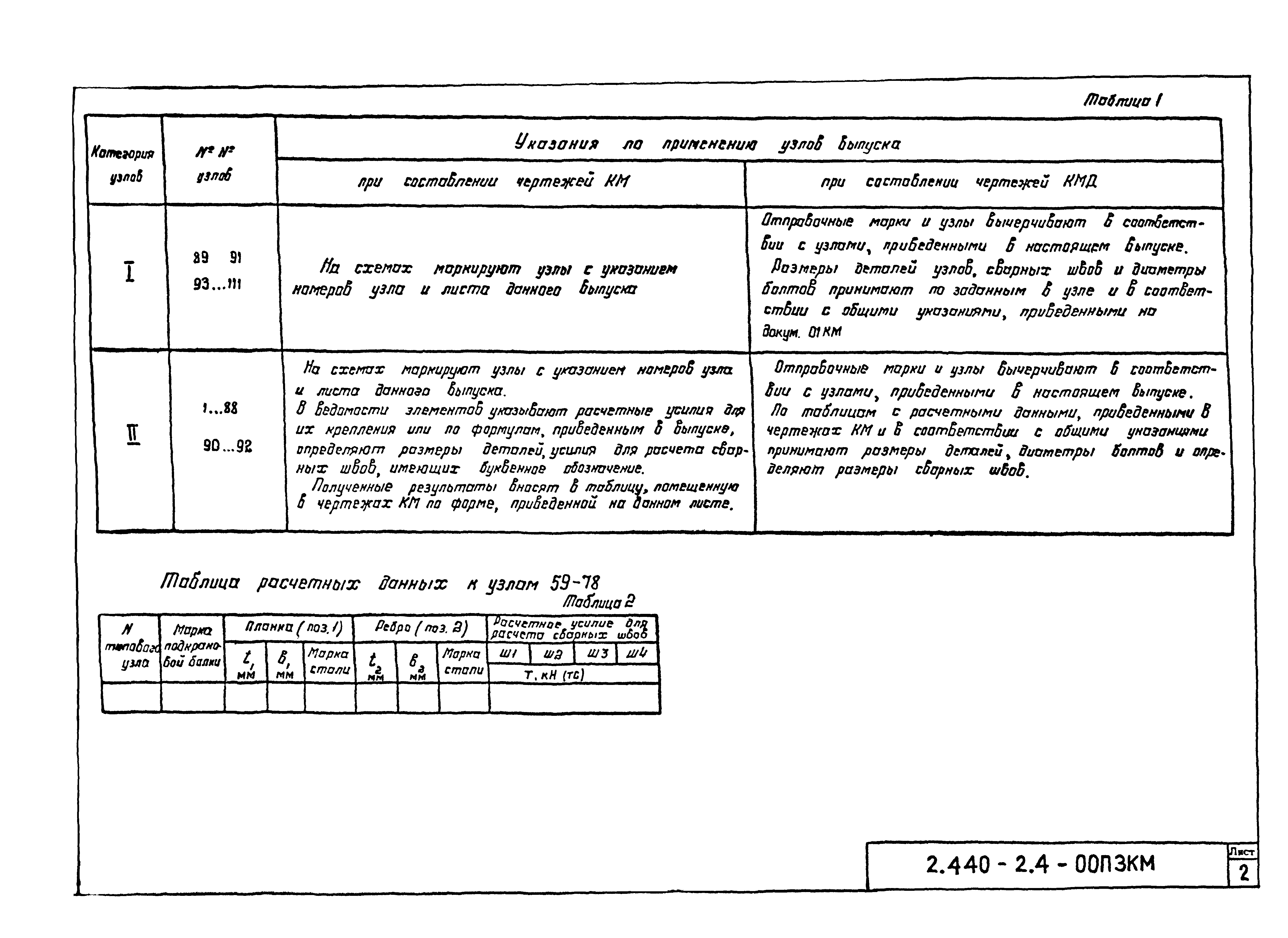 | Оглавление: | 2.440-2.4-00П3КМ Пояснительная записка 2.440-2.4-01КМ Общие указания 2.440-2.4-02КМ Маркировка узлов крепления связей по крайним рядам колонн постоянного сечения 2.440-2.4-03КМ Маркировка узлов крепления связей по средним рядам колонн постоянного сечения 2.440-2.4-04КМ Маркировка узлов крепления связей по крайним рядам ступенчатых колонн 2.440-2.4-05КМ Маркировка узлов крепления связей по средним рядам ступенчатых колонн 2.440-2.4-06КМ Маркировка узлов крепления связей колонн бескрановых зданий 2.440-2.4-07КМ Маркировка узлов крепления тормозных балок к колоннам крайнего ряда 2.440-2.4-08КМ Маркировка узлов крепления тормозных ферм к колоннам крайнего ряда 2.440-2.4-09КМ Маркировка узлов крепления тормозных ферм и балок к колоннам среднего ряда 2.440-2.4-10КМ Маркировка узлов связей по нижним поясам подкрановых балок и вспомогательных ферм 2.440-2.4-11КМ Маркировка узлов проемов и технологических отверстий в тормозных конструкциях 2.440-2.4-12КМ Вертикальные связи по колоннам. Узлы 1…4 2.440-2.4-13КМ Вертикальные связи по колоннам. Узлы 5…10 2.440-2.4-14КМ Вертикальные связи по колоннам.. Узлы 11…16 2.440-2.4-15КМ Вертикальные связи по колоннам. Узлы 18…24 2.440-2.4-16КМ Вертикальные связи по колоннам. Узлы 25…28 2.440-2.4-17КМ Вертикальные связи по колоннам. Узлы 29…32 2.440-2.4-18КМ Вертикальные связи по колоннам. Узлы 33…35 2.440-2.4-19КМ Вертикальные связи по колоннам. Узлы 36, 37 2.440-2.4-20КМ Вертикальные связи по колоннам. Узлы 38…41 2.440-2.4-21КМ Вертикальные связи по колоннам. Узлы 42, 43 2.440-2.4-22КМ Вертикальные связи по колоннам. Узлы 44, 45 2.440-2.4-23КМ Вертикальные связи по колоннам. Узлы 46, 47 2.440-2.4-24КМ Вертикальные связи по колоннам. Узлы 48, 49 2.440-2.4-25КМ Вертикальные связи по колоннам. Узлы 50, 51 2.440-2.4-26КМ Вертикальные связи по колоннам. Узлы 52, 53 2.440-2.4-27КМ Вертикальные связи по колоннам. Узлы 54, 55 2.440-2.4-28КМ Вертикальные связи по колоннам. Узлы 56, 57 2.440-2.4-29КМ Вертикальные связи, по колоннам. Узел 58 2.440-2.4-30КМ Крепление тормозных конструкций неразрезных подкрановых балок к колоннам. Узлы 59…63 2.440-2.4-31КМ Крепление тормозных конструкций неразрезных подкрановых балок к колоннам. Узлы 64…66 2.440-2.4-32КМ Крепление тормозных конструкций неразрезных подкрановых балок к колоннам с проходом в теле колонны. Узлы 67…69 2.440-2.4-33КМ Крепление тормозных конструкций неразрезных подкрановых балок к колоннам. Узлы 70…75 2.440-2.4-34КМ Крепление тормозных конструкций неразрезных подкрановых балок к колоннам. Узлы 76…78 2.440-2.4-35КМ Крепление тормозных конструкций разрезных подкрановых балок к колоннам. Узлы 79…85 2.440-2.4-36КМ Крепление тормозных конструкций разрезных подкрановых балок к колоннам. Узлы 86, 87 2.440-2.4-37КМ Крепление тормозных конструкций к стойкам фахверка и промежуточные узлы. Узлы 88, 89 2.440-2.4-38КМ Крепление тормозных конструкций к стойкам фахверка и промежуточные узлы. Узлы 90, 91 2.440-2.4-39КМ Крепление тормозных конструкций к стойкам фахверка. Узлы 92, 93 2.440-2.4-40КМ Промежуточные узлы тормозных конструкций и технологические отверстия в тормозной балке. Узлы 94…96 2.440-2.4-41КМ Узлы горизонтальных связей по нижним поясам подкрановых балок и вспомогательных ферм. Узлы 97…101 2.440-2.4-42КМ Узлы горизонтальных связей по нижним поясам подкрановых балок и вспомогательных ферм. Узлы 102…105 2.440-2.4-43КМ Технологические проемы в тормозных фермах. Узлы 106, 107 2.440-2.4-44КМ Выход на подкрановые пути крайнего ряда колонн. Тормозная конструкция-балка. Узел 108 2.440-2.4-45КМ Выход на подкрановые пути среднего ря