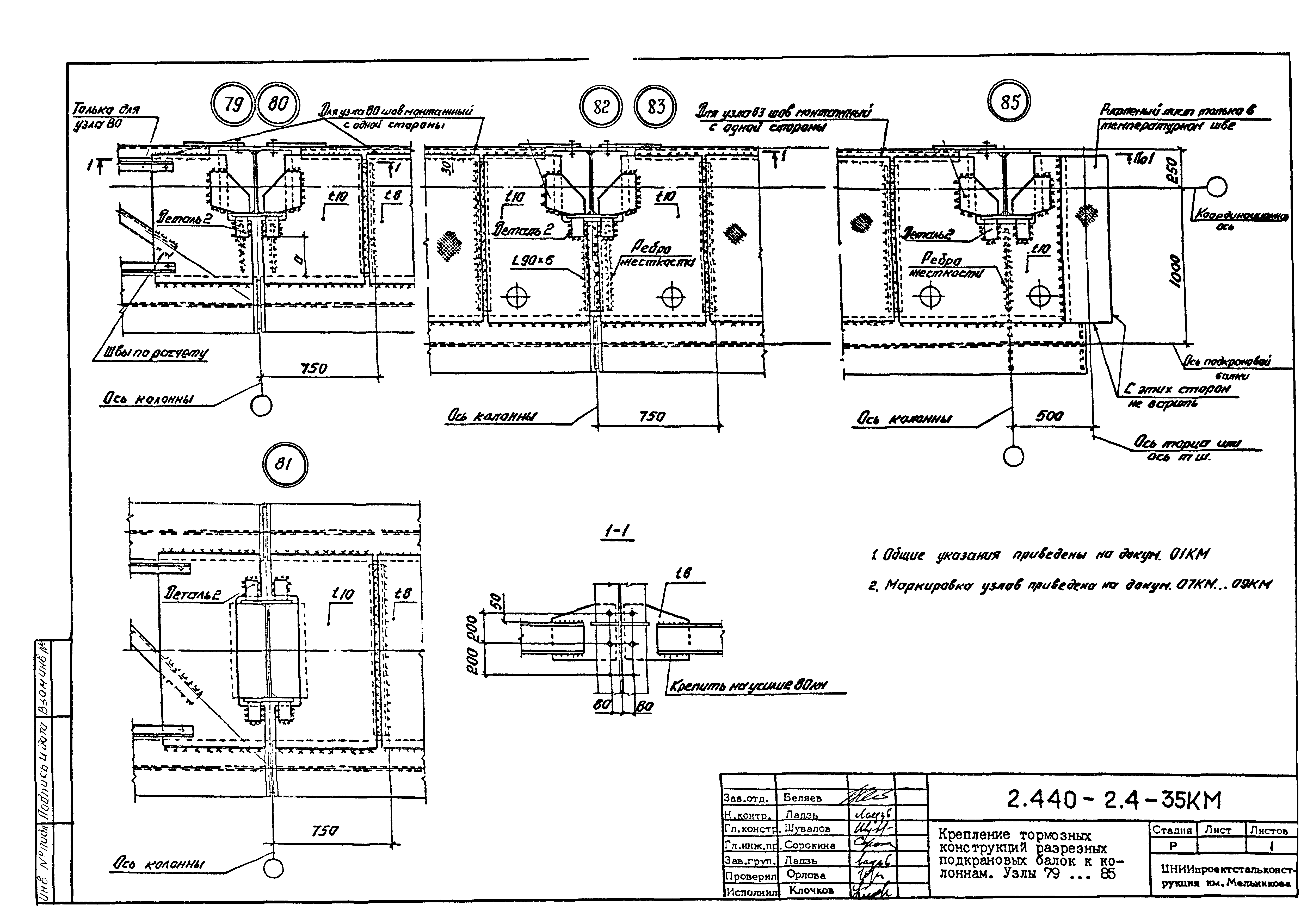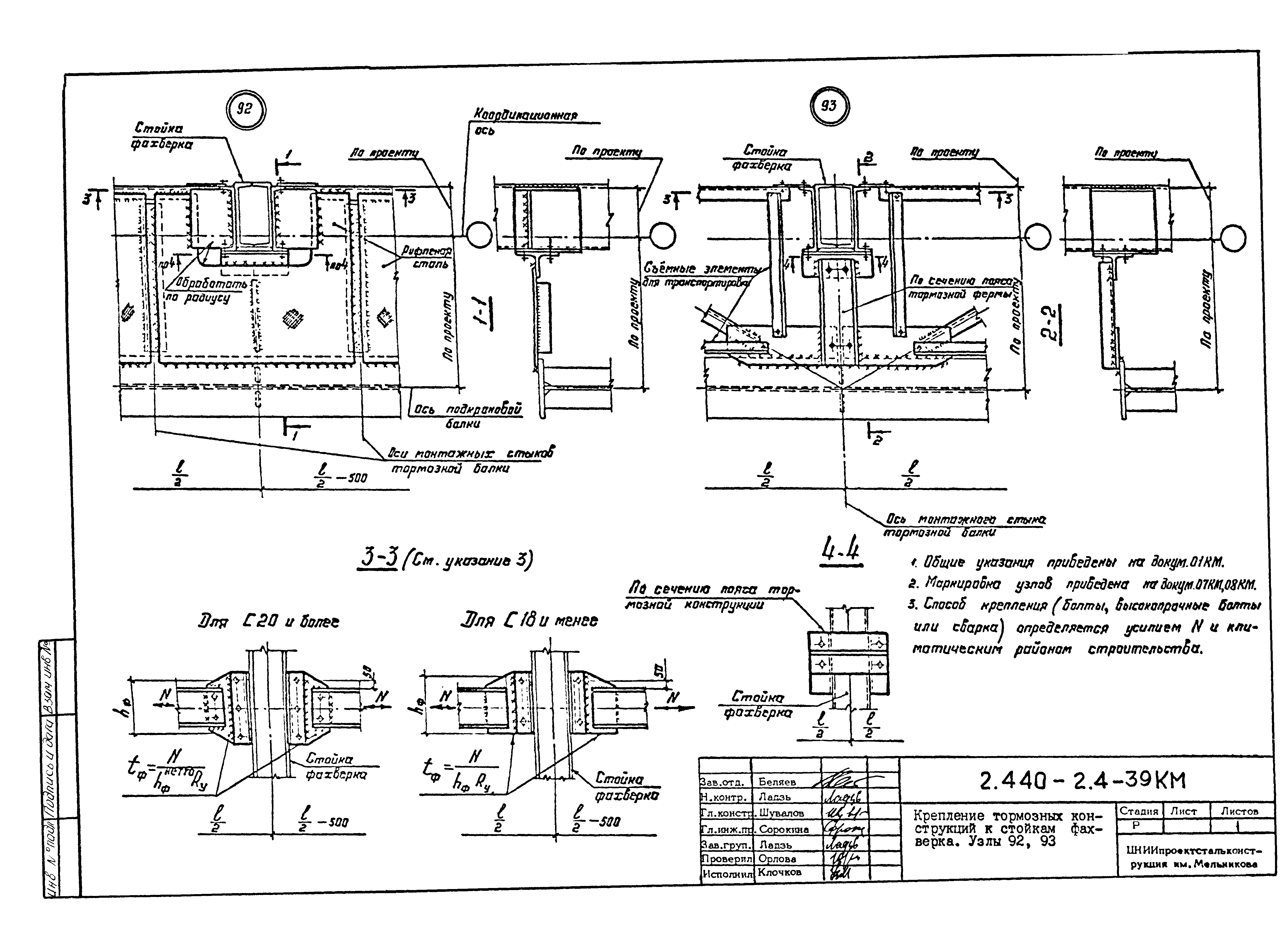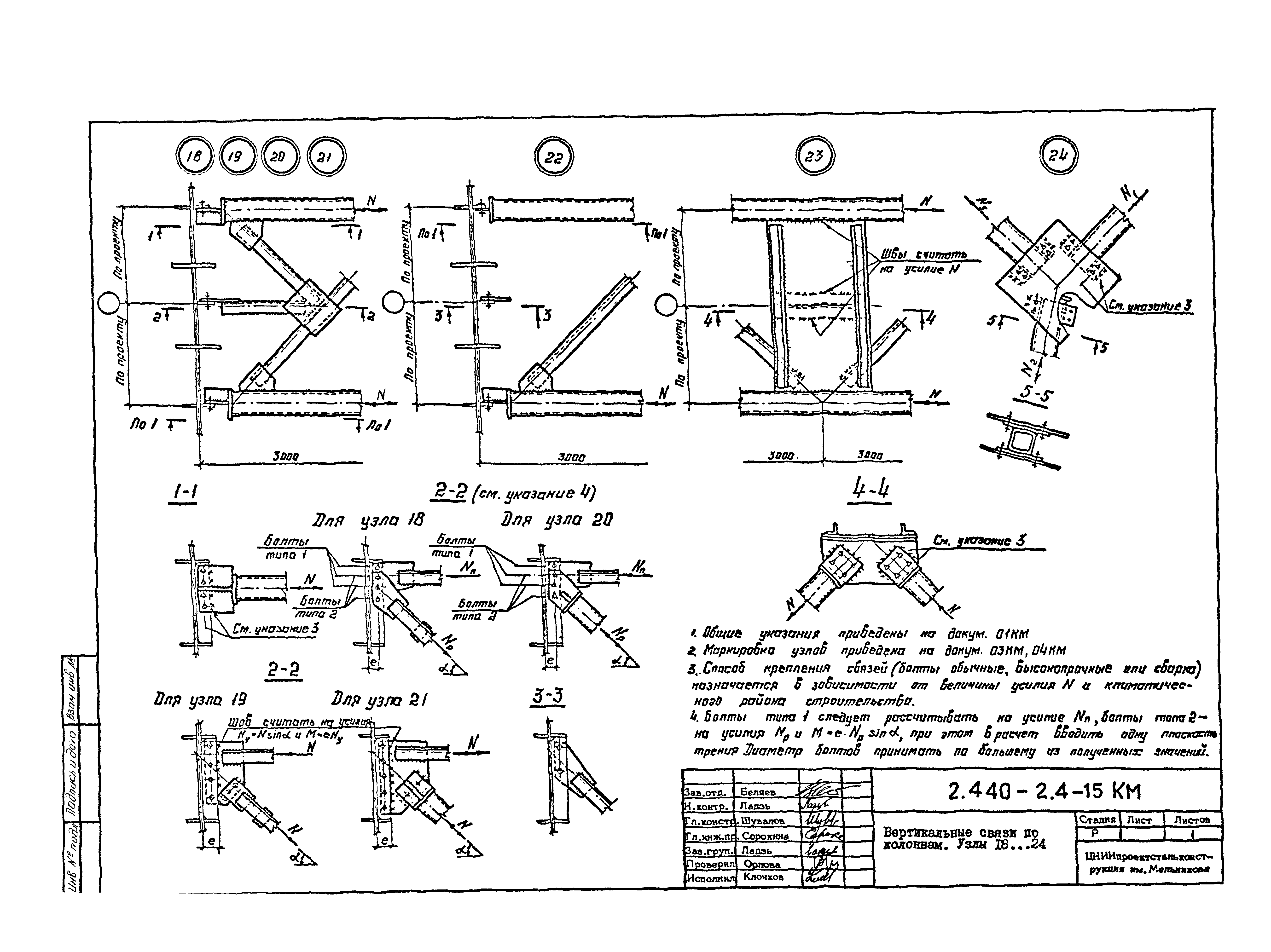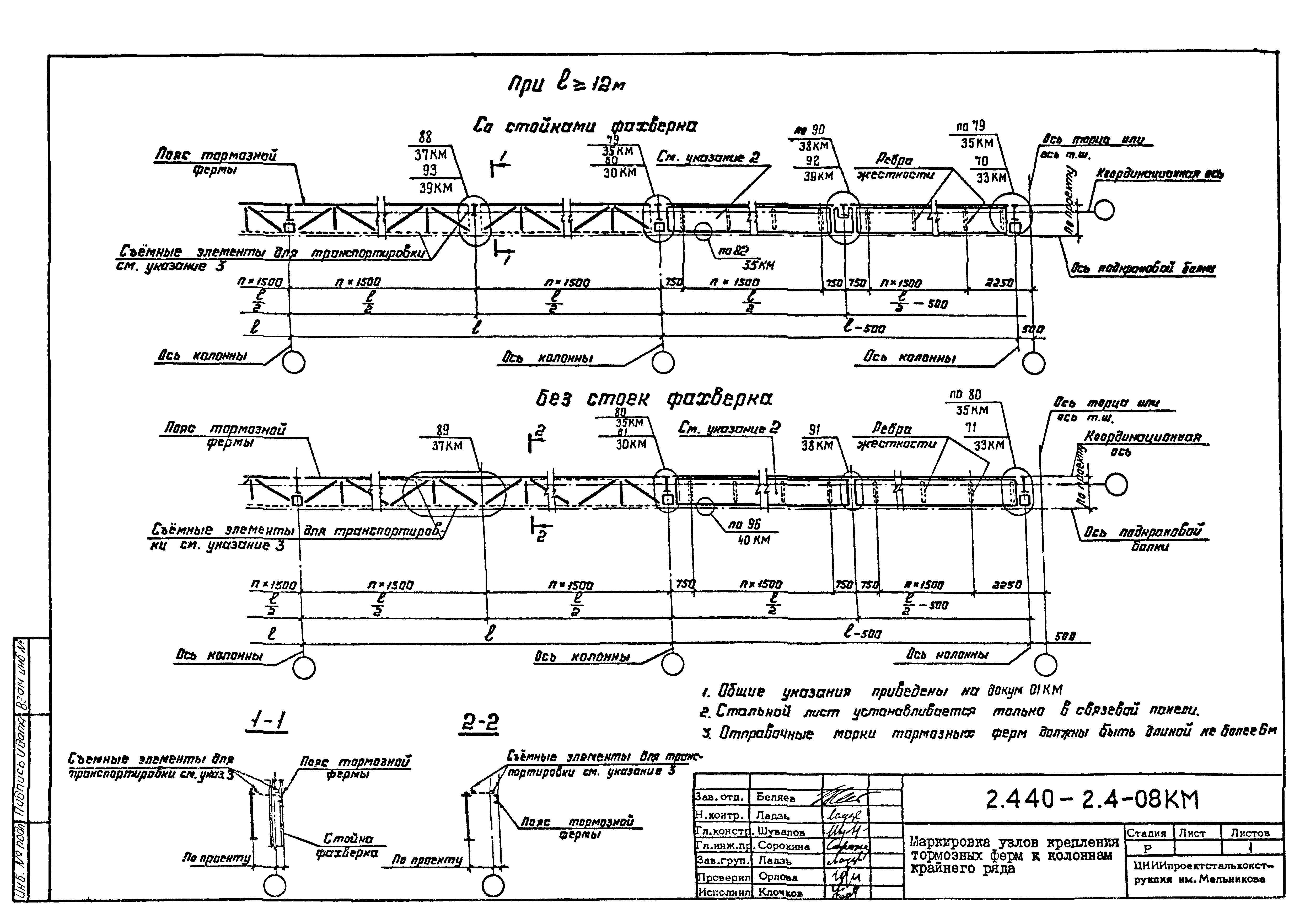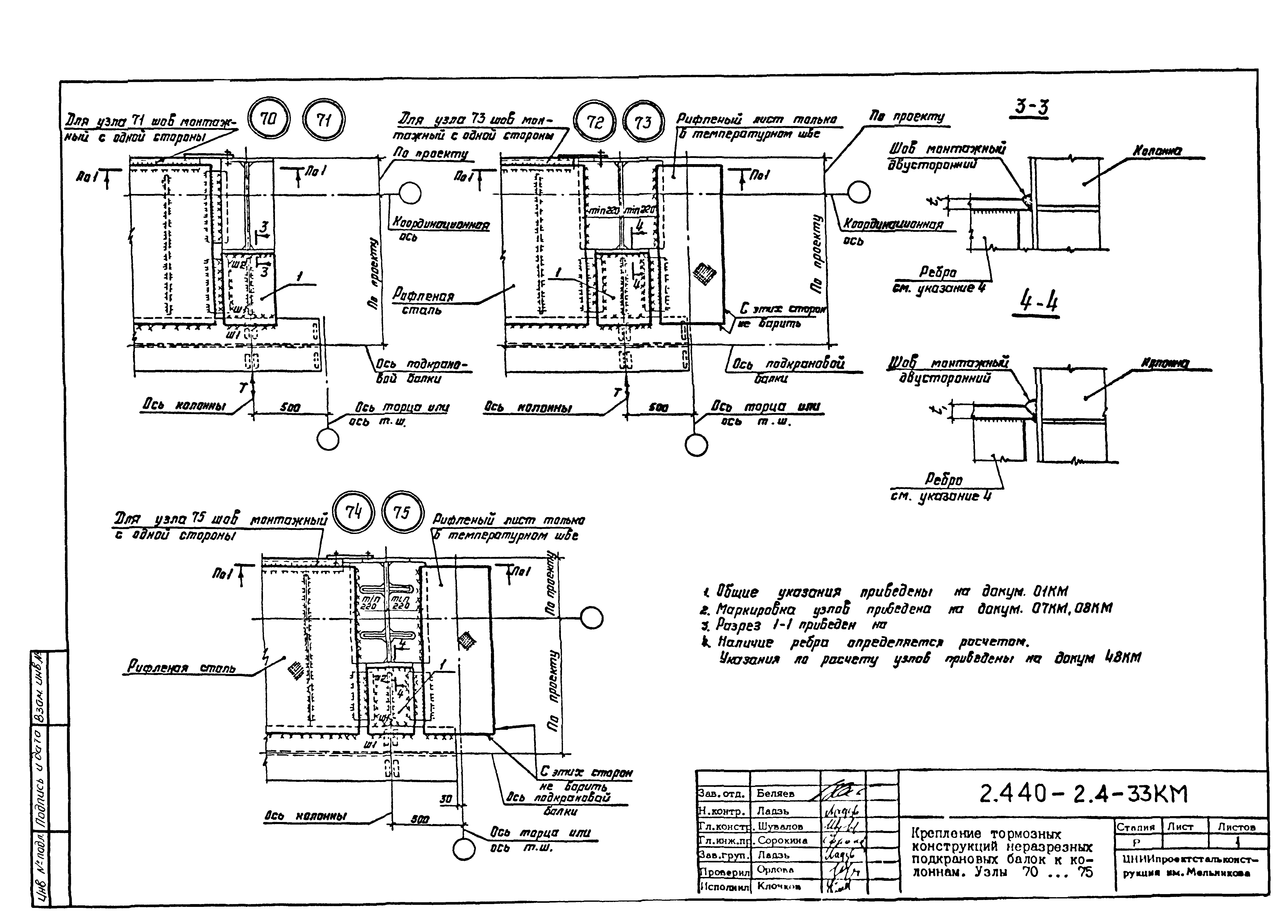 | Оглавление: | 2.440-2.4-00П3КМ Пояснительная записка 2.440-2.4-01КМ Общие указания 2.440-2.4-02КМ Маркировка узлов крепления связей по крайним рядам колонн постоянного сечения 2.440-2.4-03КМ Маркировка узлов крепления связей по средним рядам колонн постоянного сечения 2.440-2.4-04КМ Маркировка узлов крепления связей по крайним рядам ступенчатых колонн 2.440-2.4-05КМ Маркировка узлов крепления связей по средним рядам ступенчатых колонн 2.440-2.4-06КМ Маркировка узлов крепления связей колонн бескрановых зданий 2.440-2.4-07КМ Маркировка узлов крепления тормозных балок к колоннам крайнего ряда 2.440-2.4-08КМ Маркировка узлов крепления тормозных ферм к колоннам крайнего ряда 2.440-2.4-09КМ Маркировка узлов крепления тормозных ферм и балок к колоннам среднего ряда 2.440-2.4-10КМ Маркировка узлов связей по нижним поясам подкрановых балок и вспомогательных ферм 2.440-2.4-11КМ Маркировка узлов проемов и технологических отверстий в тормозных конструкциях 2.440-2.4-12КМ Вертикальные связи по колоннам. Узлы 1…4 2.440-2.4-13КМ Вертикальные связи по колоннам. Узлы 5…10 2.440-2.4-14КМ Вертикальные связи по колоннам.. Узлы 11…16 2.440-2.4-15КМ Вертикальные связи по колоннам. Узлы 18…24 2.440-2.4-16КМ Вертикальные связи по колоннам. Узлы 25…28 2.440-2.4-17КМ Вертикальные связи по колоннам. Узлы 29…32 2.440-2.4-18КМ Вертикальные связи по колоннам. Узлы 33…35 2.440-2.4-19КМ Вертикальные связи по колоннам. Узлы 36, 37 2.440-2.4-20КМ Вертикальные связи по колоннам. Узлы 38…41 2.440-2.4-21КМ Вертикальные связи по колоннам. Узлы 42, 43 2.440-2.4-22КМ Вертикальные связи по колоннам. Узлы 44, 45 2.440-2.4-23КМ Вертикальные связи по колоннам. Узлы 46, 47 2.440-2.4-24КМ Вертикальные связи по колоннам. Узлы 48, 49 2.440-2.4-25КМ Вертикальные связи по колоннам. Узлы 50, 51 2.440-2.4-26КМ Вертикальные связи по колоннам. Узлы 52, 53 2.440-2.4-27КМ Вертикальные связи по колоннам. Узлы 54, 55 2.440-2.4-28КМ Вертикальные связи по колоннам. Узлы 56, 57 2.440-2.4-29КМ Вертикальные связи, по колоннам. Узел 58 2.440-2.4-30КМ Крепление тормозных конструкций неразрезных подкрановых балок к колоннам. Узлы 59…63 2.440-2.4-31КМ Крепление тормозных конструкций неразрезных подкрановых балок к колоннам. Узлы 64…66 2.440-2.4-32КМ Крепление тормозных конструкций неразрезных подкрановых балок к колоннам с проходом в теле колонны. Узлы 67…69 2.440-2.4-33КМ Крепление тормозных конструкций неразрезных подкрановых балок к колоннам. Узлы 70…75 2.440-2.4-34КМ Крепление тормозных конструкций неразрезных подкрановых балок к колоннам. Узлы 76…78 2.440-2.4-35КМ Крепление тормозных конструкций разрезных подкрановых балок к колоннам. Узлы 79…85 2.440-2.4-36КМ Крепление тормозных конструкций разрезных подкрановых балок к колоннам. Узлы 86, 87 2.440-2.4-37КМ Крепление тормозных конструкций к стойкам фахверка и промежуточные узлы. Узлы 88, 89 2.440-2.4-38КМ Крепление тормозных конструкций к стойкам фахверка и промежуточные узлы. Узлы 90, 91 2.440-2.4-39КМ Крепление тормозных конструкций к стойкам фахверка. Узлы 92, 93 2.440-2.4-40КМ Промежуточные узлы тормозных конструкций и технологические отверстия в тормозной балке. Узлы 94…96 2.440-2.4-41КМ Узлы горизонтальных связей по нижним поясам подкрановых балок и вспомогательных ферм. Узлы 97…101 2.440-2.4-42КМ Узлы горизонтальных связей по нижним поясам подкрановых балок и вспомогательных ферм. Узлы 102…105 2.440-2.4-43КМ Технологические проемы в тормозных фермах. Узлы 106, 107 2.440-2.4-44КМ Выход на подкрановые пути крайнего ряда колонн. Тормозная конструкция-балка. Узел 108 2.440-2.4-45КМ Выход на подкрановые пути среднего ря