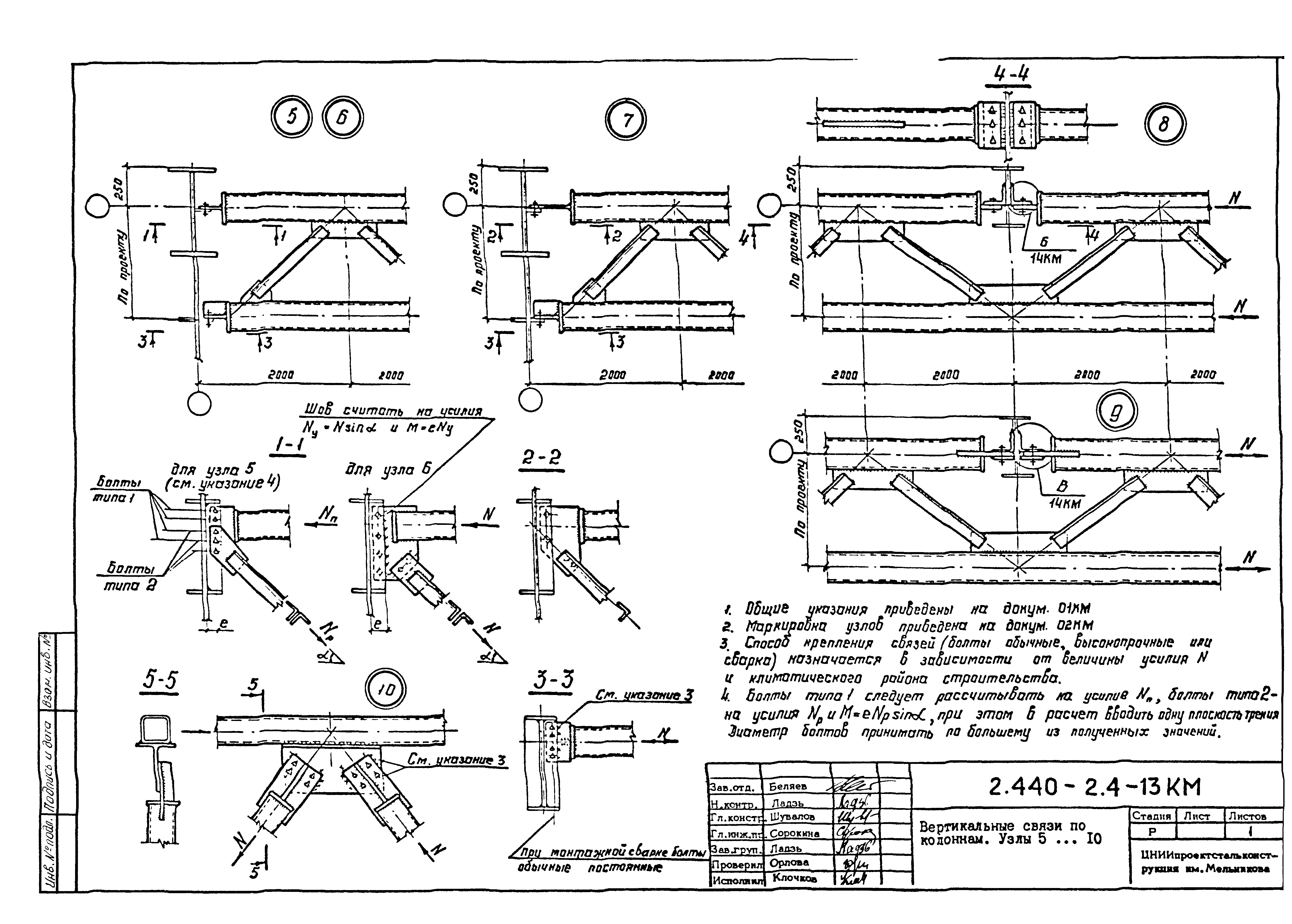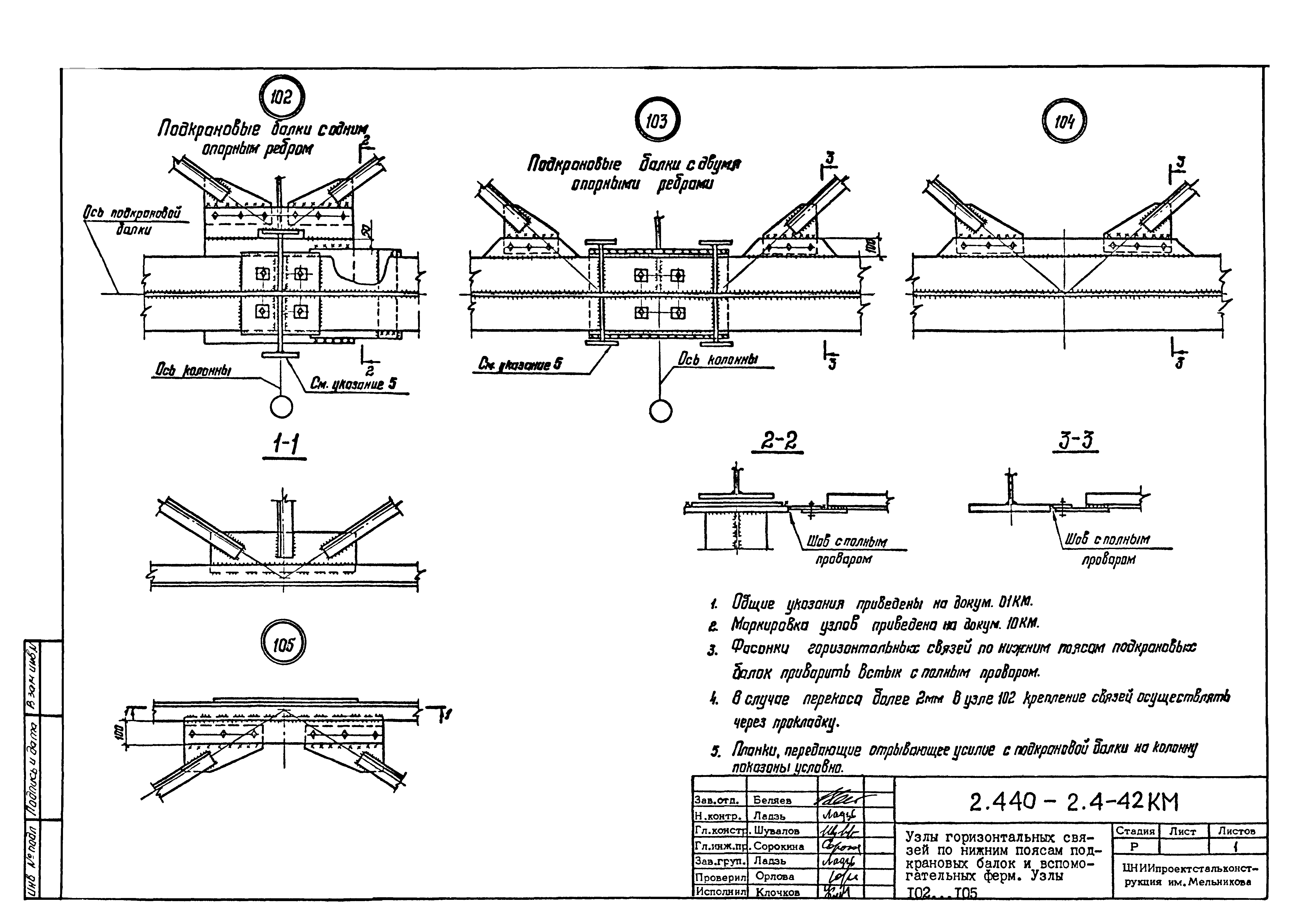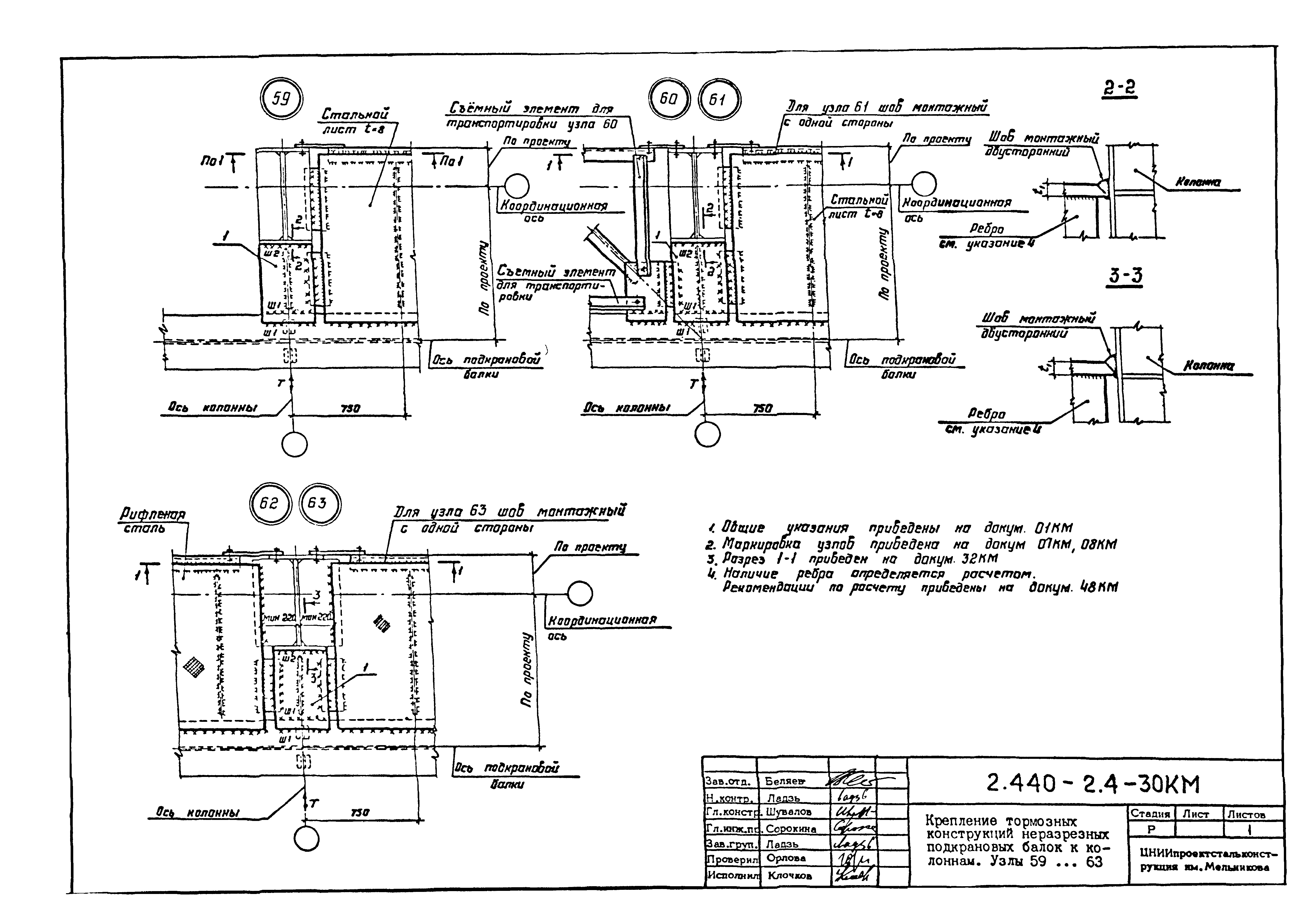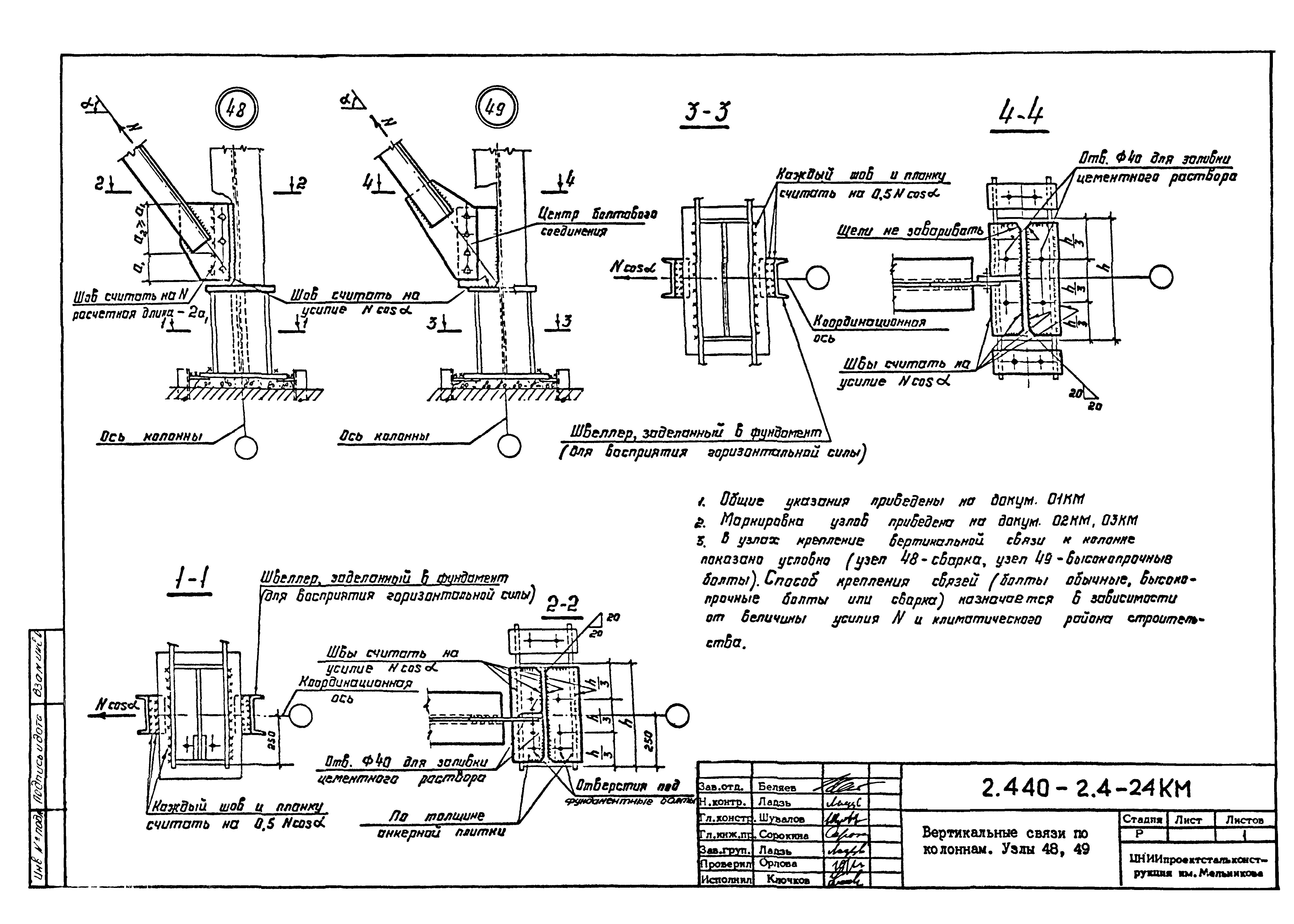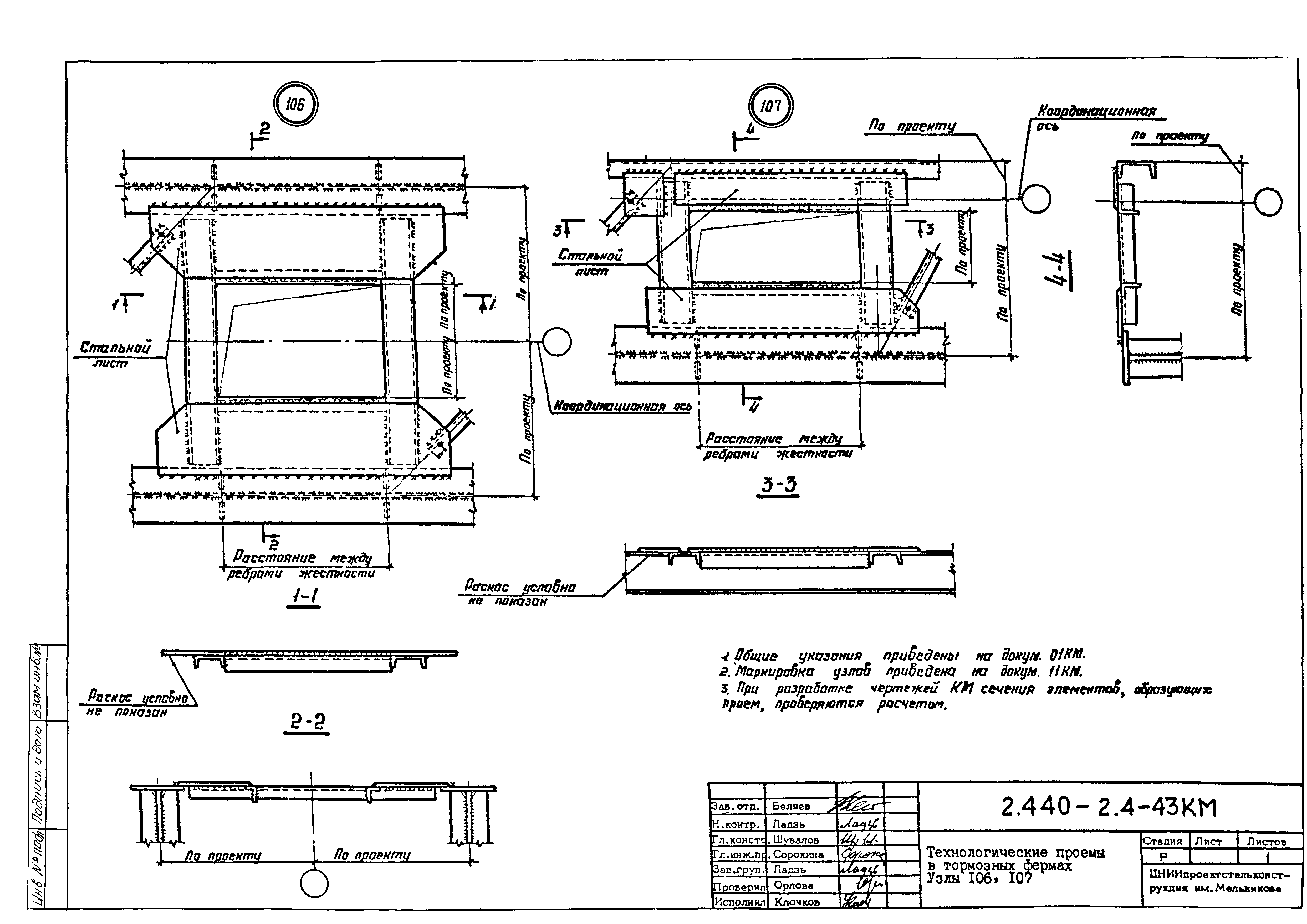 | Оглавление: | 2.440-2.4-00П3КМ Пояснительная записка 2.440-2.4-01КМ Общие указания 2.440-2.4-02КМ Маркировка узлов крепления связей по крайним рядам колонн постоянного сечения 2.440-2.4-03КМ Маркировка узлов крепления связей по средним рядам колонн постоянного сечения 2.440-2.4-04КМ Маркировка узлов крепления связей по крайним рядам ступенчатых колонн 2.440-2.4-05КМ Маркировка узлов крепления связей по средним рядам ступенчатых колонн 2.440-2.4-06КМ Маркировка узлов крепления связей колонн бескрановых зданий 2.440-2.4-07КМ Маркировка узлов крепления тормозных балок к колоннам крайнего ряда 2.440-2.4-08КМ Маркировка узлов крепления тормозных ферм к колоннам крайнего ряда 2.440-2.4-09КМ Маркировка узлов крепления тормозных ферм и балок к колоннам среднего ряда 2.440-2.4-10КМ Маркировка узлов связей по нижним поясам подкрановых балок и вспомогательных ферм 2.440-2.4-11КМ Маркировка узлов проемов и технологических отверстий в тормозных конструкциях 2.440-2.4-12КМ Вертикальные связи по колоннам. Узлы 1…4 2.440-2.4-13КМ Вертикальные связи по колоннам. Узлы 5…10 2.440-2.4-14КМ Вертикальные связи по колоннам.. Узлы 11…16 2.440-2.4-15КМ Вертикальные связи по колоннам. Узлы 18…24 2.440-2.4-16КМ Вертикальные связи по колоннам. Узлы 25…28 2.440-2.4-17КМ Вертикальные связи по колоннам. Узлы 29…32 2.440-2.4-18КМ Вертикальные связи по колоннам. Узлы 33…35 2.440-2.4-19КМ Вертикальные связи по колоннам. Узлы 36, 37 2.440-2.4-20КМ Вертикальные связи по колоннам. Узлы 38…41 2.440-2.4-21КМ Вертикальные связи по колоннам. Узлы 42, 43 2.440-2.4-22КМ Вертикальные связи по колоннам. Узлы 44, 45 2.440-2.4-23КМ Вертикальные связи по колоннам. Узлы 46, 47 2.440-2.4-24КМ Вертикальные связи по колоннам. Узлы 48, 49 2.440-2.4-25КМ Вертикальные связи по колоннам. Узлы 50, 51 2.440-2.4-26КМ Вертикальные связи по колоннам. Узлы 52, 53 2.440-2.4-27КМ Вертикальные связи по колоннам. Узлы 54, 55 2.440-2.4-28КМ Вертикальные связи по колоннам. Узлы 56, 57 2.440-2.4-29КМ Вертикальные связи, по колоннам. Узел 58 2.440-2.4-30КМ Крепление тормозных конструкций неразрезных подкрановых балок к колоннам. Узлы 59…63 2.440-2.4-31КМ Крепление тормозных конструкций неразрезных подкрановых балок к колоннам. Узлы 64…66 2.440-2.4-32КМ Крепление тормозных конструкций неразрезных подкрановых балок к колоннам с проходом в теле колонны. Узлы 67…69 2.440-2.4-33КМ Крепление тормозных конструкций неразрезных подкрановых балок к колоннам. Узлы 70…75 2.440-2.4-34КМ Крепление тормозных конструкций неразрезных подкрановых балок к колоннам. Узлы 76…78 2.440-2.4-35КМ Крепление тормозных конструкций разрезных подкрановых балок к колоннам. Узлы 79…85 2.440-2.4-36КМ Крепление тормозных конструкций разрезных подкрановых балок к колоннам. Узлы 86, 87 2.440-2.4-37КМ Крепление тормозных конструкций к стойкам фахверка и промежуточные узлы. Узлы 88, 89 2.440-2.4-38КМ Крепление тормозных конструкций к стойкам фахверка и промежуточные узлы. Узлы 90, 91 2.440-2.4-39КМ Крепление тормозных конструкций к стойкам фахверка. Узлы 92, 93 2.440-2.4-40КМ Промежуточные узлы тормозных конструкций и технологические отверстия в тормозной балке. Узлы 94…96 2.440-2.4-41КМ Узлы горизонтальных связей по нижним поясам подкрановых балок и вспомогательных ферм. Узлы 97…101 2.440-2.4-42КМ Узлы горизонтальных связей по нижним поясам подкрановых балок и вспомогательных ферм. Узлы 102…105 2.440-2.4-43КМ Технологические проемы в тормозных фермах. Узлы 106, 107 2.440-2.4-44КМ Выход на подкрановые пути крайнего ряда колонн. Тормозная конструкция-балка. Узел 108 2.440-2.4-45КМ Выход на подкрановые пути среднего ря