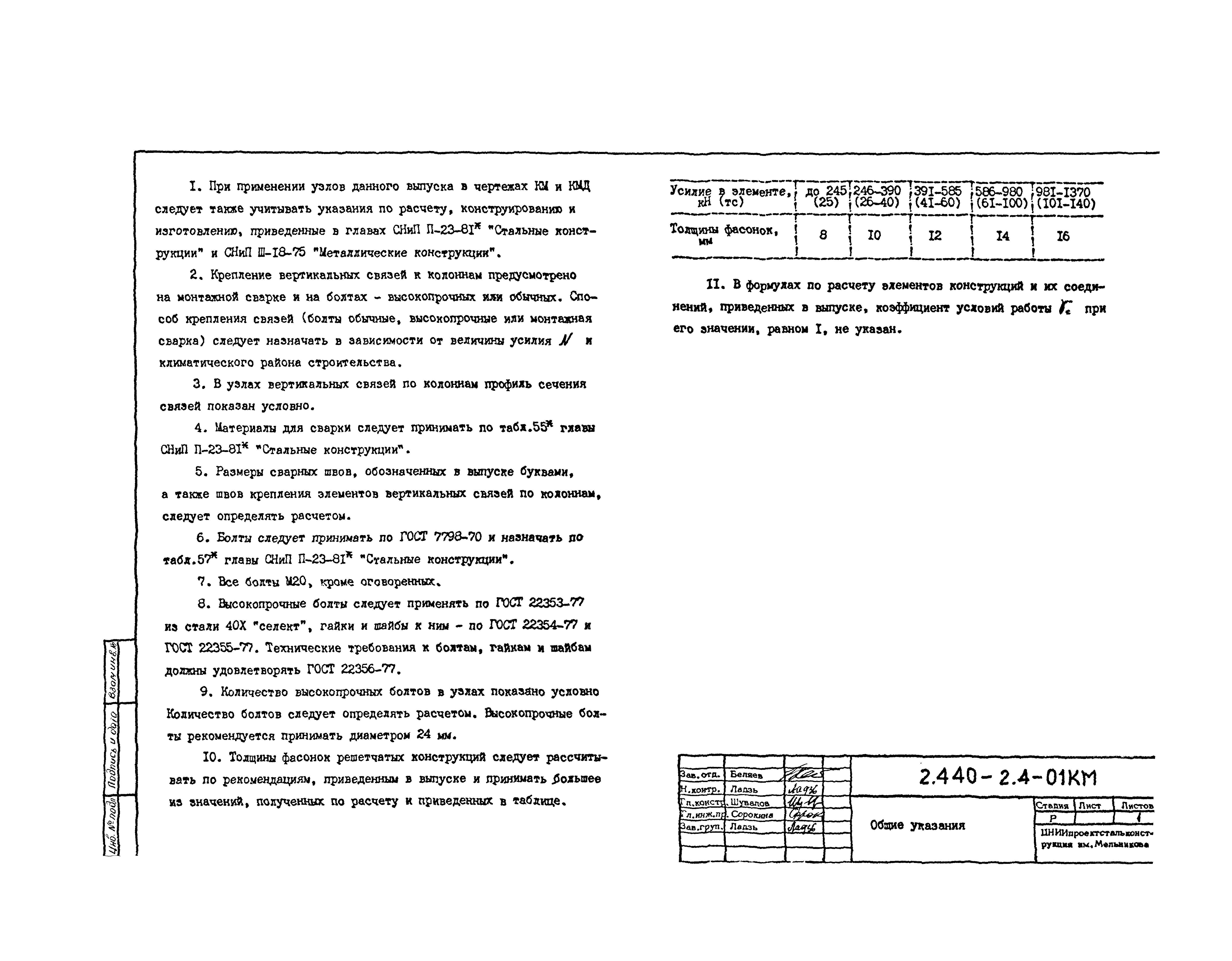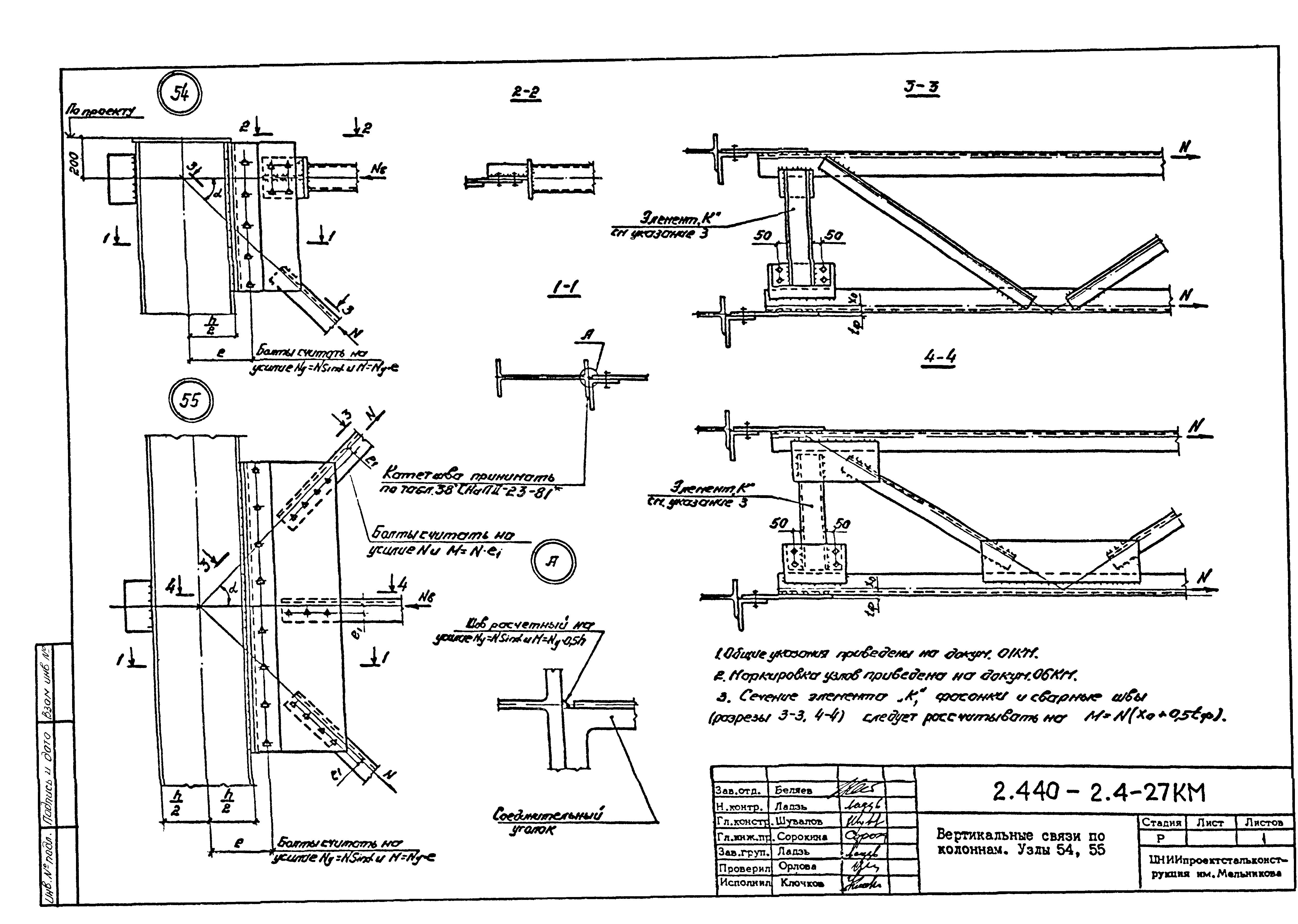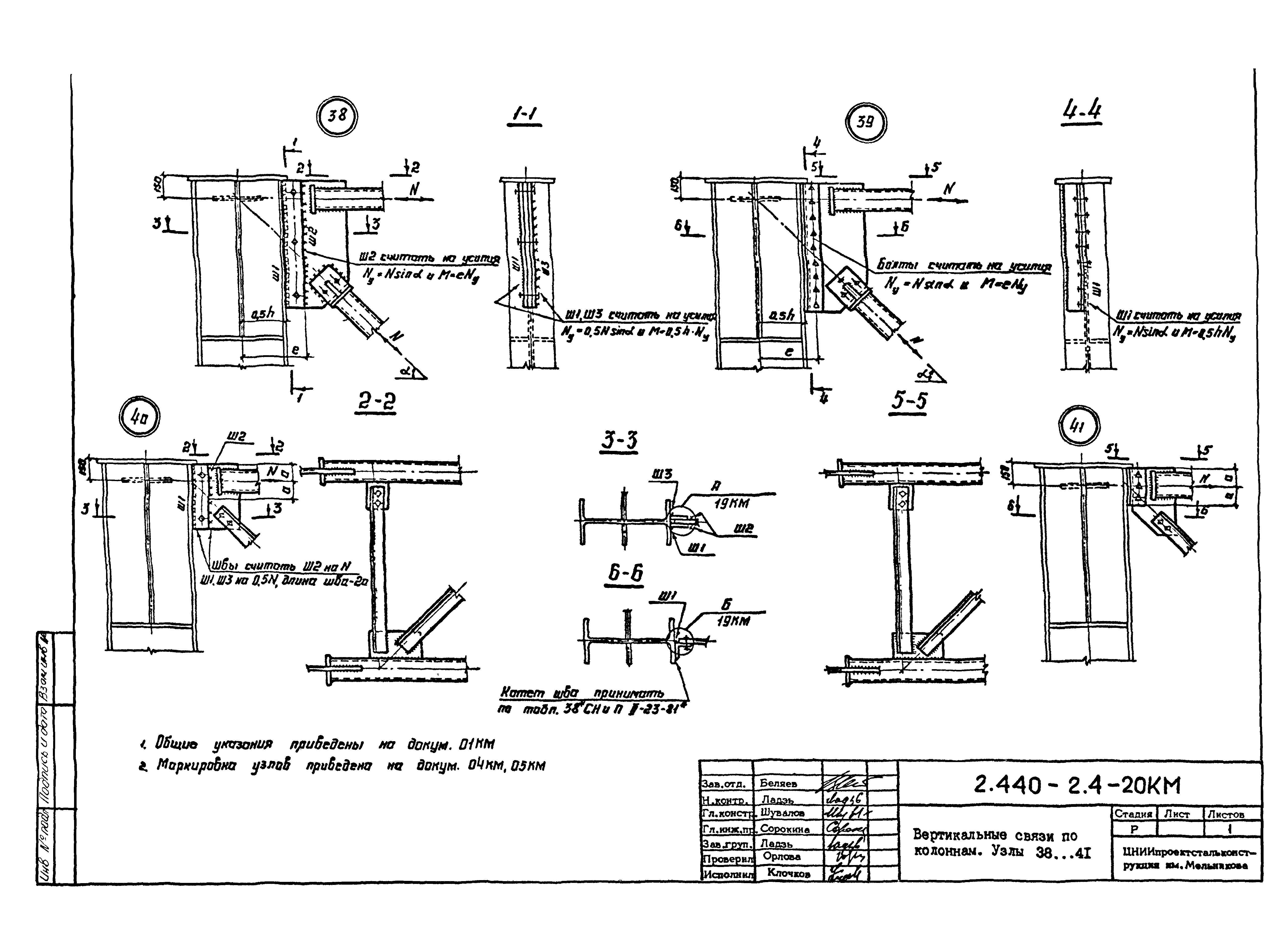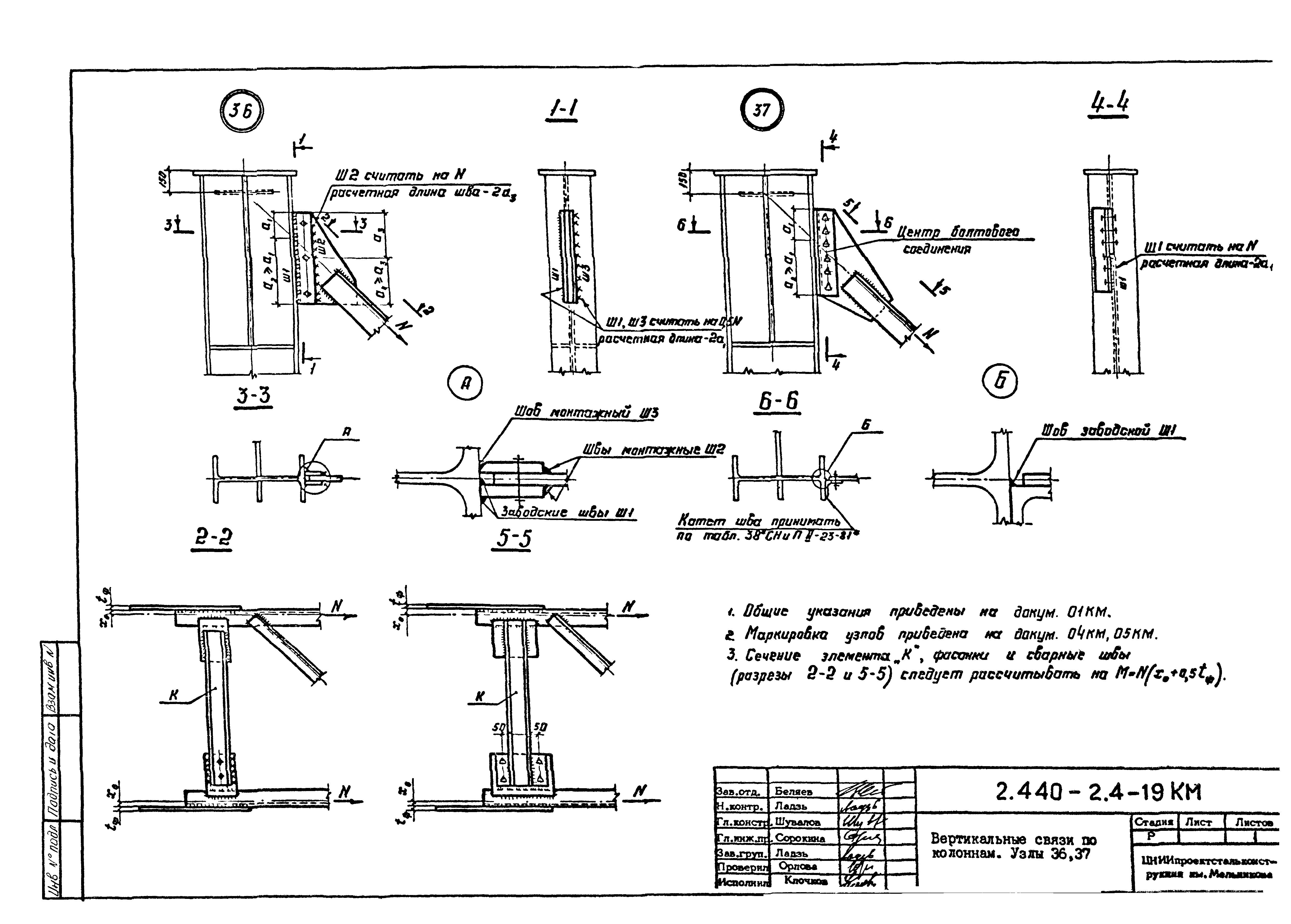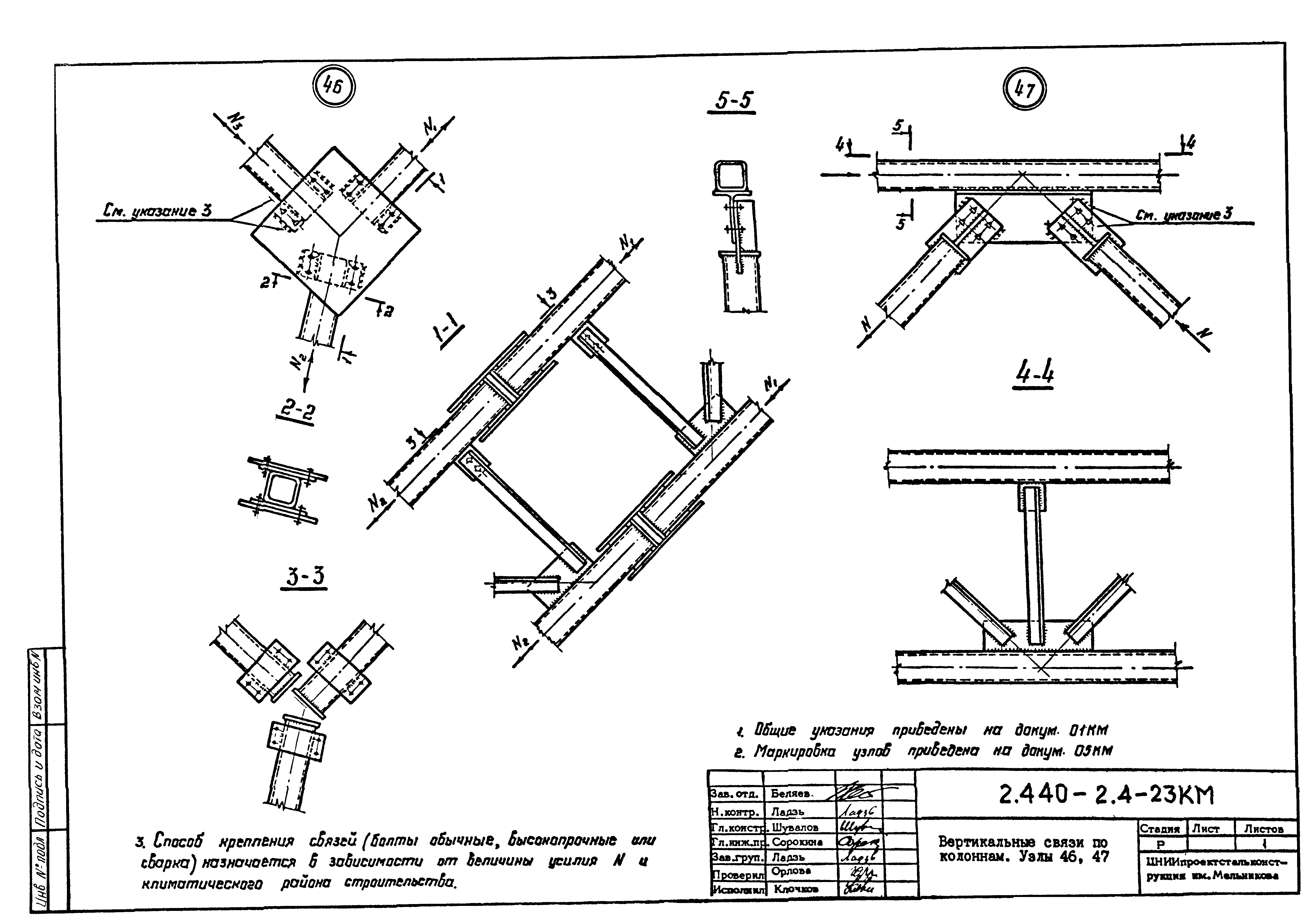 | Оглавление: | 2.440-2.4-00П3КМ Пояснительная записка 2.440-2.4-01КМ Общие указания 2.440-2.4-02КМ Маркировка узлов крепления связей по крайним рядам колонн постоянного сечения 2.440-2.4-03КМ Маркировка узлов крепления связей по средним рядам колонн постоянного сечения 2.440-2.4-04КМ Маркировка узлов крепления связей по крайним рядам ступенчатых колонн 2.440-2.4-05КМ Маркировка узлов крепления связей по средним рядам ступенчатых колонн 2.440-2.4-06КМ Маркировка узлов крепления связей колонн бескрановых зданий 2.440-2.4-07КМ Маркировка узлов крепления тормозных балок к колоннам крайнего ряда 2.440-2.4-08КМ Маркировка узлов крепления тормозных ферм к колоннам крайнего ряда 2.440-2.4-09КМ Маркировка узлов крепления тормозных ферм и балок к колоннам среднего ряда 2.440-2.4-10КМ Маркировка узлов связей по нижним поясам подкрановых балок и вспомогательных ферм 2.440-2.4-11КМ Маркировка узлов проемов и технологических отверстий в тормозных конструкциях 2.440-2.4-12КМ Вертикальные связи по колоннам. Узлы 1…4 2.440-2.4-13КМ Вертикальные связи по колоннам. Узлы 5…10 2.440-2.4-14КМ Вертикальные связи по колоннам.. Узлы 11…16 2.440-2.4-15КМ Вертикальные связи по колоннам. Узлы 18…24 2.440-2.4-16КМ Вертикальные связи по колоннам. Узлы 25…28 2.440-2.4-17КМ Вертикальные связи по колоннам. Узлы 29…32 2.440-2.4-18КМ Вертикальные связи по колоннам. Узлы 33…35 2.440-2.4-19КМ Вертикальные связи по колоннам. Узлы 36, 37 2.440-2.4-20КМ Вертикальные связи по колоннам. Узлы 38…41 2.440-2.4-21КМ Вертикальные связи по колоннам. Узлы 42, 43 2.440-2.4-22КМ Вертикальные связи по колоннам. Узлы 44, 45 2.440-2.4-23КМ Вертикальные связи по колоннам. Узлы 46, 47 2.440-2.4-24КМ Вертикальные связи по колоннам. Узлы 48, 49 2.440-2.4-25КМ Вертикальные связи по колоннам. Узлы 50, 51 2.440-2.4-26КМ Вертикальные связи по колоннам. Узлы 52, 53 2.440-2.4-27КМ Вертикальные связи по колоннам. Узлы 54, 55 2.440-2.4-28КМ Вертикальные связи по колоннам. Узлы 56, 57 2.440-2.4-29КМ Вертикальные связи, по колоннам. Узел 58 2.440-2.4-30КМ Крепление тормозных конструкций неразрезных подкрановых балок к колоннам. Узлы 59…63 2.440-2.4-31КМ Крепление тормозных конструкций неразрезных подкрановых балок к колоннам. Узлы 64…66 2.440-2.4-32КМ Крепление тормозных конструкций неразрезных подкрановых балок к колоннам с проходом в теле колонны. Узлы 67…69 2.440-2.4-33КМ Крепление тормозных конструкций неразрезных подкрановых балок к колоннам. Узлы 70…75 2.440-2.4-34КМ Крепление тормозных конструкций неразрезных подкрановых балок к колоннам. Узлы 76…78 2.440-2.4-35КМ Крепление тормозных конструкций разрезных подкрановых балок к колоннам. Узлы 79…85 2.440-2.4-36КМ Крепление тормозных конструкций разрезных подкрановых балок к колоннам. Узлы 86, 87 2.440-2.4-37КМ Крепление тормозных конструкций к стойкам фахверка и промежуточные узлы. Узлы 88, 89 2.440-2.4-38КМ Крепление тормозных конструкций к стойкам фахверка и промежуточные узлы. Узлы 90, 91 2.440-2.4-39КМ Крепление тормозных конструкций к стойкам фахверка. Узлы 92, 93 2.440-2.4-40КМ Промежуточные узлы тормозных конструкций и технологические отверстия в тормозной балке. Узлы 94…96 2.440-2.4-41КМ Узлы горизонтальных связей по нижним поясам подкрановых балок и вспомогательных ферм. Узлы 97…101 2.440-2.4-42КМ Узлы горизонтальных связей по нижним поясам подкрановых балок и вспомогательных ферм. Узлы 102…105 2.440-2.4-43КМ Технологические проемы в тормозных фермах. Узлы 106, 107 2.440-2.4-44КМ Выход на подкрановые пути крайнего ряда колонн. Тормозная конструкция-балка. Узел 108 2.440-2.4-45КМ Выход на подкрановые пути среднего ря