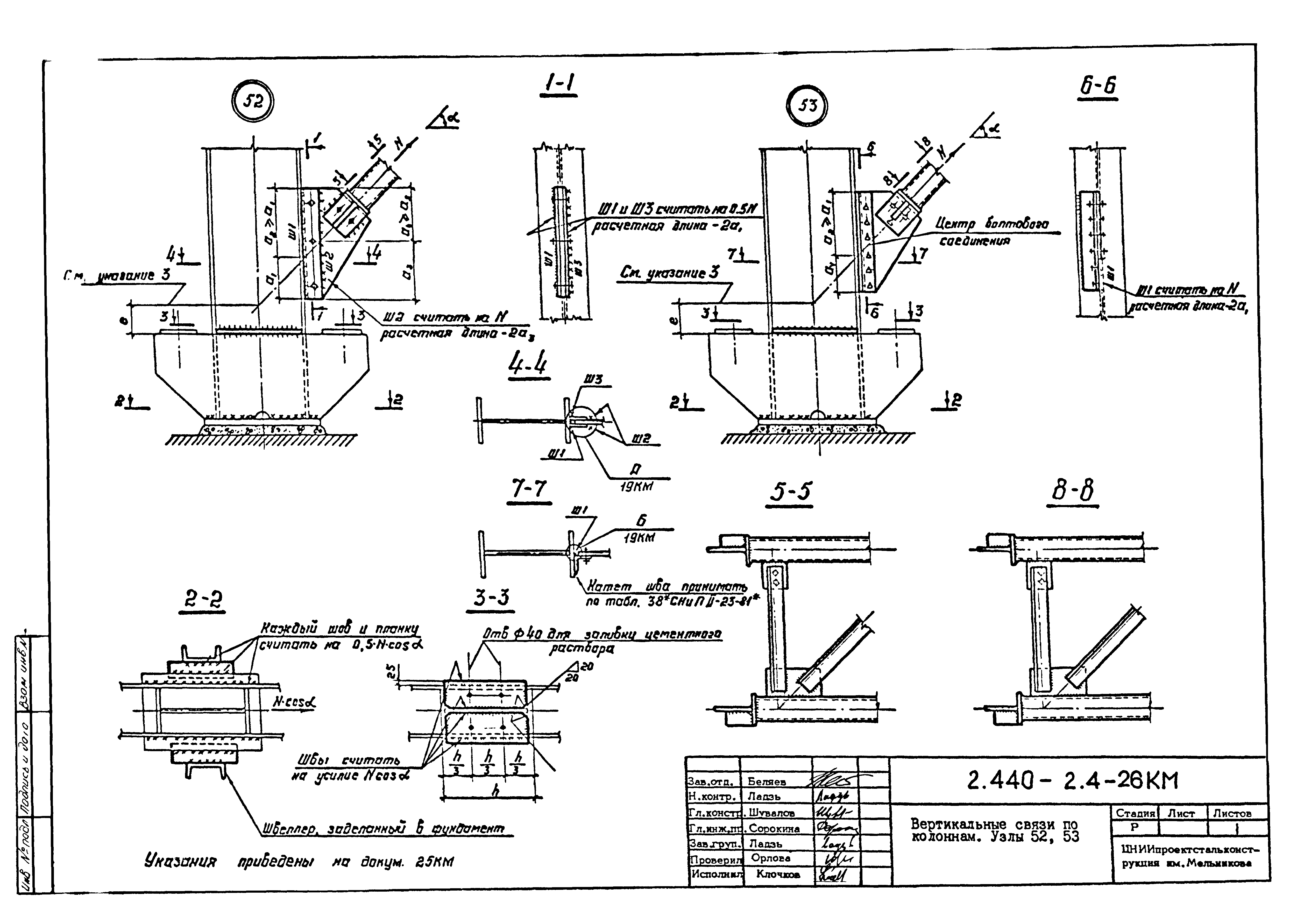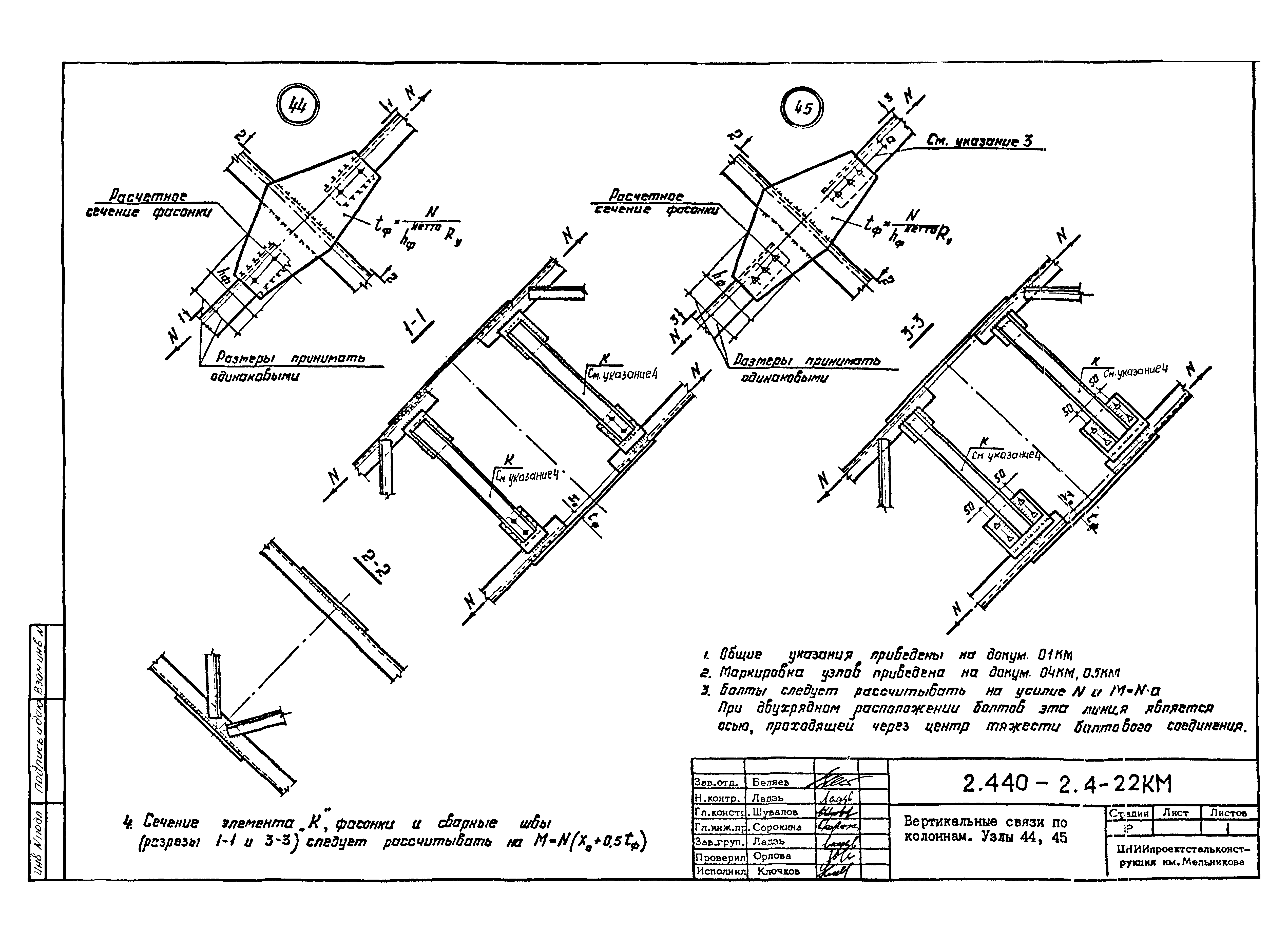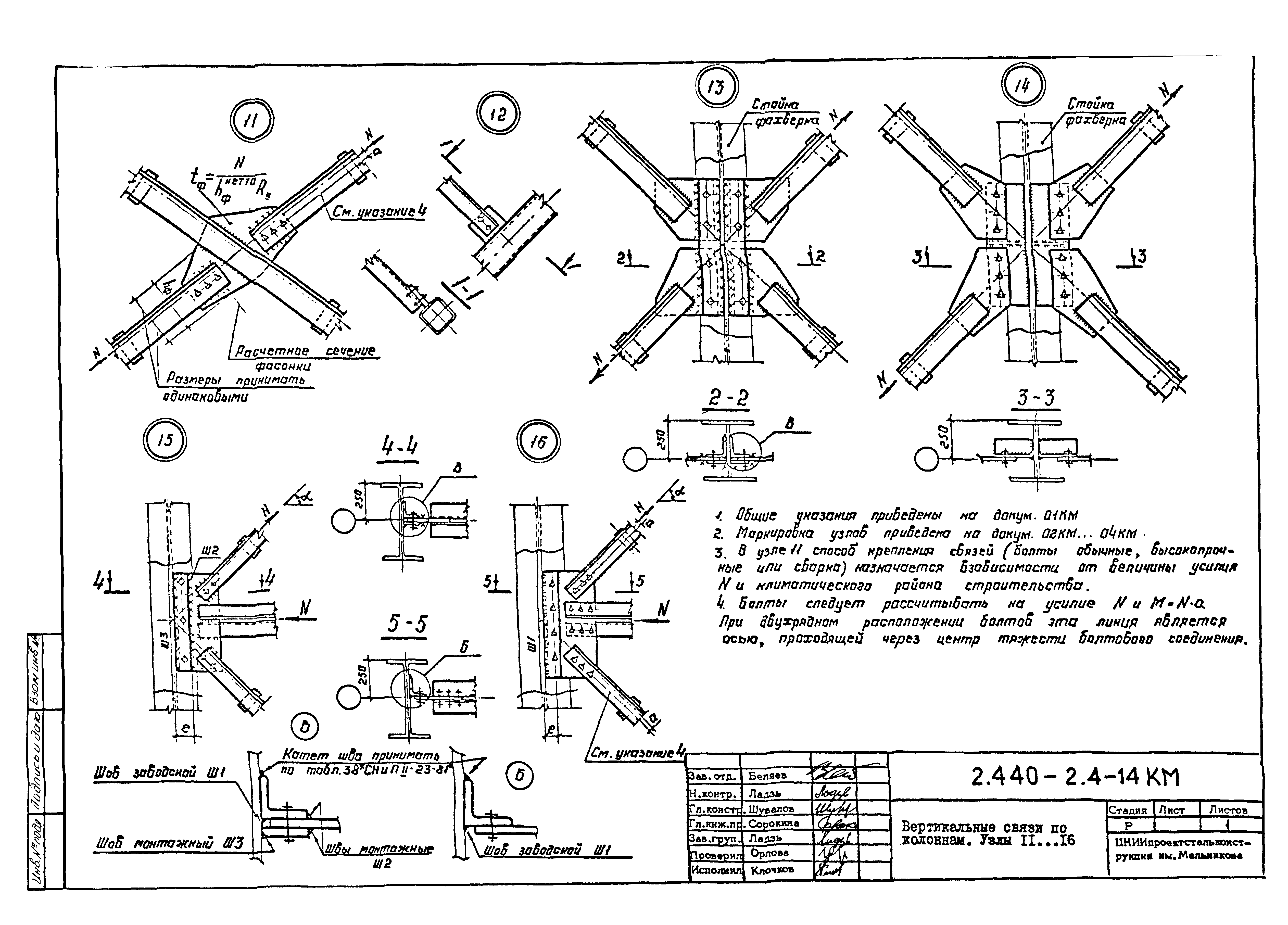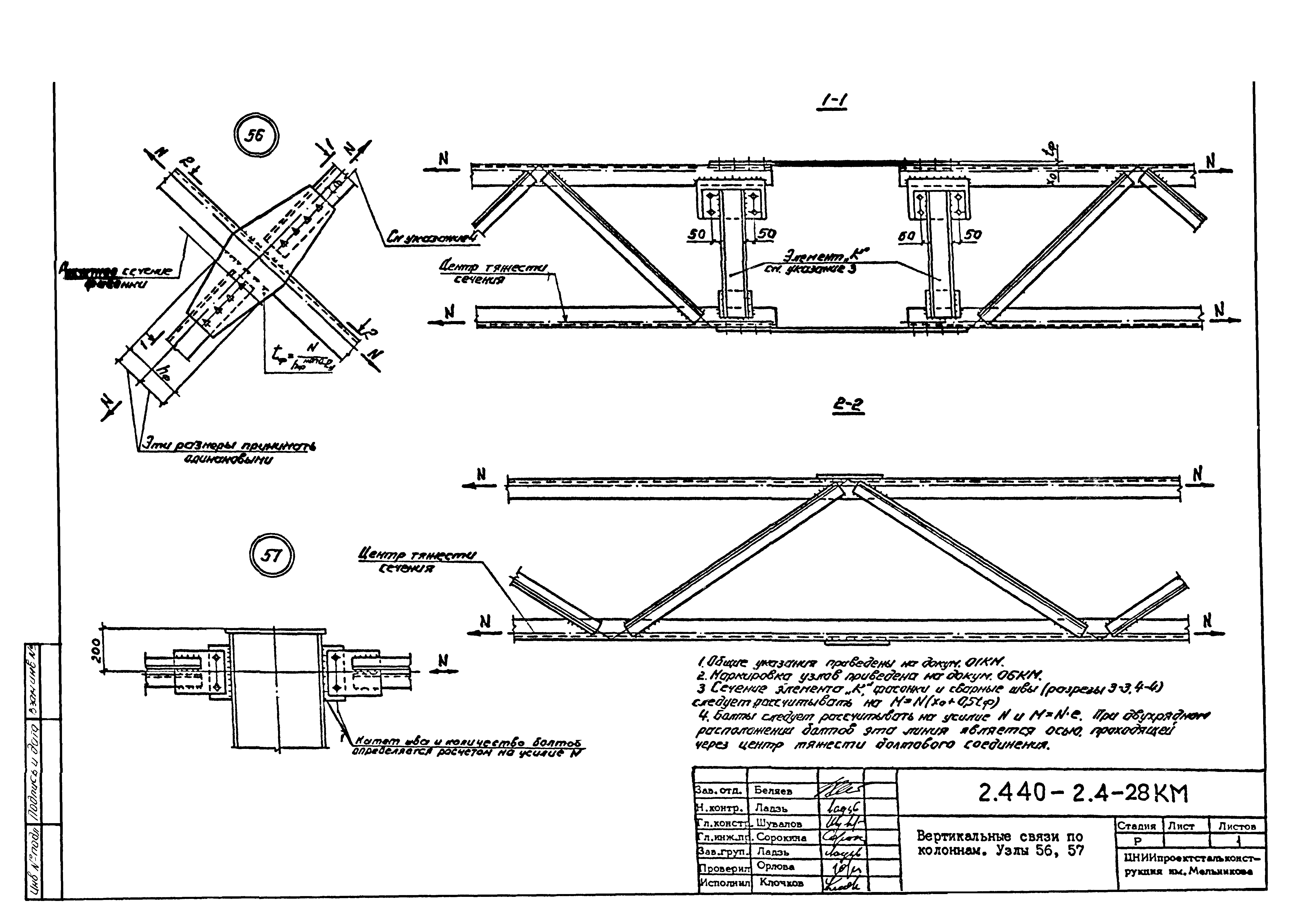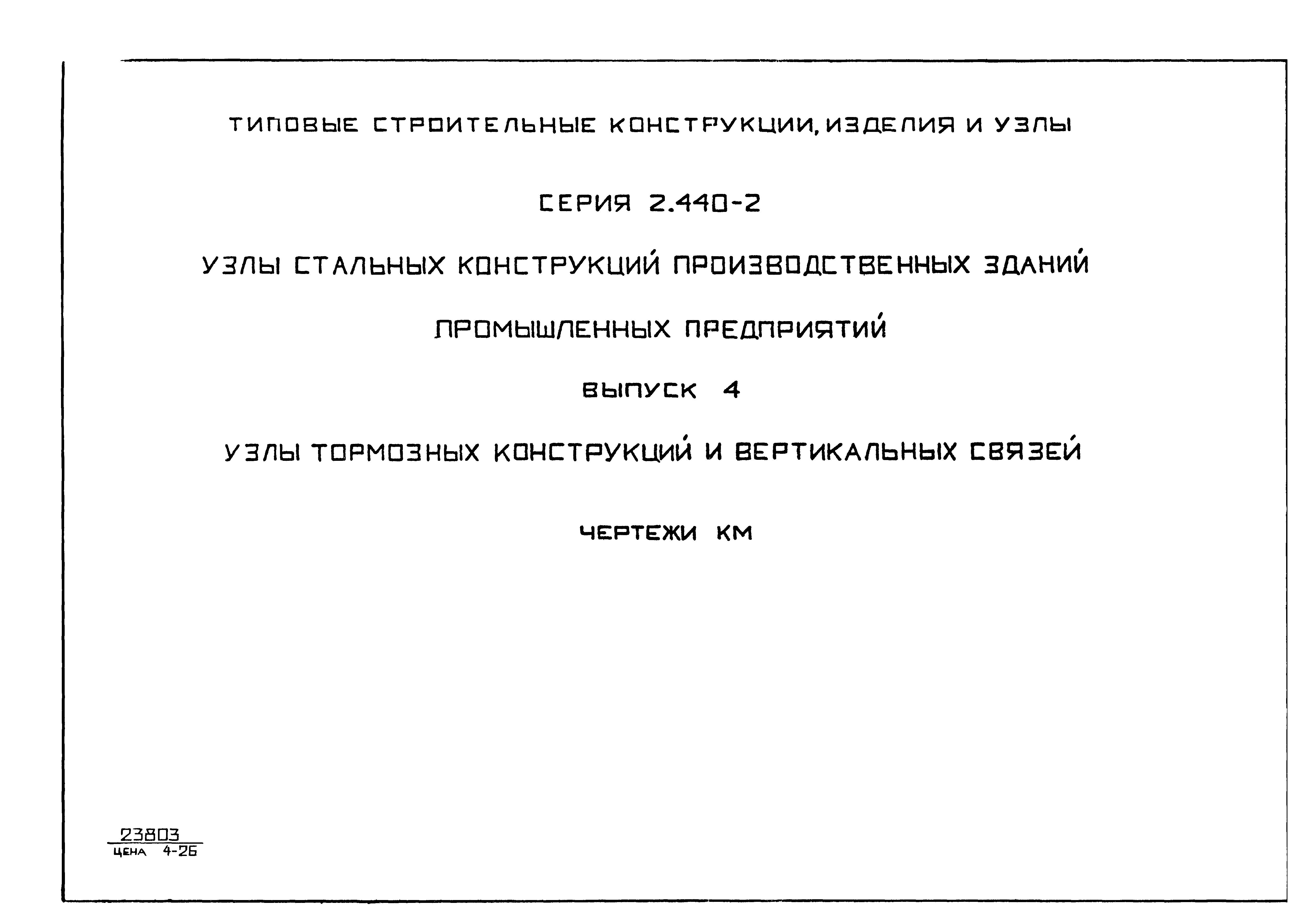 | Оглавление: | 2.440-2.4-00П3КМ Пояснительная записка 2.440-2.4-01КМ Общие указания 2.440-2.4-02КМ Маркировка узлов крепления связей по крайним рядам колонн постоянного сечения 2.440-2.4-03КМ Маркировка узлов крепления связей по средним рядам колонн постоянного сечения 2.440-2.4-04КМ Маркировка узлов крепления связей по крайним рядам ступенчатых колонн 2.440-2.4-05КМ Маркировка узлов крепления связей по средним рядам ступенчатых колонн 2.440-2.4-06КМ Маркировка узлов крепления связей колонн бескрановых зданий 2.440-2.4-07КМ Маркировка узлов крепления тормозных балок к колоннам крайнего ряда 2.440-2.4-08КМ Маркировка узлов крепления тормозных ферм к колоннам крайнего ряда 2.440-2.4-09КМ Маркировка узлов крепления тормозных ферм и балок к колоннам среднего ряда 2.440-2.4-10КМ Маркировка узлов связей по нижним поясам подкрановых балок и вспомогательных ферм 2.440-2.4-11КМ Маркировка узлов проемов и технологических отверстий в тормозных конструкциях 2.440-2.4-12КМ Вертикальные связи по колоннам. Узлы 1…4 2.440-2.4-13КМ Вертикальные связи по колоннам. Узлы 5…10 2.440-2.4-14КМ Вертикальные связи по колоннам.. Узлы 11…16 2.440-2.4-15КМ Вертикальные связи по колоннам. Узлы 18…24 2.440-2.4-16КМ Вертикальные связи по колоннам. Узлы 25…28 2.440-2.4-17КМ Вертикальные связи по колоннам. Узлы 29…32 2.440-2.4-18КМ Вертикальные связи по колоннам. Узлы 33…35 2.440-2.4-19КМ Вертикальные связи по колоннам. Узлы 36, 37 2.440-2.4-20КМ Вертикальные связи по колоннам. Узлы 38…41 2.440-2.4-21КМ Вертикальные связи по колоннам. Узлы 42, 43 2.440-2.4-22КМ Вертикальные связи по колоннам. Узлы 44, 45 2.440-2.4-23КМ Вертикальные связи по колоннам. Узлы 46, 47 2.440-2.4-24КМ Вертикальные связи по колоннам. Узлы 48, 49 2.440-2.4-25КМ Вертикальные связи по колоннам. Узлы 50, 51 2.440-2.4-26КМ Вертикальные связи по колоннам. Узлы 52, 53 2.440-2.4-27КМ Вертикальные связи по колоннам. Узлы 54, 55 2.440-2.4-28КМ Вертикальные связи по колоннам. Узлы 56, 57 2.440-2.4-29КМ Вертикальные связи, по колоннам. Узел 58 2.440-2.4-30КМ Крепление тормозных конструкций неразрезных подкрановых балок к колоннам. Узлы 59…63 2.440-2.4-31КМ Крепление тормозных конструкций неразрезных подкрановых балок к колоннам. Узлы 64…66 2.440-2.4-32КМ Крепление тормозных конструкций неразрезных подкрановых балок к колоннам с проходом в теле колонны. Узлы 67…69 2.440-2.4-33КМ Крепление тормозных конструкций неразрезных подкрановых балок к колоннам. Узлы 70…75 2.440-2.4-34КМ Крепление тормозных конструкций неразрезных подкрановых балок к колоннам. Узлы 76…78 2.440-2.4-35КМ Крепление тормозных конструкций разрезных подкрановых балок к колоннам. Узлы 79…85 2.440-2.4-36КМ Крепление тормозных конструкций разрезных подкрановых балок к колоннам. Узлы 86, 87 2.440-2.4-37КМ Крепление тормозных конструкций к стойкам фахверка и промежуточные узлы. Узлы 88, 89 2.440-2.4-38КМ Крепление тормозных конструкций к стойкам фахверка и промежуточные узлы. Узлы 90, 91 2.440-2.4-39КМ Крепление тормозных конструкций к стойкам фахверка. Узлы 92, 93 2.440-2.4-40КМ Промежуточные узлы тормозных конструкций и технологические отверстия в тормозной балке. Узлы 94…96 2.440-2.4-41КМ Узлы горизонтальных связей по нижним поясам подкрановых балок и вспомогательных ферм. Узлы 97…101 2.440-2.4-42КМ Узлы горизонтальных связей по нижним поясам подкрановых балок и вспомогательных ферм. Узлы 102…105 2.440-2.4-43КМ Технологические проемы в тормозных фермах. Узлы 106, 107 2.440-2.4-44КМ Выход на подкрановые пути крайнего ряда колонн. Тормозная конструкция-балка. Узел 108 2.440-2.4-45КМ Выход на подкрановые пути среднего ря