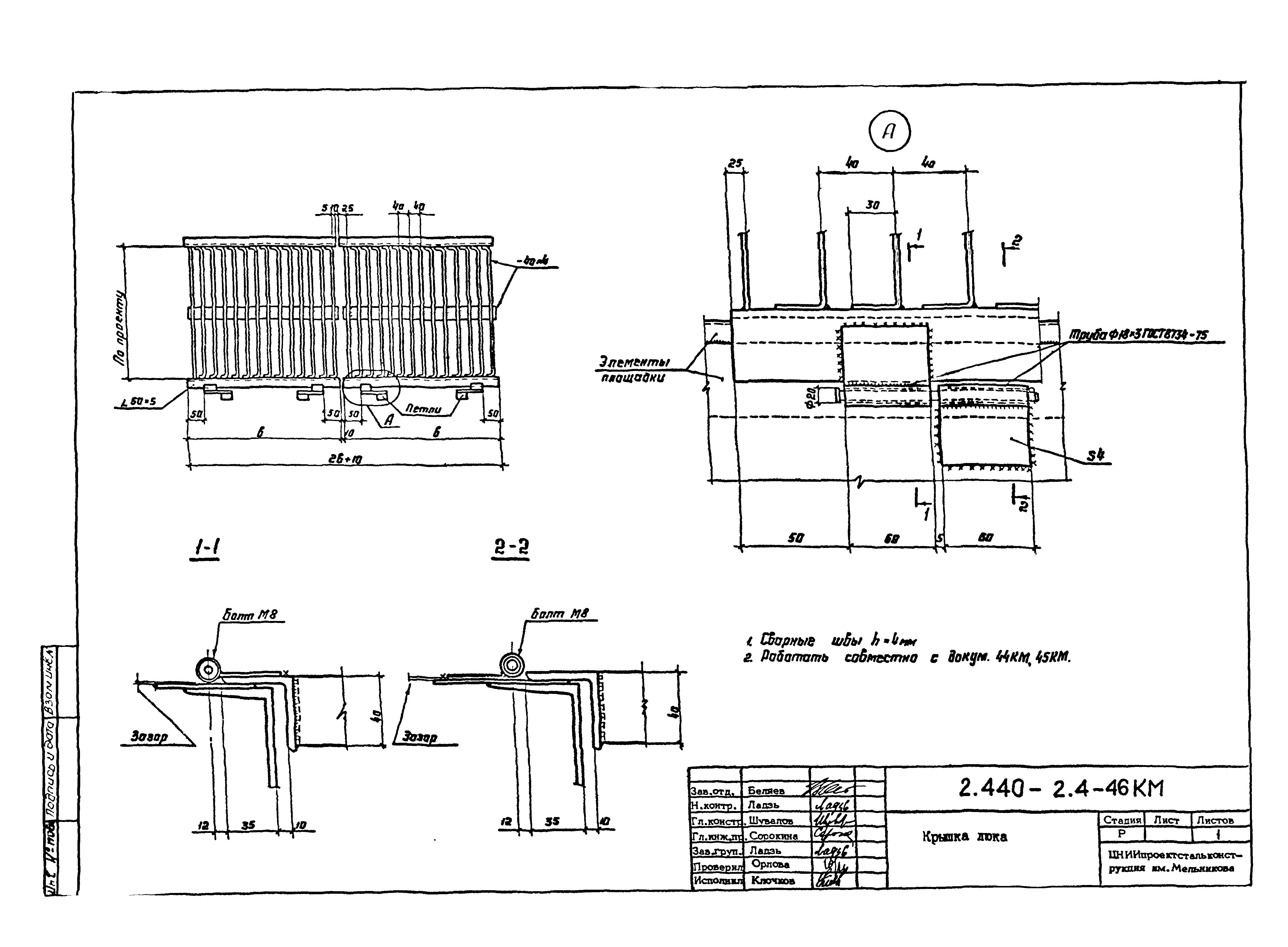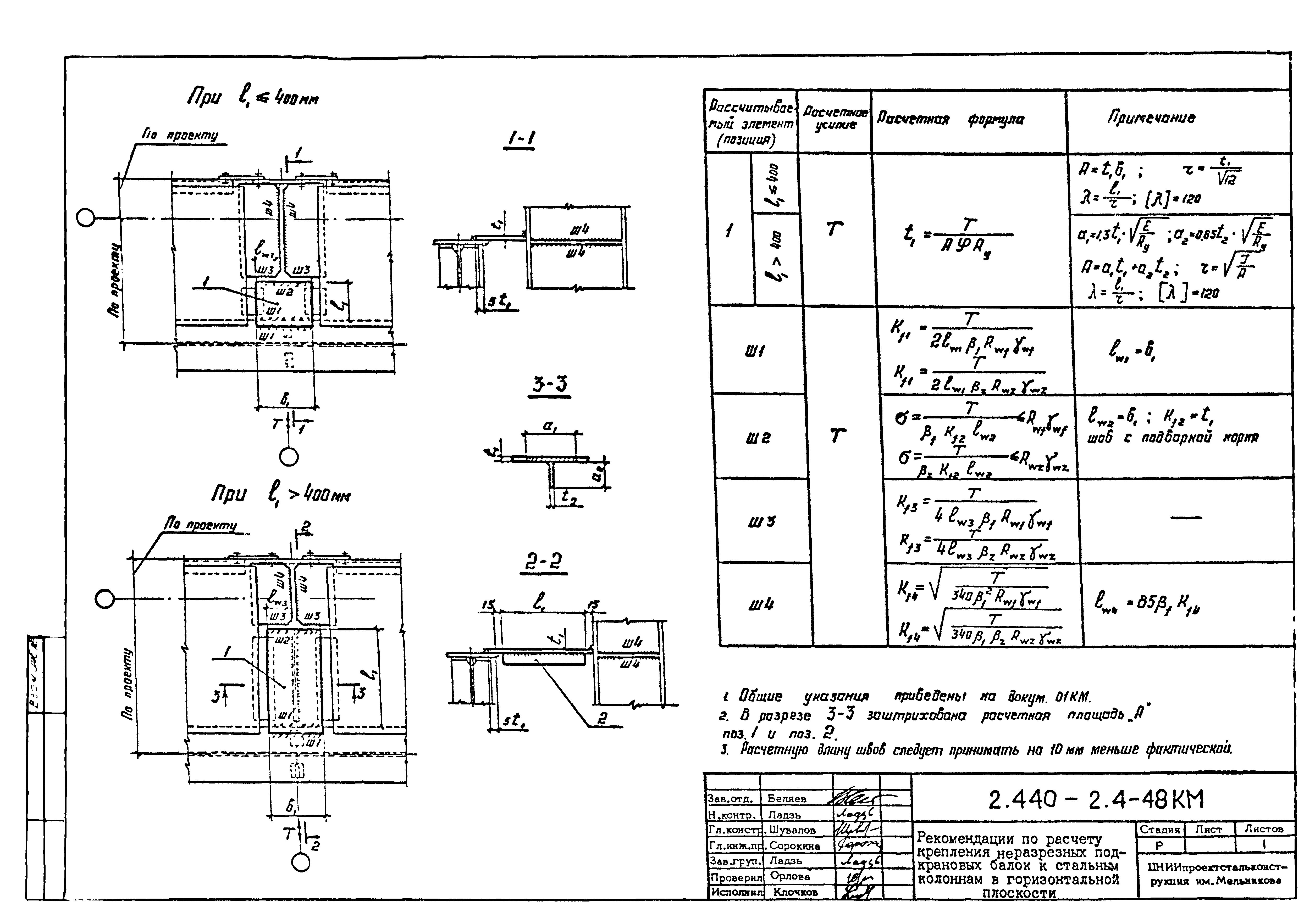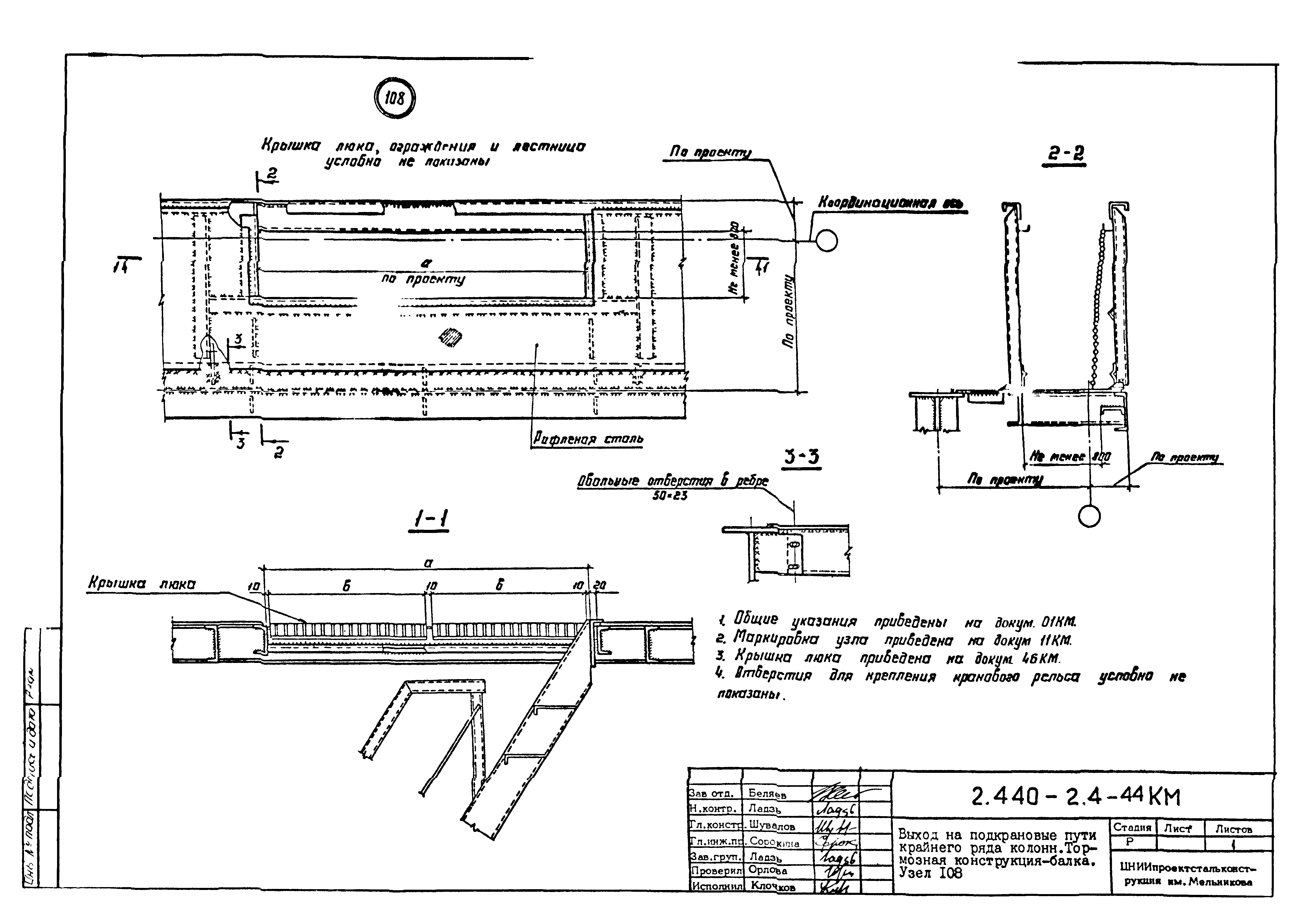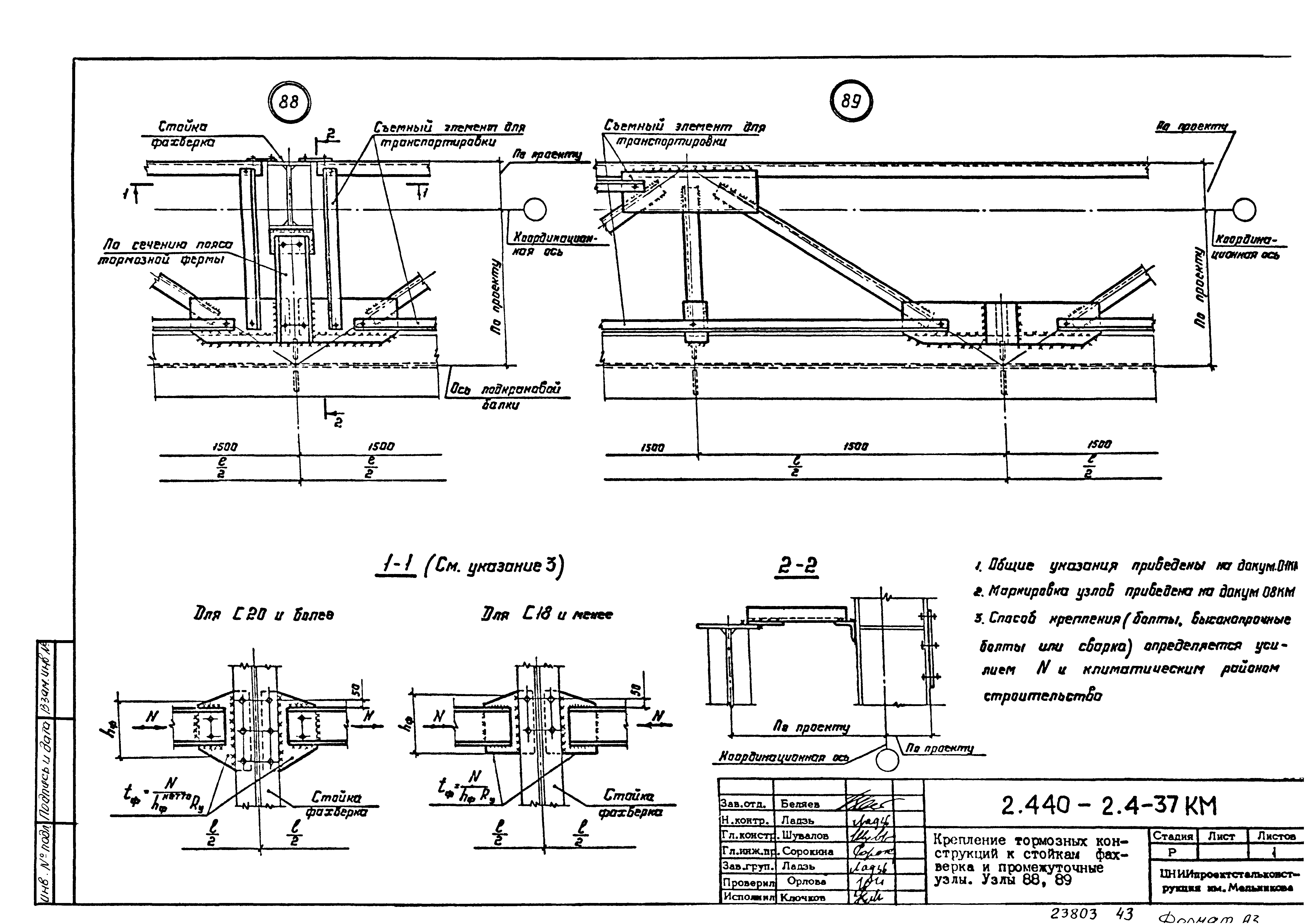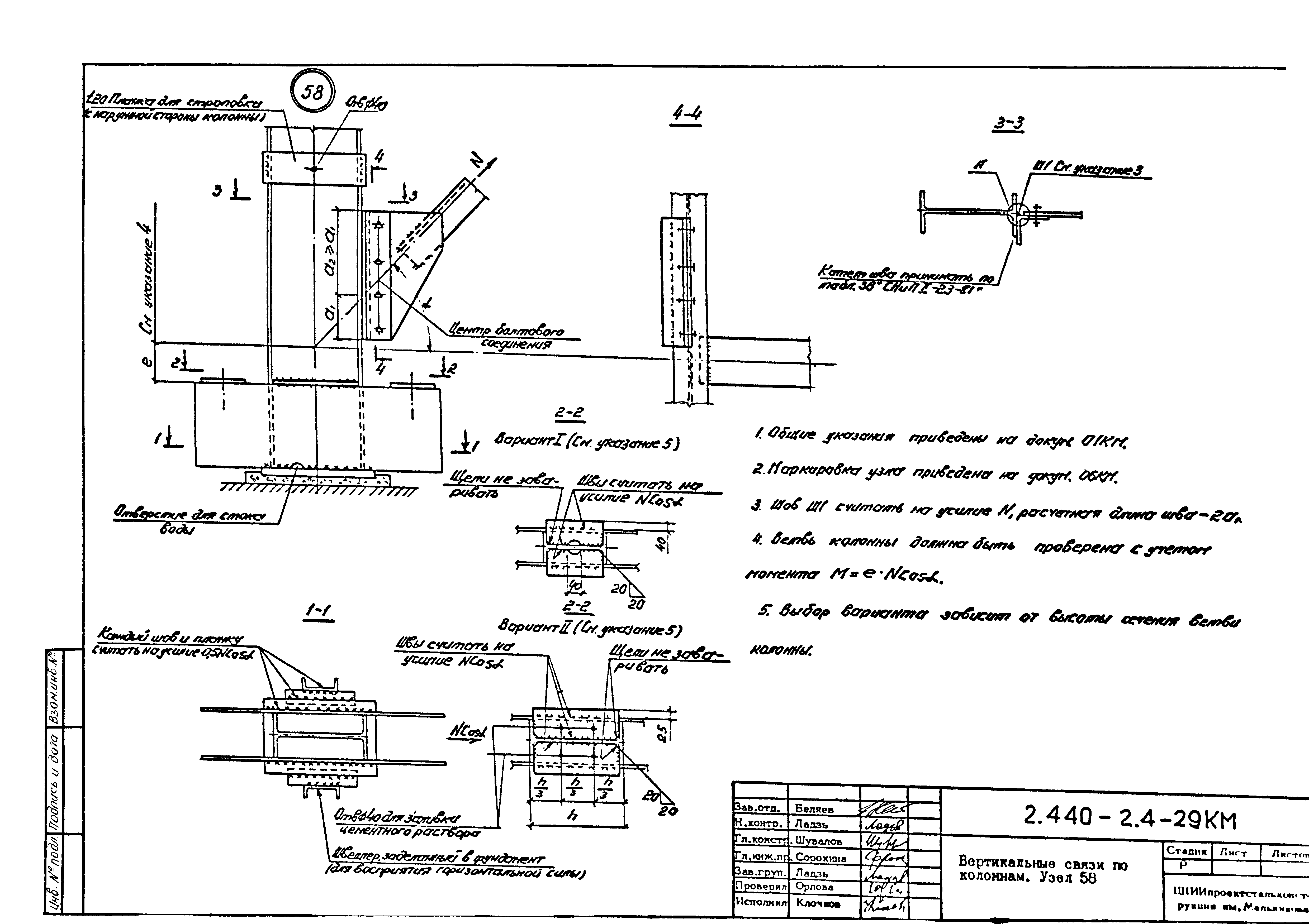 | Оглавление: | 2.440-2.4-00П3КМ Пояснительная записка 2.440-2.4-01КМ Общие указания 2.440-2.4-02КМ Маркировка узлов крепления связей по крайним рядам колонн постоянного сечения 2.440-2.4-03КМ Маркировка узлов крепления связей по средним рядам колонн постоянного сечения 2.440-2.4-04КМ Маркировка узлов крепления связей по крайним рядам ступенчатых колонн 2.440-2.4-05КМ Маркировка узлов крепления связей по средним рядам ступенчатых колонн 2.440-2.4-06КМ Маркировка узлов крепления связей колонн бескрановых зданий 2.440-2.4-07КМ Маркировка узлов крепления тормозных балок к колоннам крайнего ряда 2.440-2.4-08КМ Маркировка узлов крепления тормозных ферм к колоннам крайнего ряда 2.440-2.4-09КМ Маркировка узлов крепления тормозных ферм и балок к колоннам среднего ряда 2.440-2.4-10КМ Маркировка узлов связей по нижним поясам подкрановых балок и вспомогательных ферм 2.440-2.4-11КМ Маркировка узлов проемов и технологических отверстий в тормозных конструкциях 2.440-2.4-12КМ Вертикальные связи по колоннам. Узлы 1…4 2.440-2.4-13КМ Вертикальные связи по колоннам. Узлы 5…10 2.440-2.4-14КМ Вертикальные связи по колоннам.. Узлы 11…16 2.440-2.4-15КМ Вертикальные связи по колоннам. Узлы 18…24 2.440-2.4-16КМ Вертикальные связи по колоннам. Узлы 25…28 2.440-2.4-17КМ Вертикальные связи по колоннам. Узлы 29…32 2.440-2.4-18КМ Вертикальные связи по колоннам. Узлы 33…35 2.440-2.4-19КМ Вертикальные связи по колоннам. Узлы 36, 37 2.440-2.4-20КМ Вертикальные связи по колоннам. Узлы 38…41 2.440-2.4-21КМ Вертикальные связи по колоннам. Узлы 42, 43 2.440-2.4-22КМ Вертикальные связи по колоннам. Узлы 44, 45 2.440-2.4-23КМ Вертикальные связи по колоннам. Узлы 46, 47 2.440-2.4-24КМ Вертикальные связи по колоннам. Узлы 48, 49 2.440-2.4-25КМ Вертикальные связи по колоннам. Узлы 50, 51 2.440-2.4-26КМ Вертикальные связи по колоннам. Узлы 52, 53 2.440-2.4-27КМ Вертикальные связи по колоннам. Узлы 54, 55 2.440-2.4-28КМ Вертикальные связи по колоннам. Узлы 56, 57 2.440-2.4-29КМ Вертикальные связи, по колоннам. Узел 58 2.440-2.4-30КМ Крепление тормозных конструкций неразрезных подкрановых балок к колоннам. Узлы 59…63 2.440-2.4-31КМ Крепление тормозных конструкций неразрезных подкрановых балок к колоннам. Узлы 64…66 2.440-2.4-32КМ Крепление тормозных конструкций неразрезных подкрановых балок к колоннам с проходом в теле колонны. Узлы 67…69 2.440-2.4-33КМ Крепление тормозных конструкций неразрезных подкрановых балок к колоннам. Узлы 70…75 2.440-2.4-34КМ Крепление тормозных конструкций неразрезных подкрановых балок к колоннам. Узлы 76…78 2.440-2.4-35КМ Крепление тормозных конструкций разрезных подкрановых балок к колоннам. Узлы 79…85 2.440-2.4-36КМ Крепление тормозных конструкций разрезных подкрановых балок к колоннам. Узлы 86, 87 2.440-2.4-37КМ Крепление тормозных конструкций к стойкам фахверка и промежуточные узлы. Узлы 88, 89 2.440-2.4-38КМ Крепление тормозных конструкций к стойкам фахверка и промежуточные узлы. Узлы 90, 91 2.440-2.4-39КМ Крепление тормозных конструкций к стойкам фахверка. Узлы 92, 93 2.440-2.4-40КМ Промежуточные узлы тормозных конструкций и технологические отверстия в тормозной балке. Узлы 94…96 2.440-2.4-41КМ Узлы горизонтальных связей по нижним поясам подкрановых балок и вспомогательных ферм. Узлы 97…101 2.440-2.4-42КМ Узлы горизонтальных связей по нижним поясам подкрановых балок и вспомогательных ферм. Узлы 102…105 2.440-2.4-43КМ Технологические проемы в тормозных фермах. Узлы 106, 107 2.440-2.4-44КМ Выход на подкрановые пути крайнего ряда колонн. Тормозная конструкция-балка. Узел 108 2.440-2.4-45КМ Выход на подкрановые пути среднего ря