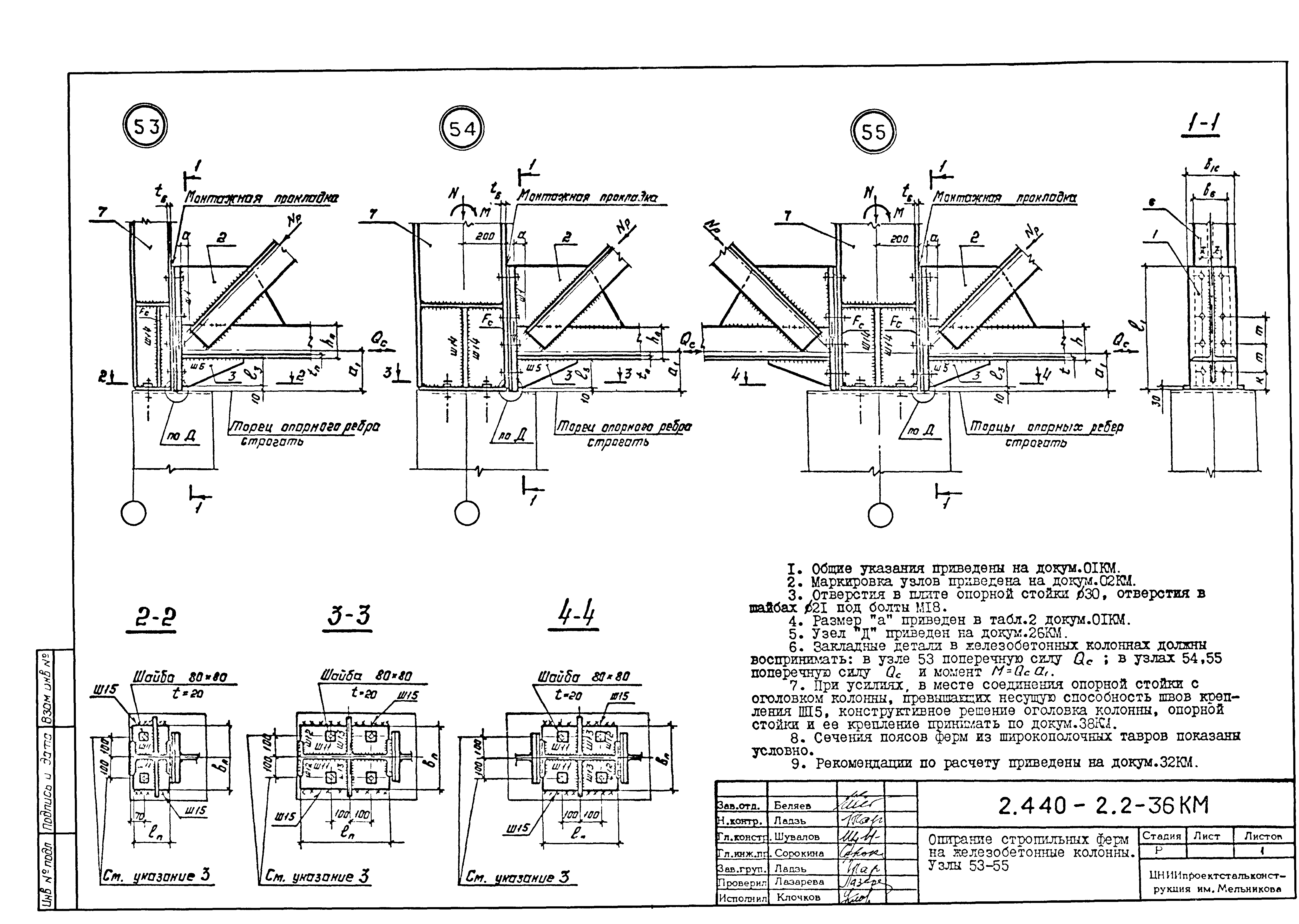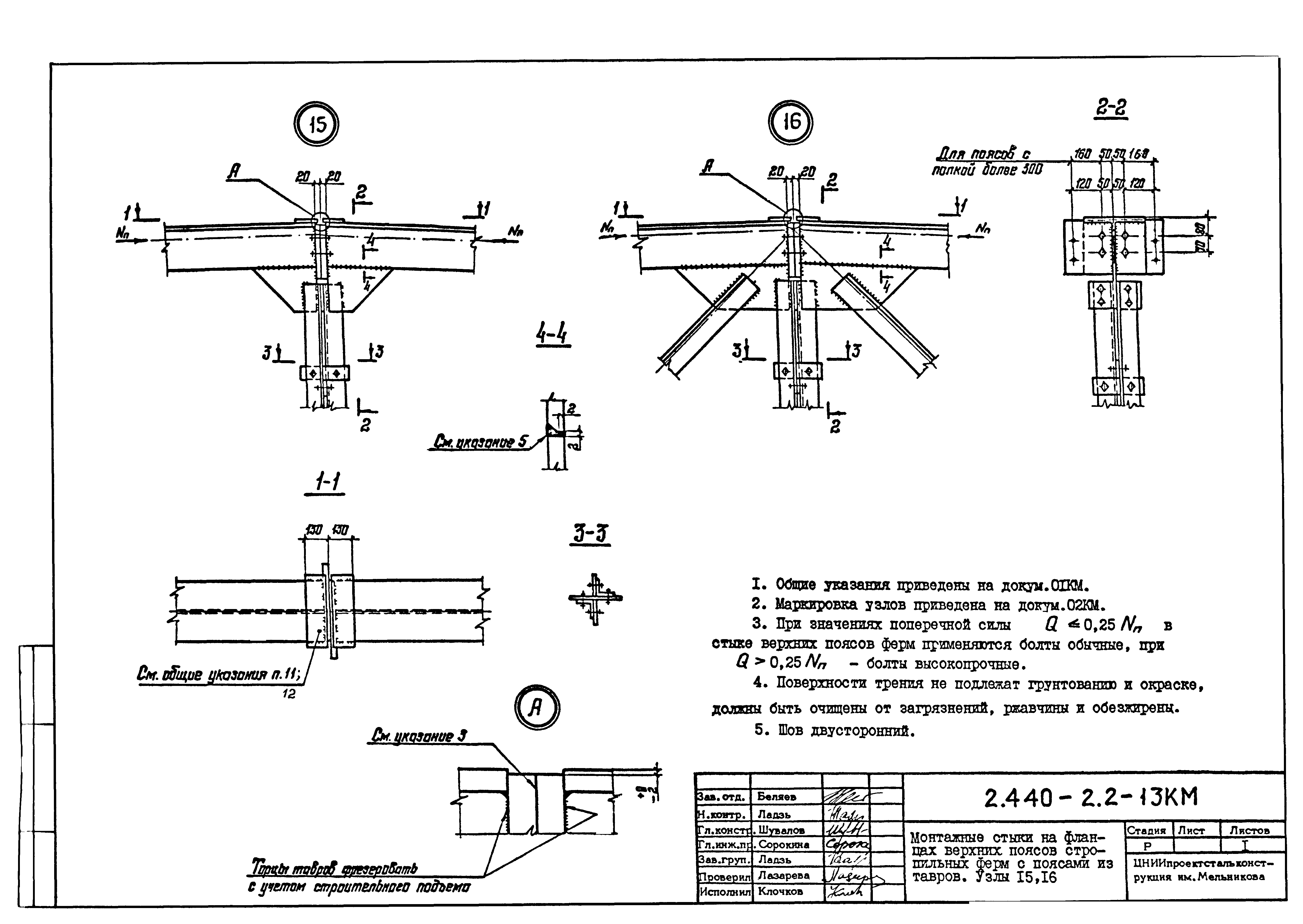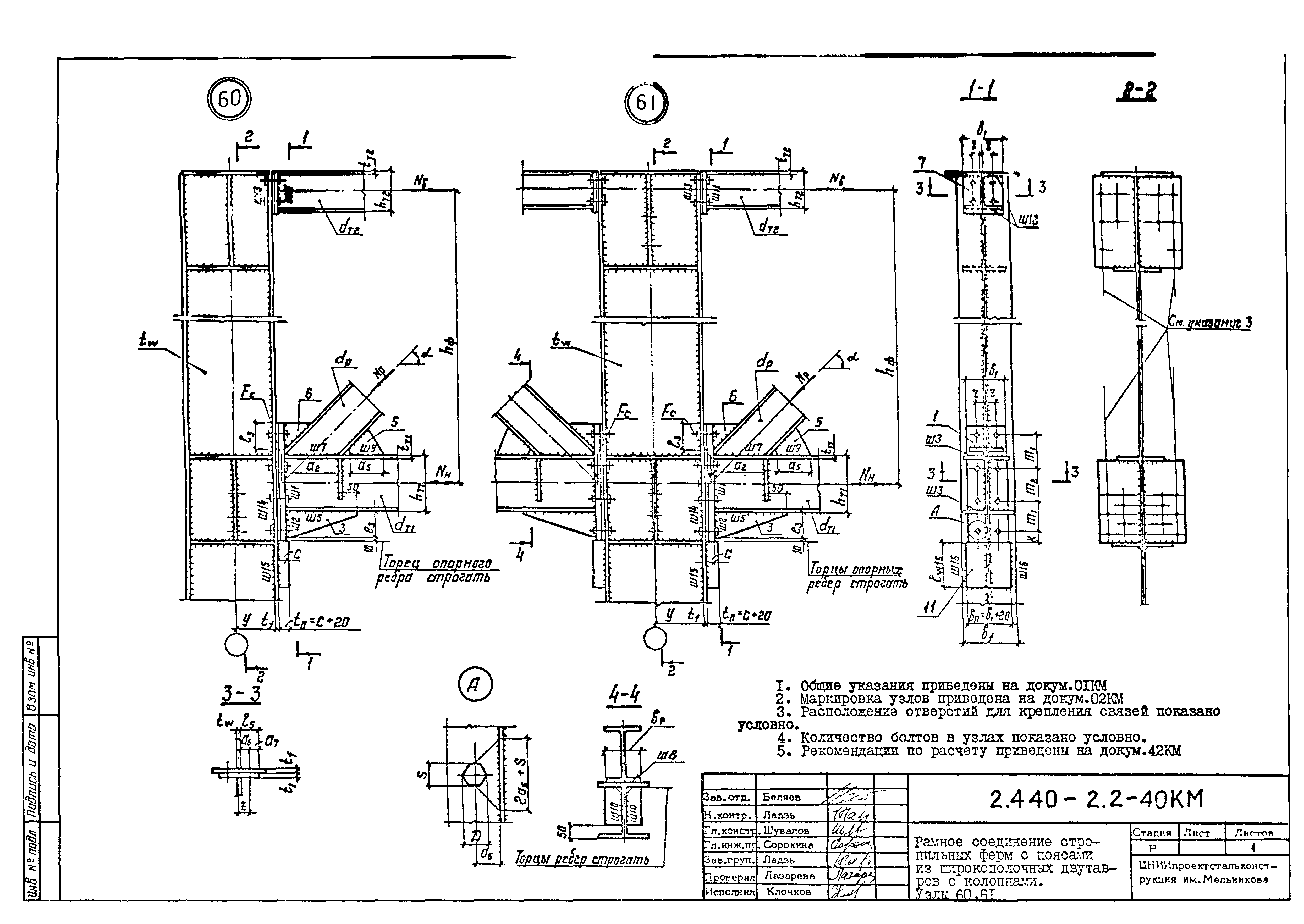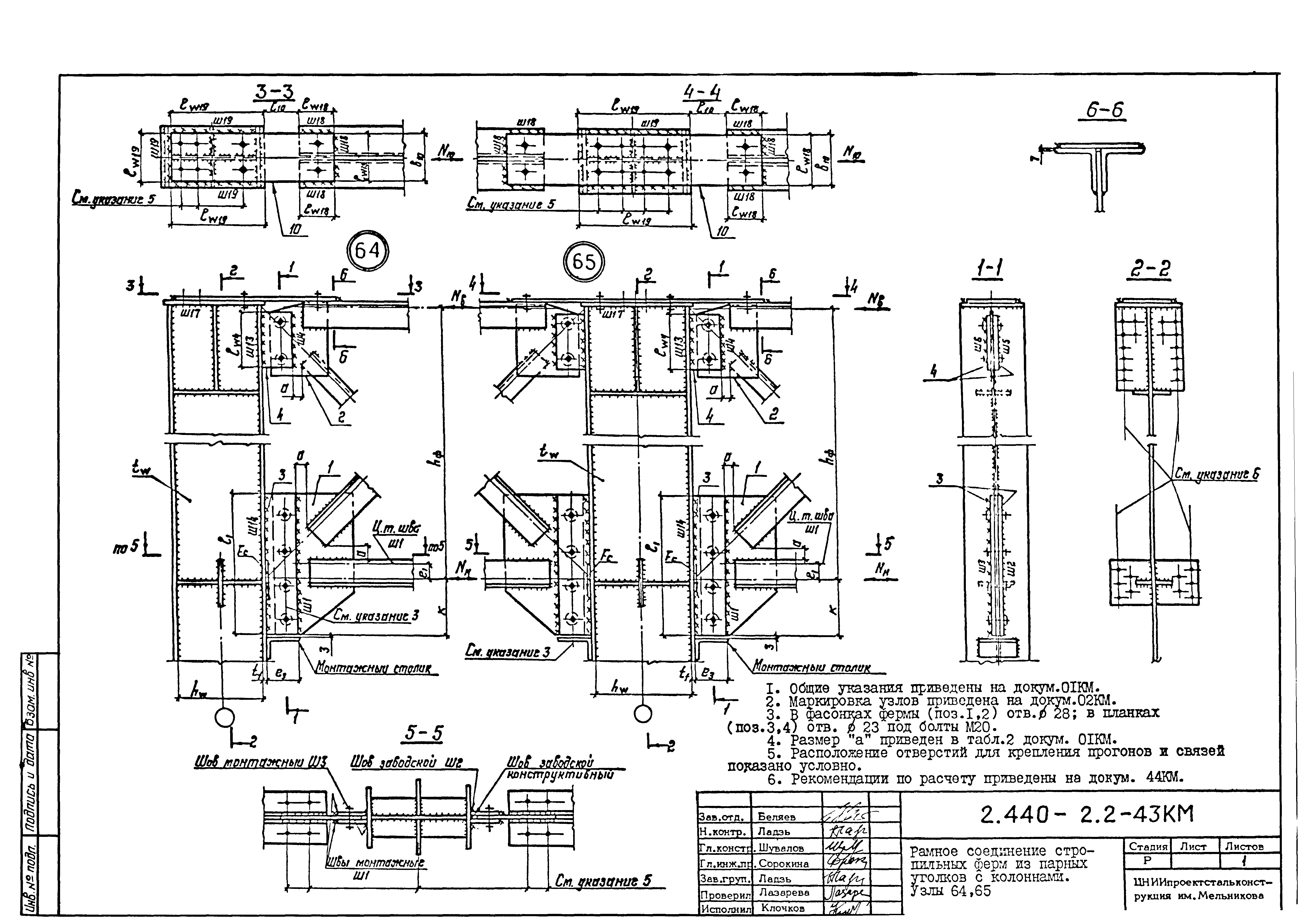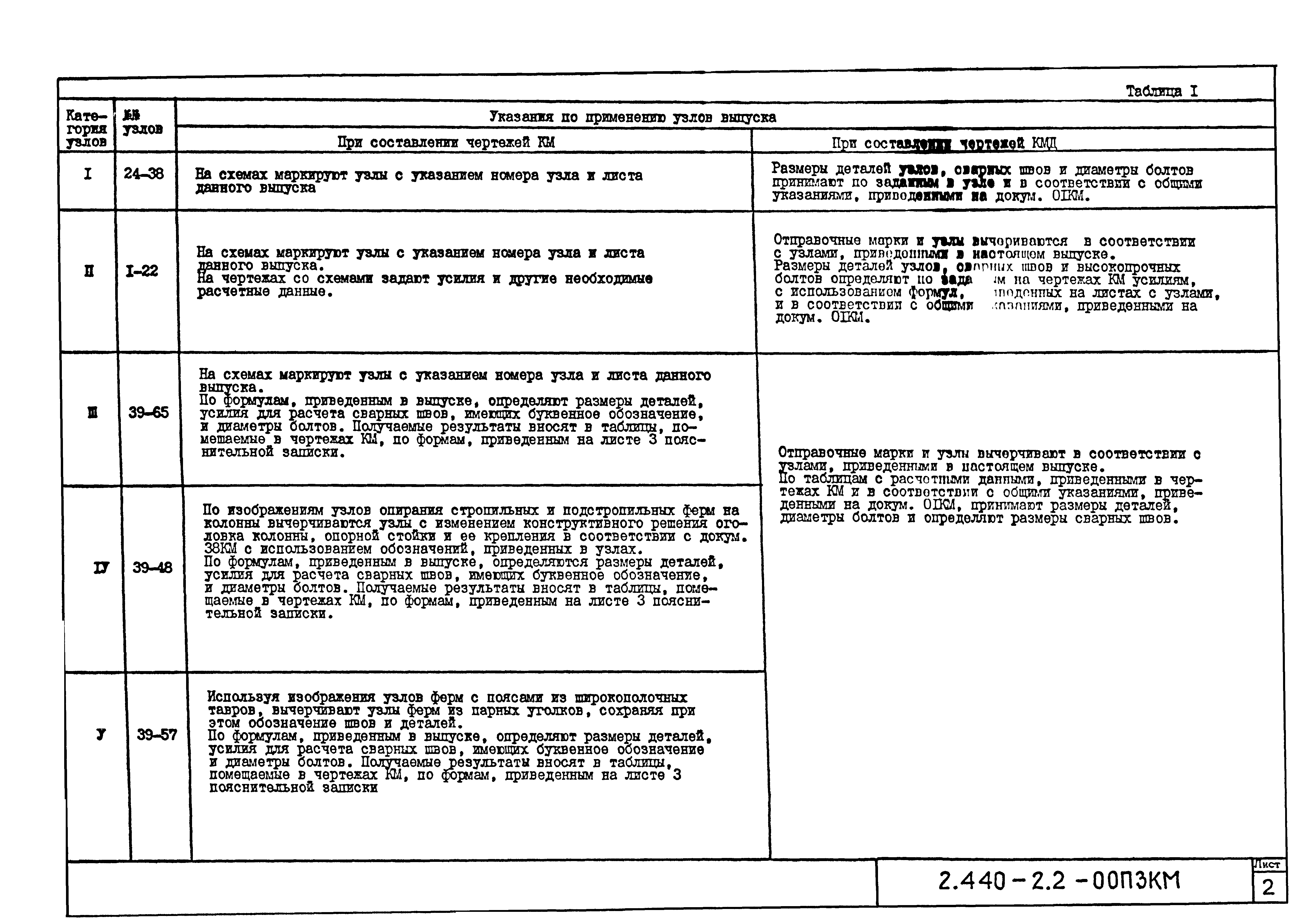 | Оглавление: | 2.440-2.2-00П3КМ Пояснительная записка 2.440-2.2-01КМ Общие указания 2.440-2.2-02КМ Маркировка узлов стропильных и подстропильных ферм 2.440-2.2-03КМ Заводские узлы верхних поясов стропильных ферм из парных уголков. Узлы 1, 2 2.440-2.2-04КМ Рекомендации по расчету узлов 1, 2 2.440-2.2-05КМ Монтажные стыки на сварке стропильных ферм из парных уголков. Узлы 3, 4 2.440-2.2-06КМ Монтажные стыки на сварке стропильных ферм из парных уголков. Узлы 5, 6 2.440-2.2-07КМ Рекомендации по расчету узлов 3-6 2.440-2.2-08КМ Монтажные стыки на высокопрочных болтах стропильных ферм из парных уголков. Узлы 7, 8 2.440-2.2-09КМ Монтажные стыки на высокопрочных болтах стропильных ферм из парных уголков. Узлы 9, 10 2.440-2.2-10КМ Рекомендации по расчету узлов 7-10 2.440-2.2-11КМ Монтажные стыки на фланцах верхних поясов стропильных ферм из парных уголков. Узлы 11, 12 2.440-2.2-12КМ Монтажные стыки на фланцах нижних поясов стропильных ферм из парных уголков. Узлы 13, 14 2.440-2.2-13КМ Монтажные стыки на фланцах верхних поясов стропильных ферм с поясами из тавров. Узлы 15, 16 2.440-2.2-14КМ Монтажные стыки на фланцах нижних поясов стропильных ферм с поясами из тавров. Узлы 17, 18 2.440-2.2-15КМ Монтажные стыки на высокопрочных болтах нижних поясов стропильных ферм с поясами из тавров. Узлы 19, 20 2.440-2.2-16КМ Рекомендации по расчету узлов 19, 20 2.440-2.2-17КМ Монтажные стыки на сварке нижних поясов стропильных ферм с поясами из тавров. Узлы 21, 22 2.440-2.2-18КМ Рекомендации по расчету узлов 21, 22 2.440-2.2-19КМ Крепление связей по нижним поясам стропильных ферм. Узел 23 2.440-2.2-20КМ Соединение стропильных ферм с опорными стойками. Узлы 24, 25 2.440-2.2-21КМ Соединение стропильных ферм с опорными стойками и узлы стропильных ферм. Узлы 26-28 2.440-2.2-22КМ Соединение стропильных и подстропильных ферм с опорными стойками. Узлы 29-31 2.440-2.2-23КМ Соединение стропильных и подстропильных ферм с опорными стойками. Узлы 32-34 2.440-2.2-24КМ Соединение стропильных ферм с подстропильными. Узлы 35-38 2.440-2.2-25КМ Опирание стропильных ферм на колонны крайнего ряда. Узлы 39, 40 2.440-2.2-26КМ Опирание стропильной фермы на колонну крайнего ряда. Узел 41 2.440-2.2-27КМ Опирание стропильных ферм на колонны среднего ряда. Узлы 42, 43 2.440-2.2-28КМ Опирание стропильных и подстропильных ферм на колонны крайнего ряда. Узлы 44, 45 2.440-2.2-29КМ Опирание стропильных и подстропильных ферм на колонну крайнего ряда. Узел 46 2.440-2.2-30КМ Опирание стропильных и подстропильных ферм на колонну среднего ряда. Узел 47 2.440-2.2-31КМ Опирание стропильных и подстропильных ферм на колонну среднего ряда. Узел 48 2.440-2.2-32КМ Рекомендации по расчету узлов 39-48 2.440-2.2-33КМ Опирание стропильных ферм с поясами из широкополочных тавров на подстропильные фермы Узлы 49, 50 2.440-2.2-34КМ Опирание стропильных ферм из парных уголков на подстропильные фермы Узлы 51, 52 2.440-2.2-35КМ Рекомендации по расчету узлов 49-52 и болтов для крепления опорной стойки к колонне 2.440-2.2-36КМ Опирание стропильных ферм на железобетонные колонны. Узлы 53-55 2.440-2.2-37КМ Опирание стропильных ферм на железобетонные колонны. Узлы 56, 57 2.440-2.2-38КМ Узел опирания стропильных и подстропильных ферм на колонну - вариант 2 2.440-2.2-39КМ Рамное соединение стропильных ферм с поясами из широкополочных двутавров с колоннами. Узлы 58, 59 2.440-2.2-40КМ Рамное соединение стропильных ферм с поясами из широкополочных двутавров с колоннами. Узлы 60, 61 2.440-2.2-41КМ Рамное соединение стропильных ферм с поясами из широкополочных тавров с колоннами. Узлы 62, 63 2.440-2.2-42КМ Рекомендации