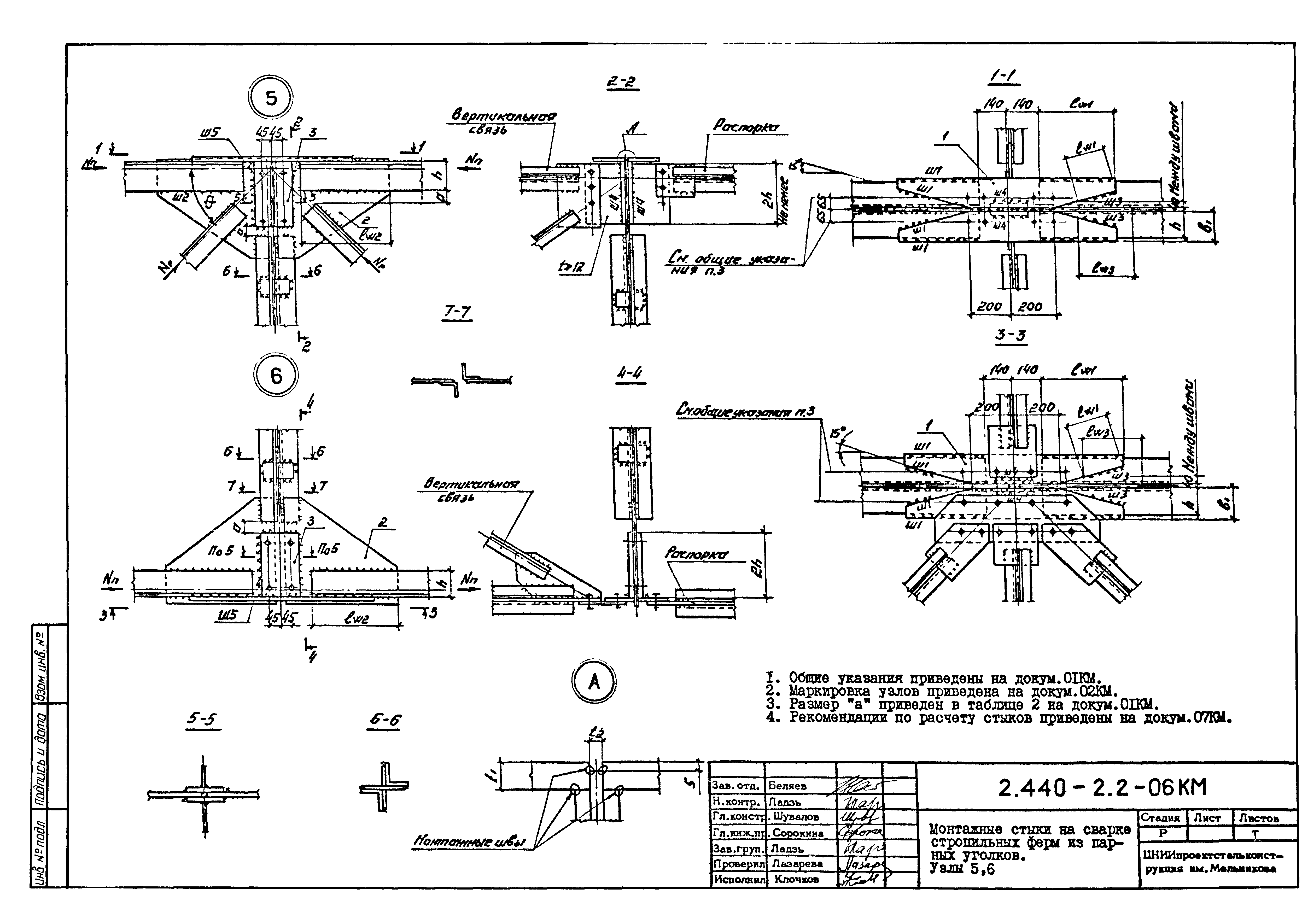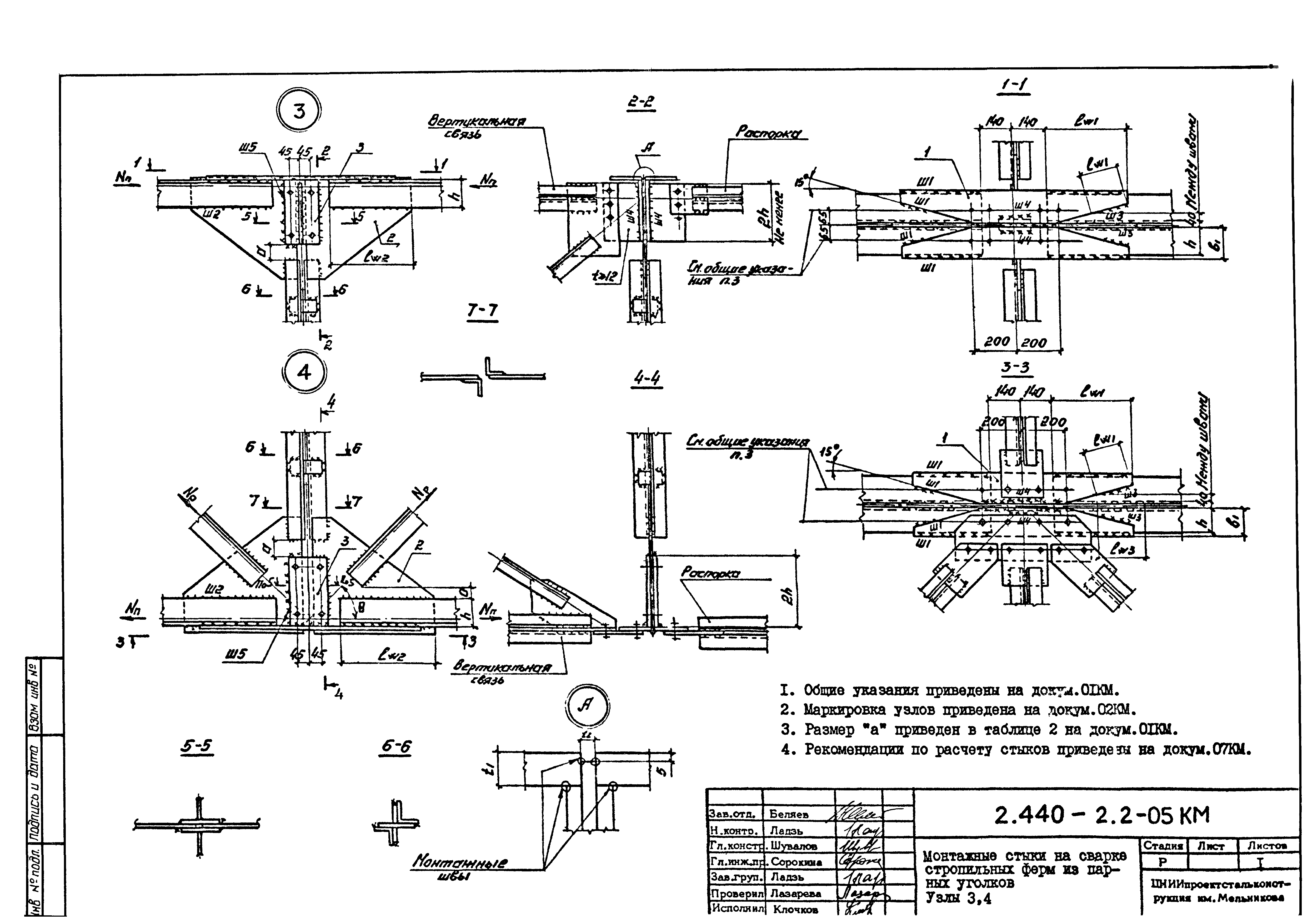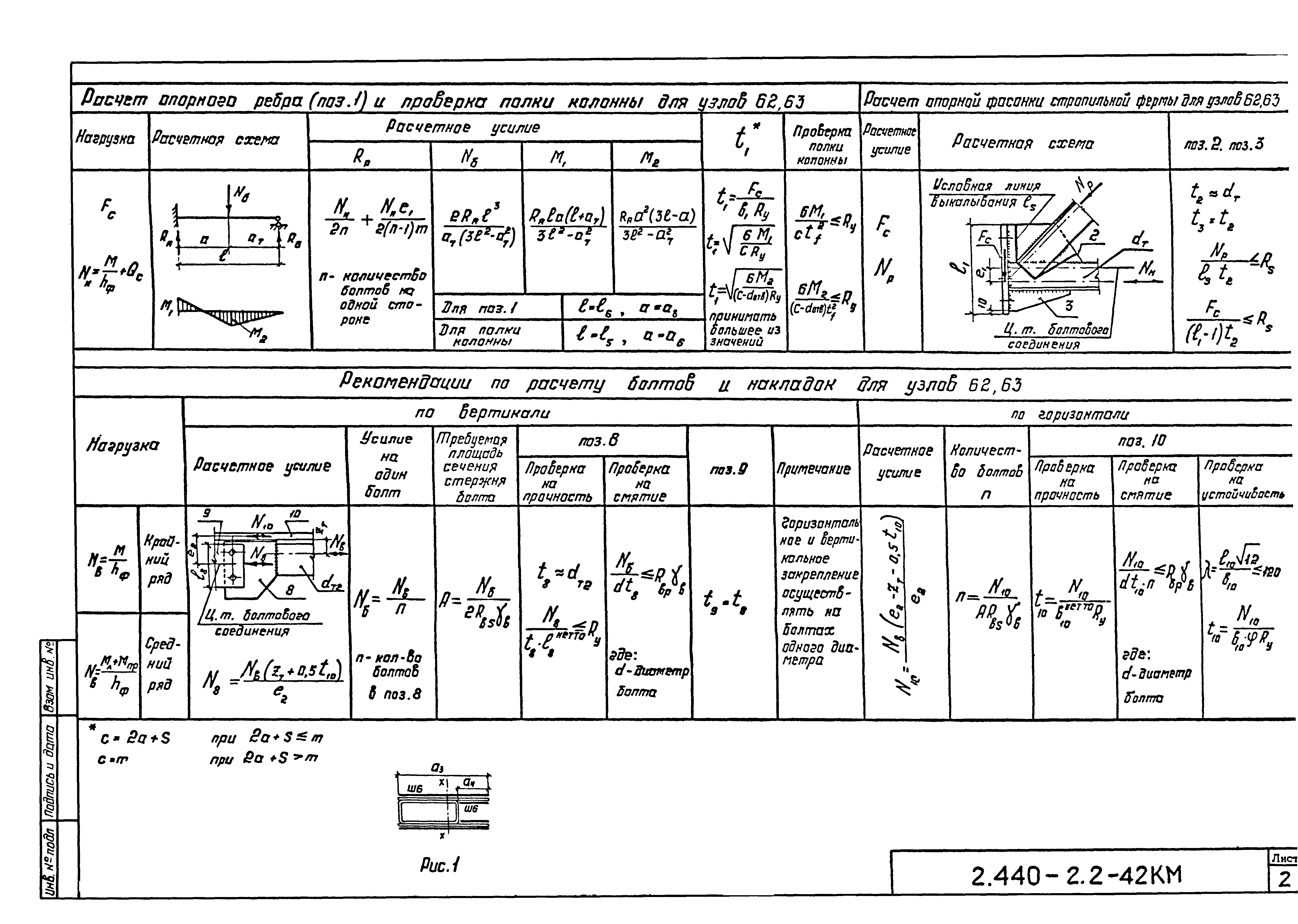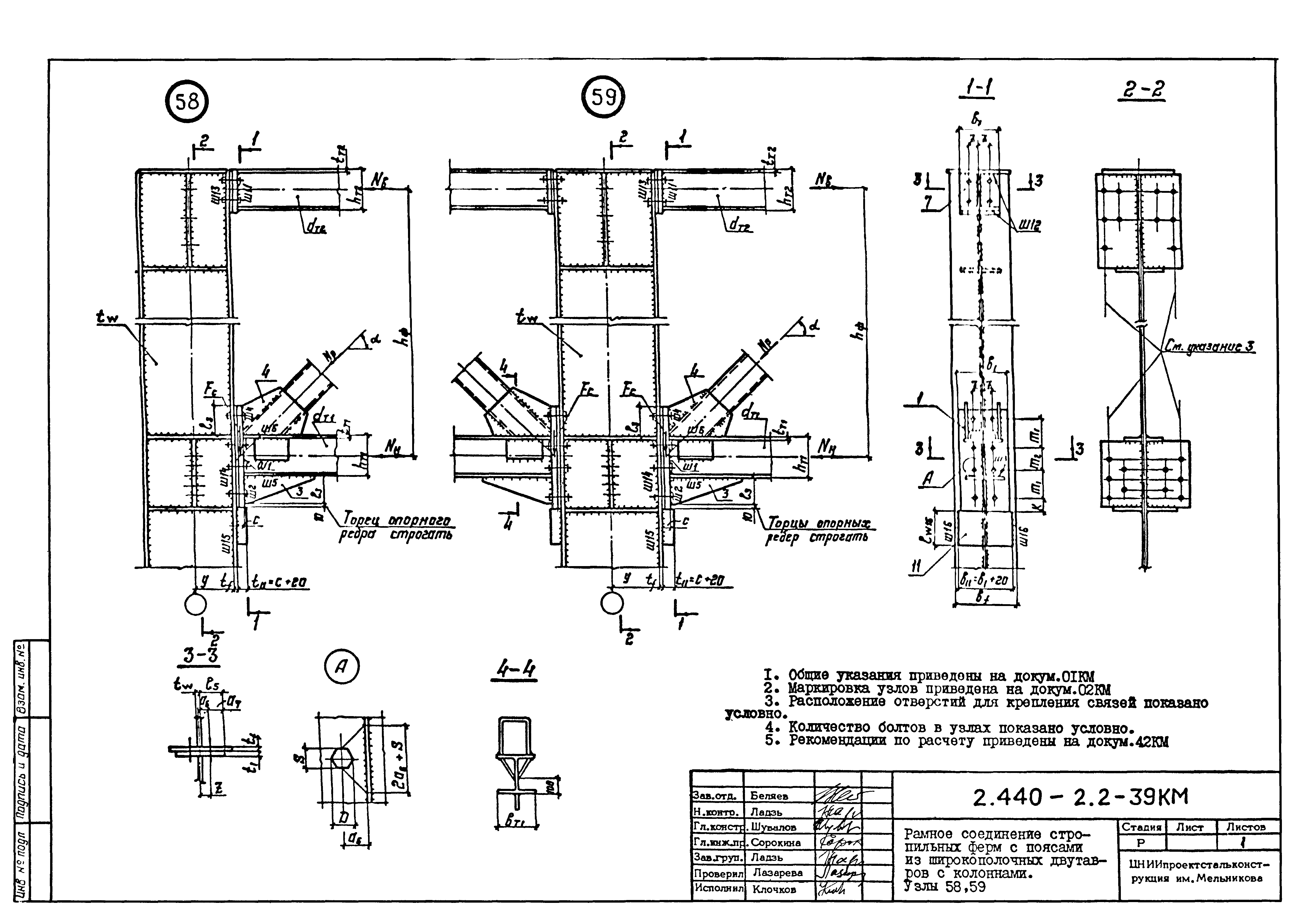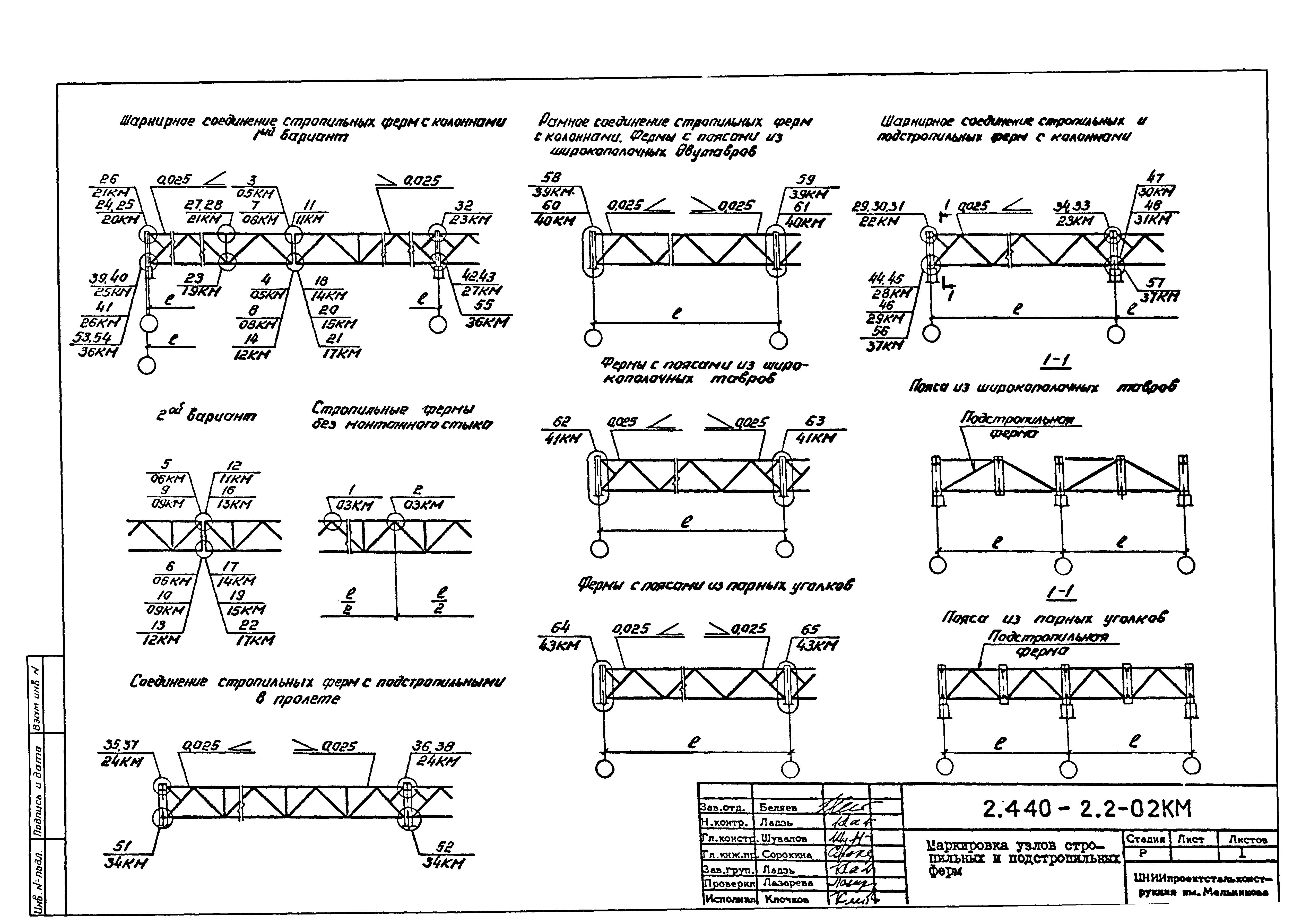 | Оглавление: | 2.440-2.2-00П3КМ Пояснительная записка 2.440-2.2-01КМ Общие указания 2.440-2.2-02КМ Маркировка узлов стропильных и подстропильных ферм 2.440-2.2-03КМ Заводские узлы верхних поясов стропильных ферм из парных уголков. Узлы 1, 2 2.440-2.2-04КМ Рекомендации по расчету узлов 1, 2 2.440-2.2-05КМ Монтажные стыки на сварке стропильных ферм из парных уголков. Узлы 3, 4 2.440-2.2-06КМ Монтажные стыки на сварке стропильных ферм из парных уголков. Узлы 5, 6 2.440-2.2-07КМ Рекомендации по расчету узлов 3-6 2.440-2.2-08КМ Монтажные стыки на высокопрочных болтах стропильных ферм из парных уголков. Узлы 7, 8 2.440-2.2-09КМ Монтажные стыки на высокопрочных болтах стропильных ферм из парных уголков. Узлы 9, 10 2.440-2.2-10КМ Рекомендации по расчету узлов 7-10 2.440-2.2-11КМ Монтажные стыки на фланцах верхних поясов стропильных ферм из парных уголков. Узлы 11, 12 2.440-2.2-12КМ Монтажные стыки на фланцах нижних поясов стропильных ферм из парных уголков. Узлы 13, 14 2.440-2.2-13КМ Монтажные стыки на фланцах верхних поясов стропильных ферм с поясами из тавров. Узлы 15, 16 2.440-2.2-14КМ Монтажные стыки на фланцах нижних поясов стропильных ферм с поясами из тавров. Узлы 17, 18 2.440-2.2-15КМ Монтажные стыки на высокопрочных болтах нижних поясов стропильных ферм с поясами из тавров. Узлы 19, 20 2.440-2.2-16КМ Рекомендации по расчету узлов 19, 20 2.440-2.2-17КМ Монтажные стыки на сварке нижних поясов стропильных ферм с поясами из тавров. Узлы 21, 22 2.440-2.2-18КМ Рекомендации по расчету узлов 21, 22 2.440-2.2-19КМ Крепление связей по нижним поясам стропильных ферм. Узел 23 2.440-2.2-20КМ Соединение стропильных ферм с опорными стойками. Узлы 24, 25 2.440-2.2-21КМ Соединение стропильных ферм с опорными стойками и узлы стропильных ферм. Узлы 26-28 2.440-2.2-22КМ Соединение стропильных и подстропильных ферм с опорными стойками. Узлы 29-31 2.440-2.2-23КМ Соединение стропильных и подстропильных ферм с опорными стойками. Узлы 32-34 2.440-2.2-24КМ Соединение стропильных ферм с подстропильными. Узлы 35-38 2.440-2.2-25КМ Опирание стропильных ферм на колонны крайнего ряда. Узлы 39, 40 2.440-2.2-26КМ Опирание стропильной фермы на колонну крайнего ряда. Узел 41 2.440-2.2-27КМ Опирание стропильных ферм на колонны среднего ряда. Узлы 42, 43 2.440-2.2-28КМ Опирание стропильных и подстропильных ферм на колонны крайнего ряда. Узлы 44, 45 2.440-2.2-29КМ Опирание стропильных и подстропильных ферм на колонну крайнего ряда. Узел 46 2.440-2.2-30КМ Опирание стропильных и подстропильных ферм на колонну среднего ряда. Узел 47 2.440-2.2-31КМ Опирание стропильных и подстропильных ферм на колонну среднего ряда. Узел 48 2.440-2.2-32КМ Рекомендации по расчету узлов 39-48 2.440-2.2-33КМ Опирание стропильных ферм с поясами из широкополочных тавров на подстропильные фермы Узлы 49, 50 2.440-2.2-34КМ Опирание стропильных ферм из парных уголков на подстропильные фермы Узлы 51, 52 2.440-2.2-35КМ Рекомендации по расчету узлов 49-52 и болтов для крепления опорной стойки к колонне 2.440-2.2-36КМ Опирание стропильных ферм на железобетонные колонны. Узлы 53-55 2.440-2.2-37КМ Опирание стропильных ферм на железобетонные колонны. Узлы 56, 57 2.440-2.2-38КМ Узел опирания стропильных и подстропильных ферм на колонну - вариант 2 2.440-2.2-39КМ Рамное соединение стропильных ферм с поясами из широкополочных двутавров с колоннами. Узлы 58, 59 2.440-2.2-40КМ Рамное соединение стропильных ферм с поясами из широкополочных двутавров с колоннами. Узлы 60, 61 2.440-2.2-41КМ Рамное соединение стропильных ферм с поясами из широкополочных тавров с колоннами. Узлы 62, 63 2.440-2.2-42КМ Рекомендации