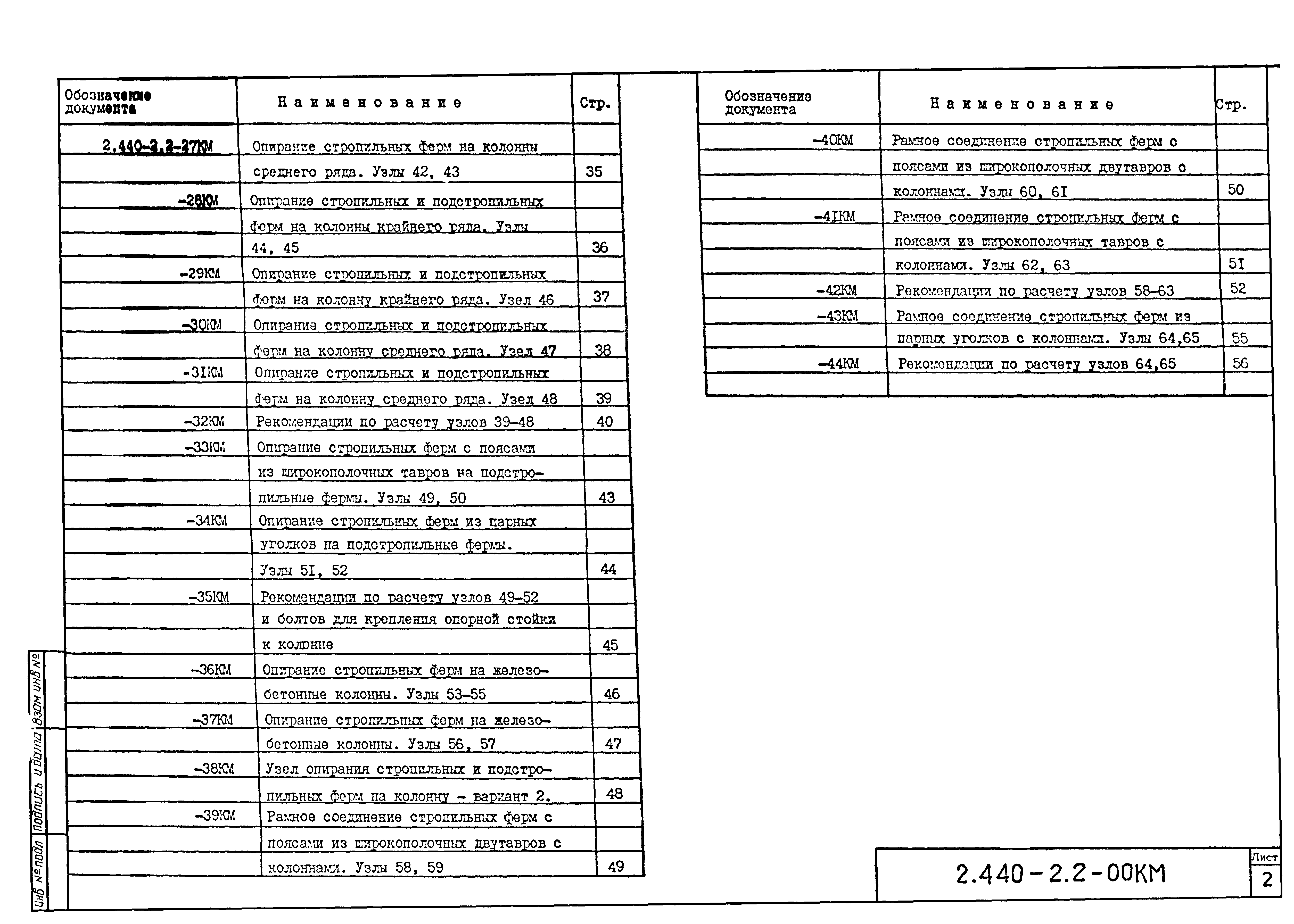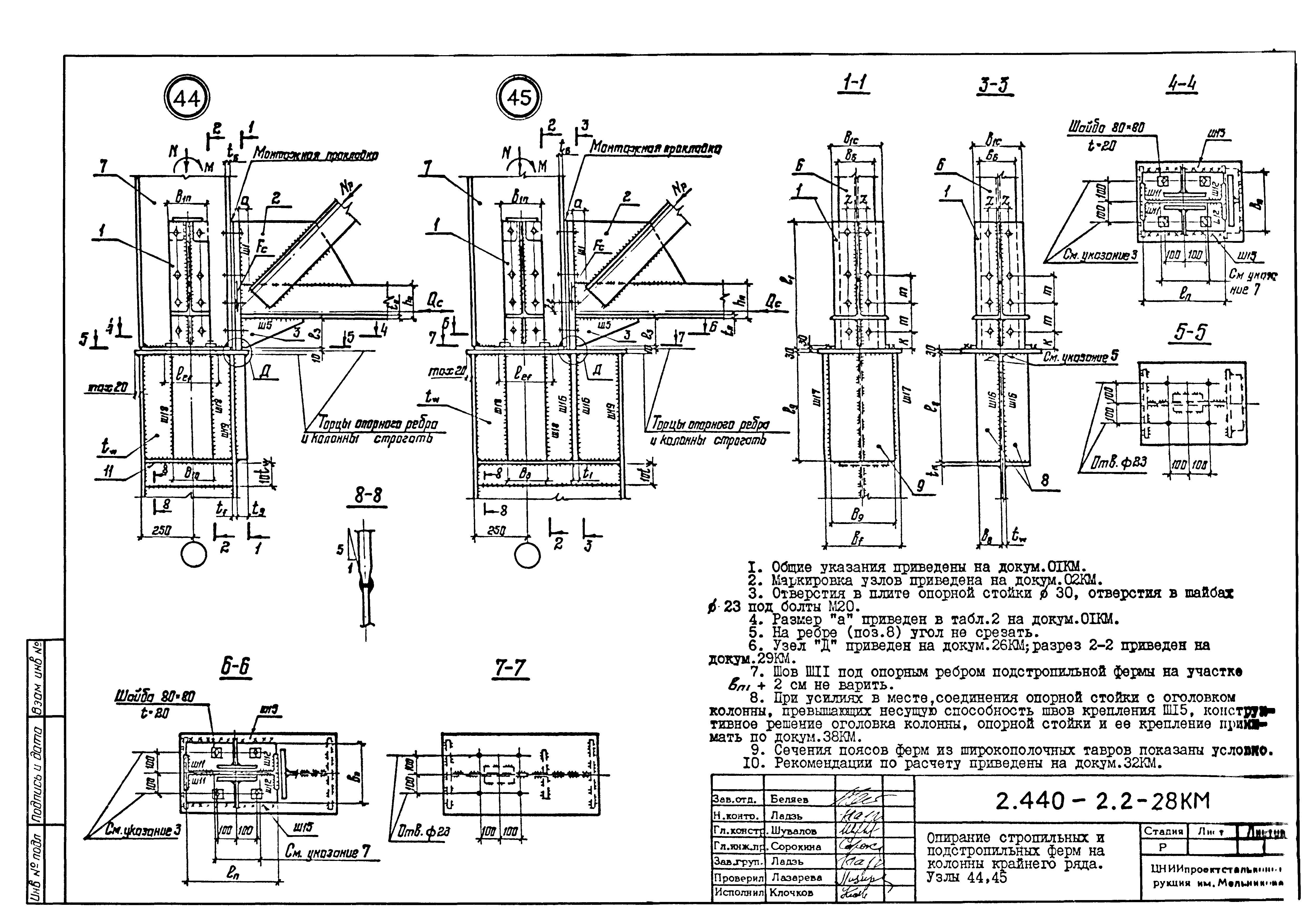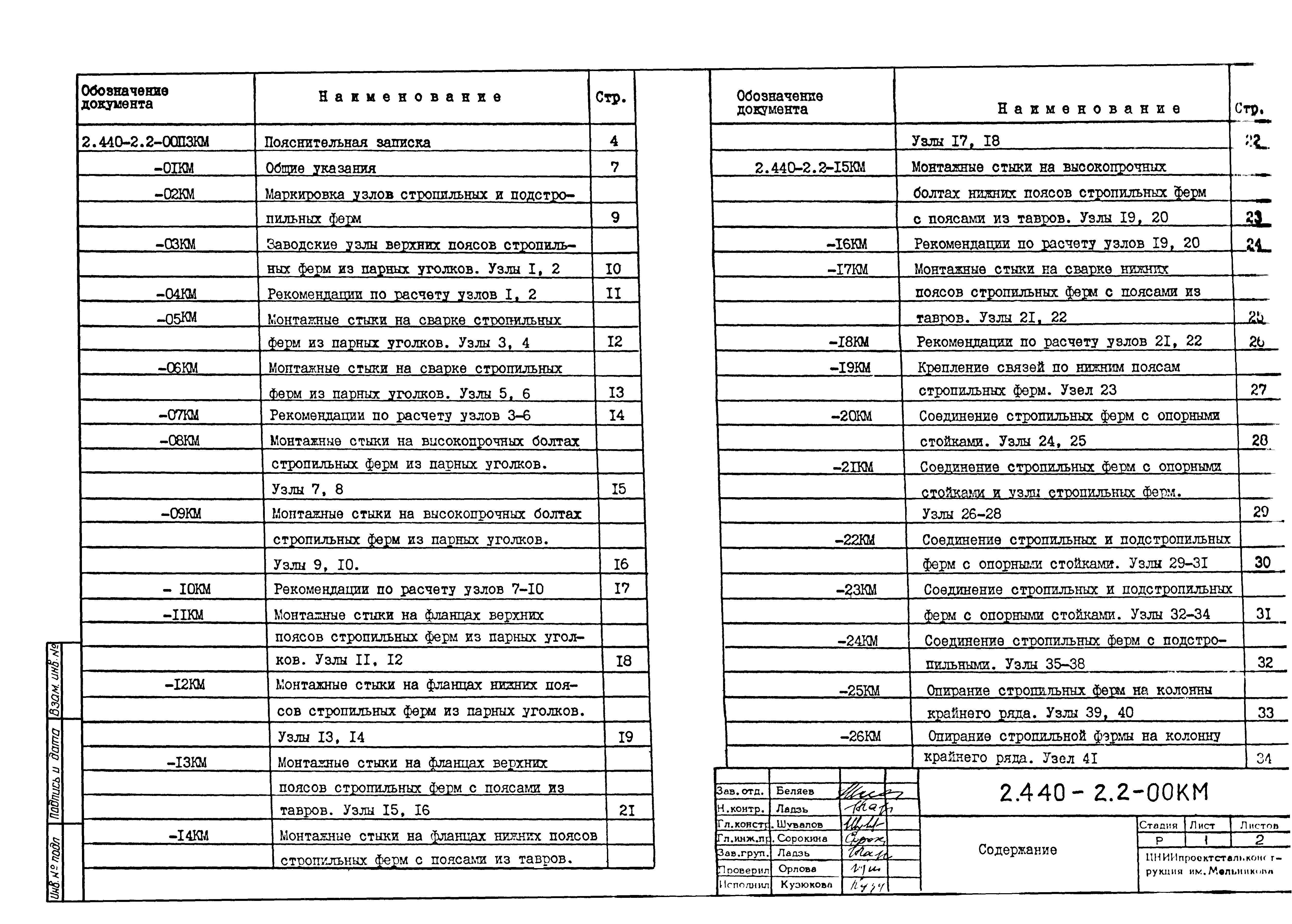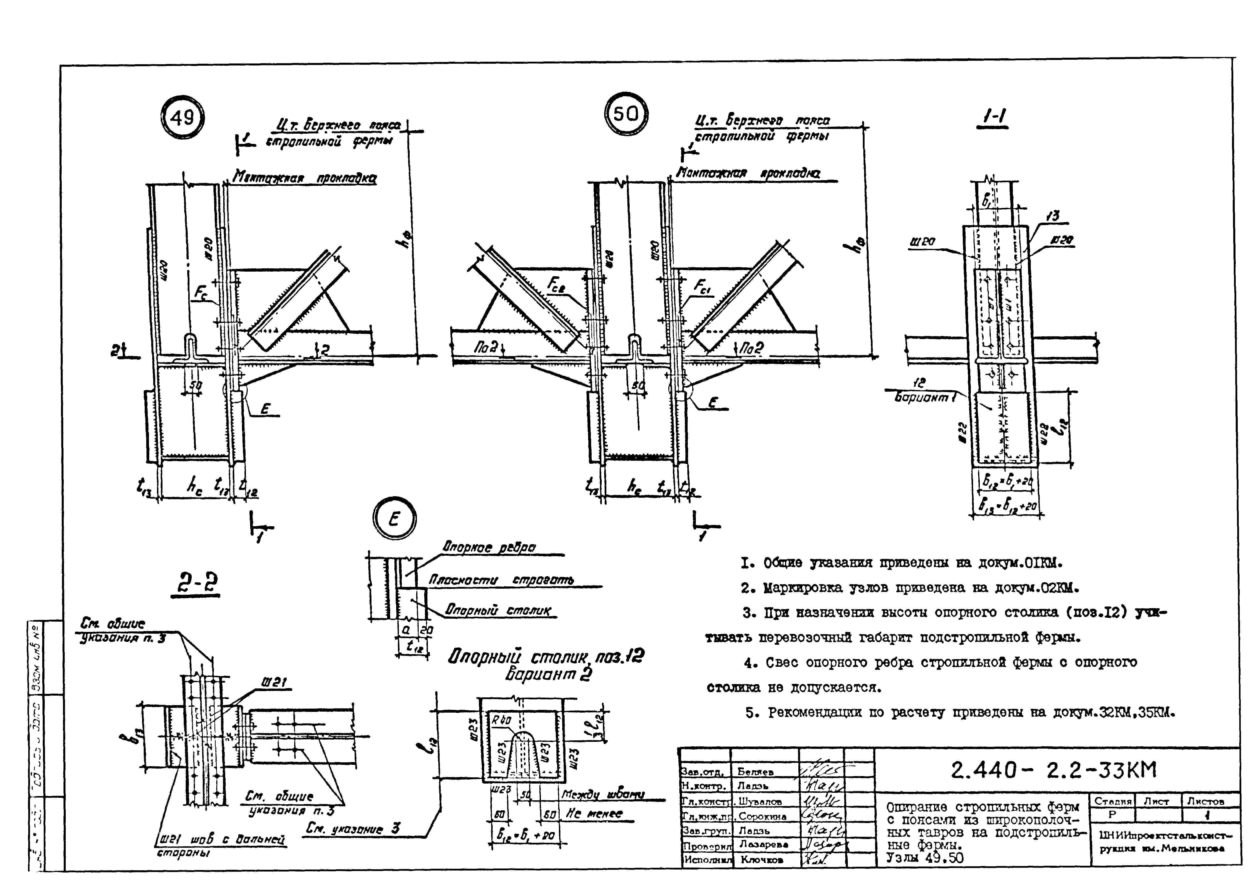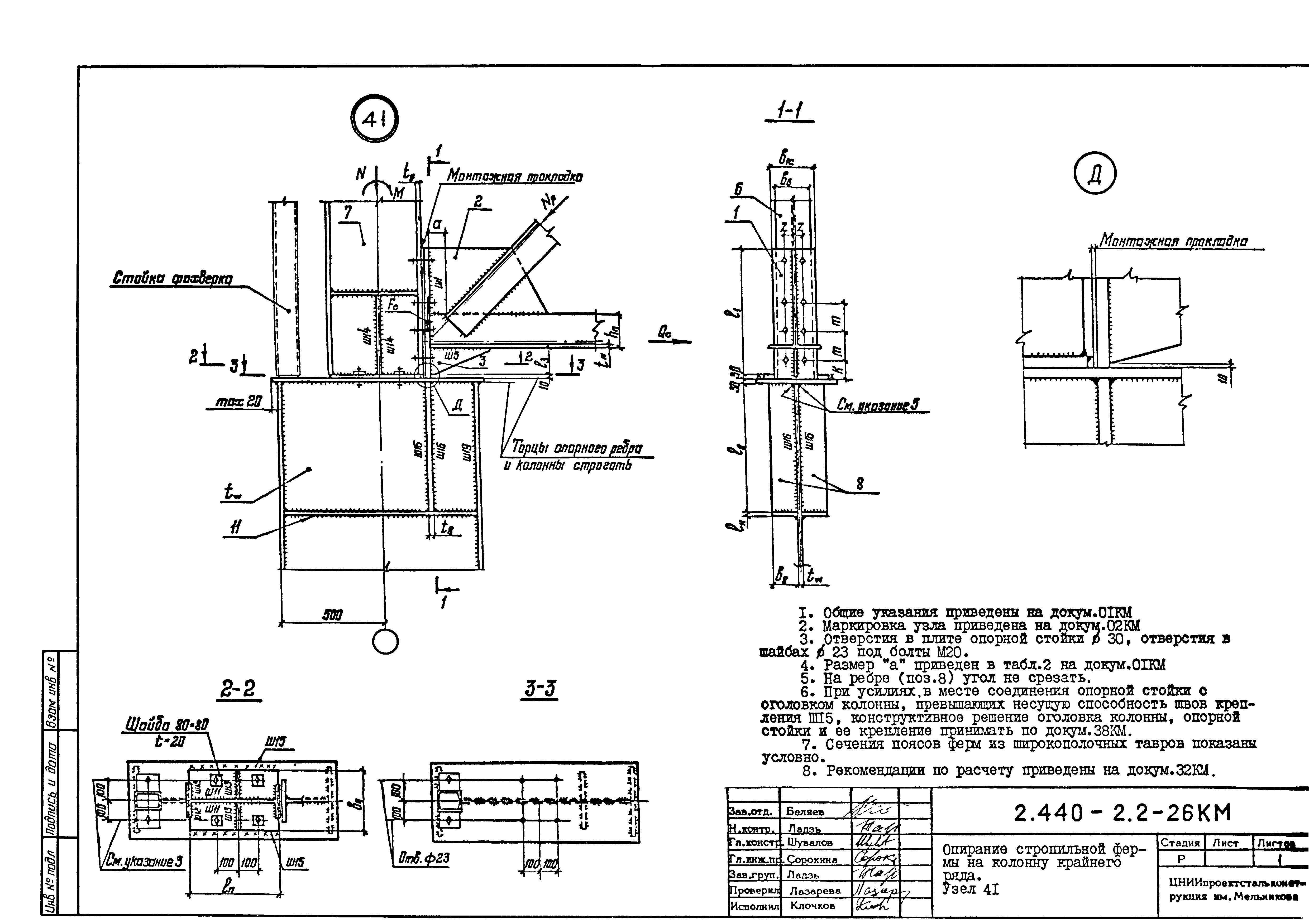 | Оглавление: | 2.440-2.2-00П3КМ Пояснительная записка 2.440-2.2-01КМ Общие указания 2.440-2.2-02КМ Маркировка узлов стропильных и подстропильных ферм 2.440-2.2-03КМ Заводские узлы верхних поясов стропильных ферм из парных уголков. Узлы 1, 2 2.440-2.2-04КМ Рекомендации по расчету узлов 1, 2 2.440-2.2-05КМ Монтажные стыки на сварке стропильных ферм из парных уголков. Узлы 3, 4 2.440-2.2-06КМ Монтажные стыки на сварке стропильных ферм из парных уголков. Узлы 5, 6 2.440-2.2-07КМ Рекомендации по расчету узлов 3-6 2.440-2.2-08КМ Монтажные стыки на высокопрочных болтах стропильных ферм из парных уголков. Узлы 7, 8 2.440-2.2-09КМ Монтажные стыки на высокопрочных болтах стропильных ферм из парных уголков. Узлы 9, 10 2.440-2.2-10КМ Рекомендации по расчету узлов 7-10 2.440-2.2-11КМ Монтажные стыки на фланцах верхних поясов стропильных ферм из парных уголков. Узлы 11, 12 2.440-2.2-12КМ Монтажные стыки на фланцах нижних поясов стропильных ферм из парных уголков. Узлы 13, 14 2.440-2.2-13КМ Монтажные стыки на фланцах верхних поясов стропильных ферм с поясами из тавров. Узлы 15, 16 2.440-2.2-14КМ Монтажные стыки на фланцах нижних поясов стропильных ферм с поясами из тавров. Узлы 17, 18 2.440-2.2-15КМ Монтажные стыки на высокопрочных болтах нижних поясов стропильных ферм с поясами из тавров. Узлы 19, 20 2.440-2.2-16КМ Рекомендации по расчету узлов 19, 20 2.440-2.2-17КМ Монтажные стыки на сварке нижних поясов стропильных ферм с поясами из тавров. Узлы 21, 22 2.440-2.2-18КМ Рекомендации по расчету узлов 21, 22 2.440-2.2-19КМ Крепление связей по нижним поясам стропильных ферм. Узел 23 2.440-2.2-20КМ Соединение стропильных ферм с опорными стойками. Узлы 24, 25 2.440-2.2-21КМ Соединение стропильных ферм с опорными стойками и узлы стропильных ферм. Узлы 26-28 2.440-2.2-22КМ Соединение стропильных и подстропильных ферм с опорными стойками. Узлы 29-31 2.440-2.2-23КМ Соединение стропильных и подстропильных ферм с опорными стойками. Узлы 32-34 2.440-2.2-24КМ Соединение стропильных ферм с подстропильными. Узлы 35-38 2.440-2.2-25КМ Опирание стропильных ферм на колонны крайнего ряда. Узлы 39, 40 2.440-2.2-26КМ Опирание стропильной фермы на колонну крайнего ряда. Узел 41 2.440-2.2-27КМ Опирание стропильных ферм на колонны среднего ряда. Узлы 42, 43 2.440-2.2-28КМ Опирание стропильных и подстропильных ферм на колонны крайнего ряда. Узлы 44, 45 2.440-2.2-29КМ Опирание стропильных и подстропильных ферм на колонну крайнего ряда. Узел 46 2.440-2.2-30КМ Опирание стропильных и подстропильных ферм на колонну среднего ряда. Узел 47 2.440-2.2-31КМ Опирание стропильных и подстропильных ферм на колонну среднего ряда. Узел 48 2.440-2.2-32КМ Рекомендации по расчету узлов 39-48 2.440-2.2-33КМ Опирание стропильных ферм с поясами из широкополочных тавров на подстропильные фермы Узлы 49, 50 2.440-2.2-34КМ Опирание стропильных ферм из парных уголков на подстропильные фермы Узлы 51, 52 2.440-2.2-35КМ Рекомендации по расчету узлов 49-52 и болтов для крепления опорной стойки к колонне 2.440-2.2-36КМ Опирание стропильных ферм на железобетонные колонны. Узлы 53-55 2.440-2.2-37КМ Опирание стропильных ферм на железобетонные колонны. Узлы 56, 57 2.440-2.2-38КМ Узел опирания стропильных и подстропильных ферм на колонну - вариант 2 2.440-2.2-39КМ Рамное соединение стропильных ферм с поясами из широкополочных двутавров с колоннами. Узлы 58, 59 2.440-2.2-40КМ Рамное соединение стропильных ферм с поясами из широкополочных двутавров с колоннами. Узлы 60, 61 2.440-2.2-41КМ Рамное соединение стропильных ферм с поясами из широкополочных тавров с колоннами. Узлы 62, 63 2.440-2.2-42КМ Рекомендации