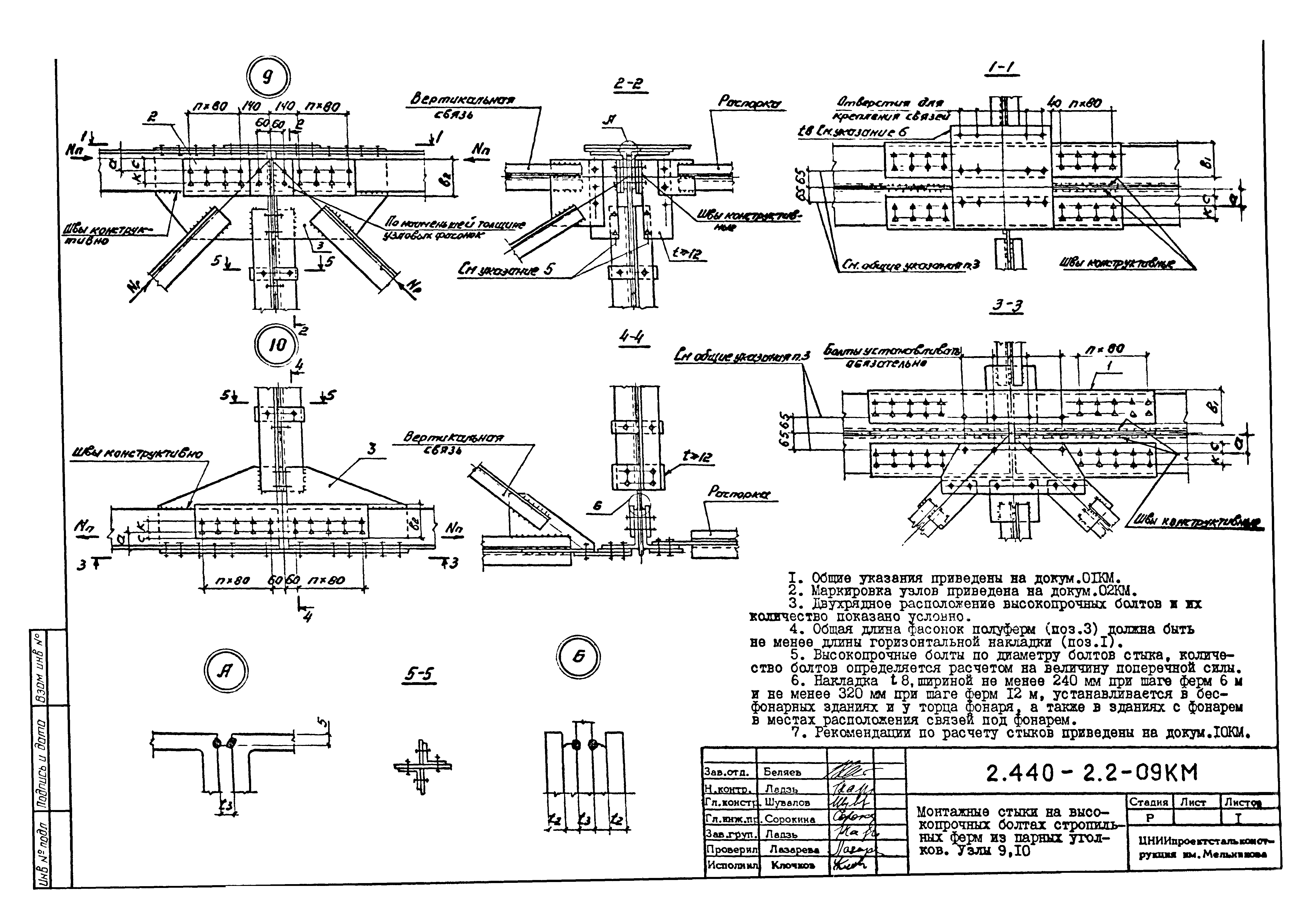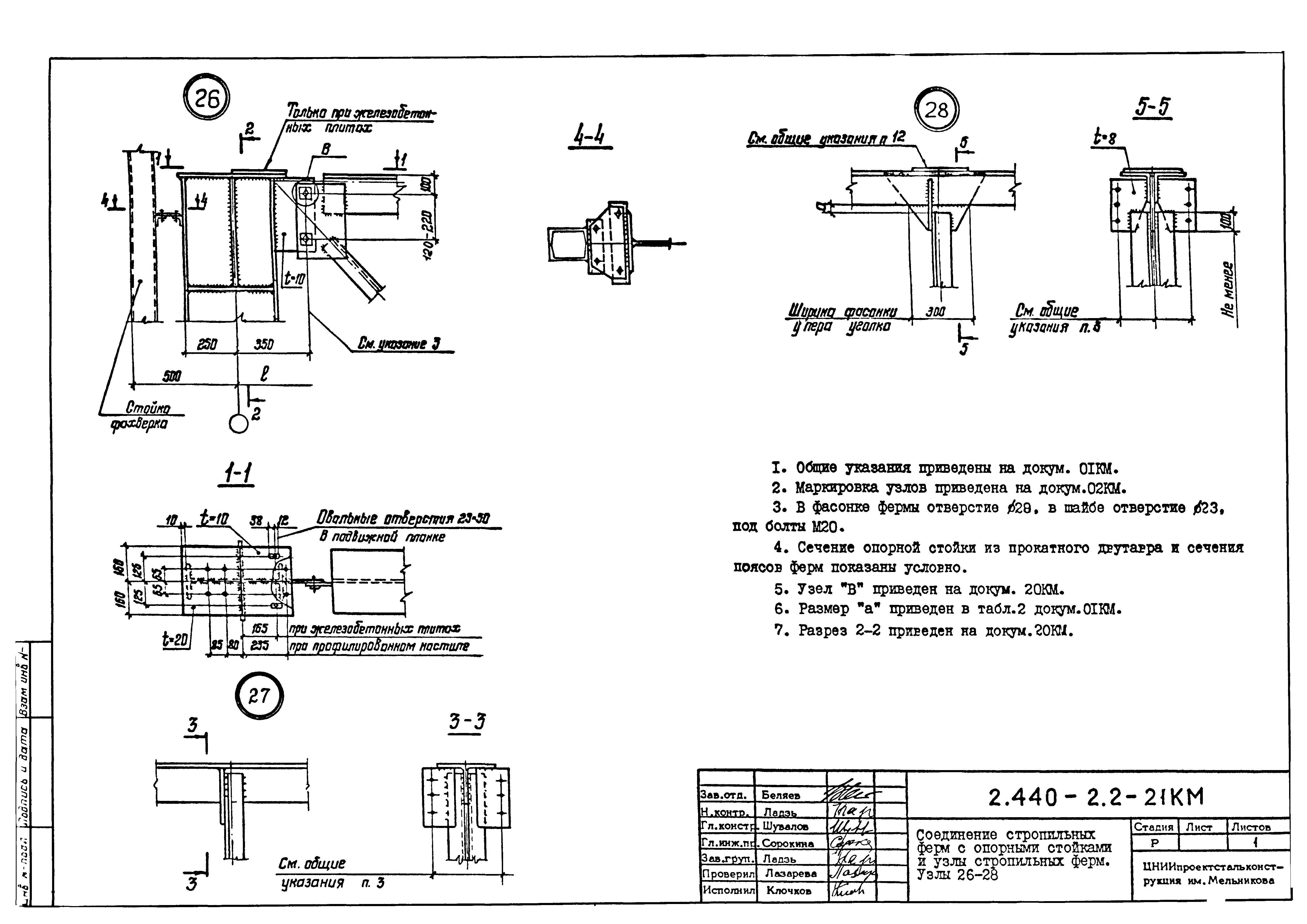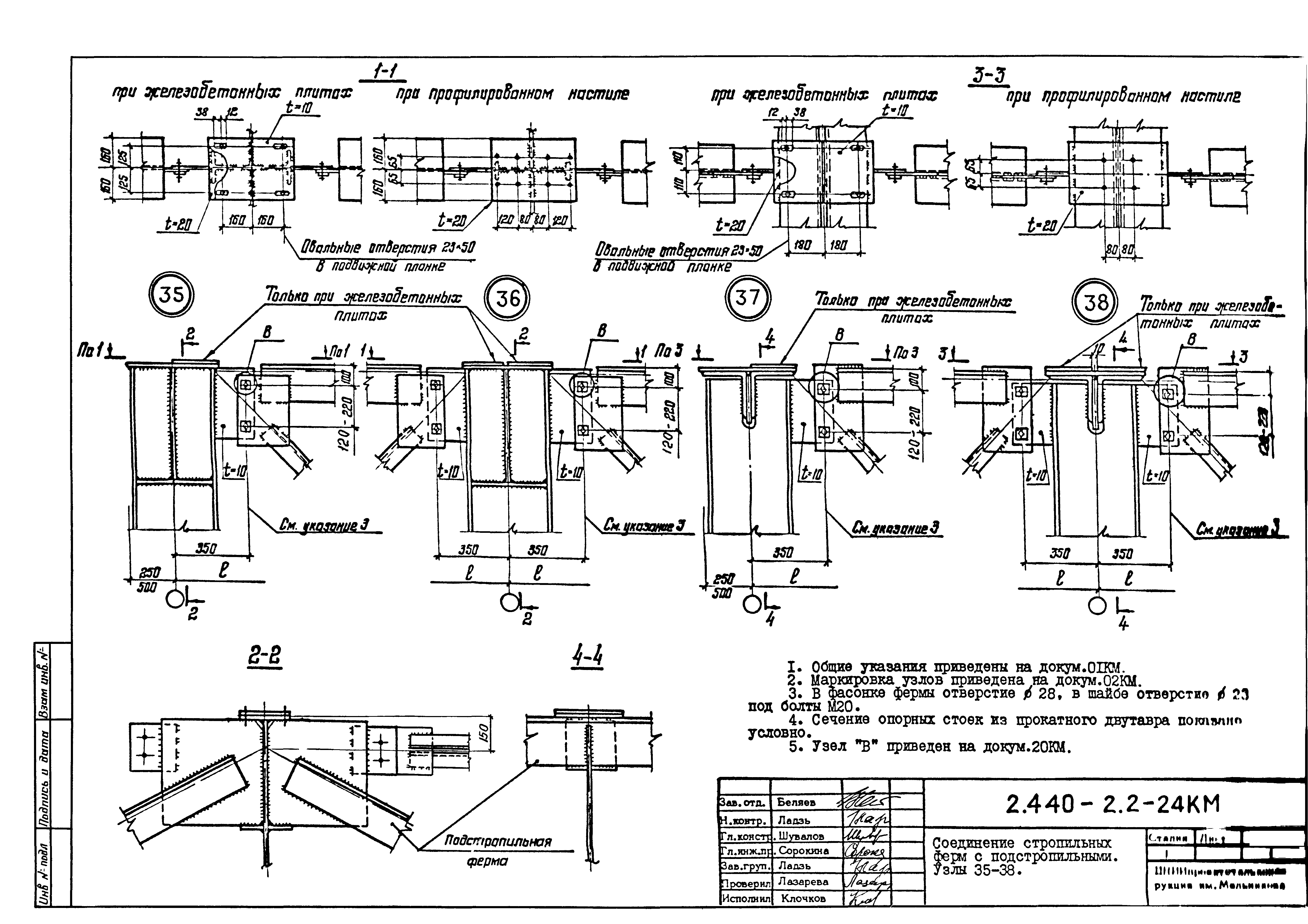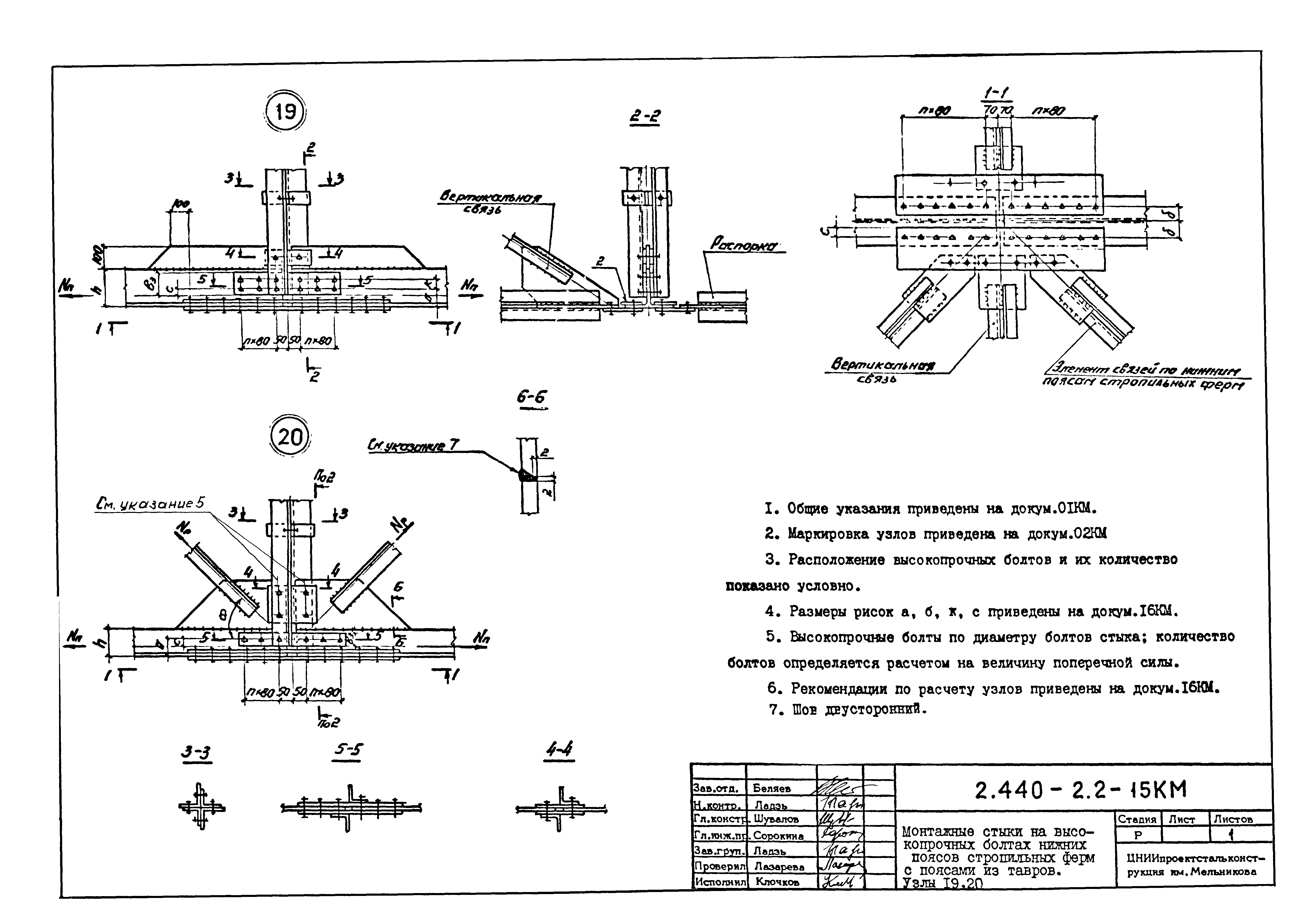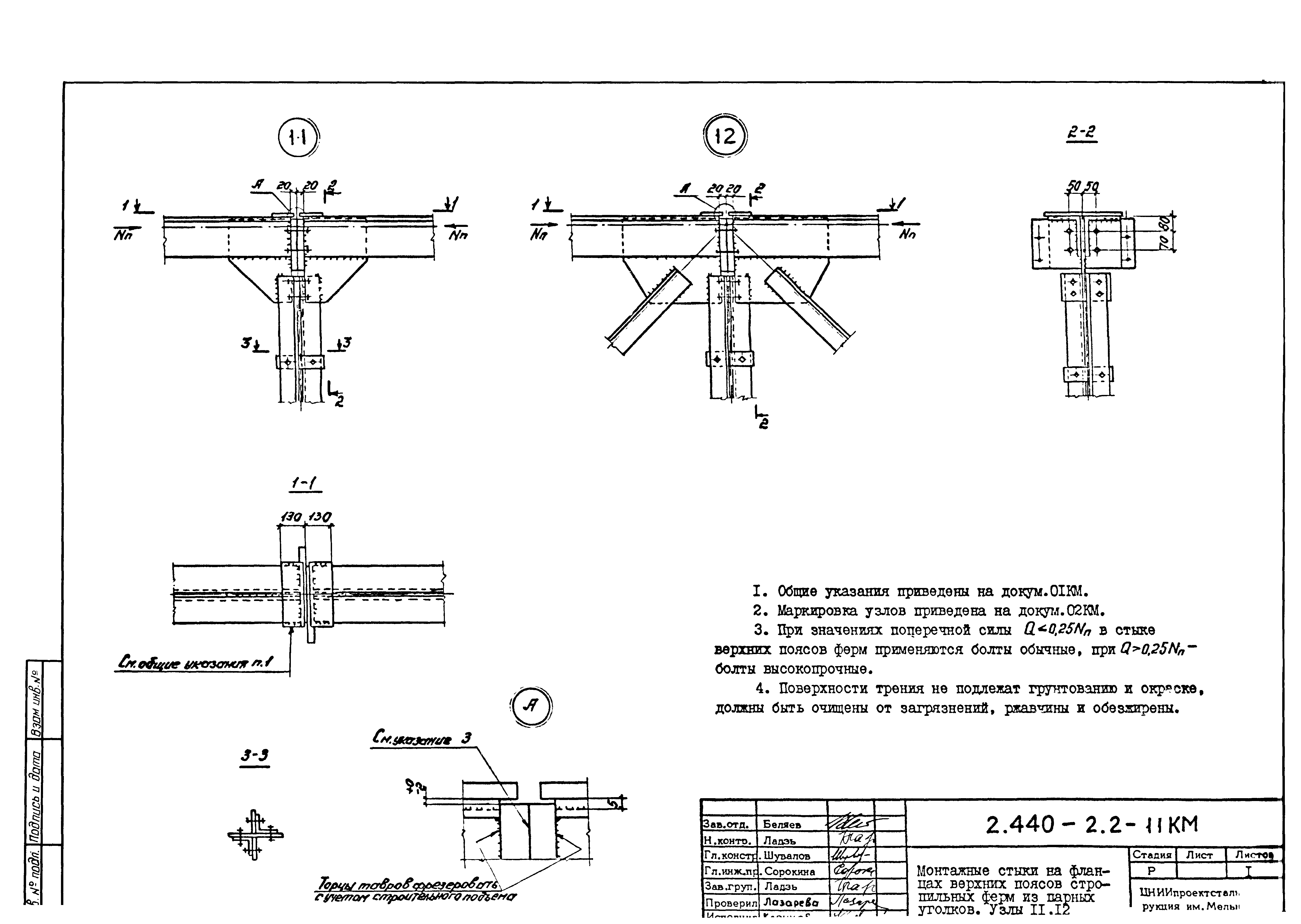 | Оглавление: | 2.440-2.2-00П3КМ Пояснительная записка 2.440-2.2-01КМ Общие указания 2.440-2.2-02КМ Маркировка узлов стропильных и подстропильных ферм 2.440-2.2-03КМ Заводские узлы верхних поясов стропильных ферм из парных уголков. Узлы 1, 2 2.440-2.2-04КМ Рекомендации по расчету узлов 1, 2 2.440-2.2-05КМ Монтажные стыки на сварке стропильных ферм из парных уголков. Узлы 3, 4 2.440-2.2-06КМ Монтажные стыки на сварке стропильных ферм из парных уголков. Узлы 5, 6 2.440-2.2-07КМ Рекомендации по расчету узлов 3-6 2.440-2.2-08КМ Монтажные стыки на высокопрочных болтах стропильных ферм из парных уголков. Узлы 7, 8 2.440-2.2-09КМ Монтажные стыки на высокопрочных болтах стропильных ферм из парных уголков. Узлы 9, 10 2.440-2.2-10КМ Рекомендации по расчету узлов 7-10 2.440-2.2-11КМ Монтажные стыки на фланцах верхних поясов стропильных ферм из парных уголков. Узлы 11, 12 2.440-2.2-12КМ Монтажные стыки на фланцах нижних поясов стропильных ферм из парных уголков. Узлы 13, 14 2.440-2.2-13КМ Монтажные стыки на фланцах верхних поясов стропильных ферм с поясами из тавров. Узлы 15, 16 2.440-2.2-14КМ Монтажные стыки на фланцах нижних поясов стропильных ферм с поясами из тавров. Узлы 17, 18 2.440-2.2-15КМ Монтажные стыки на высокопрочных болтах нижних поясов стропильных ферм с поясами из тавров. Узлы 19, 20 2.440-2.2-16КМ Рекомендации по расчету узлов 19, 20 2.440-2.2-17КМ Монтажные стыки на сварке нижних поясов стропильных ферм с поясами из тавров. Узлы 21, 22 2.440-2.2-18КМ Рекомендации по расчету узлов 21, 22 2.440-2.2-19КМ Крепление связей по нижним поясам стропильных ферм. Узел 23 2.440-2.2-20КМ Соединение стропильных ферм с опорными стойками. Узлы 24, 25 2.440-2.2-21КМ Соединение стропильных ферм с опорными стойками и узлы стропильных ферм. Узлы 26-28 2.440-2.2-22КМ Соединение стропильных и подстропильных ферм с опорными стойками. Узлы 29-31 2.440-2.2-23КМ Соединение стропильных и подстропильных ферм с опорными стойками. Узлы 32-34 2.440-2.2-24КМ Соединение стропильных ферм с подстропильными. Узлы 35-38 2.440-2.2-25КМ Опирание стропильных ферм на колонны крайнего ряда. Узлы 39, 40 2.440-2.2-26КМ Опирание стропильной фермы на колонну крайнего ряда. Узел 41 2.440-2.2-27КМ Опирание стропильных ферм на колонны среднего ряда. Узлы 42, 43 2.440-2.2-28КМ Опирание стропильных и подстропильных ферм на колонны крайнего ряда. Узлы 44, 45 2.440-2.2-29КМ Опирание стропильных и подстропильных ферм на колонну крайнего ряда. Узел 46 2.440-2.2-30КМ Опирание стропильных и подстропильных ферм на колонну среднего ряда. Узел 47 2.440-2.2-31КМ Опирание стропильных и подстропильных ферм на колонну среднего ряда. Узел 48 2.440-2.2-32КМ Рекомендации по расчету узлов 39-48 2.440-2.2-33КМ Опирание стропильных ферм с поясами из широкополочных тавров на подстропильные фермы Узлы 49, 50 2.440-2.2-34КМ Опирание стропильных ферм из парных уголков на подстропильные фермы Узлы 51, 52 2.440-2.2-35КМ Рекомендации по расчету узлов 49-52 и болтов для крепления опорной стойки к колонне 2.440-2.2-36КМ Опирание стропильных ферм на железобетонные колонны. Узлы 53-55 2.440-2.2-37КМ Опирание стропильных ферм на железобетонные колонны. Узлы 56, 57 2.440-2.2-38КМ Узел опирания стропильных и подстропильных ферм на колонну - вариант 2 2.440-2.2-39КМ Рамное соединение стропильных ферм с поясами из широкополочных двутавров с колоннами. Узлы 58, 59 2.440-2.2-40КМ Рамное соединение стропильных ферм с поясами из широкополочных двутавров с колоннами. Узлы 60, 61 2.440-2.2-41КМ Рамное соединение стропильных ферм с поясами из широкополочных тавров с колоннами. Узлы 62, 63 2.440-2.2-42КМ Рекомендации