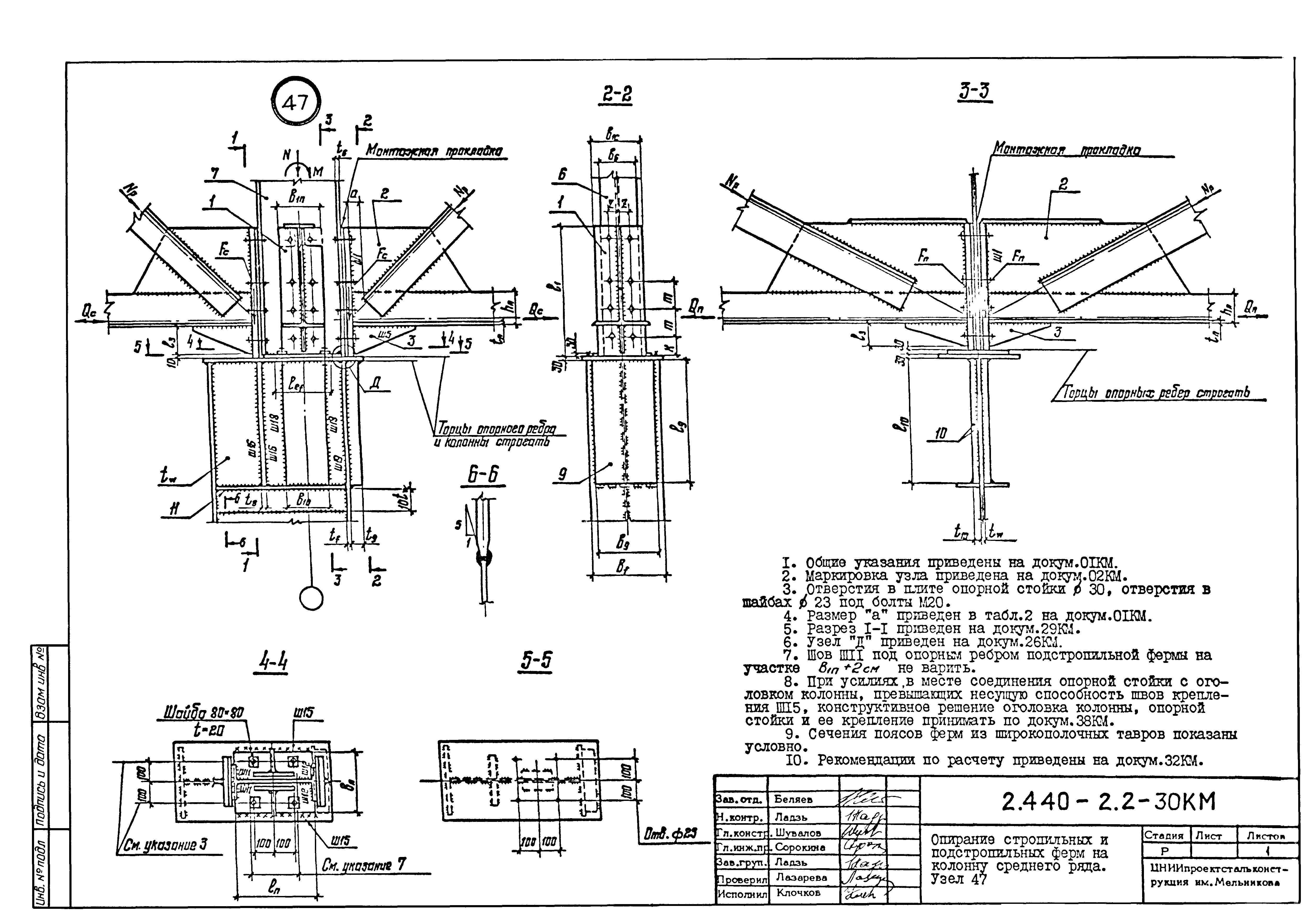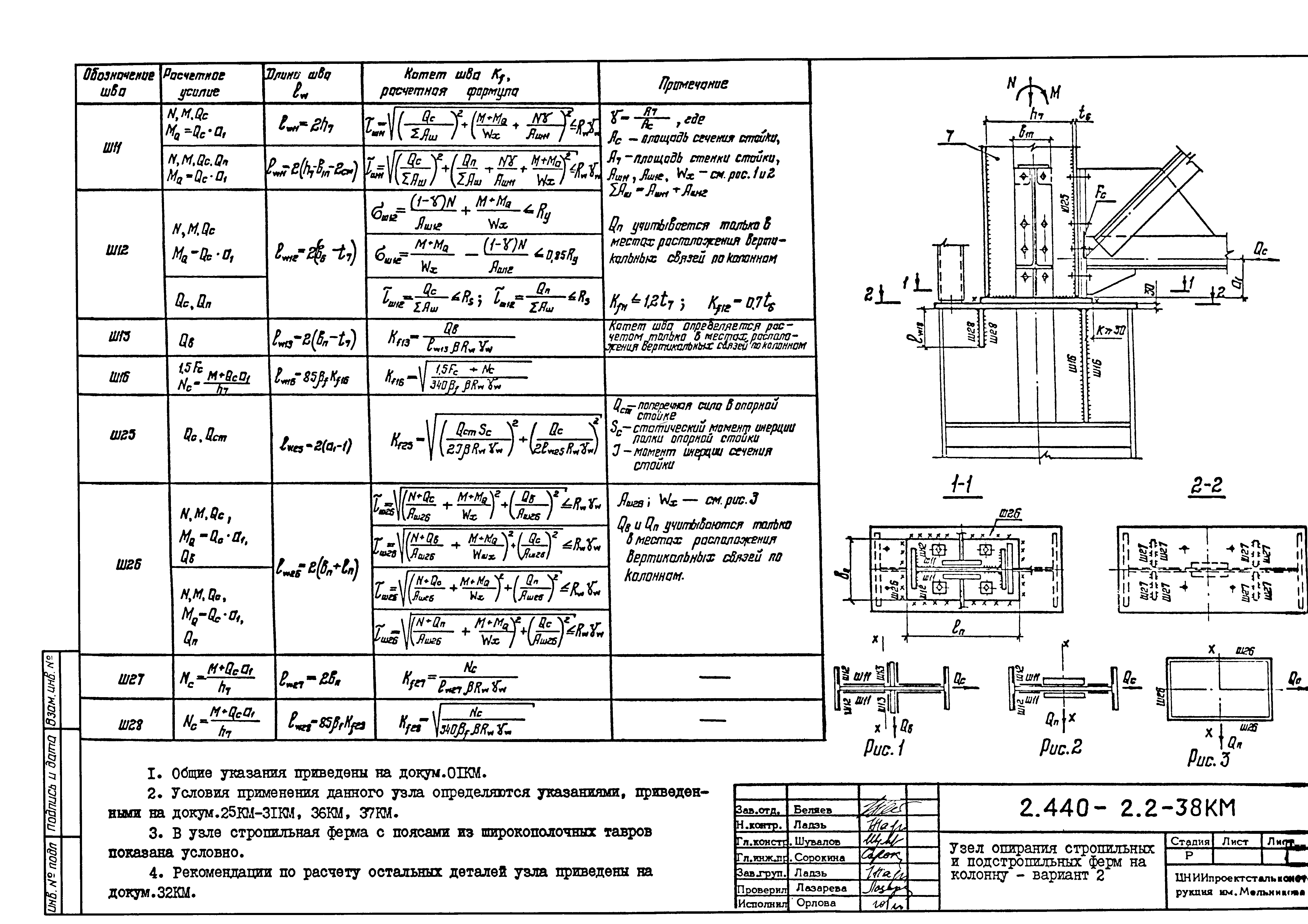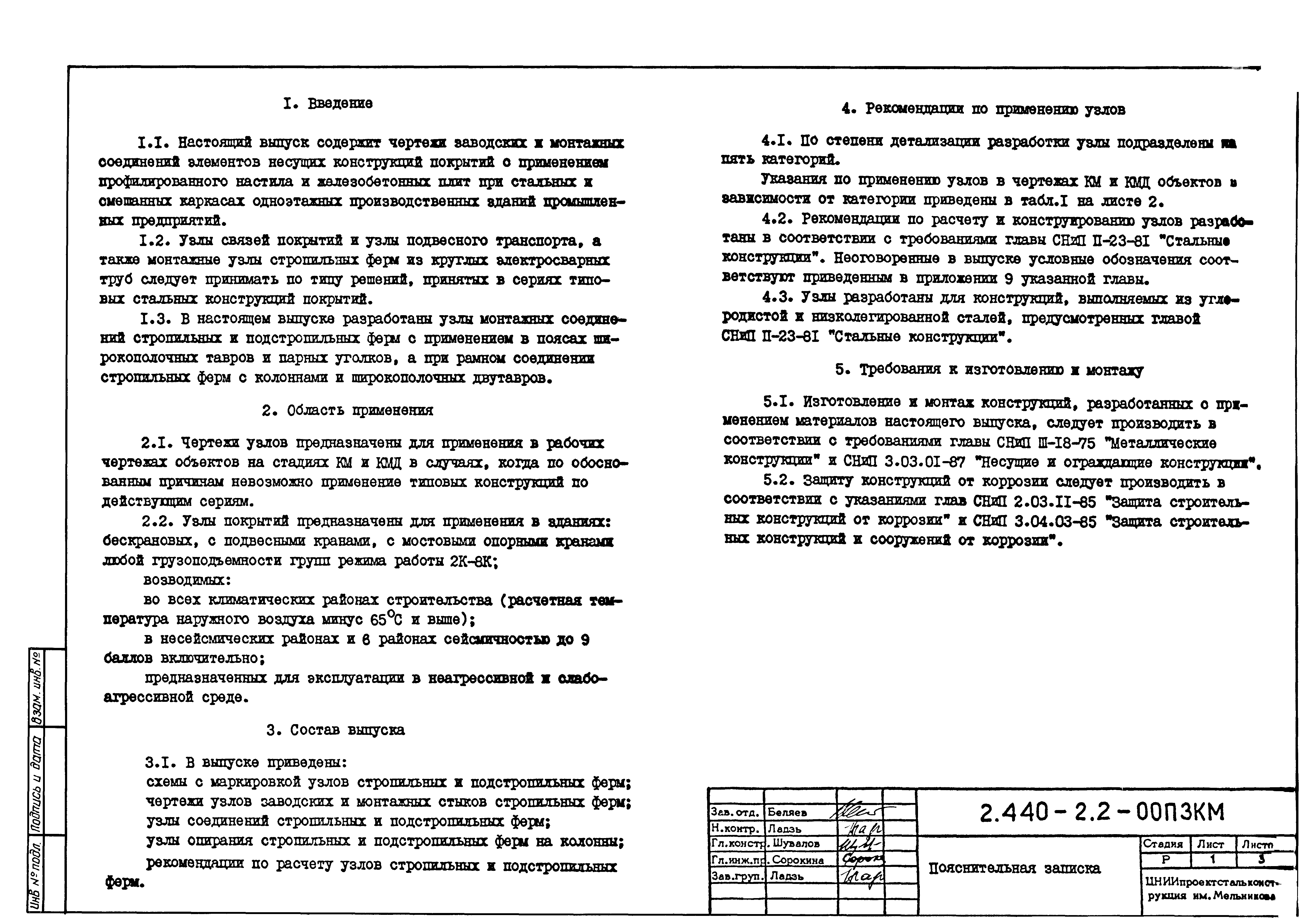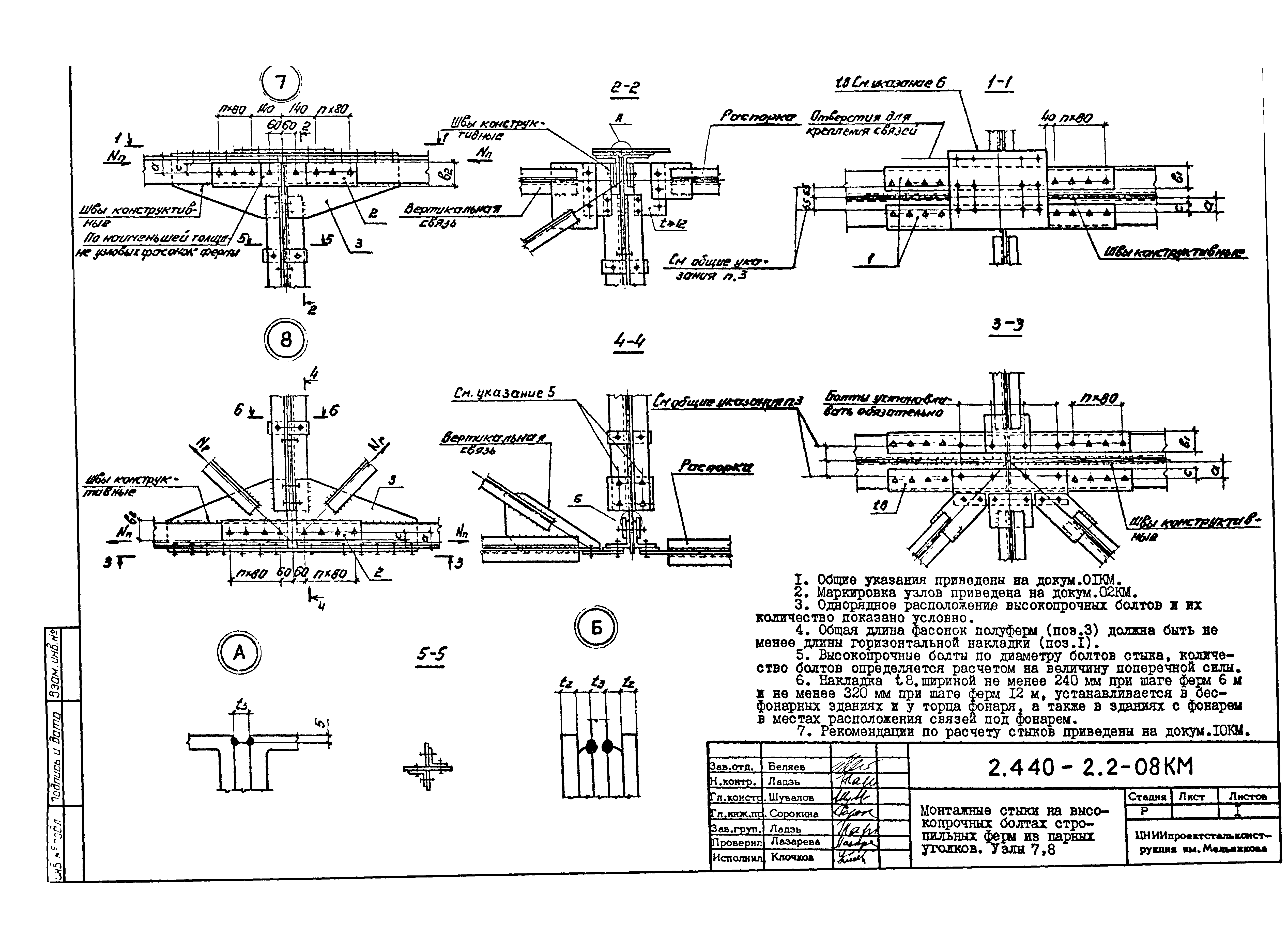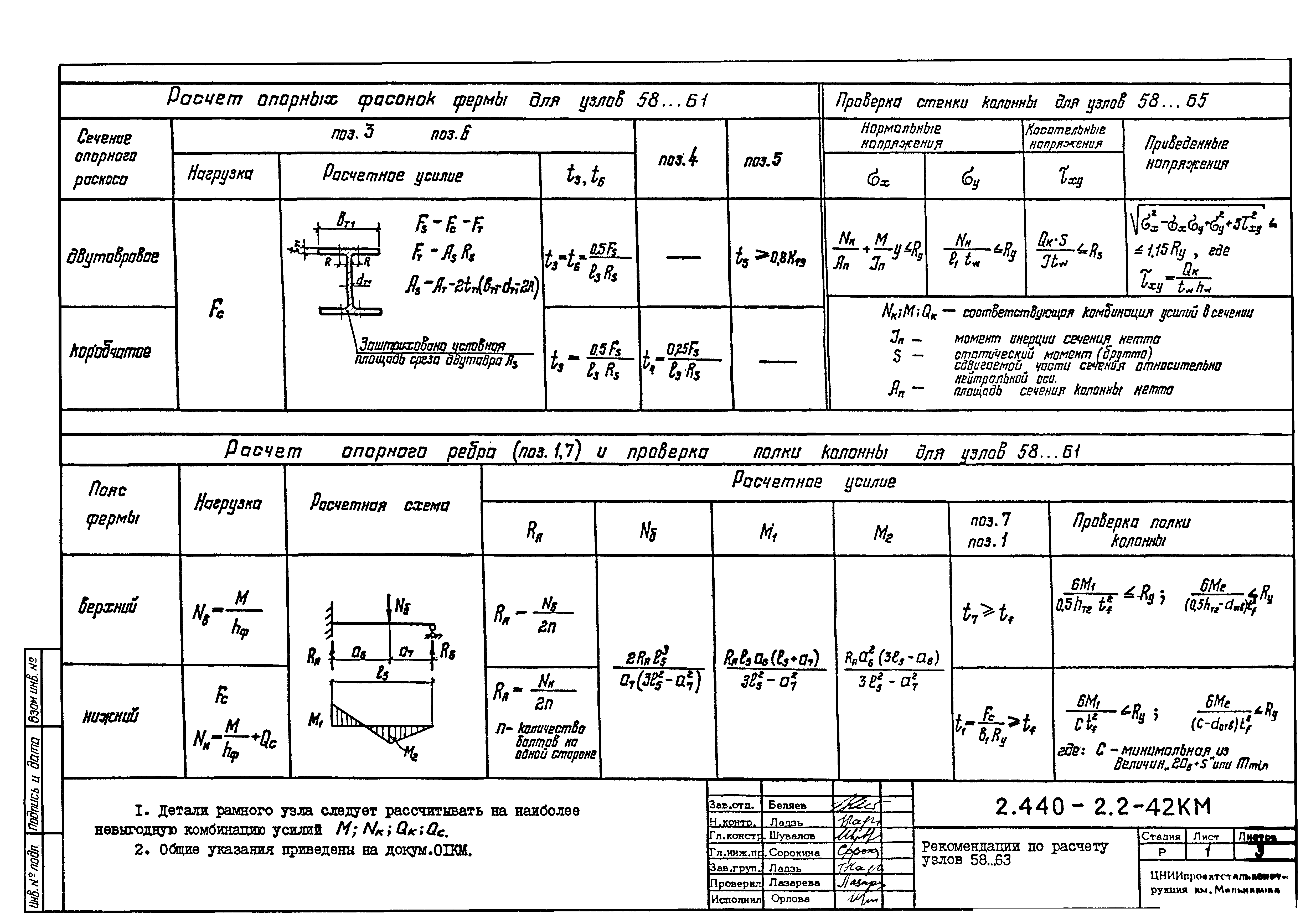 | Оглавление: | 2.440-2.2-00П3КМ Пояснительная записка 2.440-2.2-01КМ Общие указания 2.440-2.2-02КМ Маркировка узлов стропильных и подстропильных ферм 2.440-2.2-03КМ Заводские узлы верхних поясов стропильных ферм из парных уголков. Узлы 1, 2 2.440-2.2-04КМ Рекомендации по расчету узлов 1, 2 2.440-2.2-05КМ Монтажные стыки на сварке стропильных ферм из парных уголков. Узлы 3, 4 2.440-2.2-06КМ Монтажные стыки на сварке стропильных ферм из парных уголков. Узлы 5, 6 2.440-2.2-07КМ Рекомендации по расчету узлов 3-6 2.440-2.2-08КМ Монтажные стыки на высокопрочных болтах стропильных ферм из парных уголков. Узлы 7, 8 2.440-2.2-09КМ Монтажные стыки на высокопрочных болтах стропильных ферм из парных уголков. Узлы 9, 10 2.440-2.2-10КМ Рекомендации по расчету узлов 7-10 2.440-2.2-11КМ Монтажные стыки на фланцах верхних поясов стропильных ферм из парных уголков. Узлы 11, 12 2.440-2.2-12КМ Монтажные стыки на фланцах нижних поясов стропильных ферм из парных уголков. Узлы 13, 14 2.440-2.2-13КМ Монтажные стыки на фланцах верхних поясов стропильных ферм с поясами из тавров. Узлы 15, 16 2.440-2.2-14КМ Монтажные стыки на фланцах нижних поясов стропильных ферм с поясами из тавров. Узлы 17, 18 2.440-2.2-15КМ Монтажные стыки на высокопрочных болтах нижних поясов стропильных ферм с поясами из тавров. Узлы 19, 20 2.440-2.2-16КМ Рекомендации по расчету узлов 19, 20 2.440-2.2-17КМ Монтажные стыки на сварке нижних поясов стропильных ферм с поясами из тавров. Узлы 21, 22 2.440-2.2-18КМ Рекомендации по расчету узлов 21, 22 2.440-2.2-19КМ Крепление связей по нижним поясам стропильных ферм. Узел 23 2.440-2.2-20КМ Соединение стропильных ферм с опорными стойками. Узлы 24, 25 2.440-2.2-21КМ Соединение стропильных ферм с опорными стойками и узлы стропильных ферм. Узлы 26-28 2.440-2.2-22КМ Соединение стропильных и подстропильных ферм с опорными стойками. Узлы 29-31 2.440-2.2-23КМ Соединение стропильных и подстропильных ферм с опорными стойками. Узлы 32-34 2.440-2.2-24КМ Соединение стропильных ферм с подстропильными. Узлы 35-38 2.440-2.2-25КМ Опирание стропильных ферм на колонны крайнего ряда. Узлы 39, 40 2.440-2.2-26КМ Опирание стропильной фермы на колонну крайнего ряда. Узел 41 2.440-2.2-27КМ Опирание стропильных ферм на колонны среднего ряда. Узлы 42, 43 2.440-2.2-28КМ Опирание стропильных и подстропильных ферм на колонны крайнего ряда. Узлы 44, 45 2.440-2.2-29КМ Опирание стропильных и подстропильных ферм на колонну крайнего ряда. Узел 46 2.440-2.2-30КМ Опирание стропильных и подстропильных ферм на колонну среднего ряда. Узел 47 2.440-2.2-31КМ Опирание стропильных и подстропильных ферм на колонну среднего ряда. Узел 48 2.440-2.2-32КМ Рекомендации по расчету узлов 39-48 2.440-2.2-33КМ Опирание стропильных ферм с поясами из широкополочных тавров на подстропильные фермы Узлы 49, 50 2.440-2.2-34КМ Опирание стропильных ферм из парных уголков на подстропильные фермы Узлы 51, 52 2.440-2.2-35КМ Рекомендации по расчету узлов 49-52 и болтов для крепления опорной стойки к колонне 2.440-2.2-36КМ Опирание стропильных ферм на железобетонные колонны. Узлы 53-55 2.440-2.2-37КМ Опирание стропильных ферм на железобетонные колонны. Узлы 56, 57 2.440-2.2-38КМ Узел опирания стропильных и подстропильных ферм на колонну - вариант 2 2.440-2.2-39КМ Рамное соединение стропильных ферм с поясами из широкополочных двутавров с колоннами. Узлы 58, 59 2.440-2.2-40КМ Рамное соединение стропильных ферм с поясами из широкополочных двутавров с колоннами. Узлы 60, 61 2.440-2.2-41КМ Рамное соединение стропильных ферм с поясами из широкополочных тавров с колоннами. Узлы 62, 63 2.440-2.2-42КМ Рекомендации