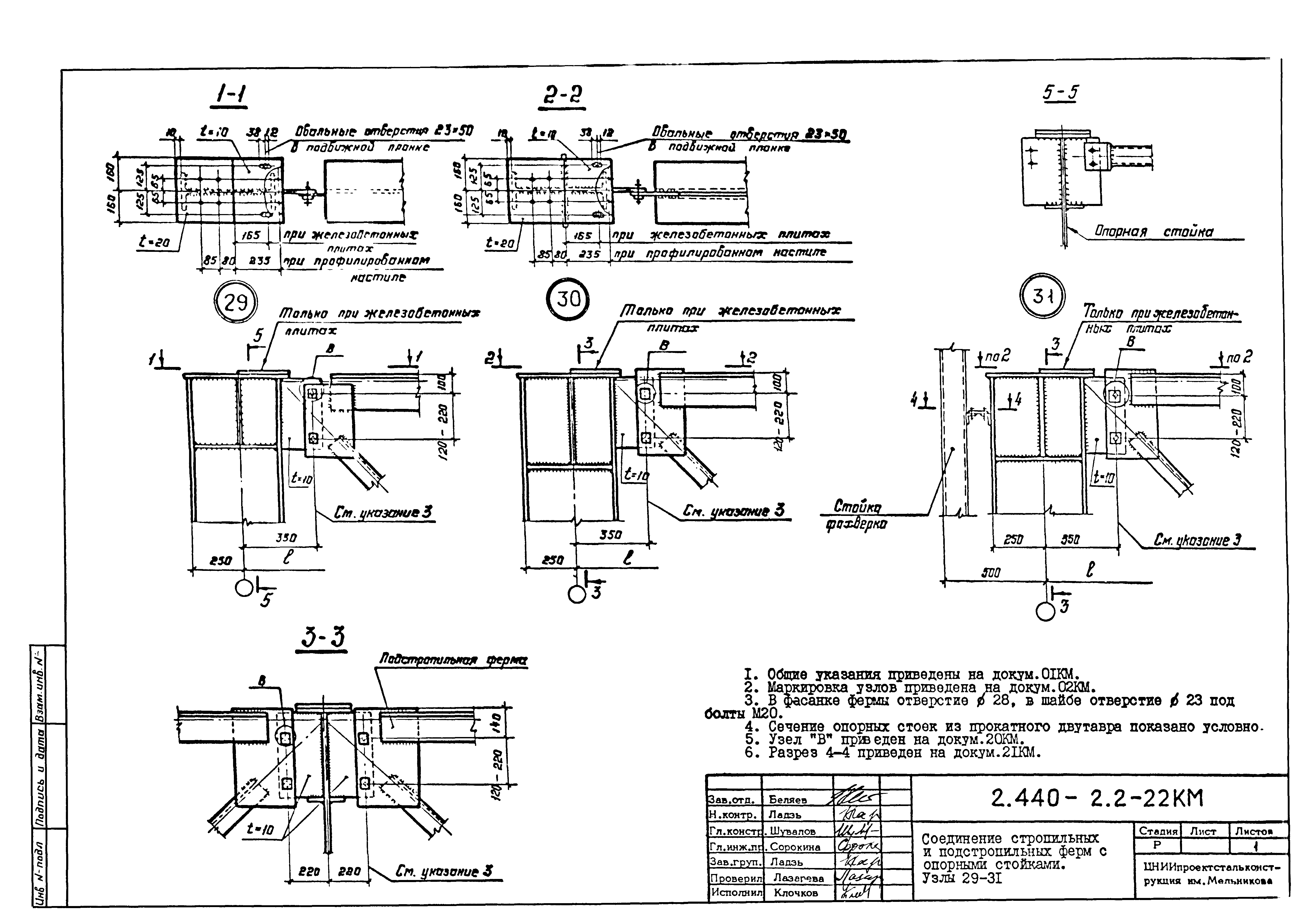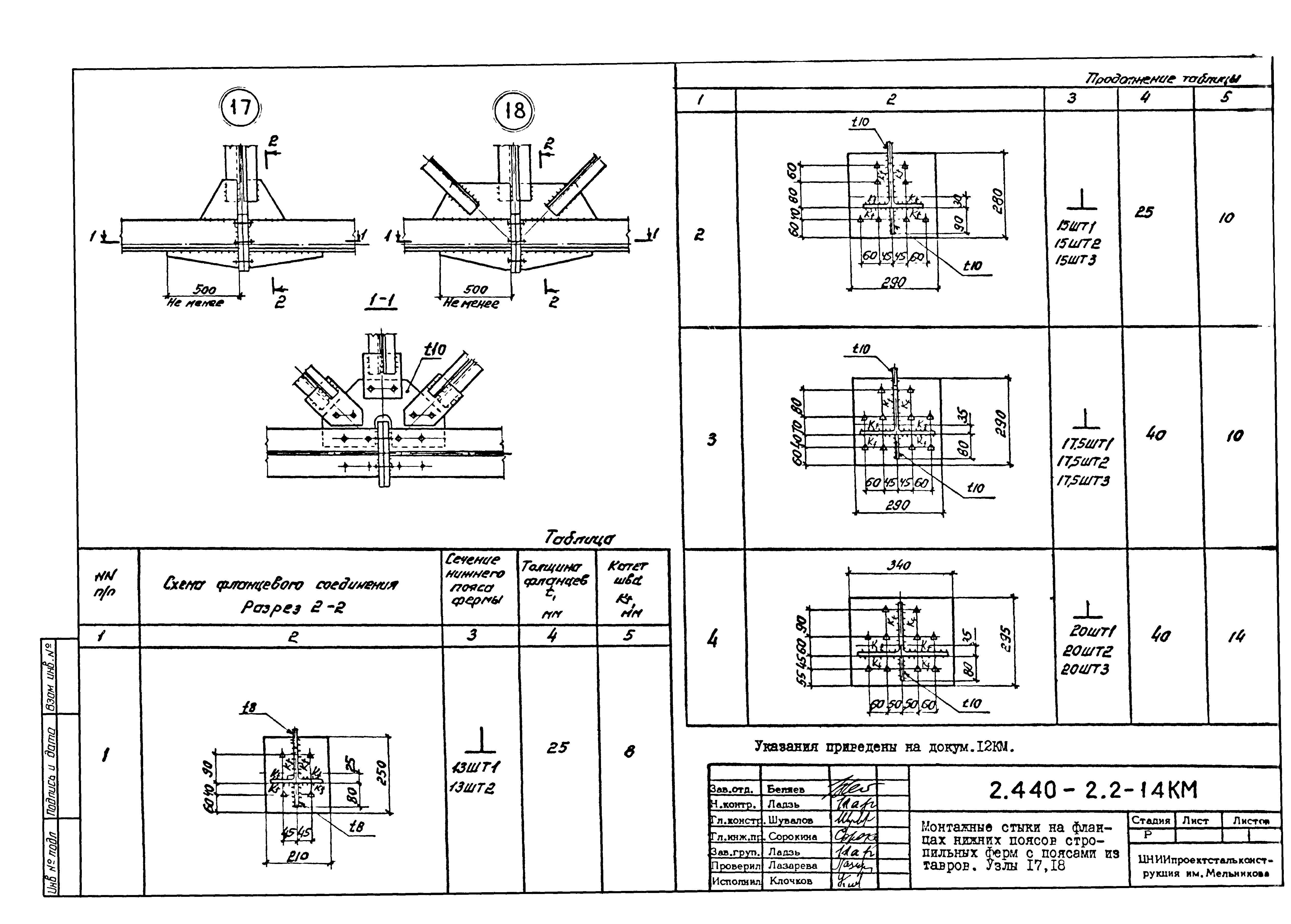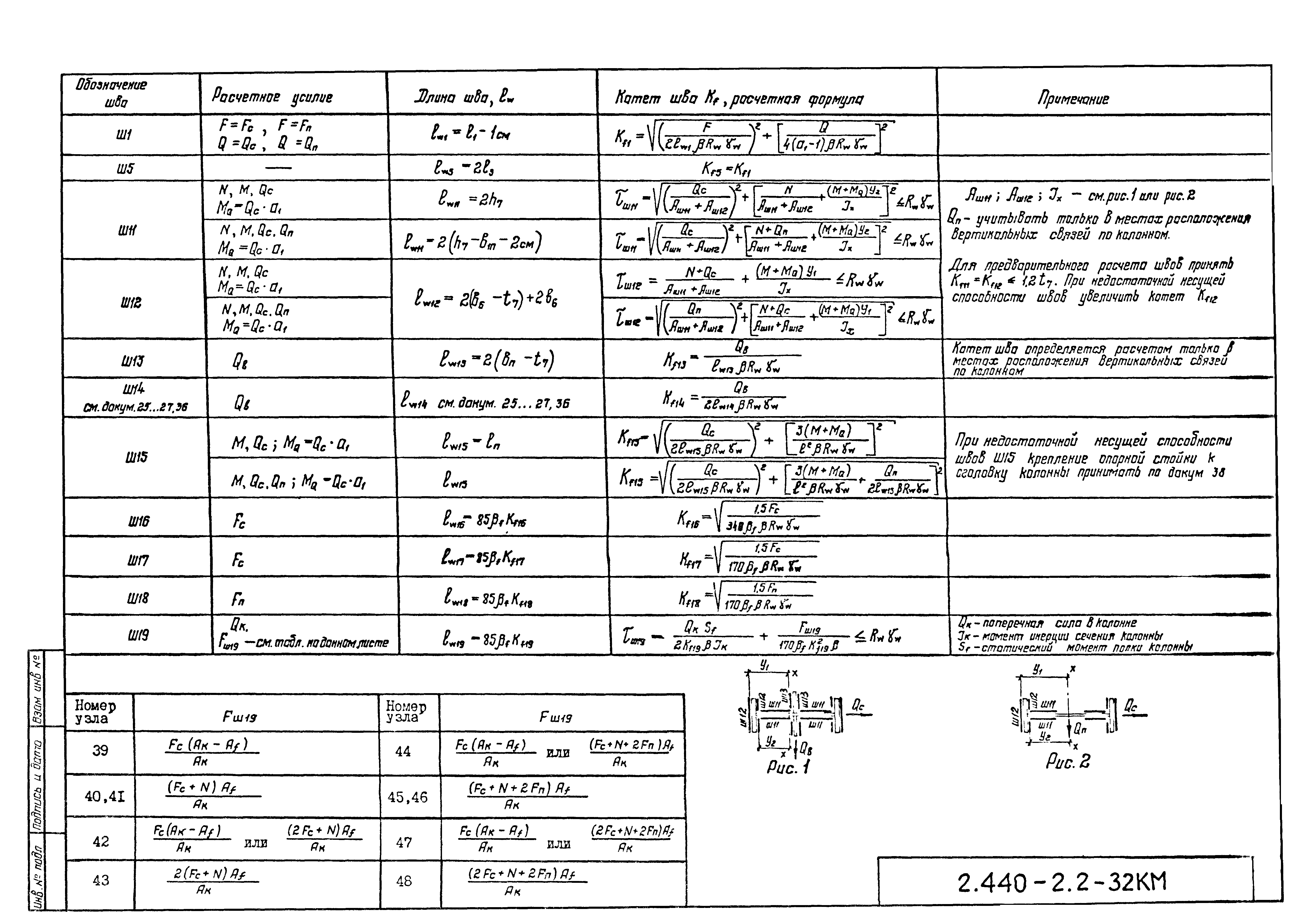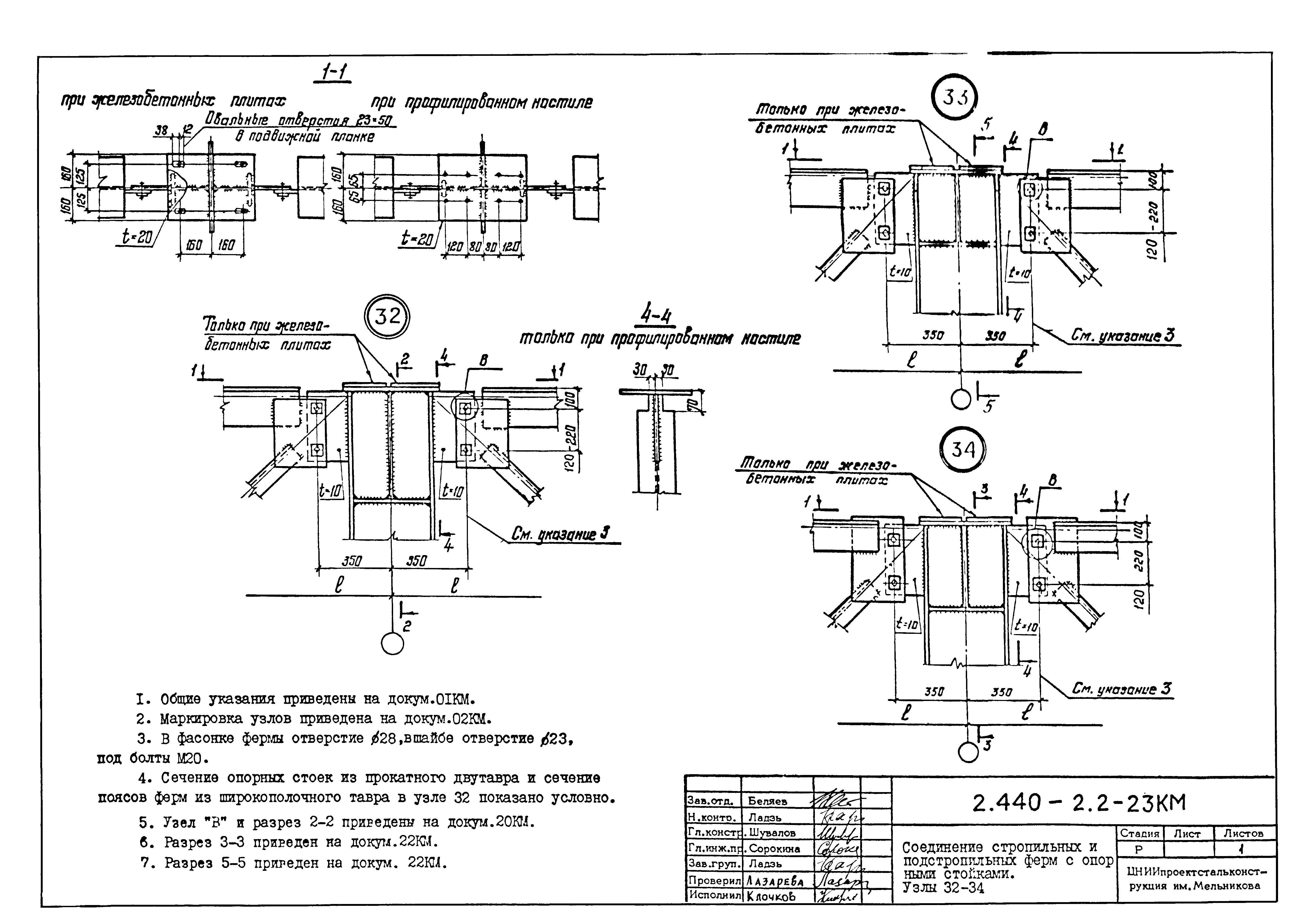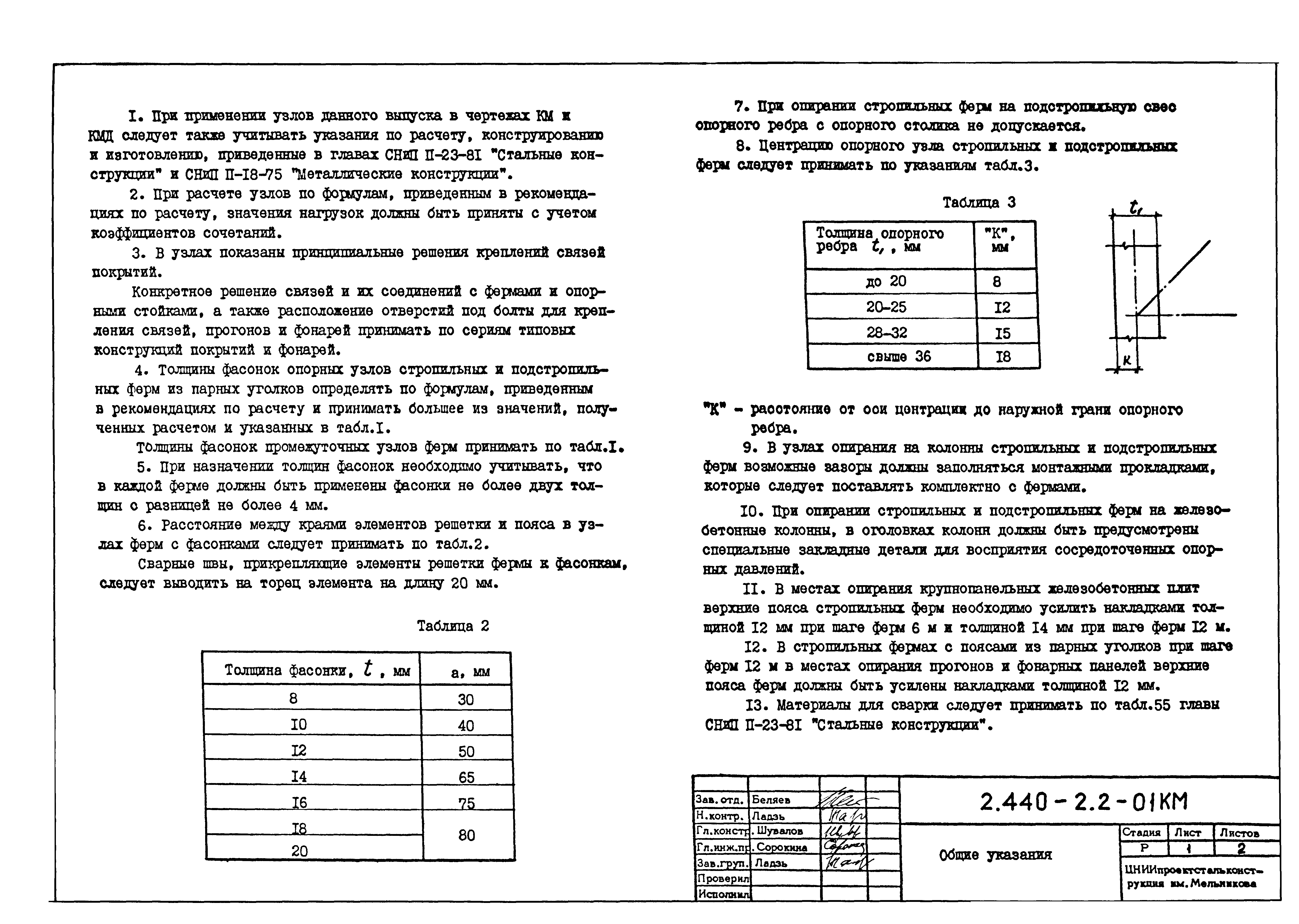 | Оглавление: | 2.440-2.2-00П3КМ Пояснительная записка 2.440-2.2-01КМ Общие указания 2.440-2.2-02КМ Маркировка узлов стропильных и подстропильных ферм 2.440-2.2-03КМ Заводские узлы верхних поясов стропильных ферм из парных уголков. Узлы 1, 2 2.440-2.2-04КМ Рекомендации по расчету узлов 1, 2 2.440-2.2-05КМ Монтажные стыки на сварке стропильных ферм из парных уголков. Узлы 3, 4 2.440-2.2-06КМ Монтажные стыки на сварке стропильных ферм из парных уголков. Узлы 5, 6 2.440-2.2-07КМ Рекомендации по расчету узлов 3-6 2.440-2.2-08КМ Монтажные стыки на высокопрочных болтах стропильных ферм из парных уголков. Узлы 7, 8 2.440-2.2-09КМ Монтажные стыки на высокопрочных болтах стропильных ферм из парных уголков. Узлы 9, 10 2.440-2.2-10КМ Рекомендации по расчету узлов 7-10 2.440-2.2-11КМ Монтажные стыки на фланцах верхних поясов стропильных ферм из парных уголков. Узлы 11, 12 2.440-2.2-12КМ Монтажные стыки на фланцах нижних поясов стропильных ферм из парных уголков. Узлы 13, 14 2.440-2.2-13КМ Монтажные стыки на фланцах верхних поясов стропильных ферм с поясами из тавров. Узлы 15, 16 2.440-2.2-14КМ Монтажные стыки на фланцах нижних поясов стропильных ферм с поясами из тавров. Узлы 17, 18 2.440-2.2-15КМ Монтажные стыки на высокопрочных болтах нижних поясов стропильных ферм с поясами из тавров. Узлы 19, 20 2.440-2.2-16КМ Рекомендации по расчету узлов 19, 20 2.440-2.2-17КМ Монтажные стыки на сварке нижних поясов стропильных ферм с поясами из тавров. Узлы 21, 22 2.440-2.2-18КМ Рекомендации по расчету узлов 21, 22 2.440-2.2-19КМ Крепление связей по нижним поясам стропильных ферм. Узел 23 2.440-2.2-20КМ Соединение стропильных ферм с опорными стойками. Узлы 24, 25 2.440-2.2-21КМ Соединение стропильных ферм с опорными стойками и узлы стропильных ферм. Узлы 26-28 2.440-2.2-22КМ Соединение стропильных и подстропильных ферм с опорными стойками. Узлы 29-31 2.440-2.2-23КМ Соединение стропильных и подстропильных ферм с опорными стойками. Узлы 32-34 2.440-2.2-24КМ Соединение стропильных ферм с подстропильными. Узлы 35-38 2.440-2.2-25КМ Опирание стропильных ферм на колонны крайнего ряда. Узлы 39, 40 2.440-2.2-26КМ Опирание стропильной фермы на колонну крайнего ряда. Узел 41 2.440-2.2-27КМ Опирание стропильных ферм на колонны среднего ряда. Узлы 42, 43 2.440-2.2-28КМ Опирание стропильных и подстропильных ферм на колонны крайнего ряда. Узлы 44, 45 2.440-2.2-29КМ Опирание стропильных и подстропильных ферм на колонну крайнего ряда. Узел 46 2.440-2.2-30КМ Опирание стропильных и подстропильных ферм на колонну среднего ряда. Узел 47 2.440-2.2-31КМ Опирание стропильных и подстропильных ферм на колонну среднего ряда. Узел 48 2.440-2.2-32КМ Рекомендации по расчету узлов 39-48 2.440-2.2-33КМ Опирание стропильных ферм с поясами из широкополочных тавров на подстропильные фермы Узлы 49, 50 2.440-2.2-34КМ Опирание стропильных ферм из парных уголков на подстропильные фермы Узлы 51, 52 2.440-2.2-35КМ Рекомендации по расчету узлов 49-52 и болтов для крепления опорной стойки к колонне 2.440-2.2-36КМ Опирание стропильных ферм на железобетонные колонны. Узлы 53-55 2.440-2.2-37КМ Опирание стропильных ферм на железобетонные колонны. Узлы 56, 57 2.440-2.2-38КМ Узел опирания стропильных и подстропильных ферм на колонну - вариант 2 2.440-2.2-39КМ Рамное соединение стропильных ферм с поясами из широкополочных двутавров с колоннами. Узлы 58, 59 2.440-2.2-40КМ Рамное соединение стропильных ферм с поясами из широкополочных двутавров с колоннами. Узлы 60, 61 2.440-2.2-41КМ Рамное соединение стропильных ферм с поясами из широкополочных тавров с колоннами. Узлы 62, 63 2.440-2.2-42КМ Рекомендации