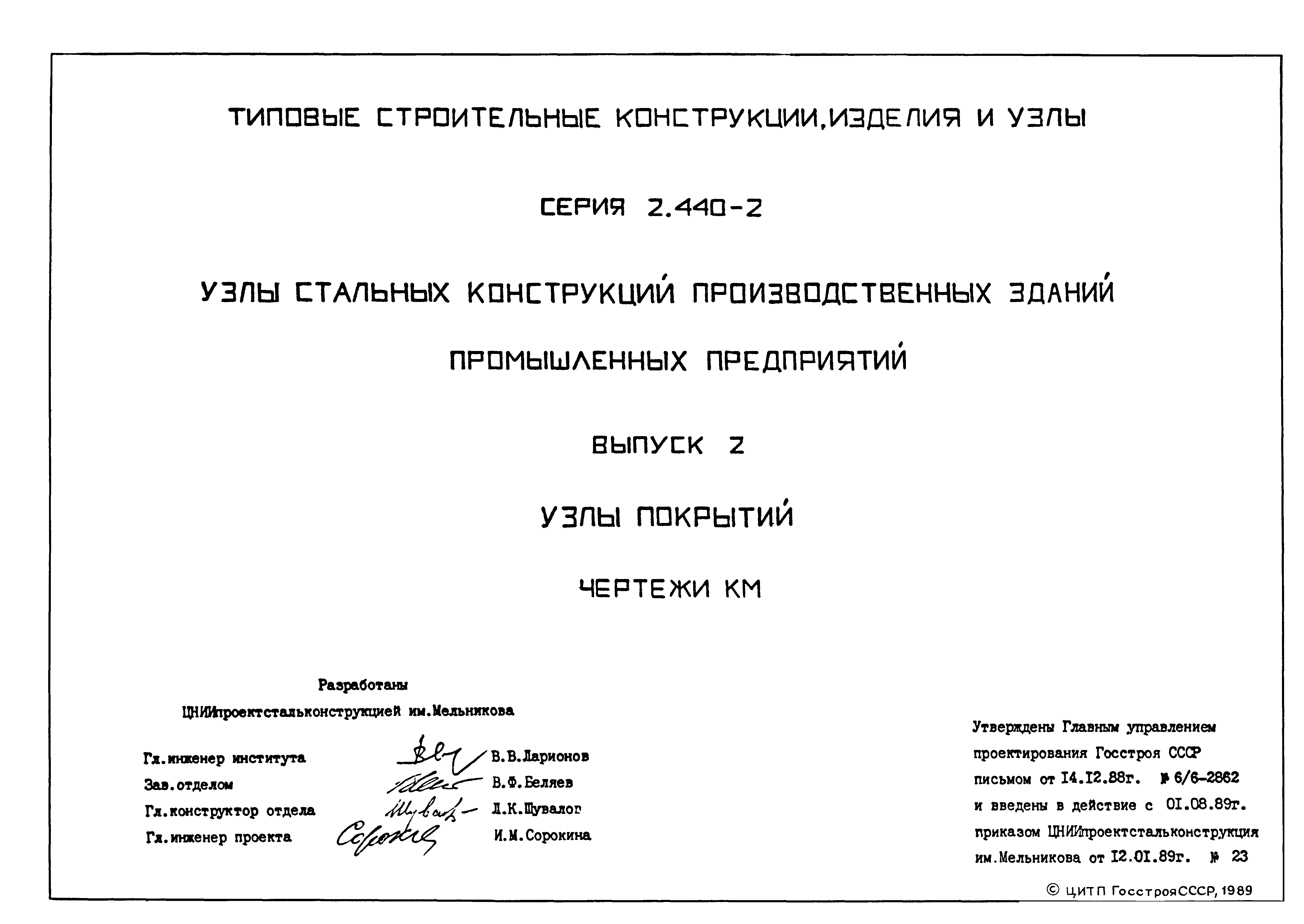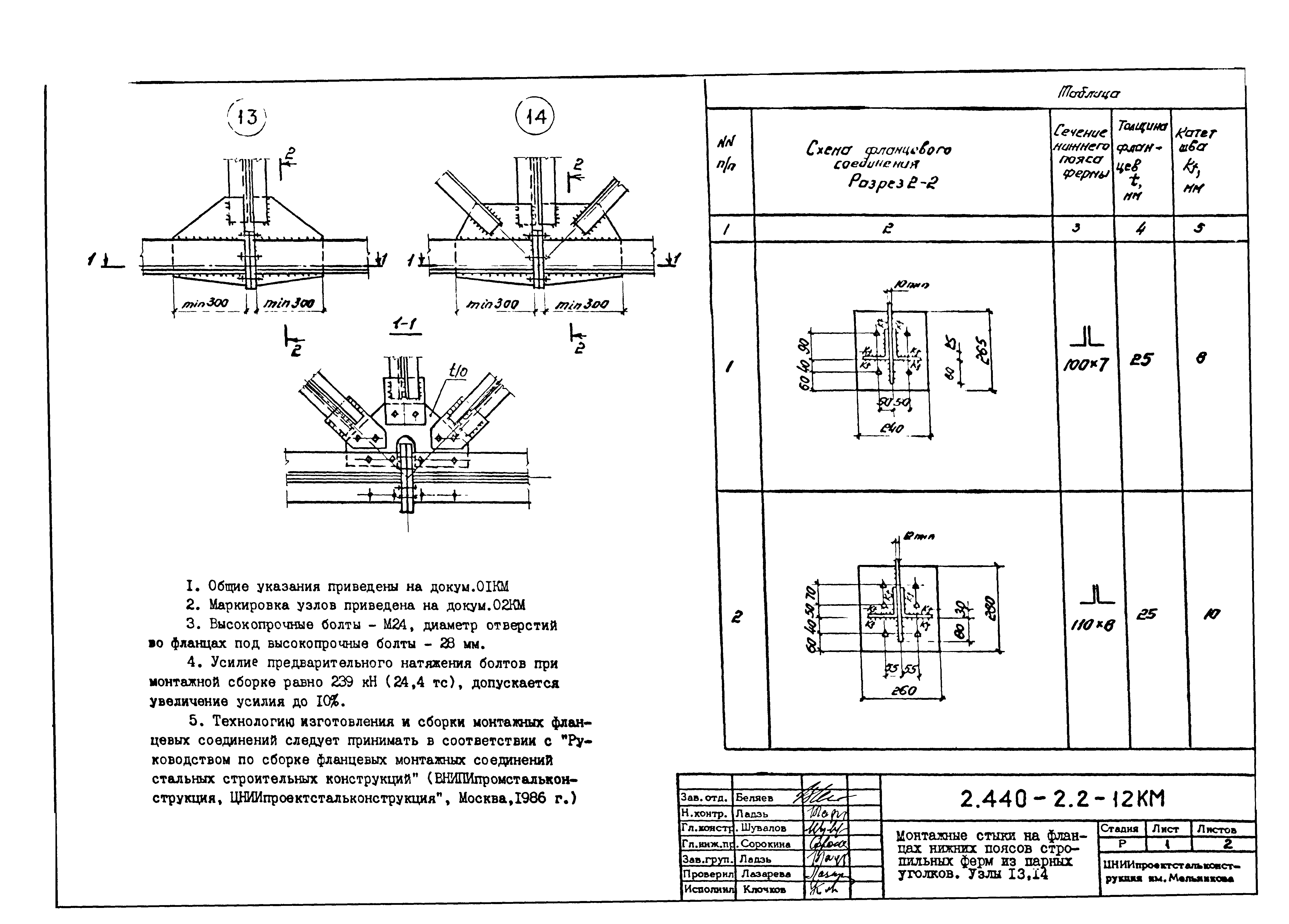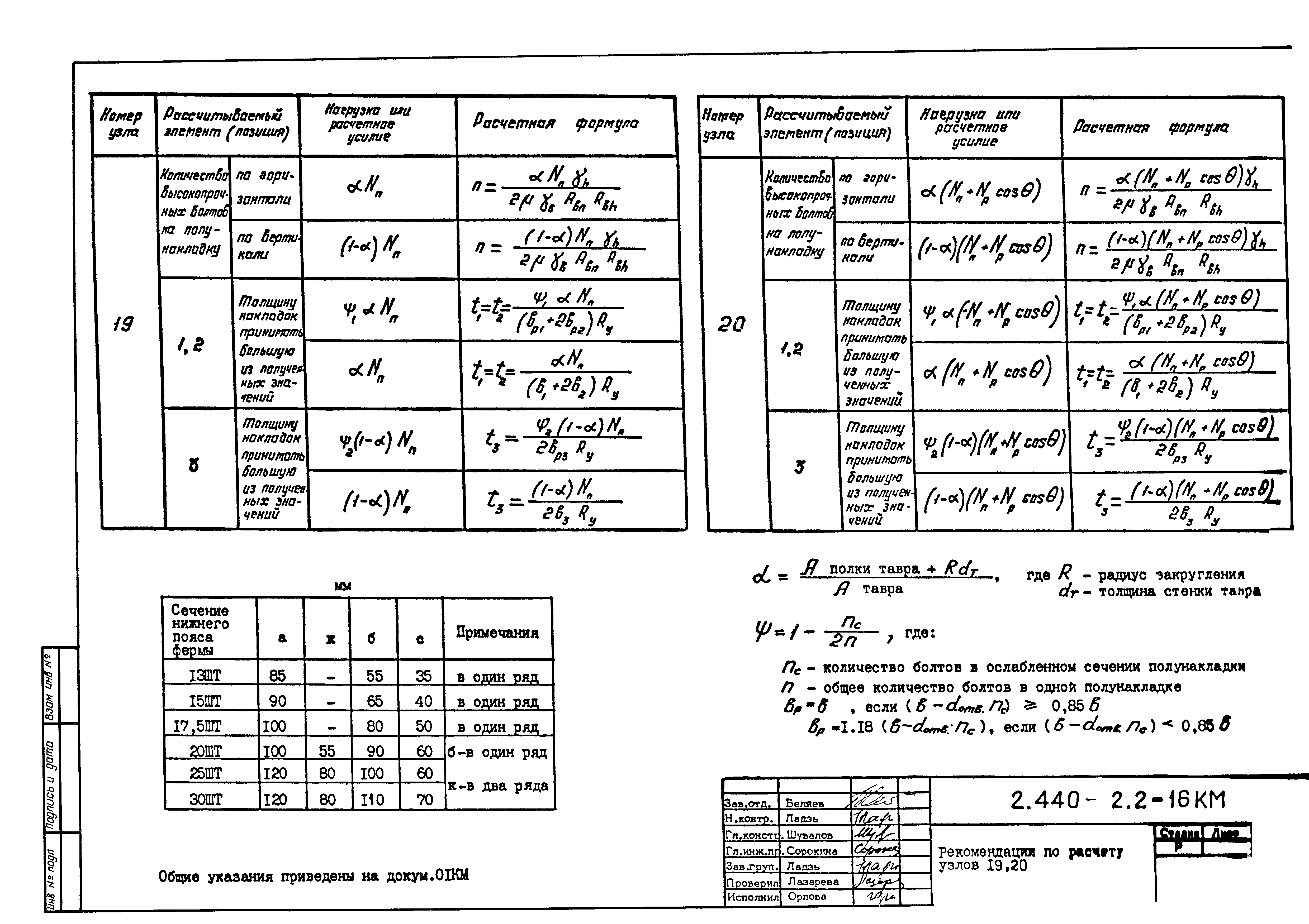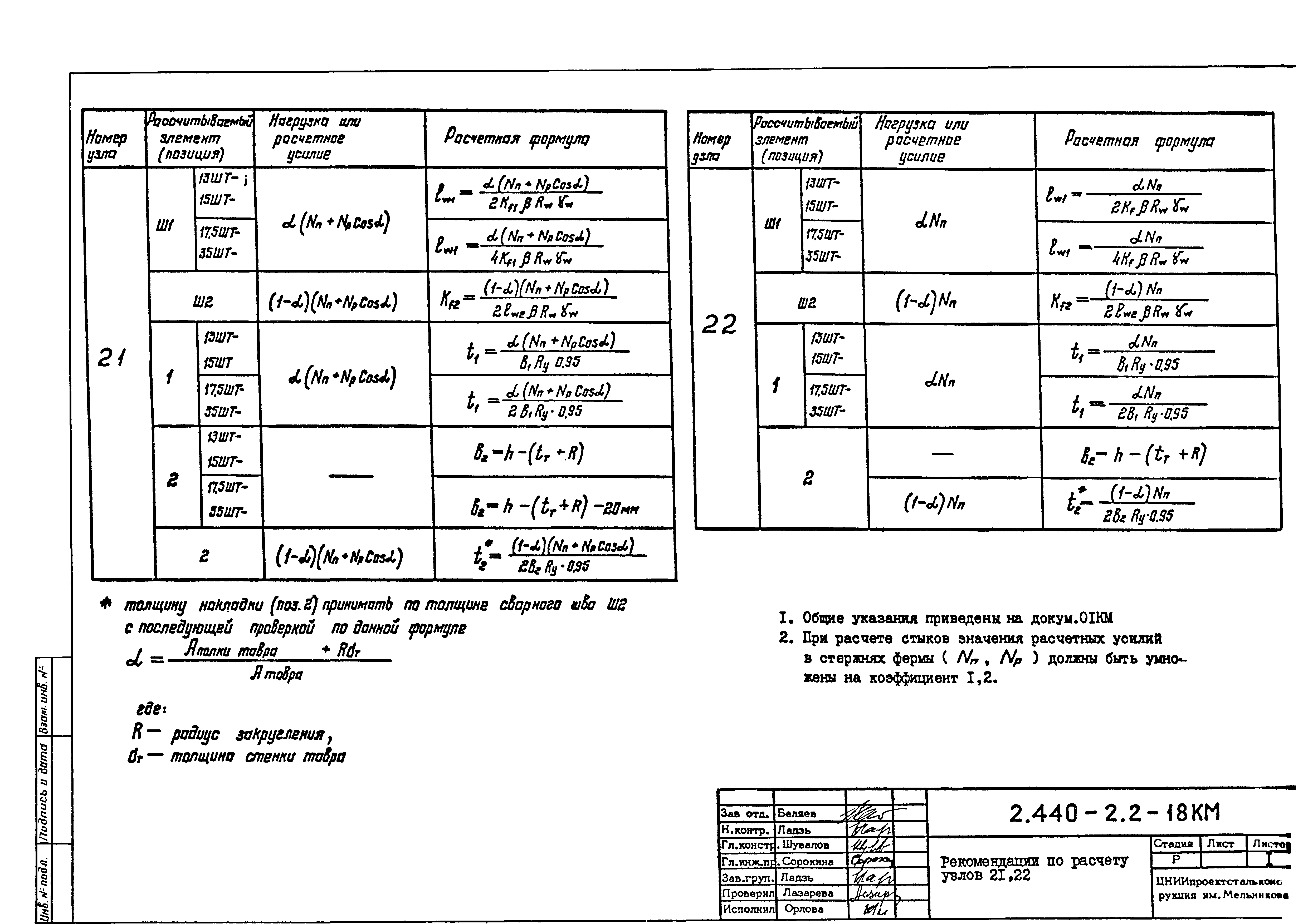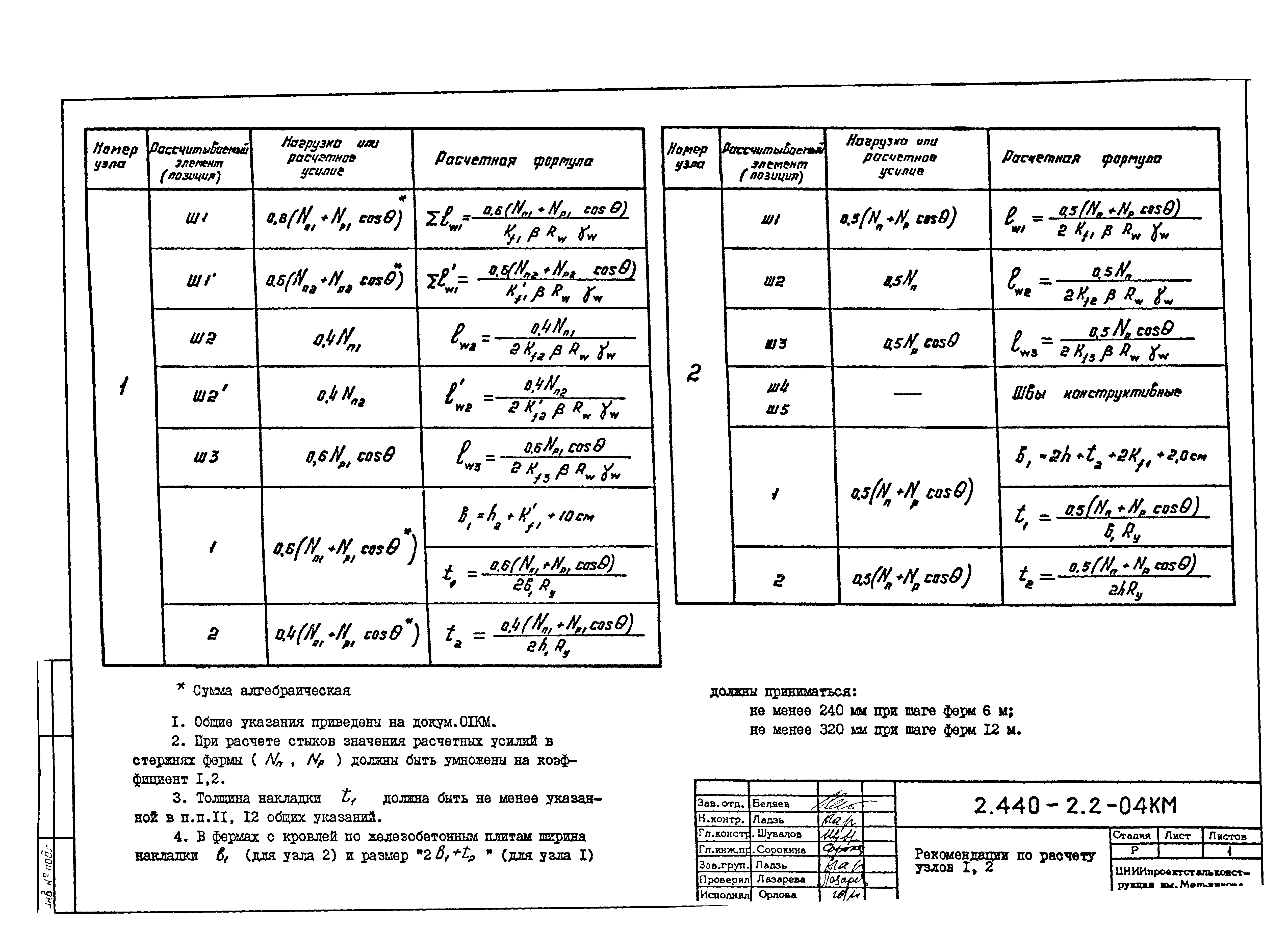 | Оглавление: | 2.440-2.2-00П3КМ Пояснительная записка 2.440-2.2-01КМ Общие указания 2.440-2.2-02КМ Маркировка узлов стропильных и подстропильных ферм 2.440-2.2-03КМ Заводские узлы верхних поясов стропильных ферм из парных уголков. Узлы 1, 2 2.440-2.2-04КМ Рекомендации по расчету узлов 1, 2 2.440-2.2-05КМ Монтажные стыки на сварке стропильных ферм из парных уголков. Узлы 3, 4 2.440-2.2-06КМ Монтажные стыки на сварке стропильных ферм из парных уголков. Узлы 5, 6 2.440-2.2-07КМ Рекомендации по расчету узлов 3-6 2.440-2.2-08КМ Монтажные стыки на высокопрочных болтах стропильных ферм из парных уголков. Узлы 7, 8 2.440-2.2-09КМ Монтажные стыки на высокопрочных болтах стропильных ферм из парных уголков. Узлы 9, 10 2.440-2.2-10КМ Рекомендации по расчету узлов 7-10 2.440-2.2-11КМ Монтажные стыки на фланцах верхних поясов стропильных ферм из парных уголков. Узлы 11, 12 2.440-2.2-12КМ Монтажные стыки на фланцах нижних поясов стропильных ферм из парных уголков. Узлы 13, 14 2.440-2.2-13КМ Монтажные стыки на фланцах верхних поясов стропильных ферм с поясами из тавров. Узлы 15, 16 2.440-2.2-14КМ Монтажные стыки на фланцах нижних поясов стропильных ферм с поясами из тавров. Узлы 17, 18 2.440-2.2-15КМ Монтажные стыки на высокопрочных болтах нижних поясов стропильных ферм с поясами из тавров. Узлы 19, 20 2.440-2.2-16КМ Рекомендации по расчету узлов 19, 20 2.440-2.2-17КМ Монтажные стыки на сварке нижних поясов стропильных ферм с поясами из тавров. Узлы 21, 22 2.440-2.2-18КМ Рекомендации по расчету узлов 21, 22 2.440-2.2-19КМ Крепление связей по нижним поясам стропильных ферм. Узел 23 2.440-2.2-20КМ Соединение стропильных ферм с опорными стойками. Узлы 24, 25 2.440-2.2-21КМ Соединение стропильных ферм с опорными стойками и узлы стропильных ферм. Узлы 26-28 2.440-2.2-22КМ Соединение стропильных и подстропильных ферм с опорными стойками. Узлы 29-31 2.440-2.2-23КМ Соединение стропильных и подстропильных ферм с опорными стойками. Узлы 32-34 2.440-2.2-24КМ Соединение стропильных ферм с подстропильными. Узлы 35-38 2.440-2.2-25КМ Опирание стропильных ферм на колонны крайнего ряда. Узлы 39, 40 2.440-2.2-26КМ Опирание стропильной фермы на колонну крайнего ряда. Узел 41 2.440-2.2-27КМ Опирание стропильных ферм на колонны среднего ряда. Узлы 42, 43 2.440-2.2-28КМ Опирание стропильных и подстропильных ферм на колонны крайнего ряда. Узлы 44, 45 2.440-2.2-29КМ Опирание стропильных и подстропильных ферм на колонну крайнего ряда. Узел 46 2.440-2.2-30КМ Опирание стропильных и подстропильных ферм на колонну среднего ряда. Узел 47 2.440-2.2-31КМ Опирание стропильных и подстропильных ферм на колонну среднего ряда. Узел 48 2.440-2.2-32КМ Рекомендации по расчету узлов 39-48 2.440-2.2-33КМ Опирание стропильных ферм с поясами из широкополочных тавров на подстропильные фермы Узлы 49, 50 2.440-2.2-34КМ Опирание стропильных ферм из парных уголков на подстропильные фермы Узлы 51, 52 2.440-2.2-35КМ Рекомендации по расчету узлов 49-52 и болтов для крепления опорной стойки к колонне 2.440-2.2-36КМ Опирание стропильных ферм на железобетонные колонны. Узлы 53-55 2.440-2.2-37КМ Опирание стропильных ферм на железобетонные колонны. Узлы 56, 57 2.440-2.2-38КМ Узел опирания стропильных и подстропильных ферм на колонну - вариант 2 2.440-2.2-39КМ Рамное соединение стропильных ферм с поясами из широкополочных двутавров с колоннами. Узлы 58, 59 2.440-2.2-40КМ Рамное соединение стропильных ферм с поясами из широкополочных двутавров с колоннами. Узлы 60, 61 2.440-2.2-41КМ Рамное соединение стропильных ферм с поясами из широкополочных тавров с колоннами. Узлы 62, 63 2.440-2.2-42КМ Рекомендации