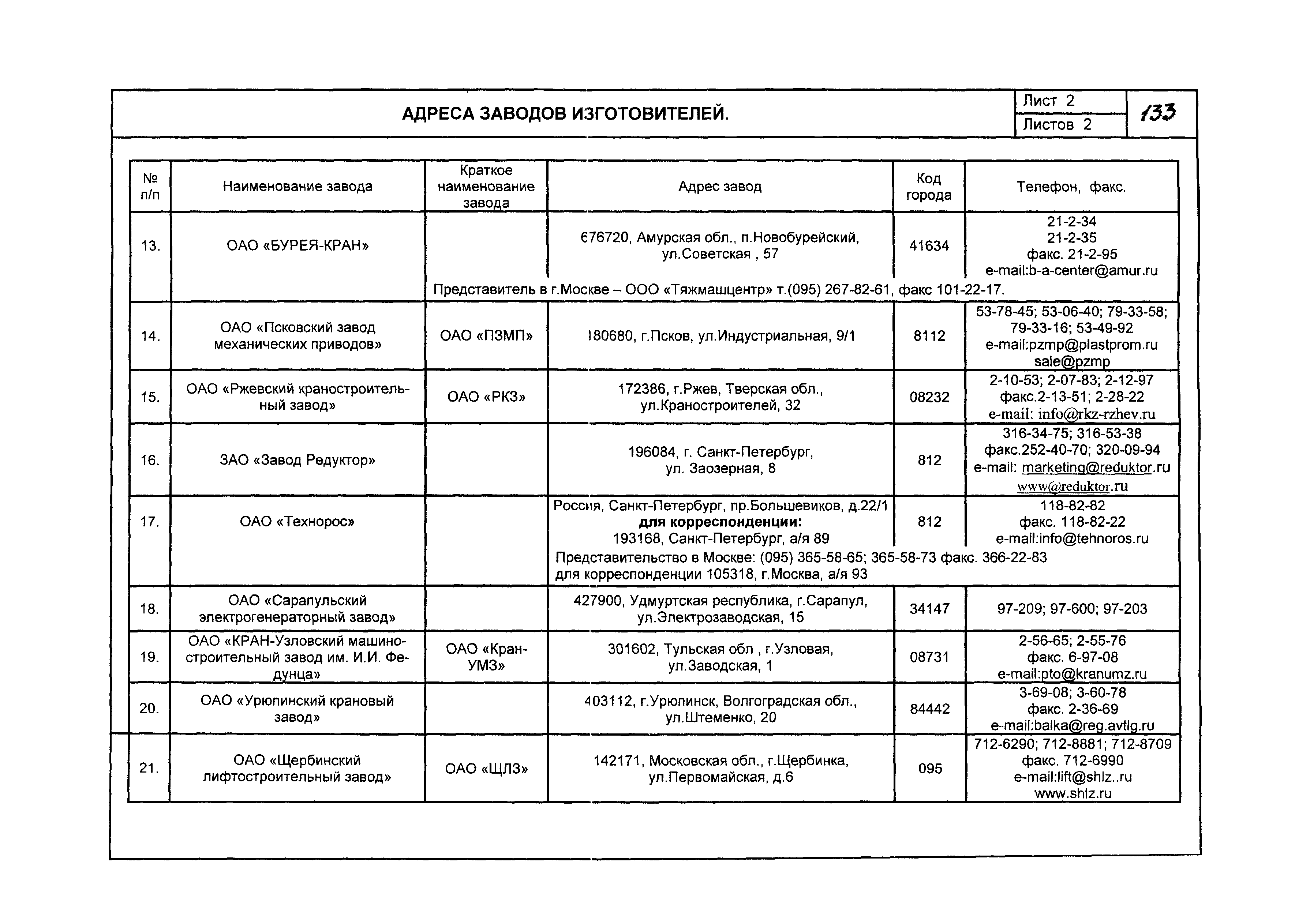 | Оглавление: | 1. Краны полукозловые и козловые 2. Краны козловые магнито-грейферные, специальные и консольные 3. Краны козловые контейнерные 4. Лифты 4.1. Лифты пассажирские 4.2. Лифты больничные 4.3. Лифты малые грузовые и грузовые 5. Редукторы 6. Мотор - редукторы 7. Электропогрузчики 8. Электротележки 9. Тележки ручные 10. Адреса заводов-изготовителей |