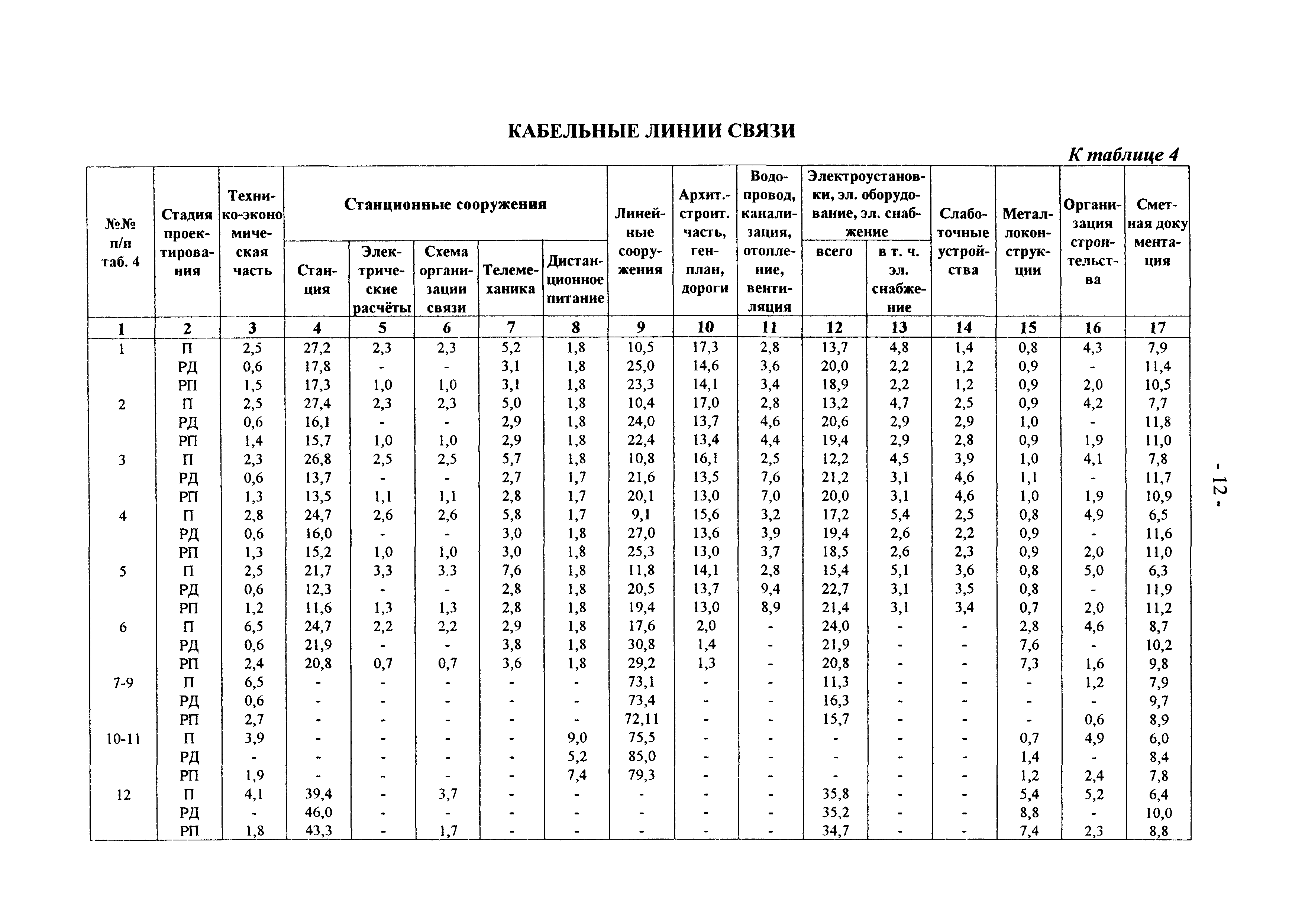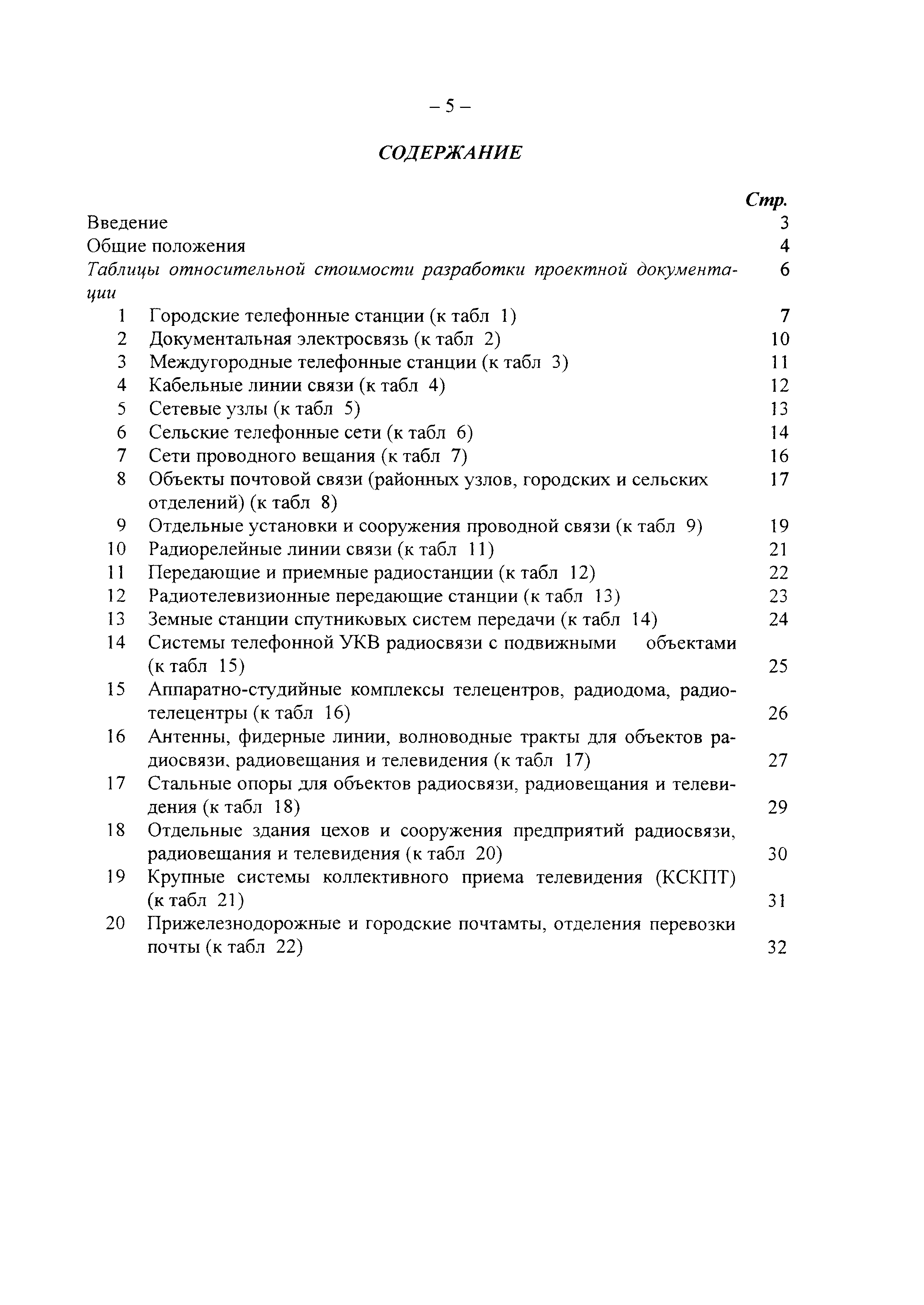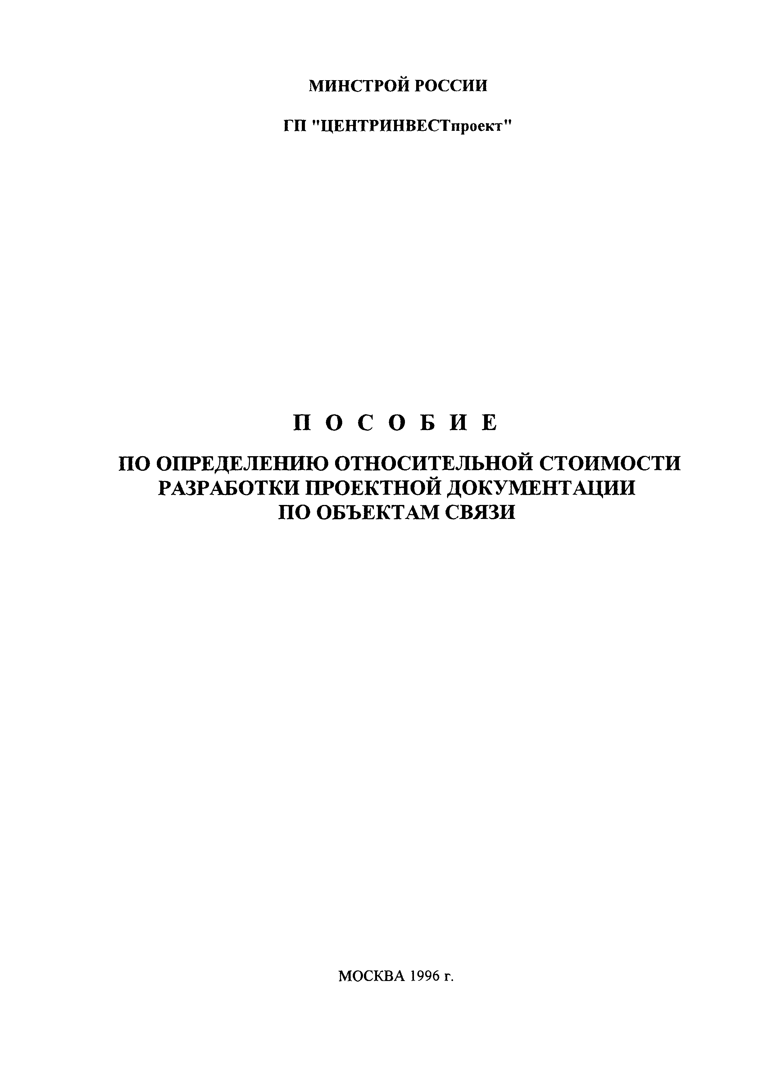 Пособие по определению относительной стоимости разработки проектной документации по объектам связи. Объекты связи. Справочник базовых цен на проектные работы для строительства| Статус: | действует | | Название рус.: | Пособие по определению относительной стоимости разработки проектной документации по объектам связи. Объекты связи. Справочник базовых цен на проектные работы для строительства | | Дата добавления в базу: | 01.09.2013 | | Дата актуализации: | 01.01.2021 | | Дата введения: | 01.03.1996 | | Область применения: | Пособие рекомендуется для применения при определении (или распределении) стоимости разработки проектной документации по разделам, частям проектных работ, учтенных ценами Справочника базовых цен на проектные работы для строительства объектов связи. | | Оглавление: | Введение Общие положения Таблицы относительной стоимости разработки проектной документации 1 Городские телефонные станции 2 Документальная электросвязь 3 Междугородные телефонные станции 4 Кабельные линии связи 5 Сетевые узлы 6 Сельские телефонные сети 7 Сети проводного вещания 8 Объекты почтовой связи (районных узлов, городских и сельских отделений) 9 Отдельные установки и сооружения проводной связи 10 Радиорелейные линии связи 11 Передающие и приемные радиостанции 12 Радиотелевизионные передающие станции 13 Земные станции спутниковых систем передачи 14 Системы телефонной УКВ радиосвязи с подвижными объектами 15 Апппаратно-студийные комплексы телецентров, радиодома, радиоцентры 16 Антенны, фидерные линии, волноводные тракты для объектов связи, радиовещания и телевидения 17 Стальные опоры для объектов радиосвязи, радиовещания и телевидения 18 Отдельные здания цехов и сооружения предприятий радиосвязи, радиовещания и телевидения 19 Крупные системы коллективного приема телевидения (КСКПТ) 20 Прижелезнодорожные и городски епочтамты, отделения перевозки почты | | Разработан: | ГП ЦЕНТРИНВЕСТпроект Минстроя России ГСПИ РТВ Минсвязи России