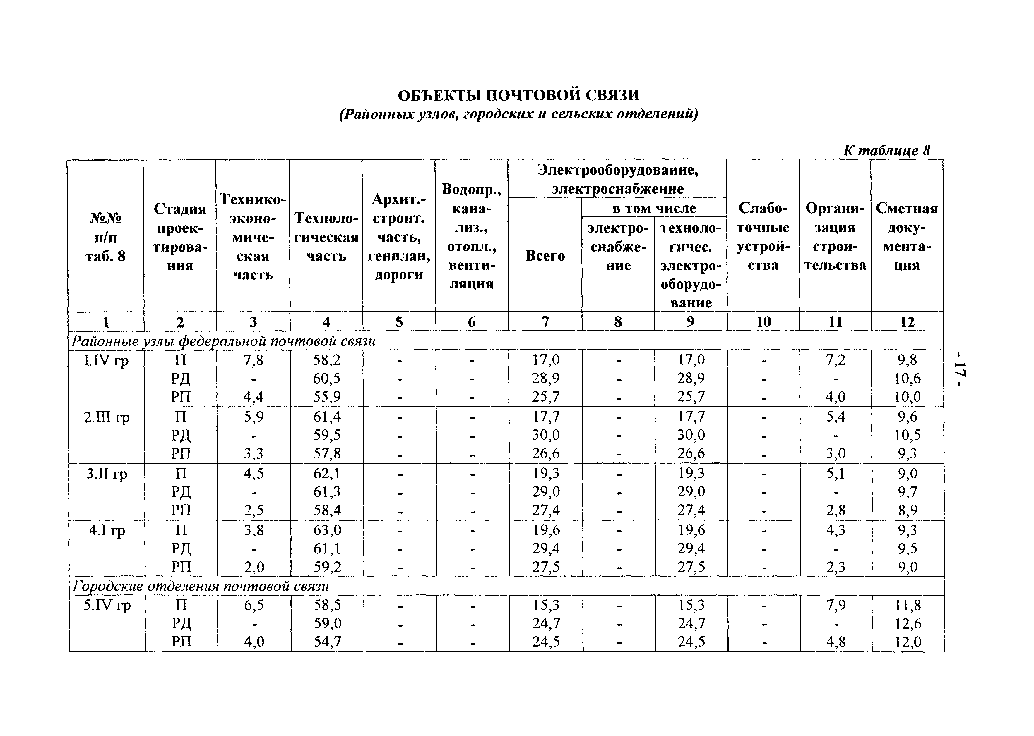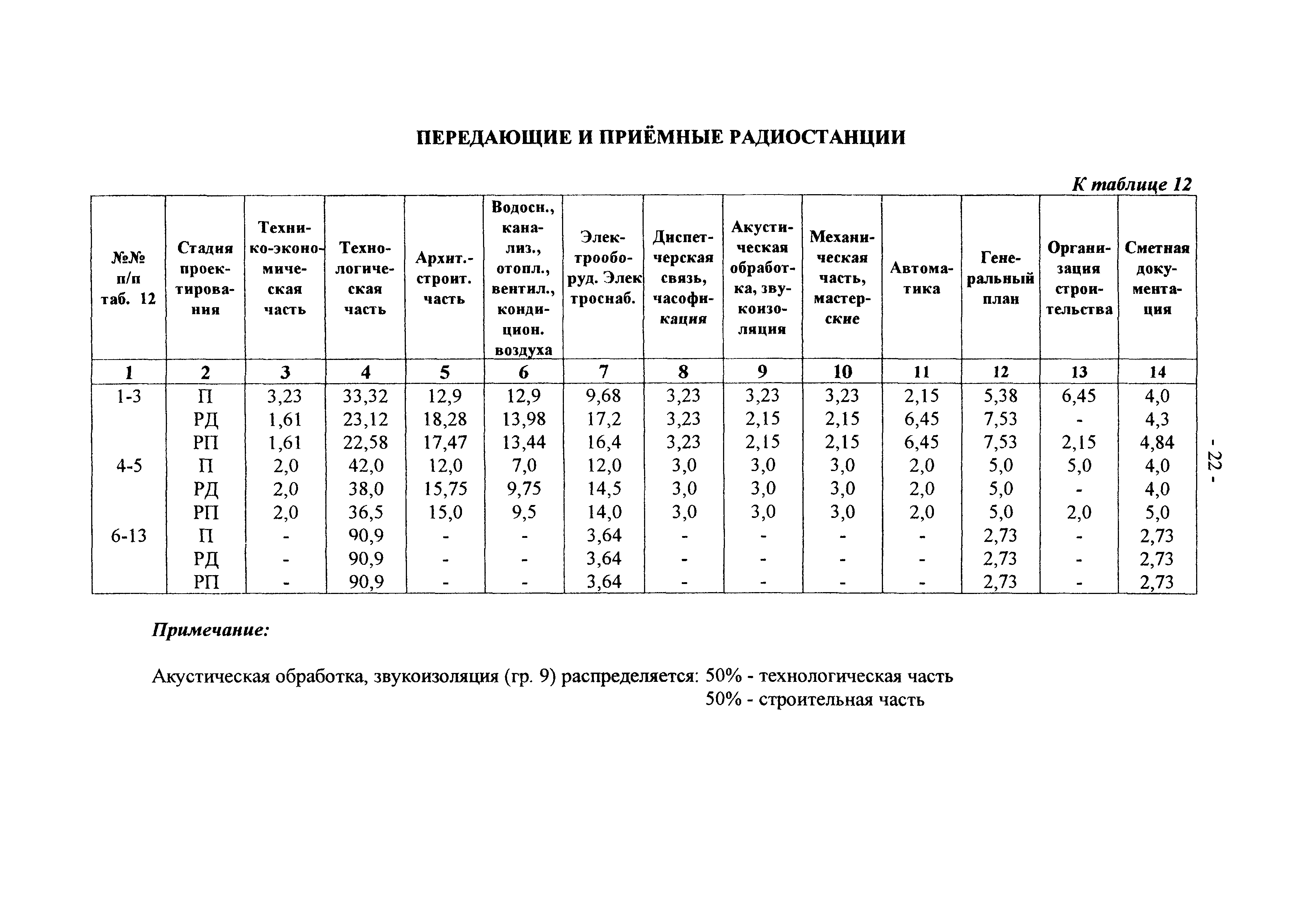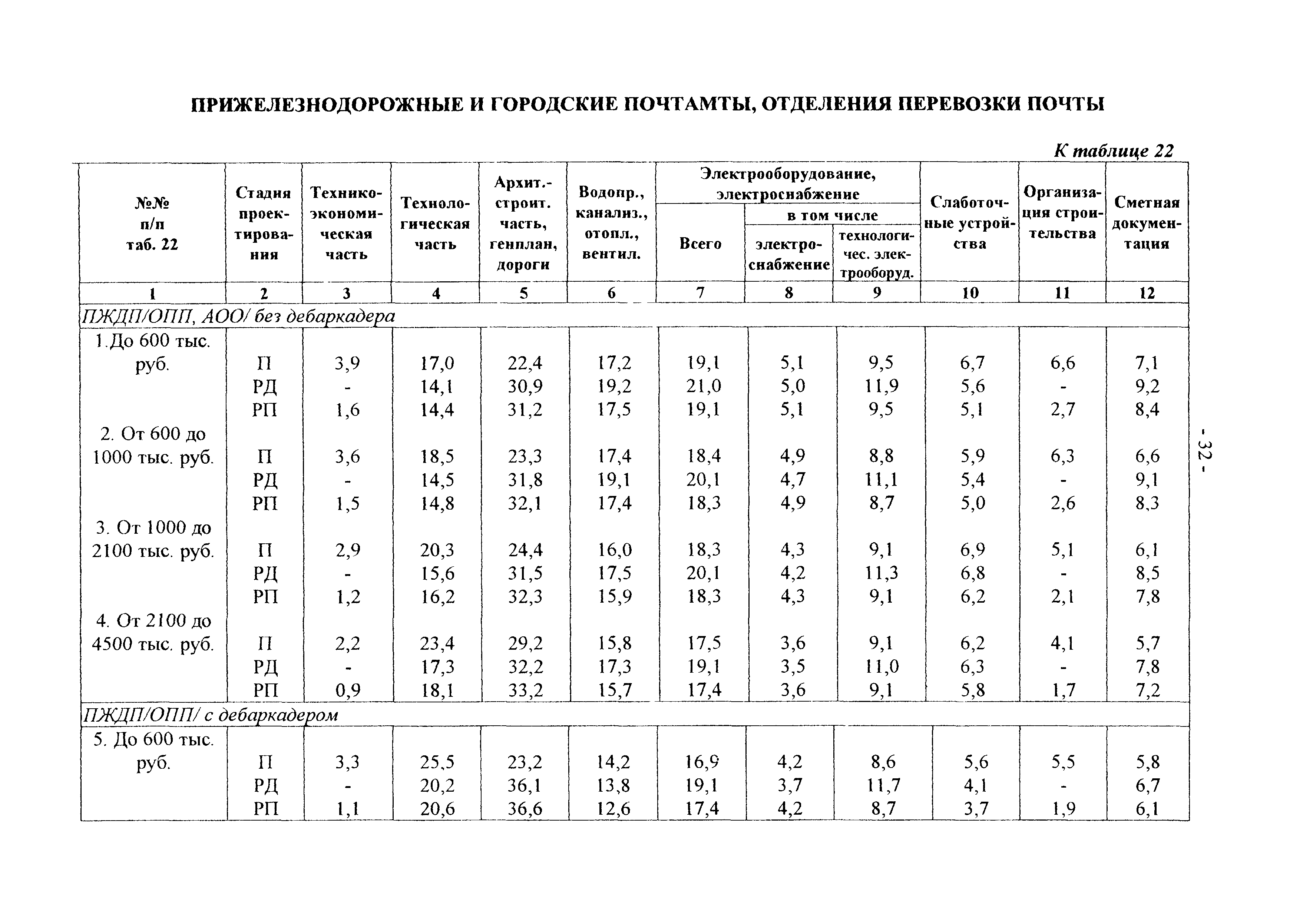 Пособие по определению относительной стоимости разработки проектной документации по объектам связи. Объекты связи. Справочник базовых цен на проектные работы для строительства| Статус: | действует | | Название рус.: | Пособие по определению относительной стоимости разработки проектной документации по объектам связи. Объекты связи. Справочник базовых цен на проектные работы для строительства | | Дата добавления в базу: | 01.09.2013 | | Дата актуализации: | 01.01.2021 | | Дата введения: | 01.03.1996 | | Область применения: | Пособие рекомендуется для применения при определении (или распределении) стоимости разработки проектной документации по разделам, частям проектных работ, учтенных ценами Справочника базовых цен на проектные работы для строительства объектов связи. | | Оглавление: | Введение Общие положения Таблицы относительной стоимости разработки проектной документации 1 Городские телефонные станции 2 Документальная электросвязь 3 Междугородные телефонные станции 4 Кабельные линии связи 5 Сетевые узлы 6 Сельские телефонные сети 7 Сети проводного вещания 8 Объекты почтовой связи (районных узлов, городских и сельских отделений) 9 Отдельные установки и сооружения проводной связи 10 Радиорелейные линии связи 11 Передающие и приемные радиостанции 12 Радиотелевизионные передающие станции 13 Земные станции спутниковых систем передачи 14 Системы телефонной УКВ радиосвязи с подвижными объектами 15 Апппаратно-студийные комплексы телецентров, радиодома, радиоцентры 16 Антенны, фидерные линии, волноводные тракты для объектов связи, радиовещания и телевидения 17 Стальные опоры для объектов радиосвязи, радиовещания и телевидения 18 Отдельные здания цехов и сооружения предприятий радиосвязи, радиовещания и телевидения 19 Крупные системы коллективного приема телевидения (КСКПТ) 20 Прижелезнодорожные и городски епочтамты, отделения перевозки почты | | Разработан: | ГП ЦЕНТРИНВЕСТпроект Минстроя России ГСПИ РТВ Минсвязи России