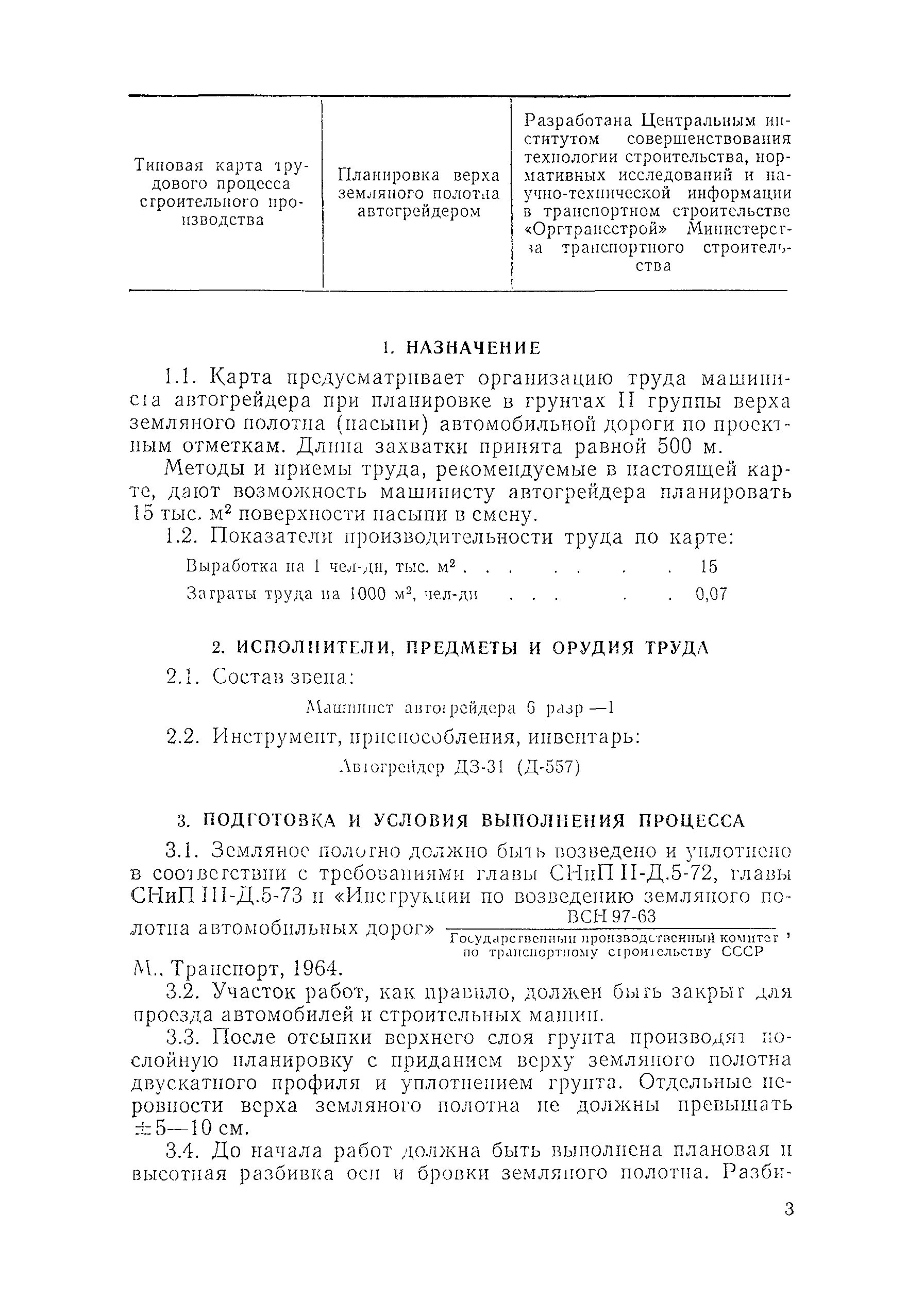 Типовая карта трудового процесса строительного производства. Планировка верха земляного полотна автогрейдером| Статус: | действует | | Название рус.: | Типовая карта трудового процесса строительного производства. Планировка верха земляного полотна автогрейдером | | Дата добавления в базу: | 01.09.2013 | | Дата актуализации: | 01.01.2021 | | Дата введения: | 17.08.1978 | | Область применения: | Карта предусматривает организацию труда машиниста автогрейдера при планировке в грунтах II группы верха земляного полотна (насыпи) автомобильной дороги по проектным отметкам. | | Оглавление: | I Назначение II Исполнители, предметы и орудия труда III Подготовка и условия выполнения процесса IV Технология и организация процесса V Приемы труда | | Разработан: | Оргтрансстрой