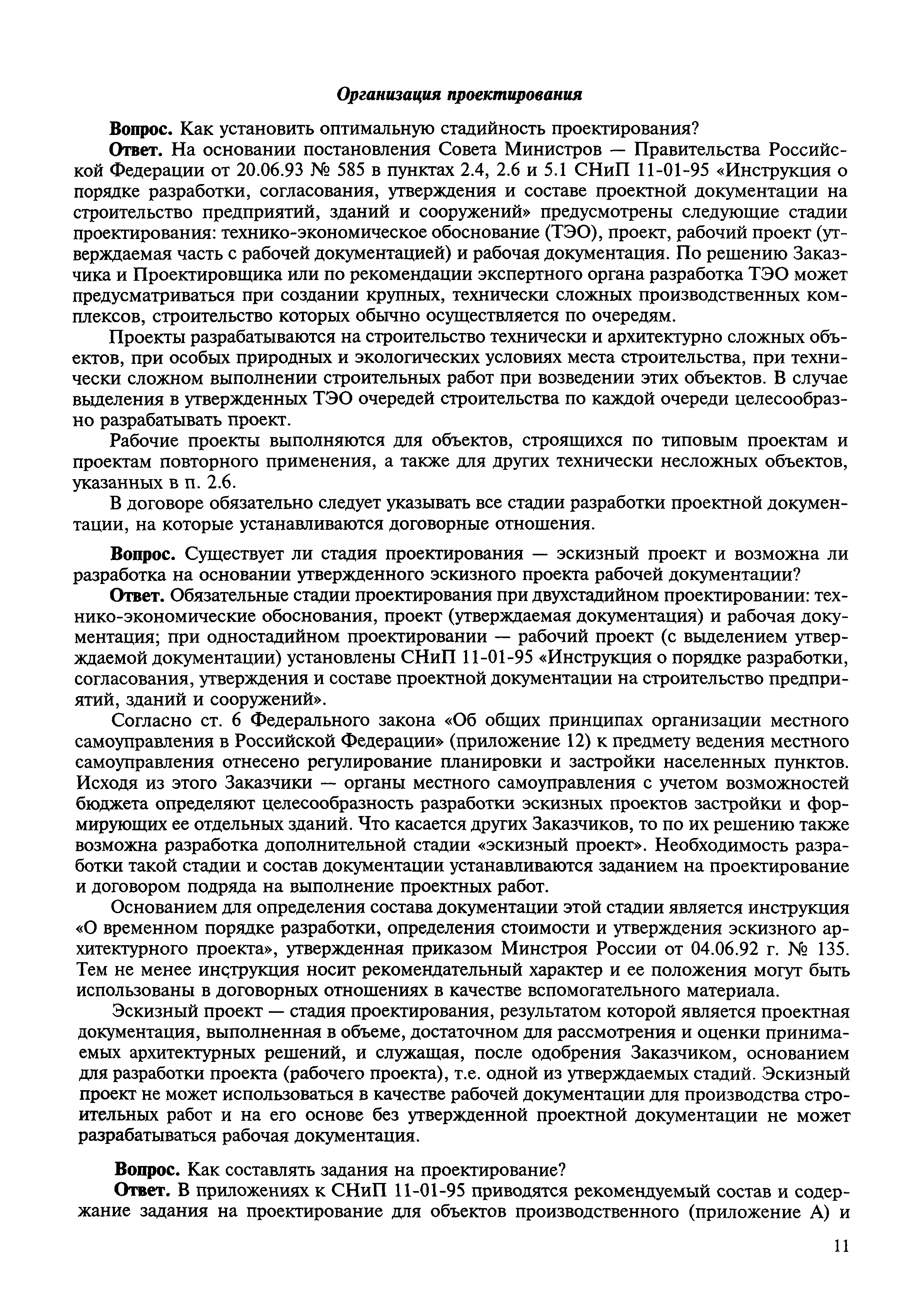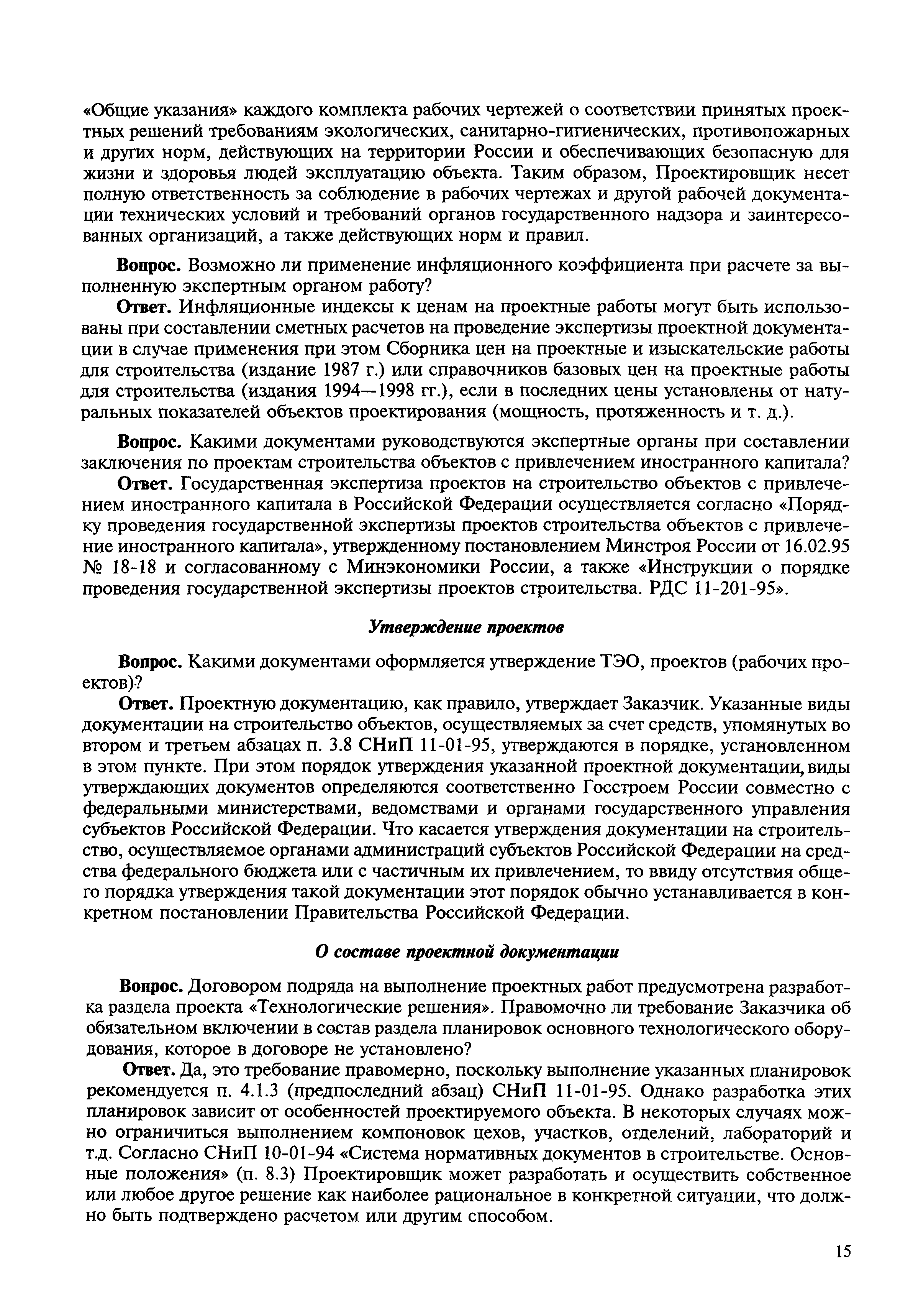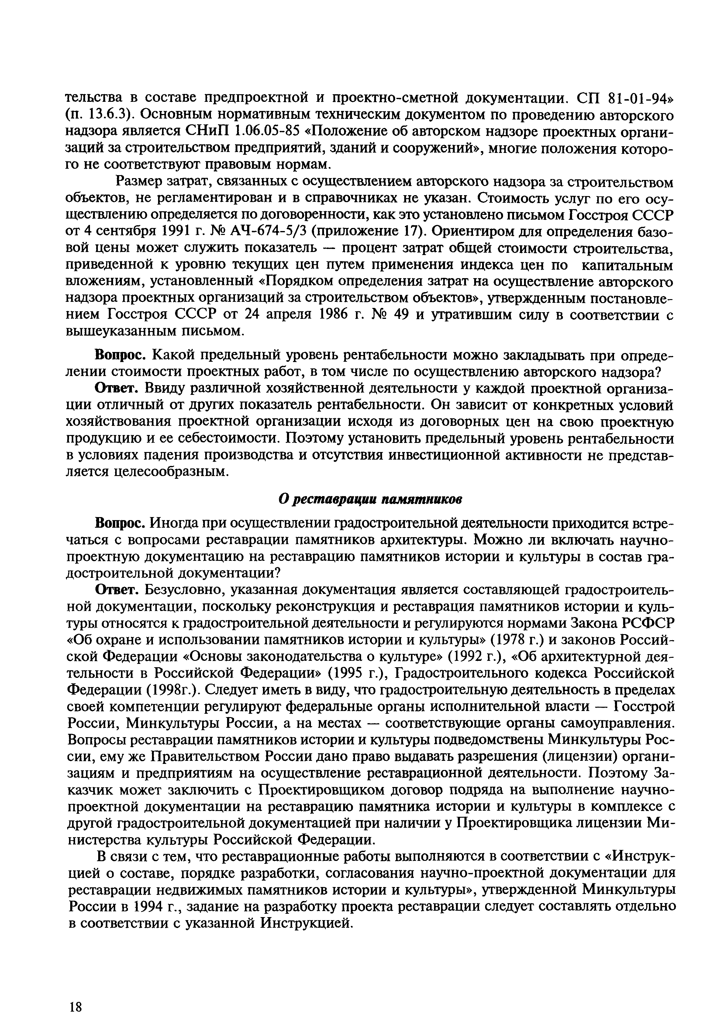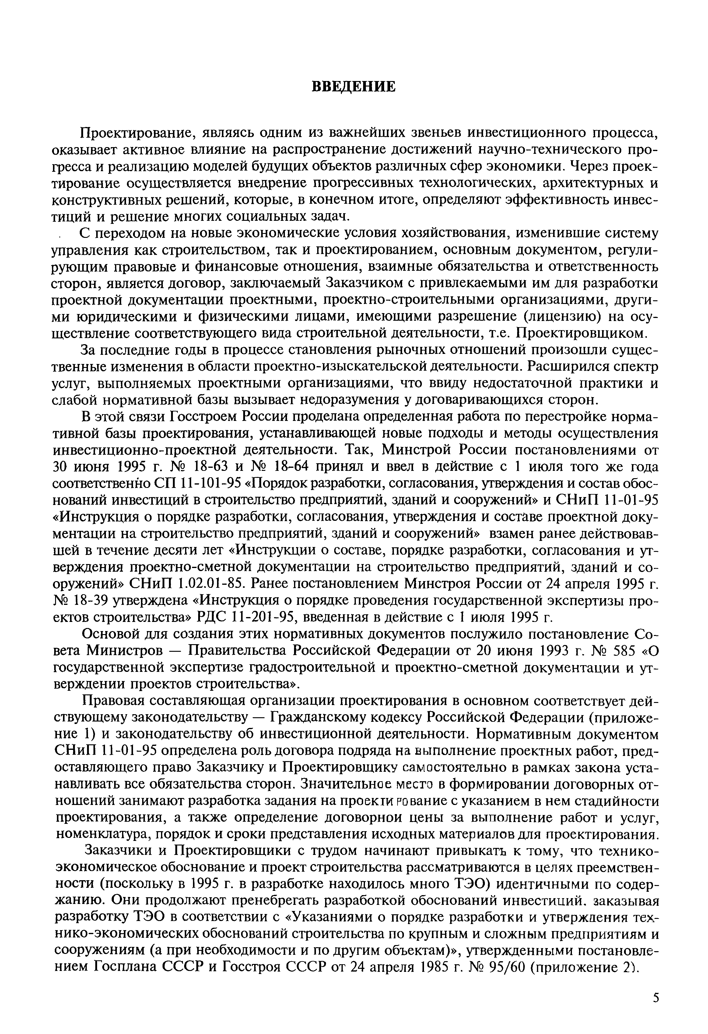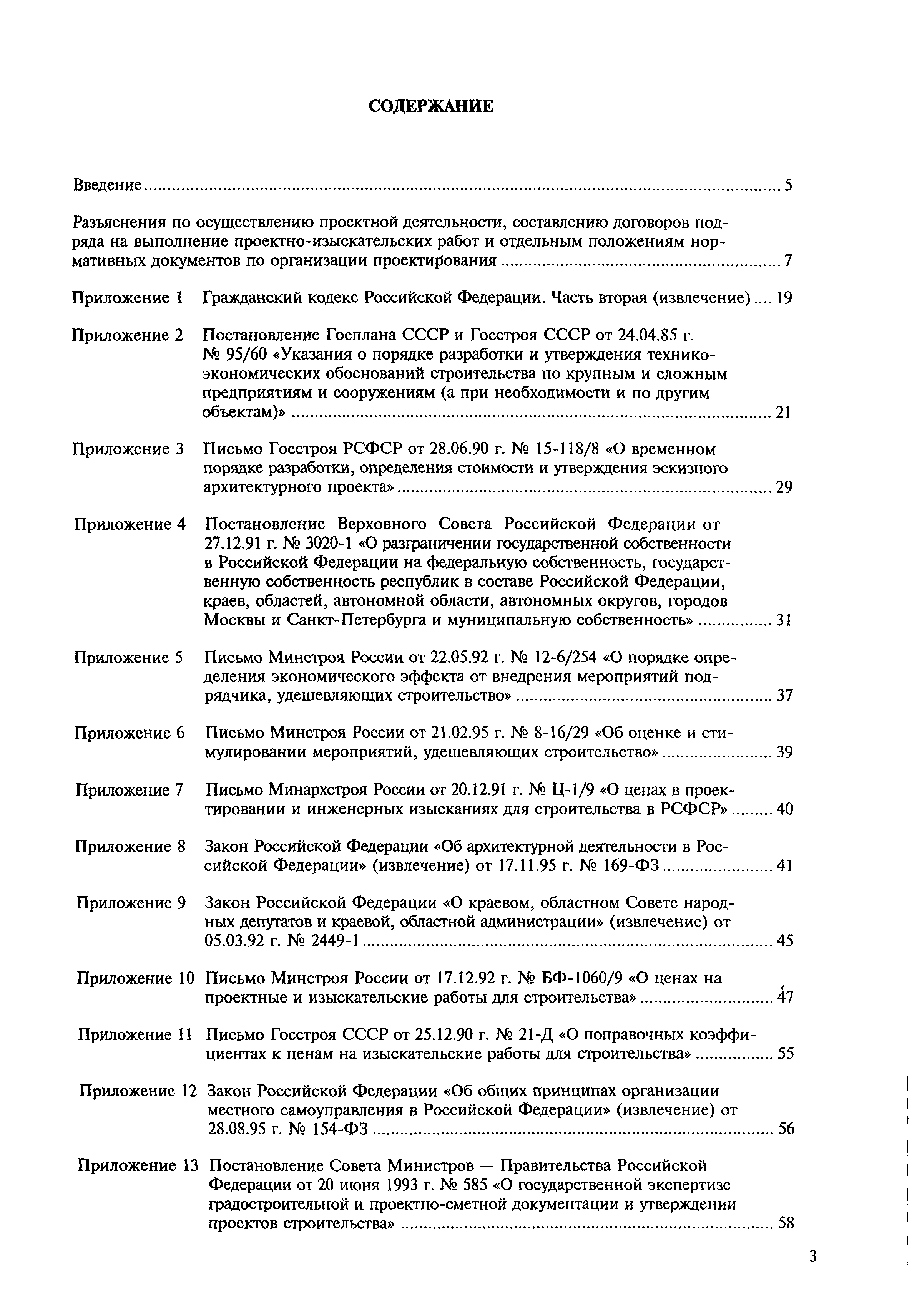| Оглавление: | Введение Разъяснения по осуществлению проектной деятельности, составлению договоров подряда на выполнение проектно-изыскательских работ и отдельным положениям нормативных документов по организации проектирования Приложение 1 Гражданский кодекс РФ. Часть вторая (извлечение) Приложение 2 Постановление Госплана СССР и Госстроя СССР от 24.04.1985 г. № 95/60 "Указания о порядке разработки и утверждения технико-экономических обоснований строительства по крупным и сложным предприятиям и сооружениям (а при необходимости и по другим объектам) Приложение 3 Письмо Госстроя РСФСР от 28.06.90 г. № 15-118/8 "Овременном порядке разработки, определения стоимости и утверждения эскизного архитектурного проекта" Приложение 4 Постановление Верховного Совета РФ от 27.12.91 г. № 3020-1 "О разграничении государственной собственности в РФ на федеральную собственность, государственную собственность республик в составе РФ, краев, областей, автономной области, автономных округов, городов Москвы и Санкт-Петербурга и муниципальную собственность" Приложение 5 Письмо Минстроя России от 22.05.92 г. № 12-6/254 "О порядке определения экономического эффекта от внедрения мероприятий подрядчика, удешевляющих строительство" Приложение 6 Письмо Минстроя России от 21.02.95 г. № 8-16/29 "Об оценке и стимулировании мероприятий, удешевляющих строительство" Приложение 7 Письмо Минархстроя России от 20.12.91 г. № Ц-1/9 "О ценах в проектировании и инженерных изысканиях для строительства в РСФСР" Приложение 8 Закон РФ "Об архитектурной деятельности в РФ" (извлечение) от 17.11.95 г. № 169-ФЗ Приложение 9 Закон РФ "О краевом, областном Совете народных депутатов и краевой, областной администрации" (извлечение) от 05.03.92 г. № 2449-1 Приложение 10 Письмо Минстроя России от 17.12.92 г. № БФ-1060/9 "О ценах на проектные и изыскательские работы для строительства" Приложение 11 Письмо Госстроя СССР от 25.12.90 г. № 21-Д "О поправочных коэффициентах к ценам на изыскательские работы для строительства" Приложение 12 Закон РФ "Об общих принципах организации местного самоуправления в РФ" (извлечение) от 28.08.95 г. № 154-ФЗ Приложение 13 Постановление Совета Министров - Правительства РФ от 20.06.1993 г. № 585 "О государственной экспертизе градостроительной и проектно-сметной документации и утверждении проектов строительства Приложение 14 Письмо Госплана СССР, Госстроя СССР, Стройбанка СССР и ЦСУ СССР от 8 мая 1984 г. № Н6-36-Д/23-Д/144/6-14 "Об определении понятий нового строительства, расширения, реконструкции и технического перевооружения действующих предприятий" Приложение 15 Закон РСФСР "Об охране окружающей природной среды" (извлечение) от 19.12.91 г. № 2060-1 Приложение 16 Письмо Минстроя России от 15.11.96 г. № ВБ-26/12-369 "О законодательстве РФ, в соответствии с которым ведется определение стоимости строительства" Приложение 17 Письмо Госстроя СССР от 04.09.91 г. № АЧ-674-5/3 "Об определении затрат на осуществление авторского надзора" |