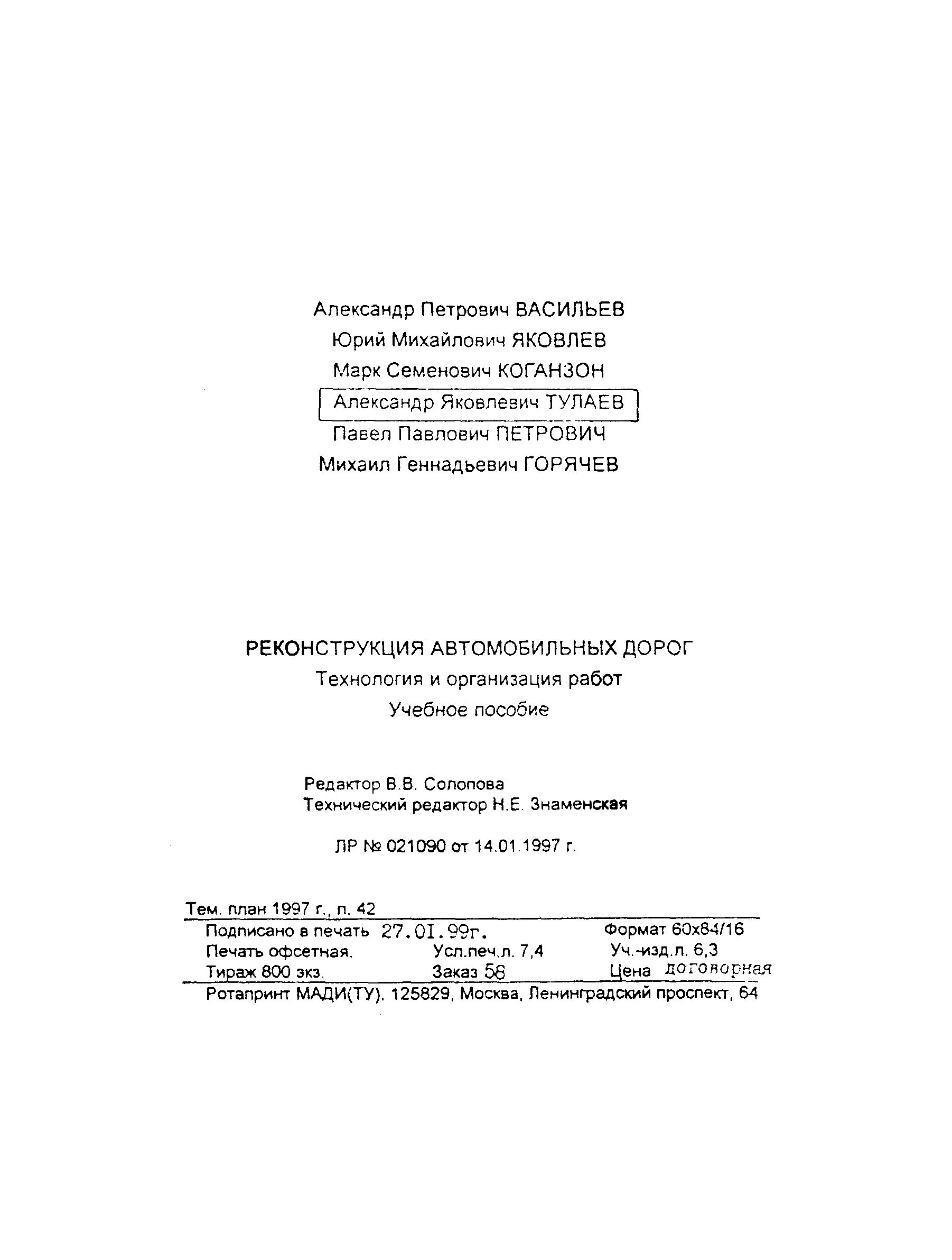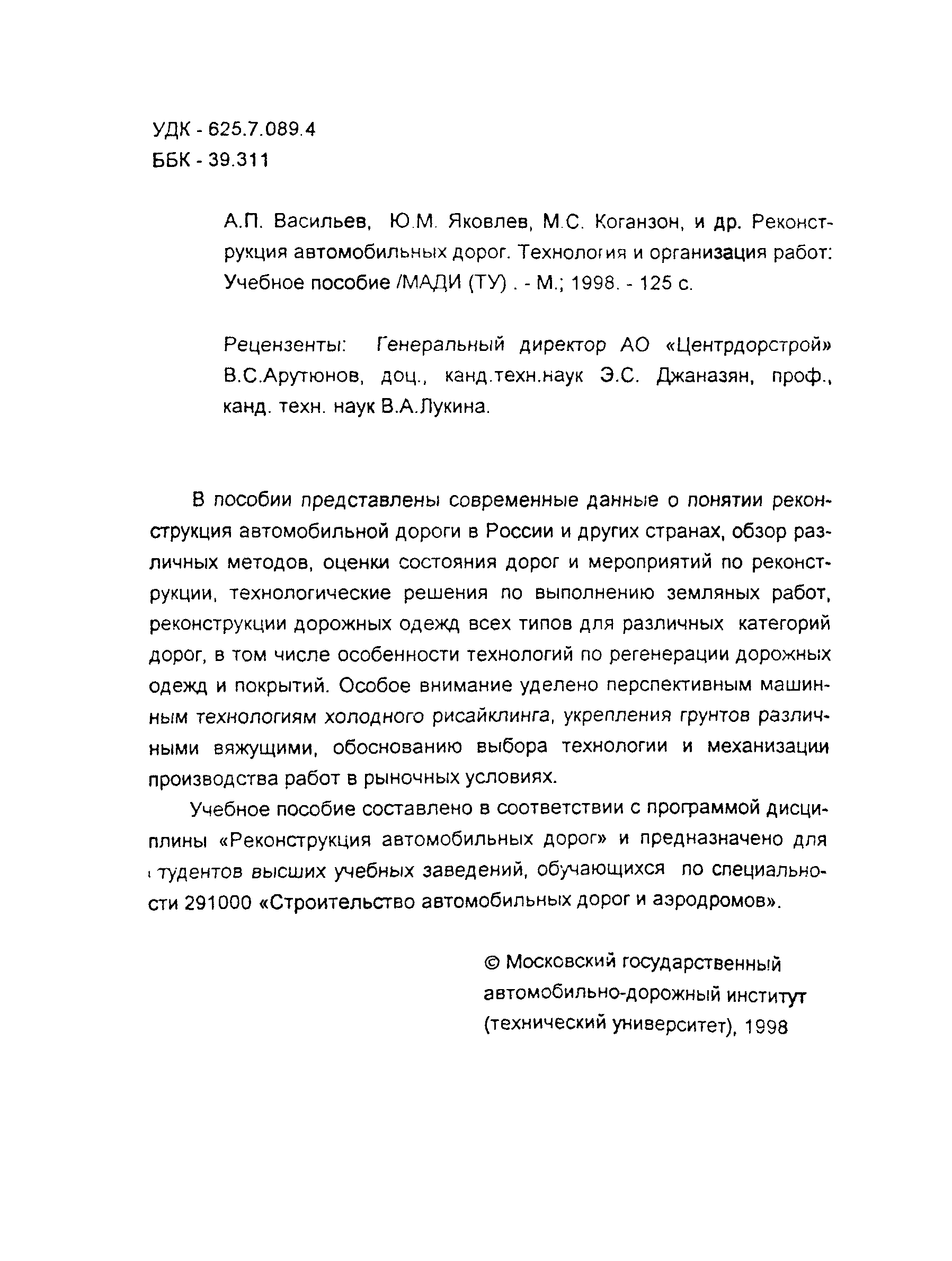 | Область применения: | Учебное пособие составлено в соответствии с программой дисциплины "Реконструкция автомобильных дорог" и предназначено для студентов высщих учебных заведений, обучающихся по специальности 291000 "Строительство автомобильных дорог и аэродромов" |