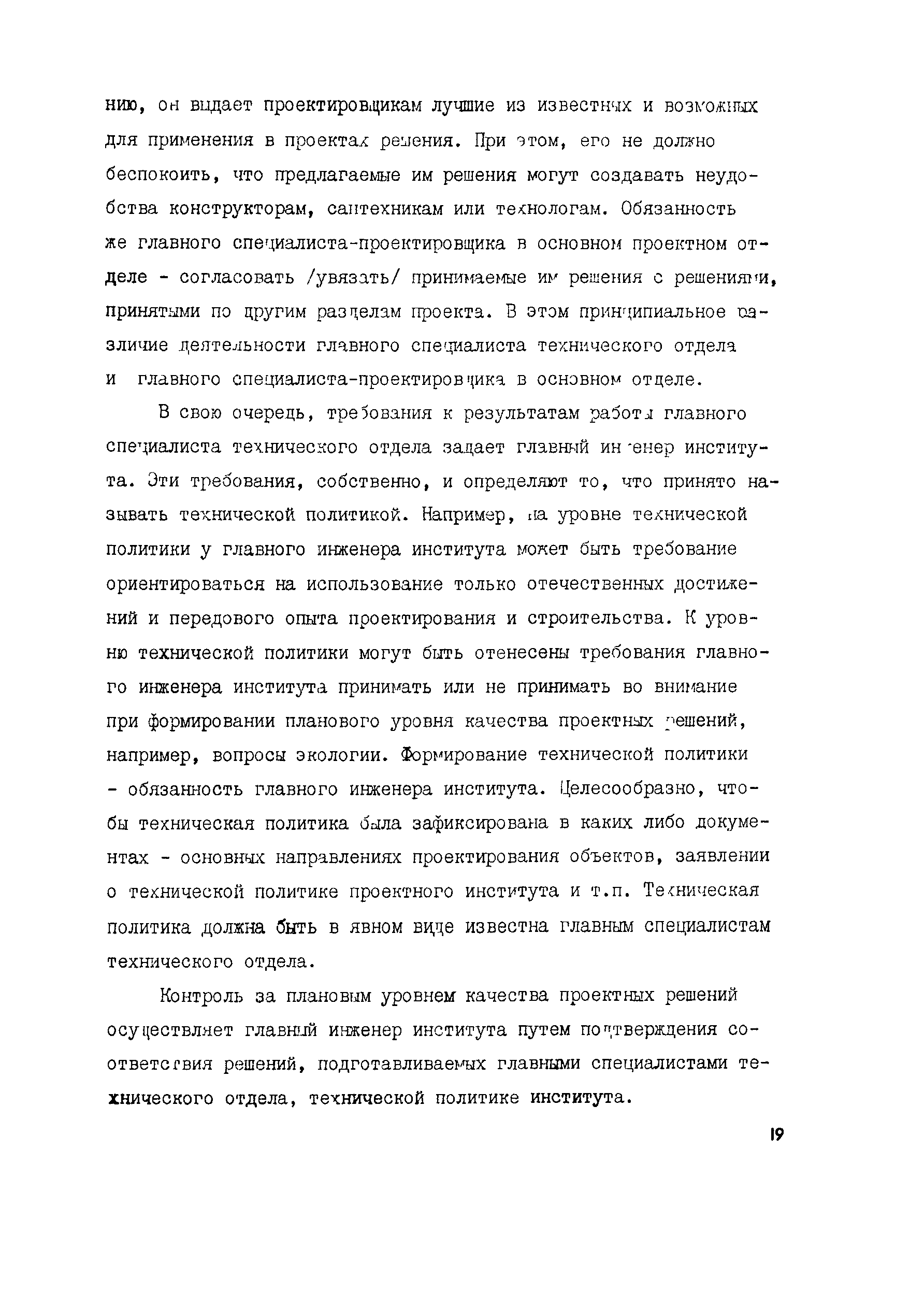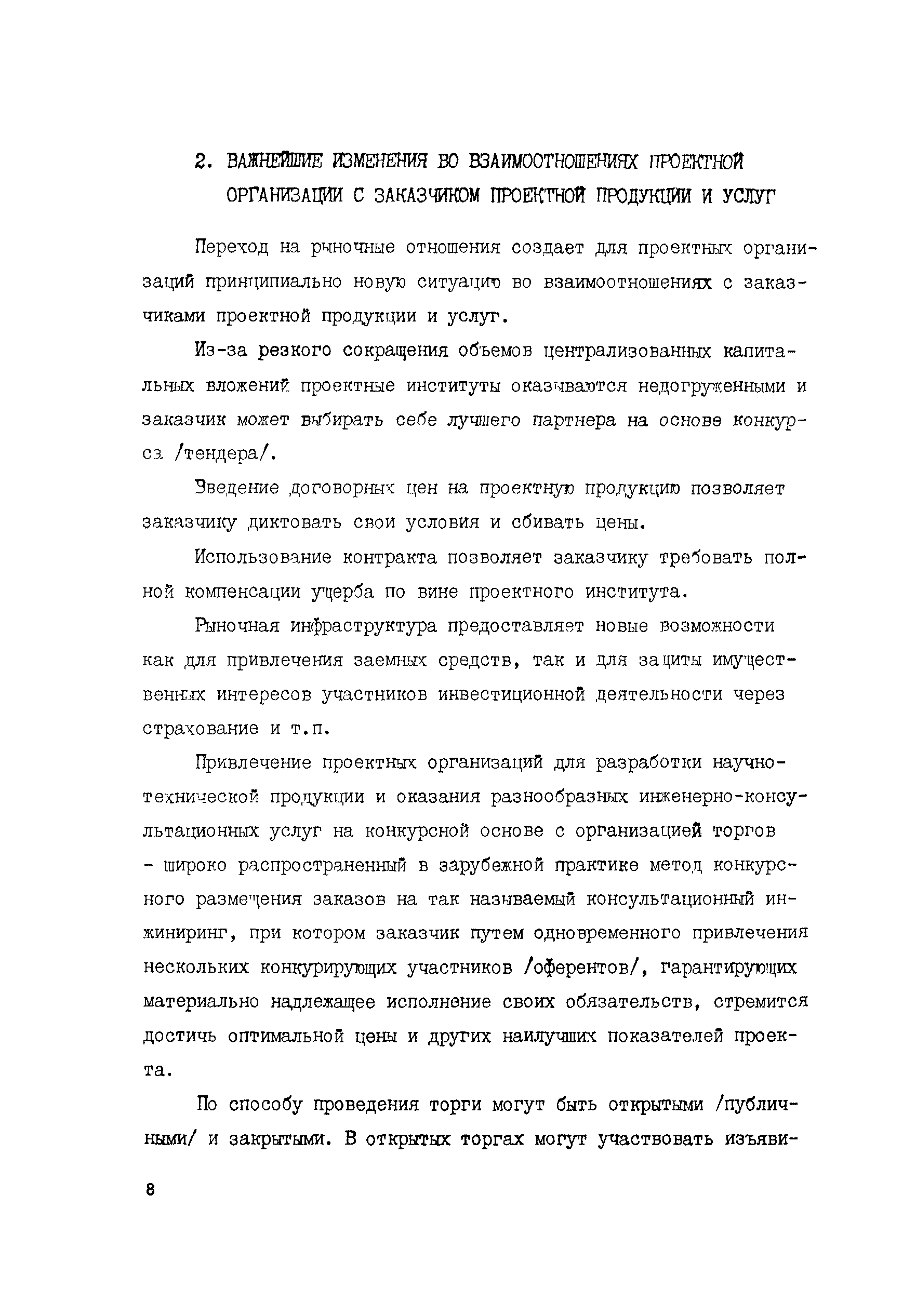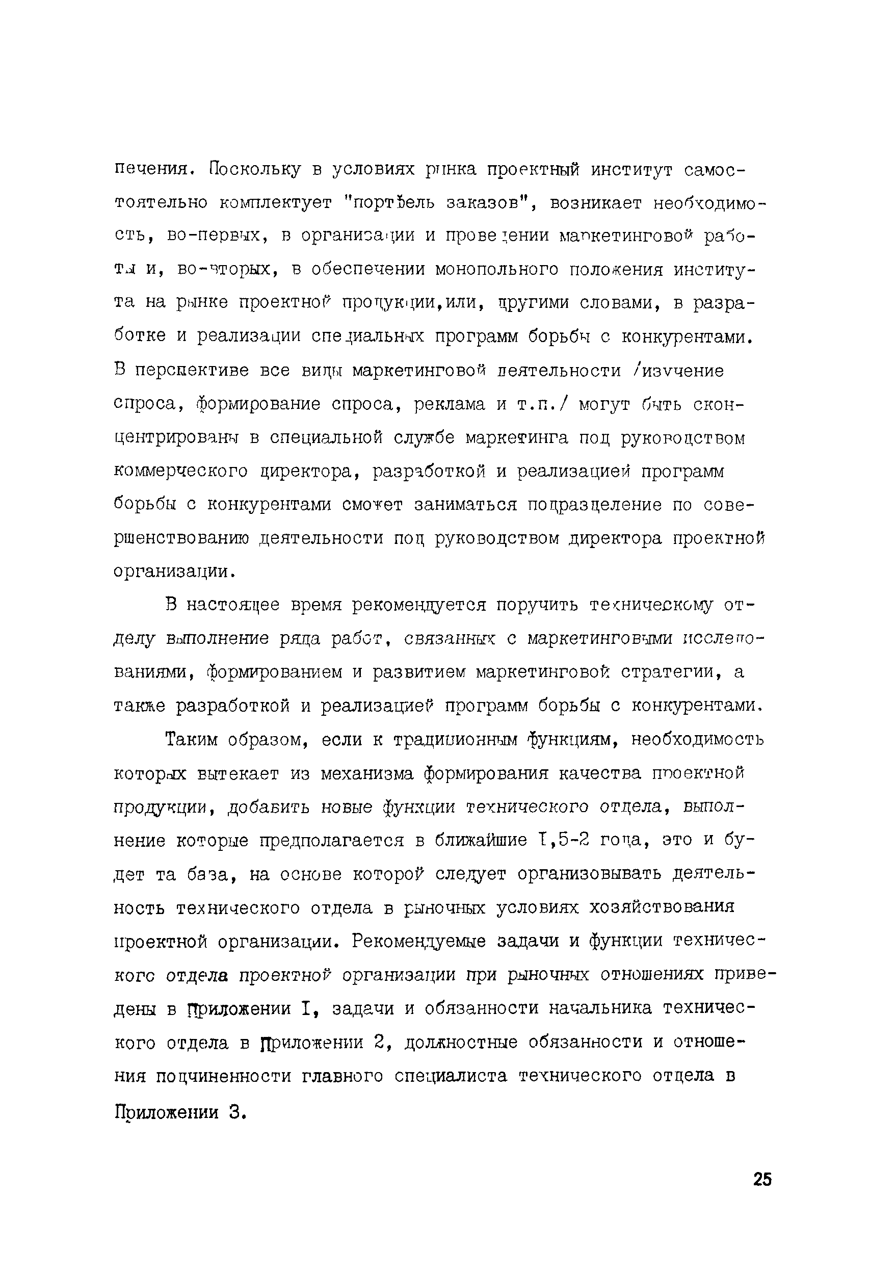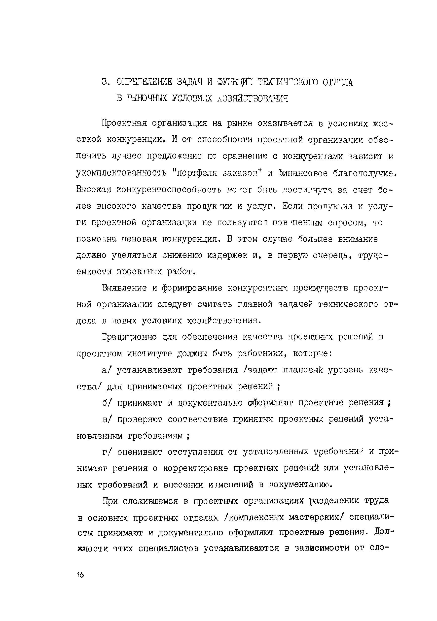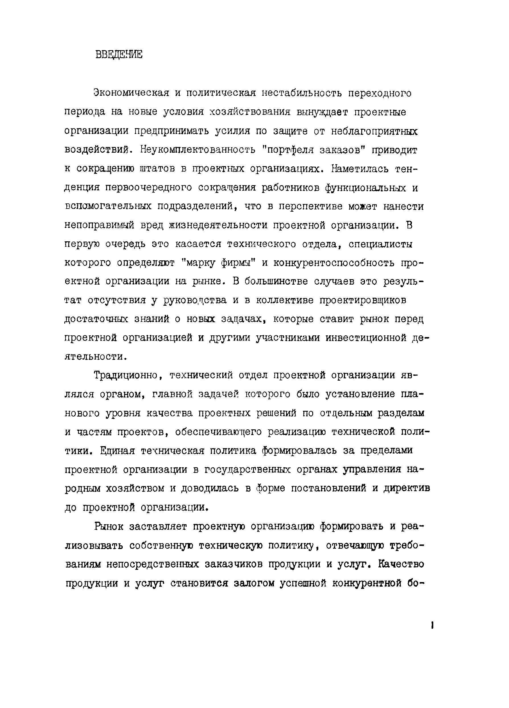 | Оглавление: | Введение 1 Особенности рыночных отношений и их влияние на работу проектного института 2 Важнейшие изменения во взаимоотношениях проектной организации с заказчиком проектной продукции и услуг 3 Определение задач и функций технического отдела в рыночных условиях хозяйствования Приложение 1 Рекомендуемые задачи и функции технического отдела проектной организации при рыночных отношениях Приложение 2 Рекомендуемые задачи и обязанности начальника технического отдела Приложение 3 Рекомендуемые должностные обязанности и отношения подчиненности главного специалиста технического отдела |