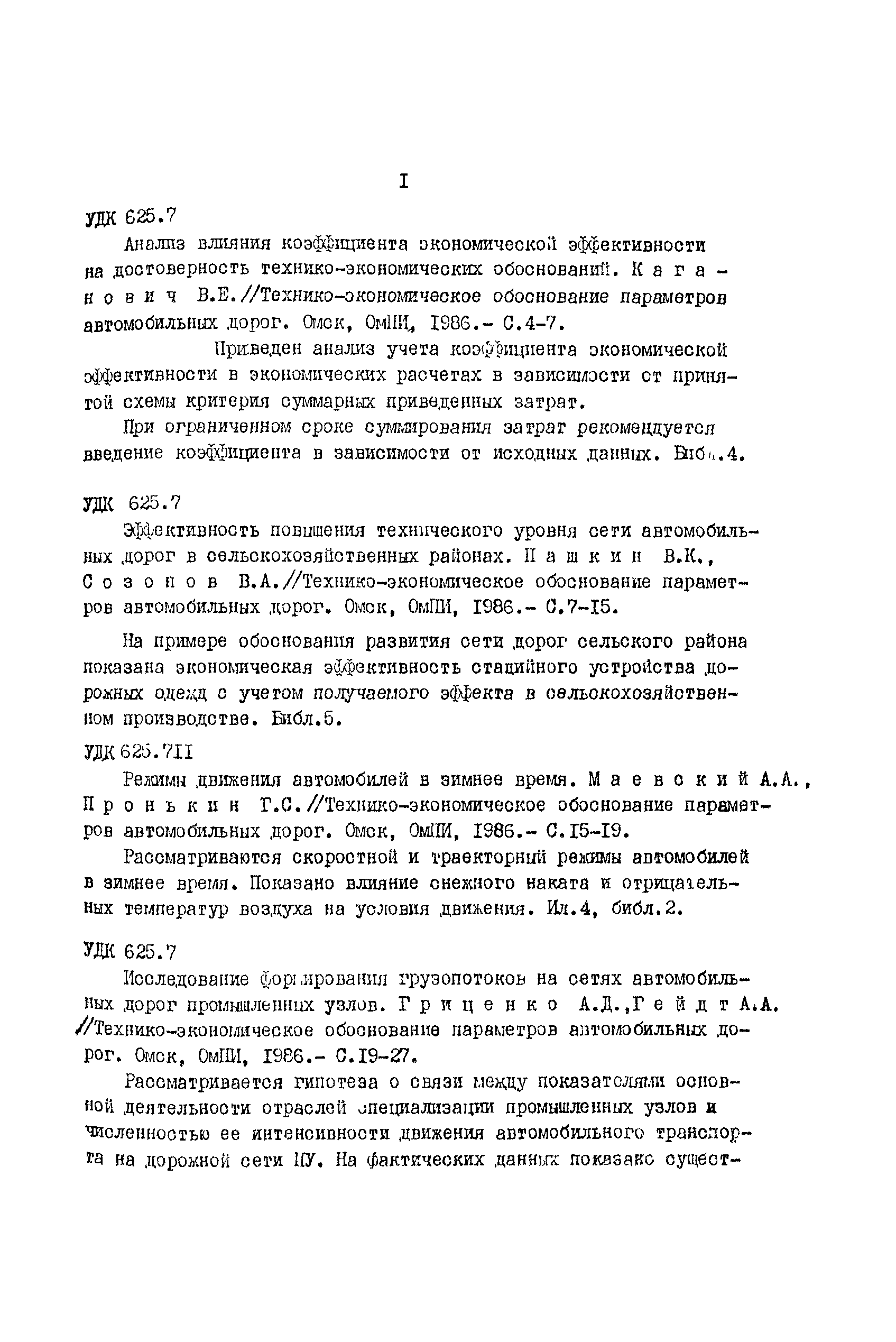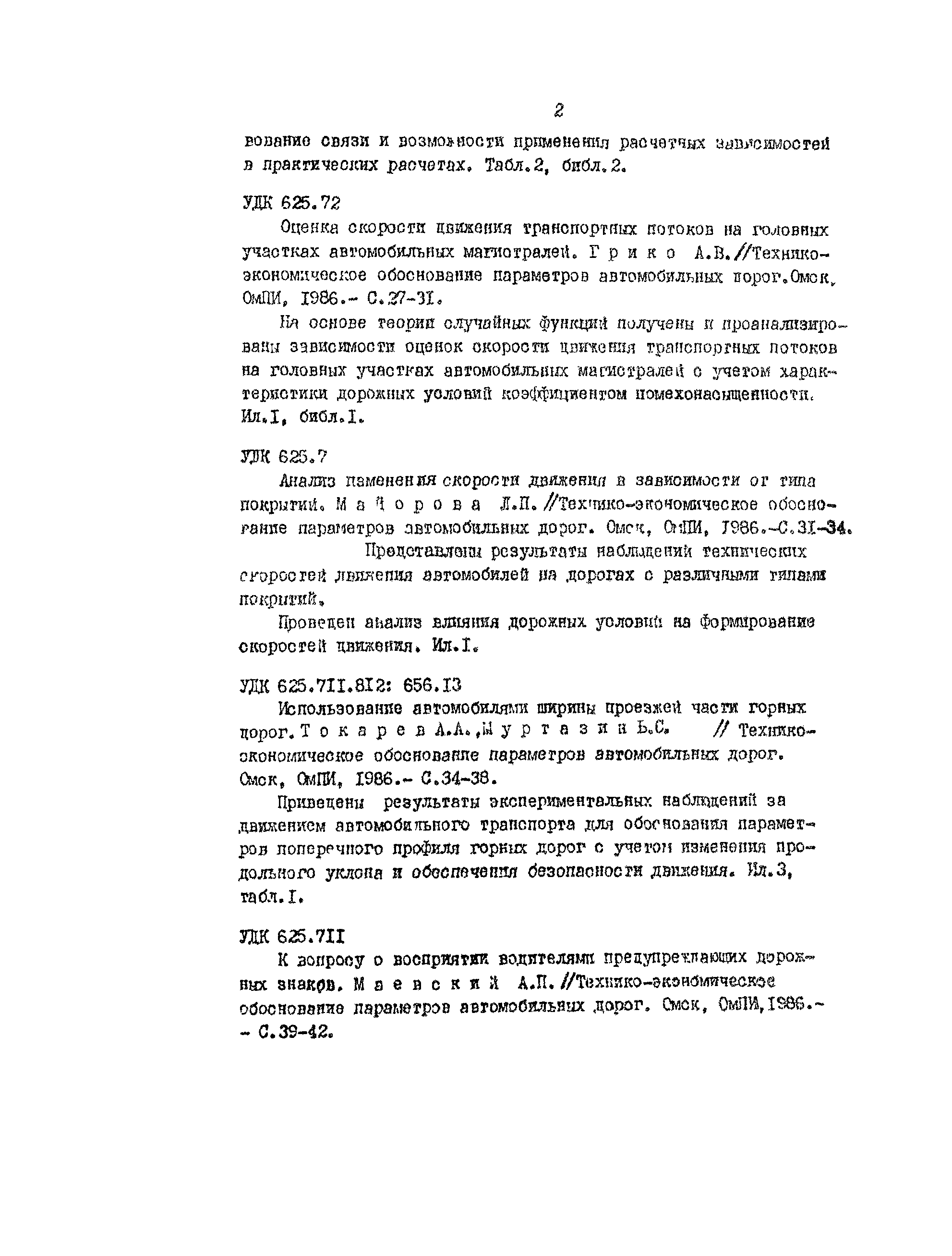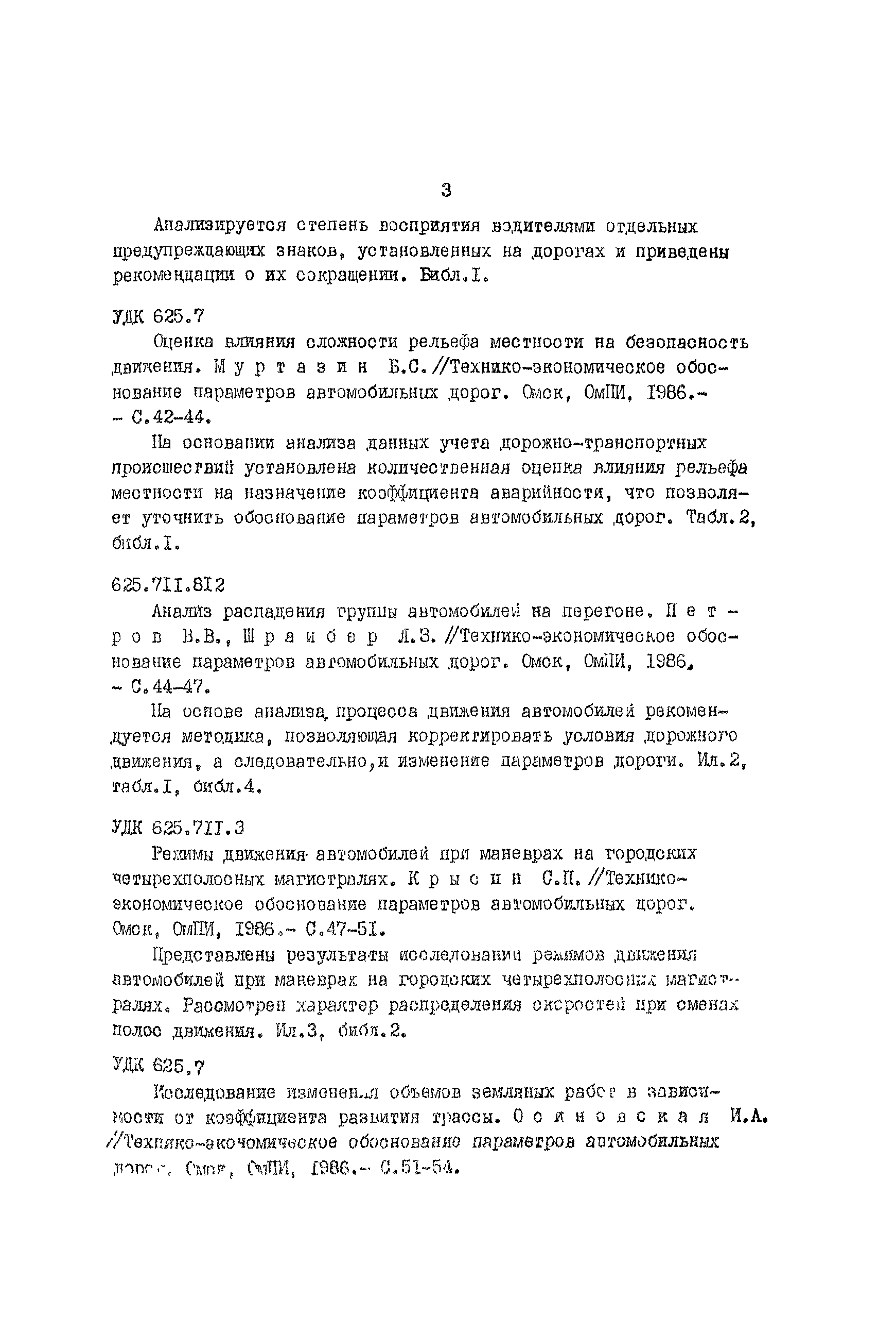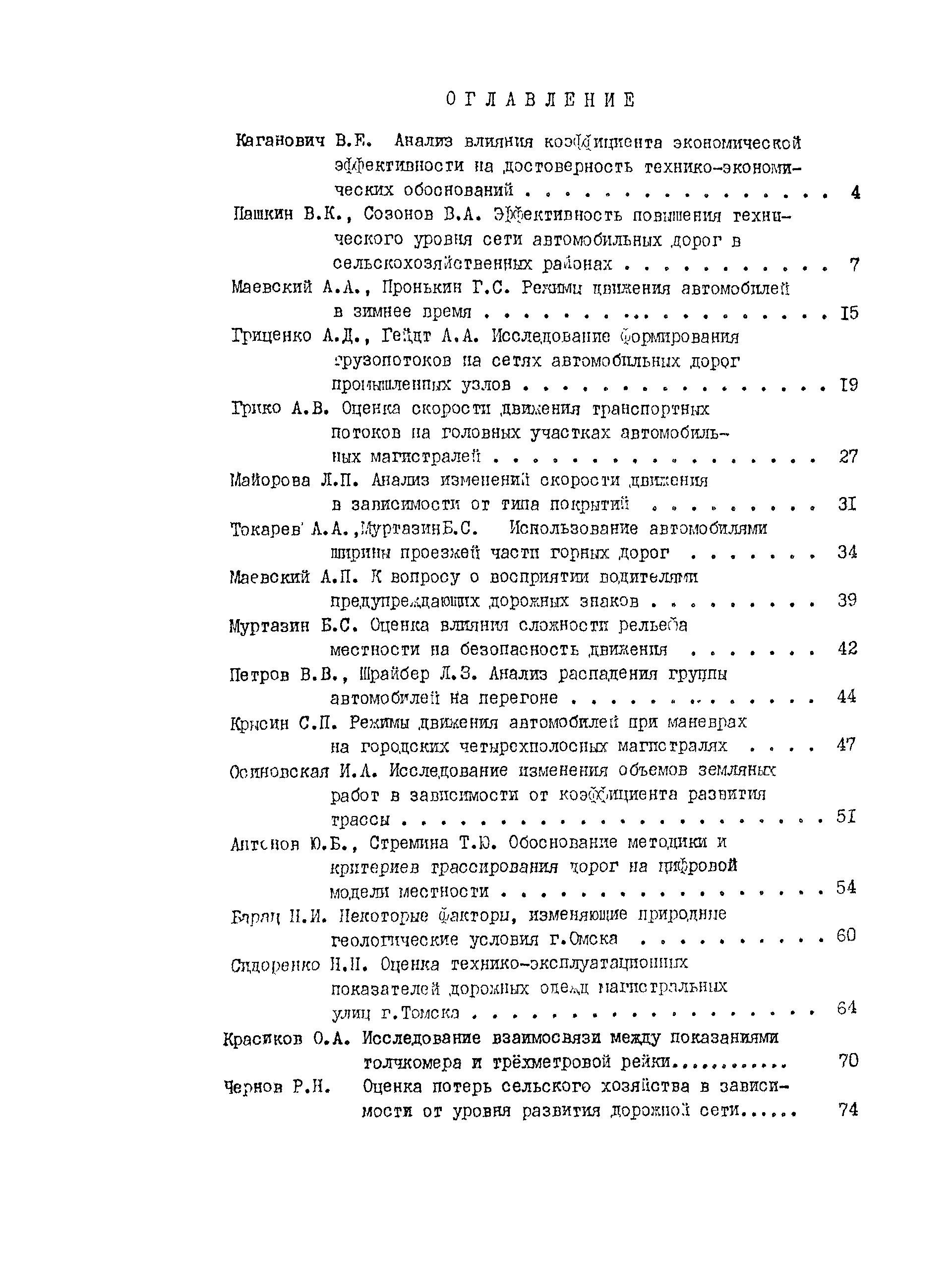 | Оглавление: | Анализ влияния коэффициента экономической эффективности на достоверность технико-экономических обоснований Эффективность повышения технического уровня сети автомобильных дорог в сельскохозяйственных районах Режимы движения автомобилей в зимнее время Исследование формирования грузопотоков на сетях автомобильных дорог промышленных узлов Оценка скорости движения транспортных потоков на головных участках автомобильных магистралей Анализ изменений скорости движения в зависимости от типа покрытий Использование автомобилями ширины проезжей части горных дорог К вопросу о восприятии водителями предупреждающих дорожных знаков Оценка влияния сложности рельефа местности на безопасность движения Анализ распадения группы автомобилей на перегоне Режимы движения автомобилей при маневрах на городских четырехполосных магистралях Исследование изменения объемов земляных работ в зависимости от коэффициента развития трассы Обоснование методики и критериев трассирования дорог на цифровой модели местности Некоторые факторы, изменяющие природные геологические условия г. Омска Оценка технико-эксплуатационных показателей дорожных одежд магистральных улиц г. Томска Исследование взаимосвязи между показаниями толчкомера и трехметровой рейки Оценка потерь сельского хозяйства в зависимости от уровня развития дорожной сети |