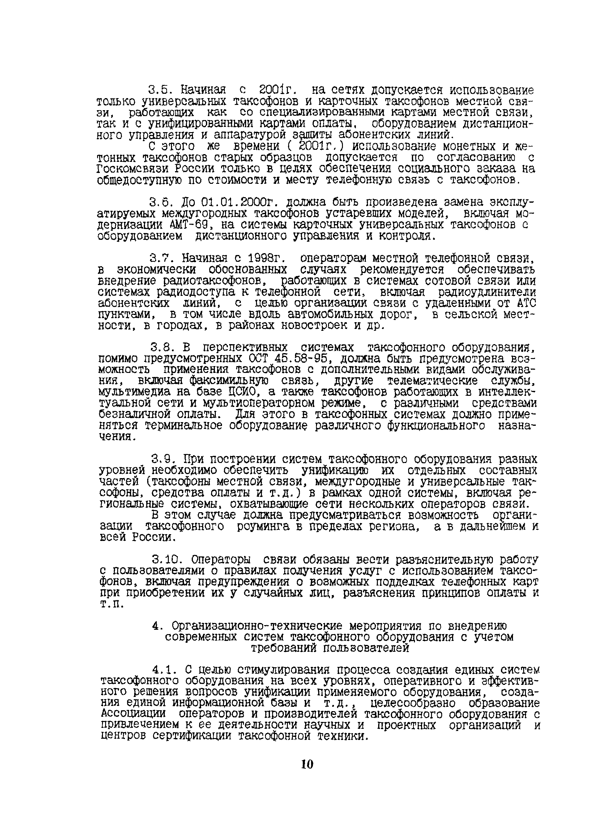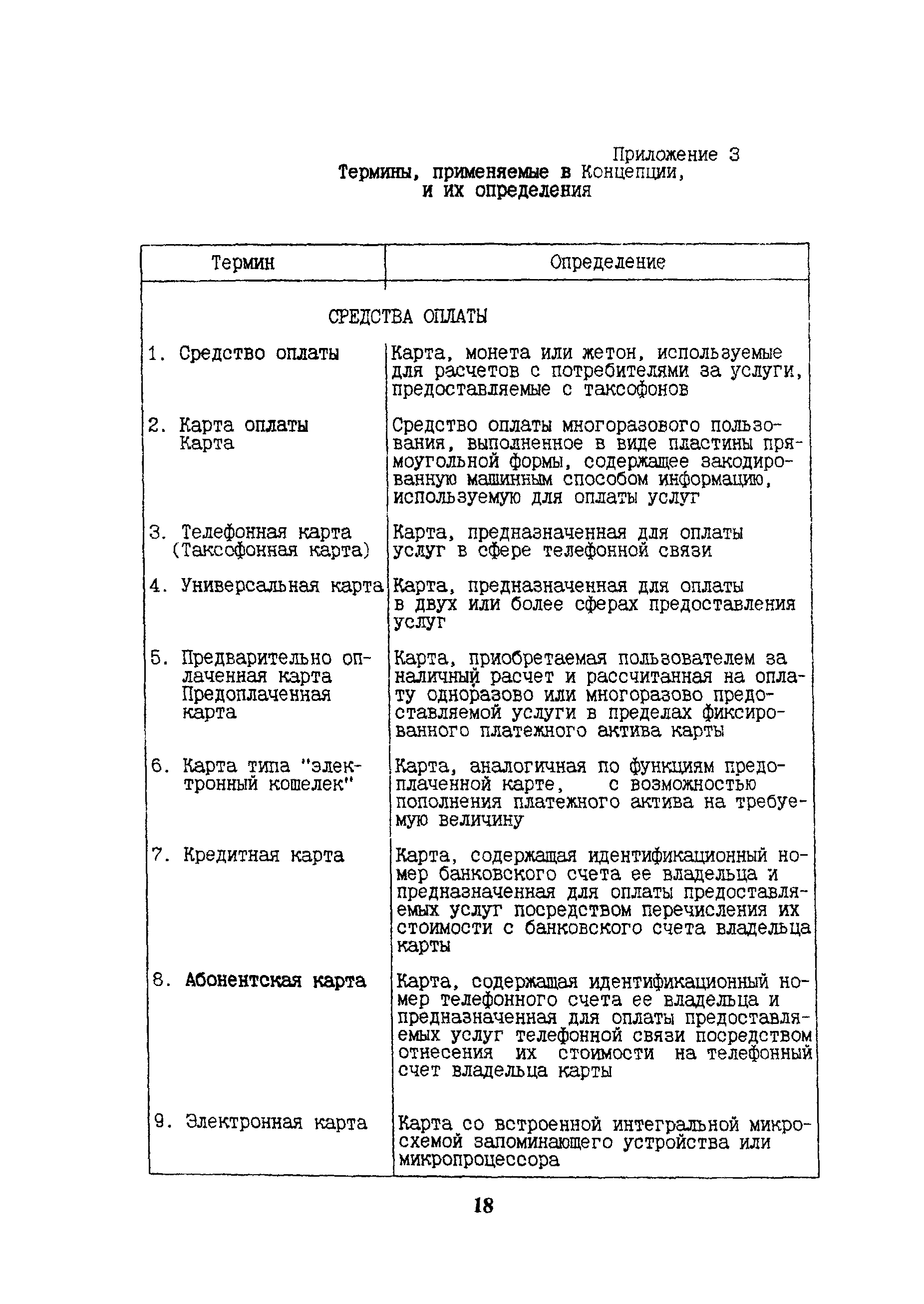 | Оглавление: | Введение 1 Цель и задачи Концепции 2 Состав, классификация таксофонного оборудования 3 Рекомендации по применению таксофонного оборудования 4 Организационно-технические мероприятия по внедрению современных систем таксофонного оборудования с учетом удобства пользователей 5 Плотность размещения таксофонов 6 Нормативная база 7 Основные эксплуатационно-технические требования к перспективному таксофонному оборудованию Приложение 1 Классификация средств оплаты, используемых в таксофонах Приложение 2 Классификация таксофонов Приложение 3 Термины, применяемые в Концепции, и их определения Приложение 4 Перечень сертифицированного таксофонного оборудования, рекомендуемого к использованию на ТФОП России |