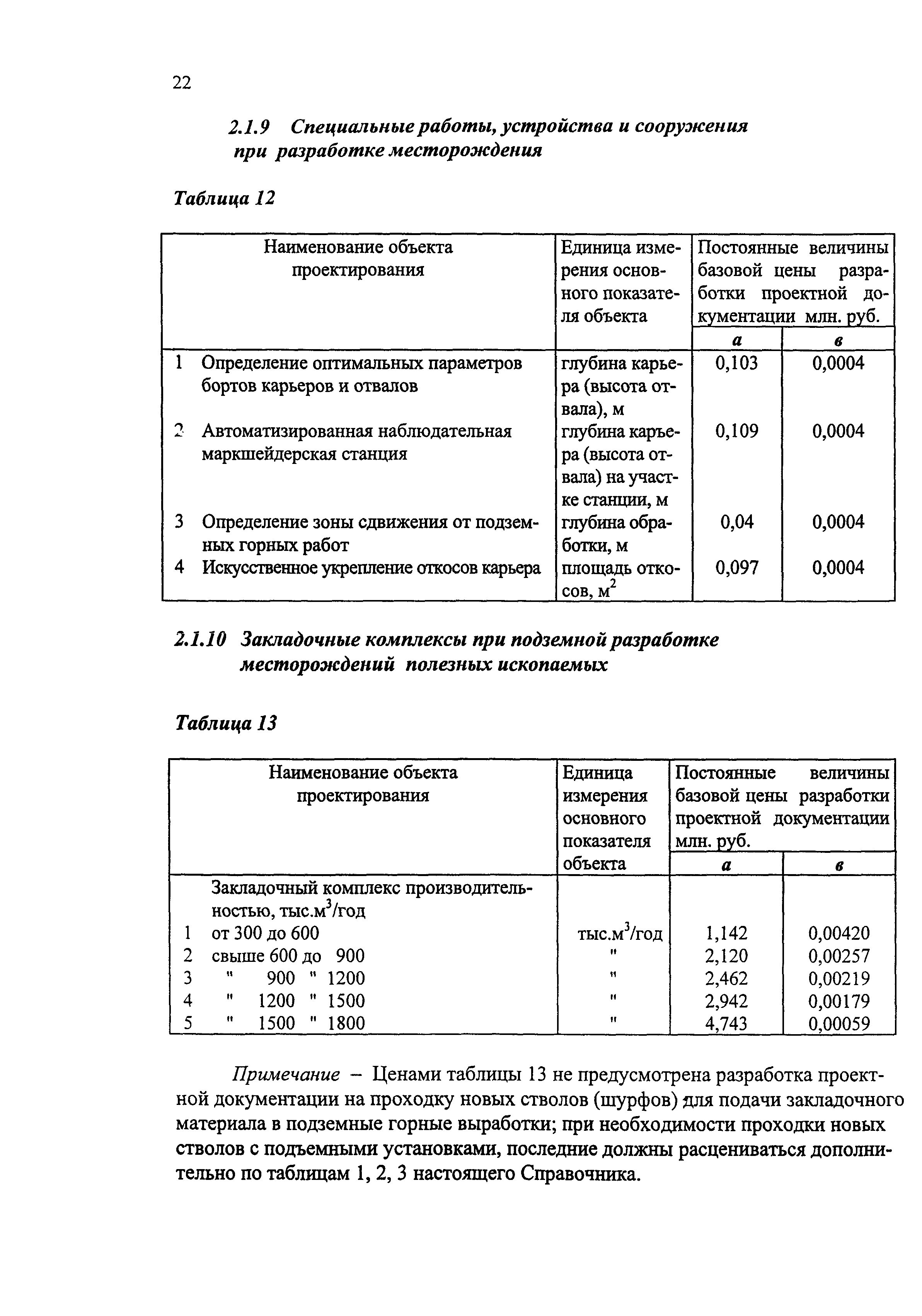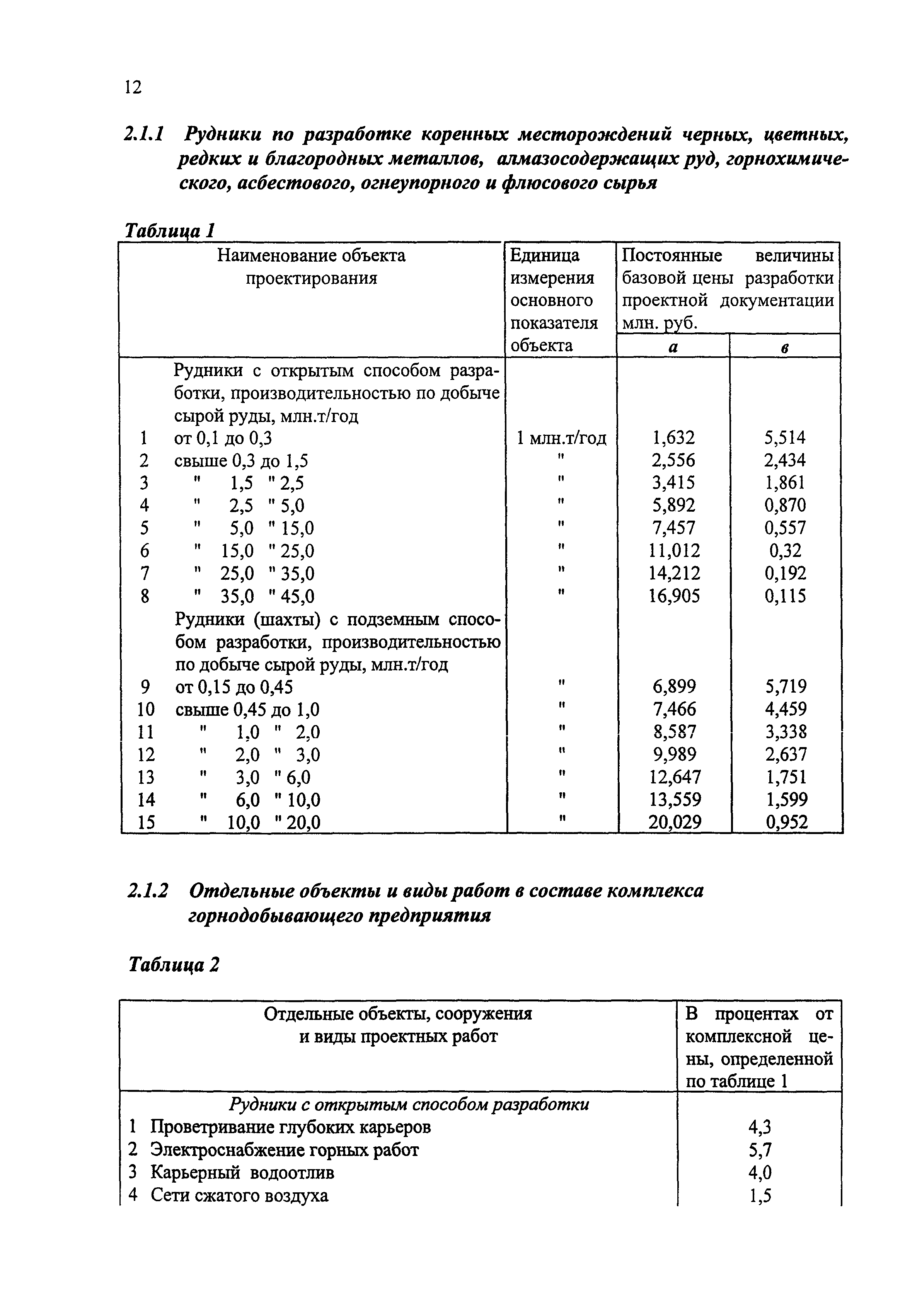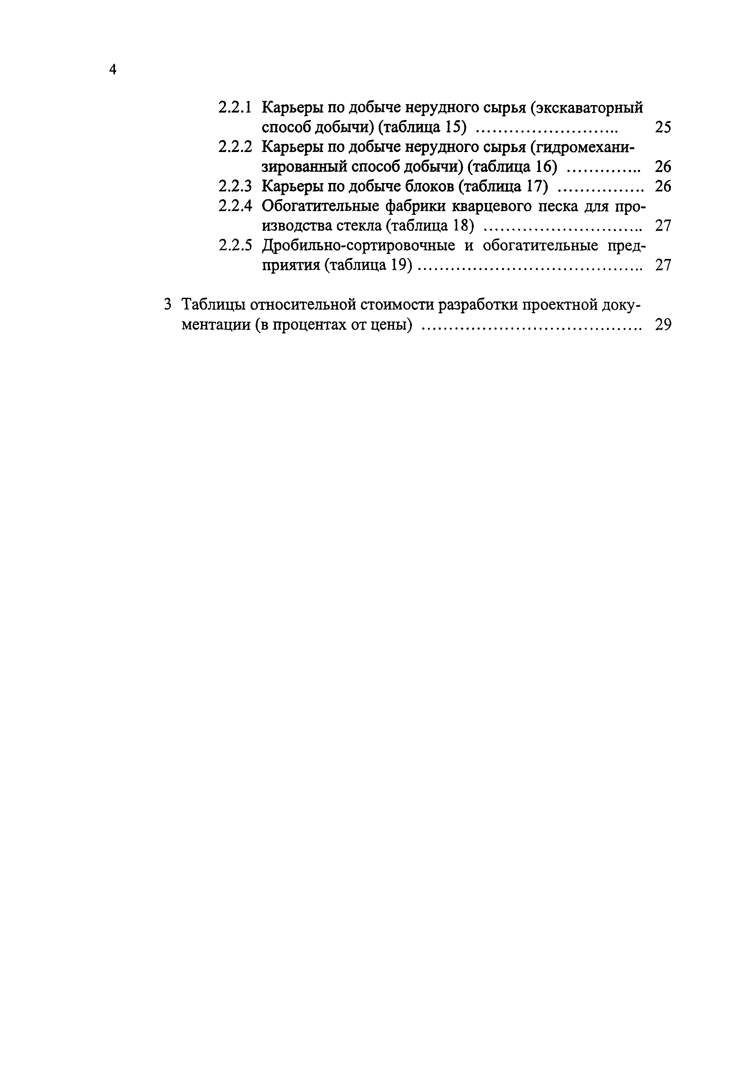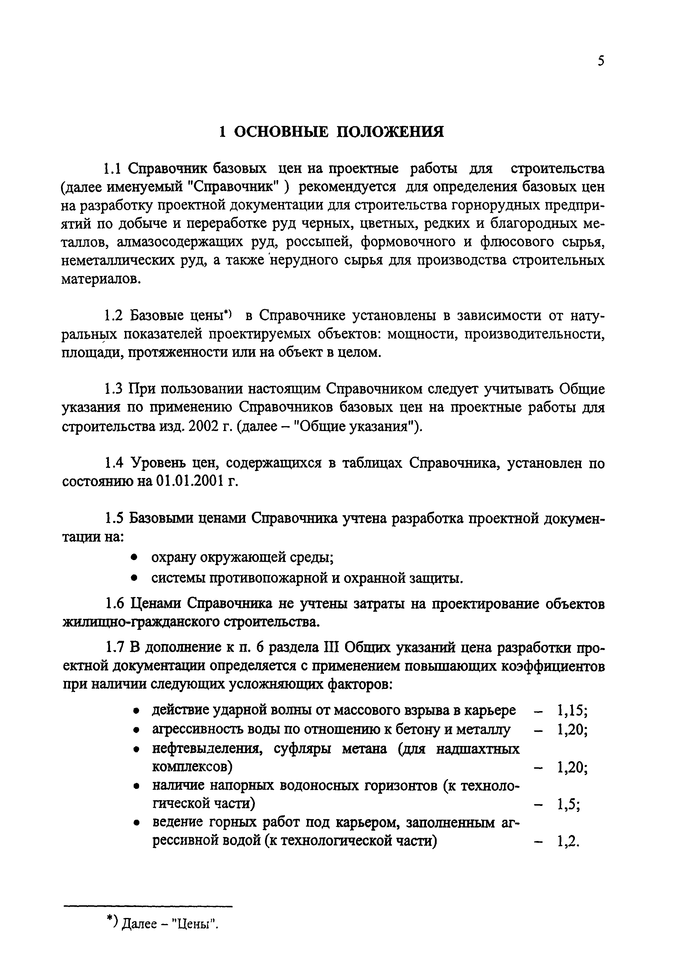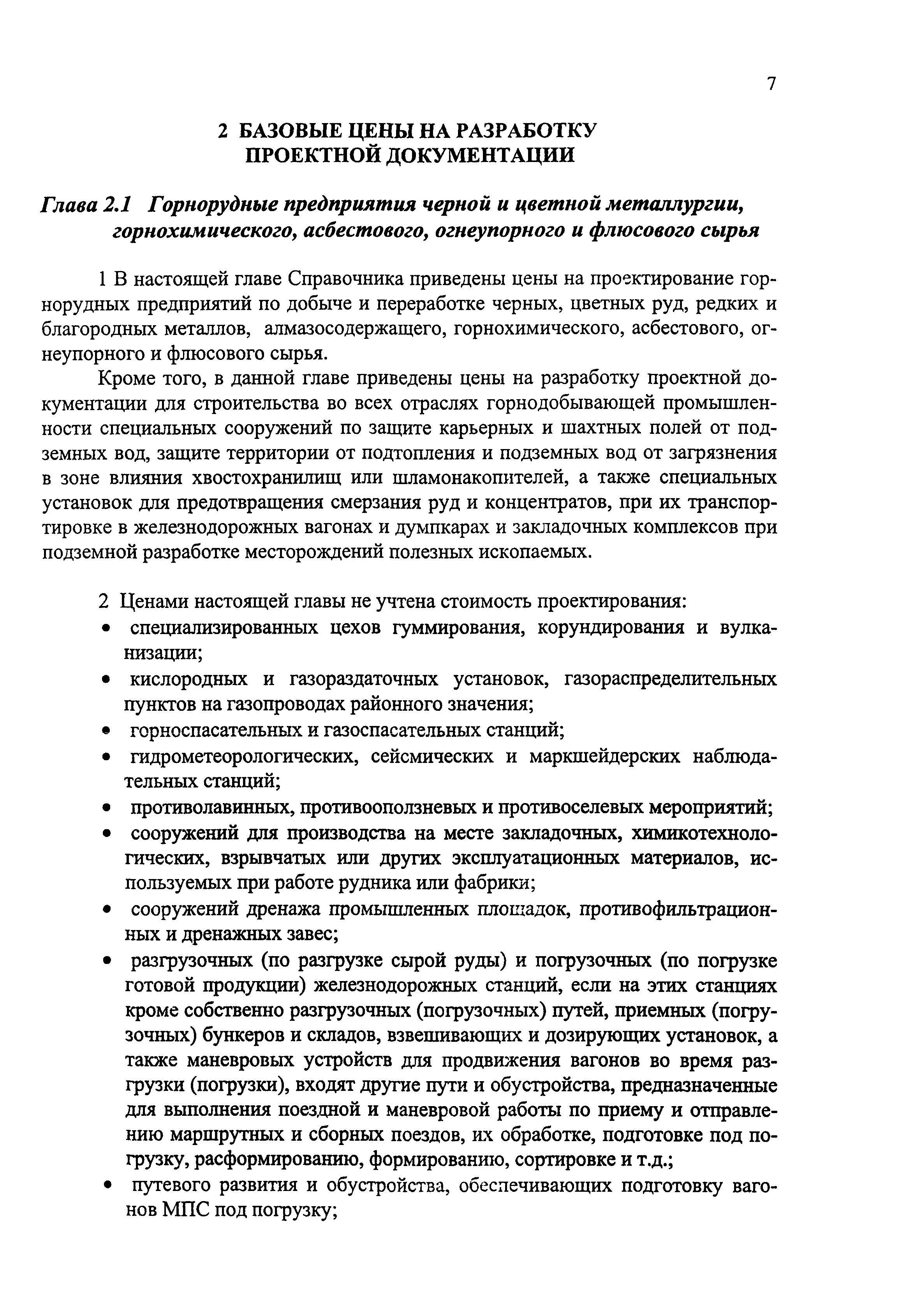 | Оглавление: | 1 Основные положения 2 Базовые цены на разработку проектной документации Глава 2.1 Горнорудные предприятия черной и цветной металлургии, горнохимического, асбестового, огнеупорного и флюсового сырья Глава 2.2 Предприятия нерудных и неметаллорудных строительных материалов 3 Таблицы относительной стоимости разработки проектной документации (в процентах от цены) |