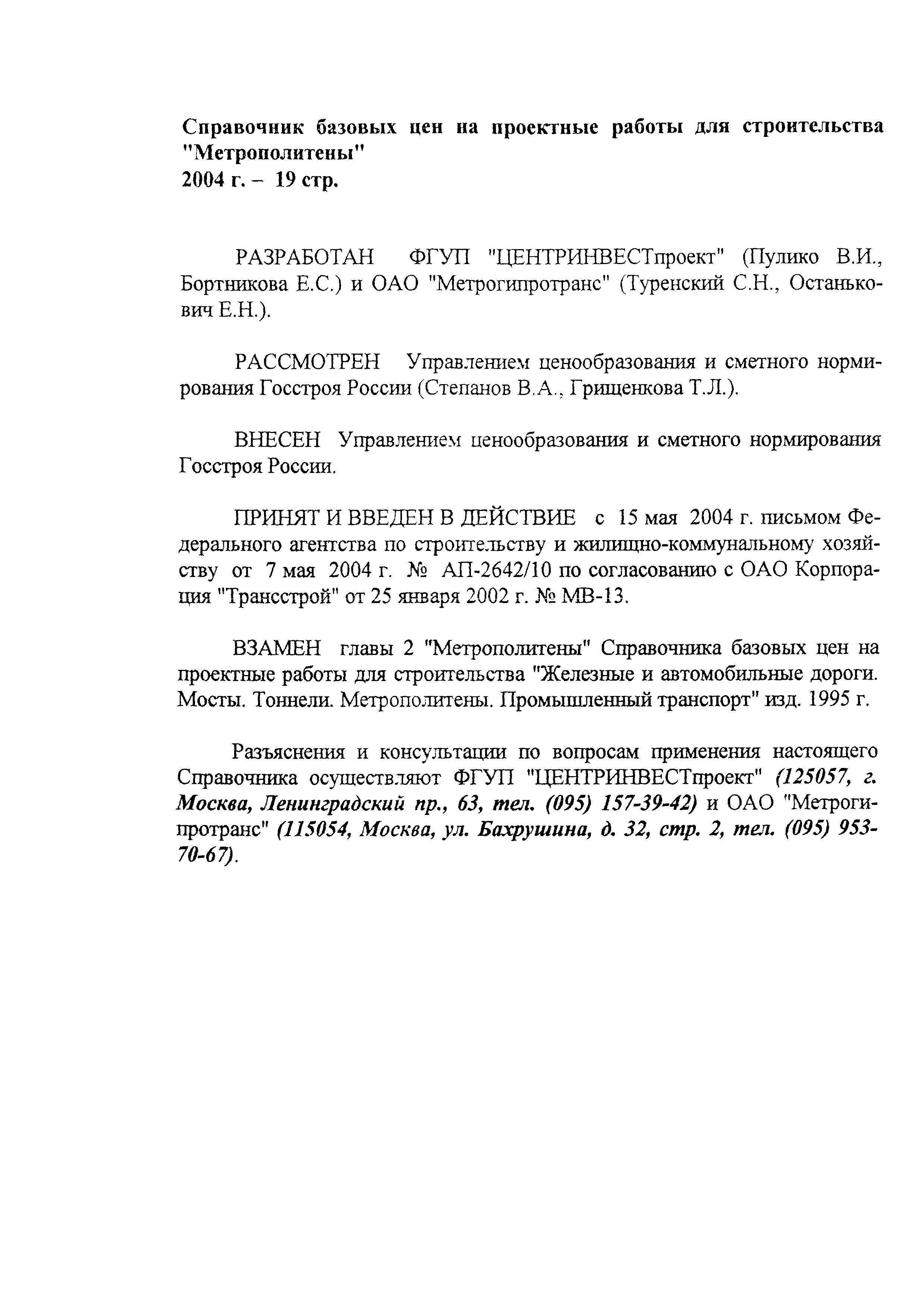 | Область применения: | Рекомендуется для определения базовых цен с целью последующего формирования договорных цен на разработку проектной документации для строительства метрополитенов. |