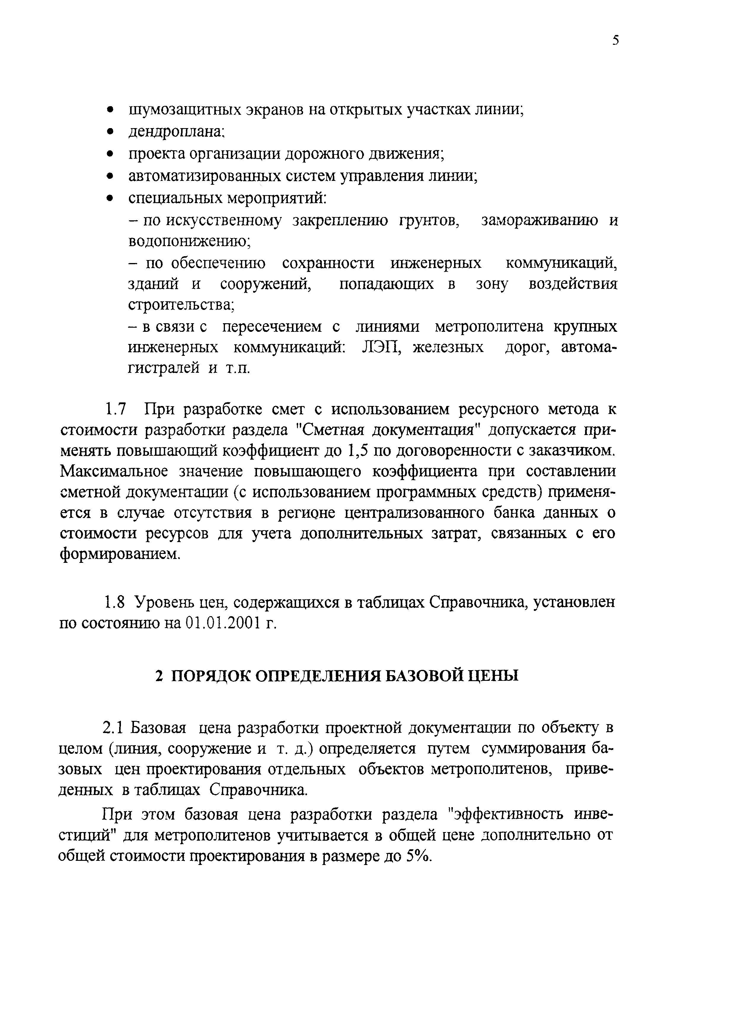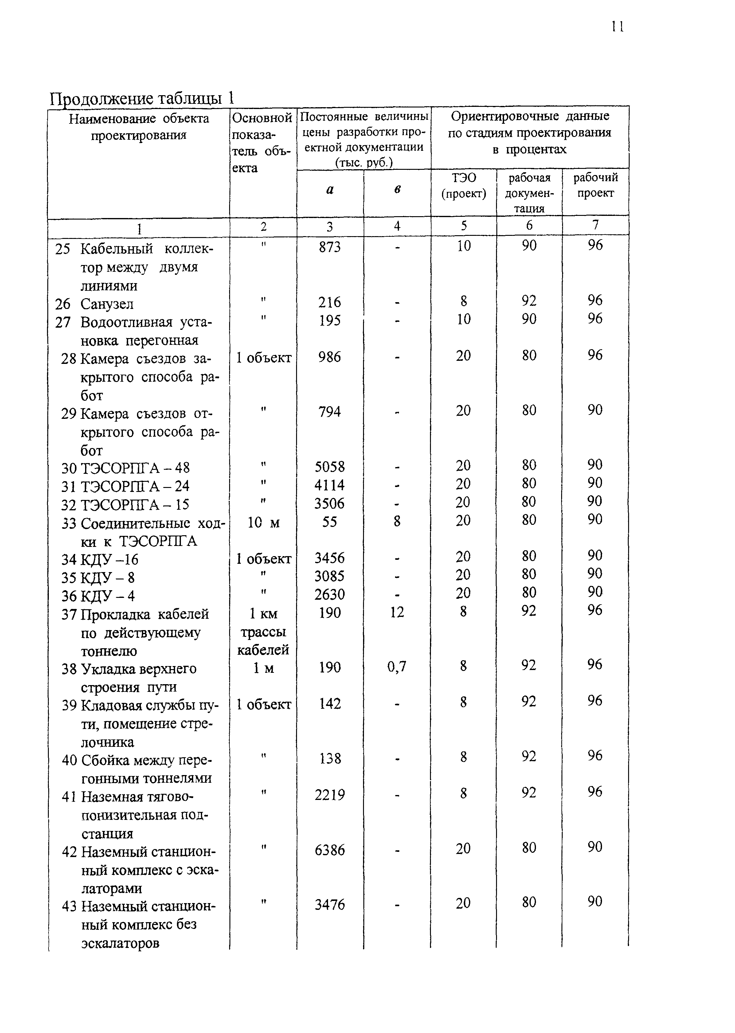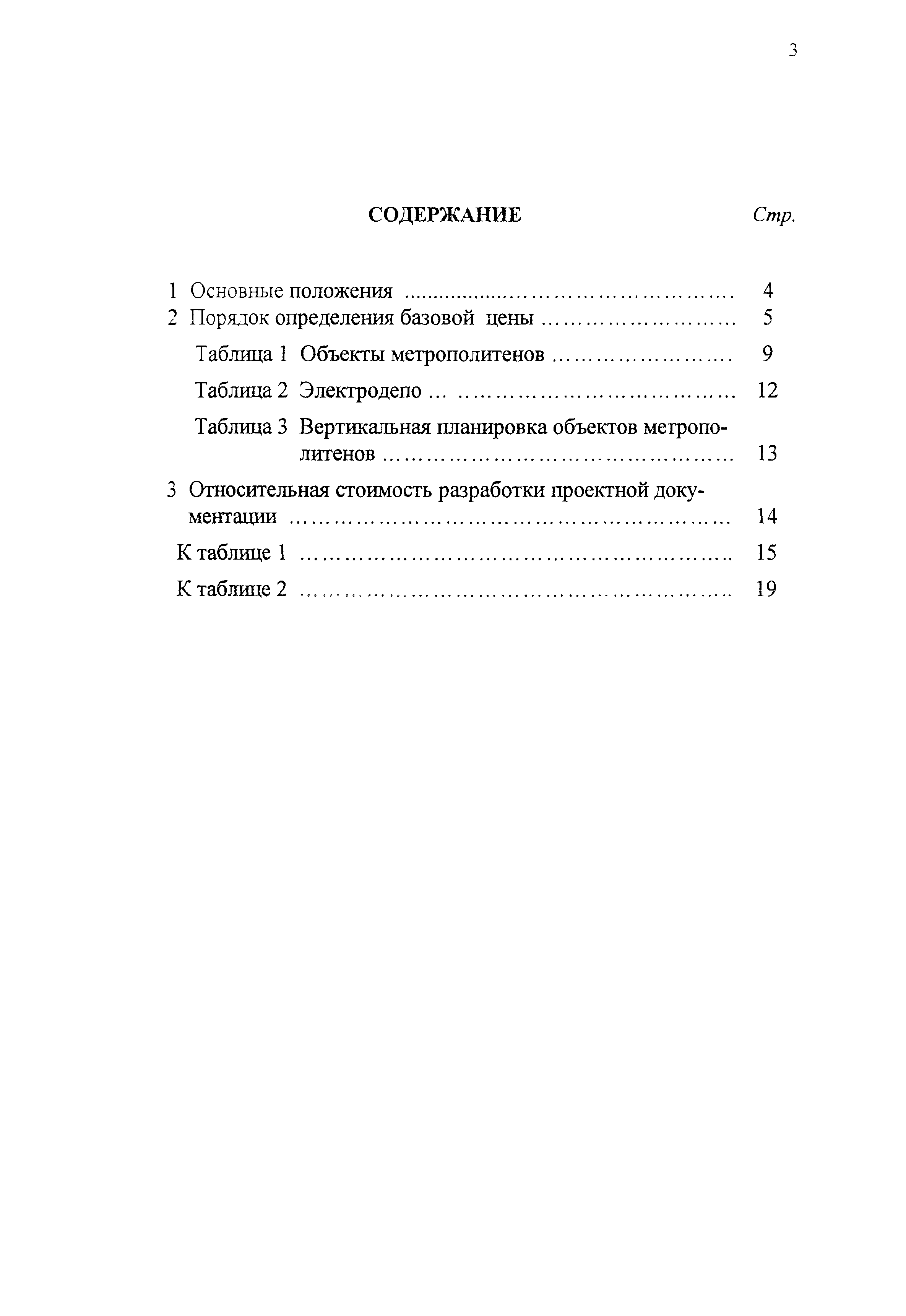 | Оглавление: | 1 Основные положения 2 Порядок определения базовой цены Таблица 1 Объекты метрополитенов Таблица 2 Электродепо Таблица 3 Вертикальная планировка объектов метрополитенов 3 Относительная стоимость разработки проектной документации |