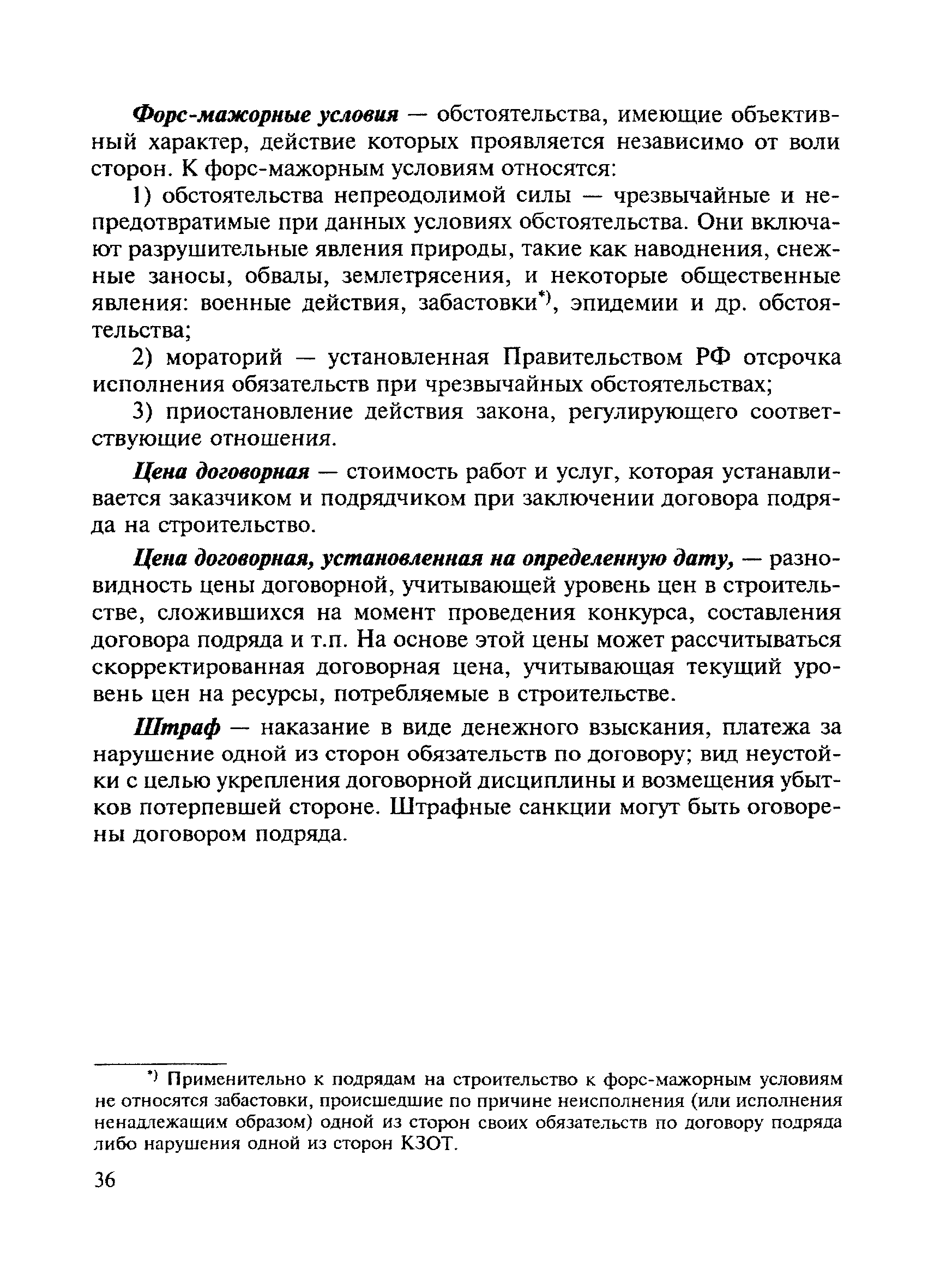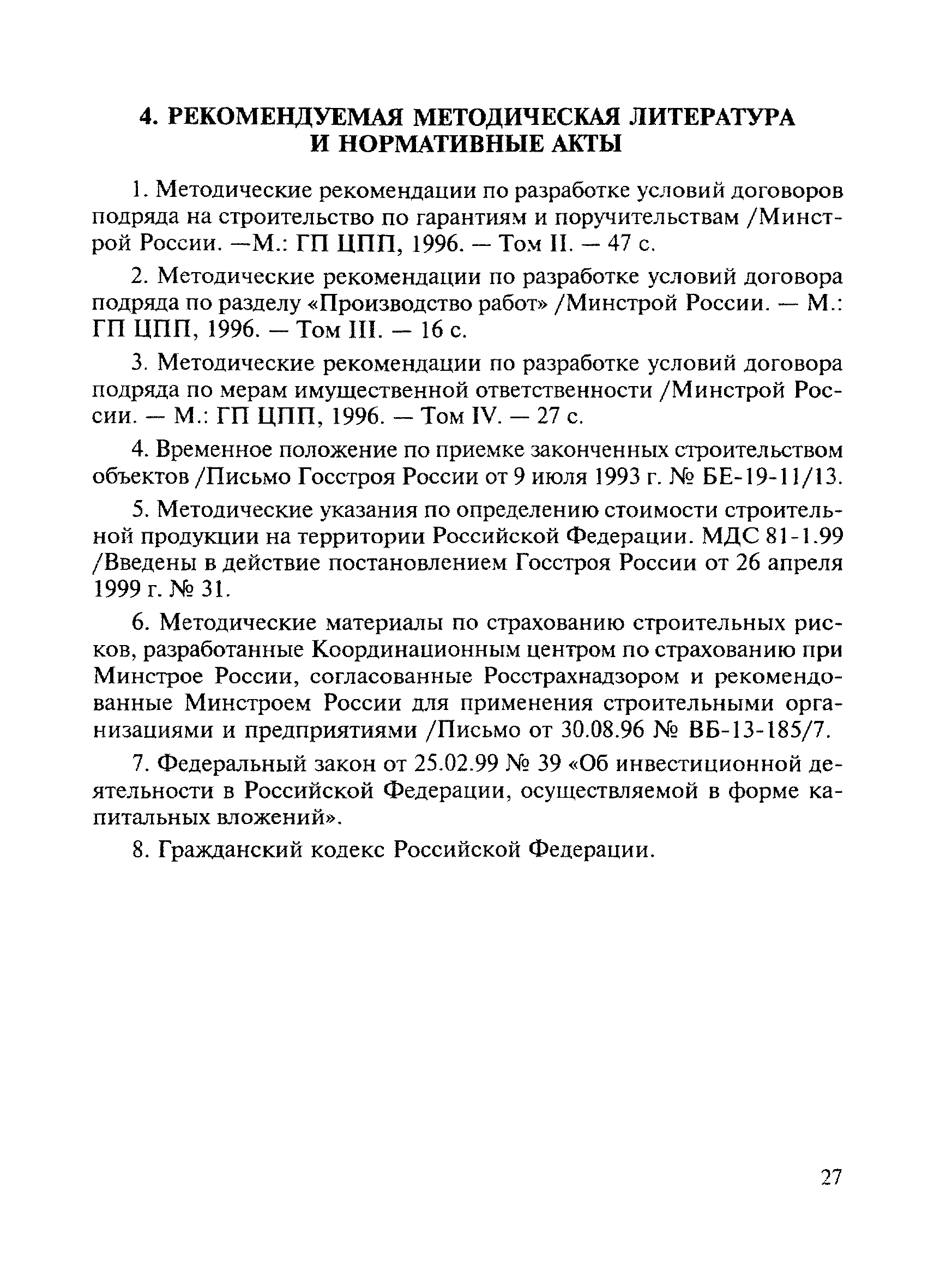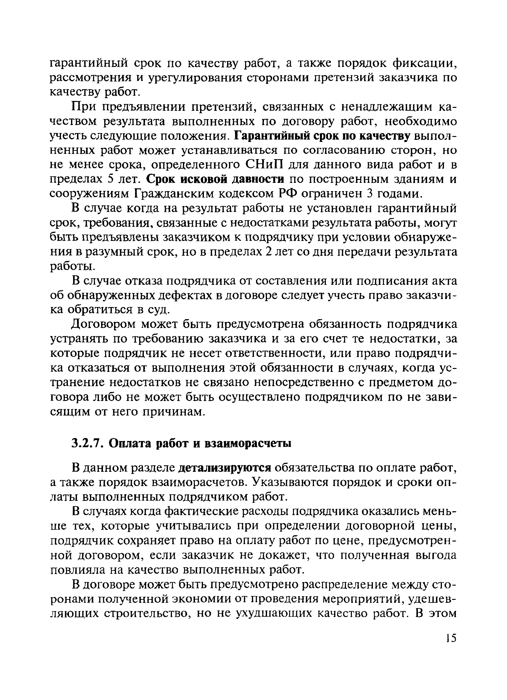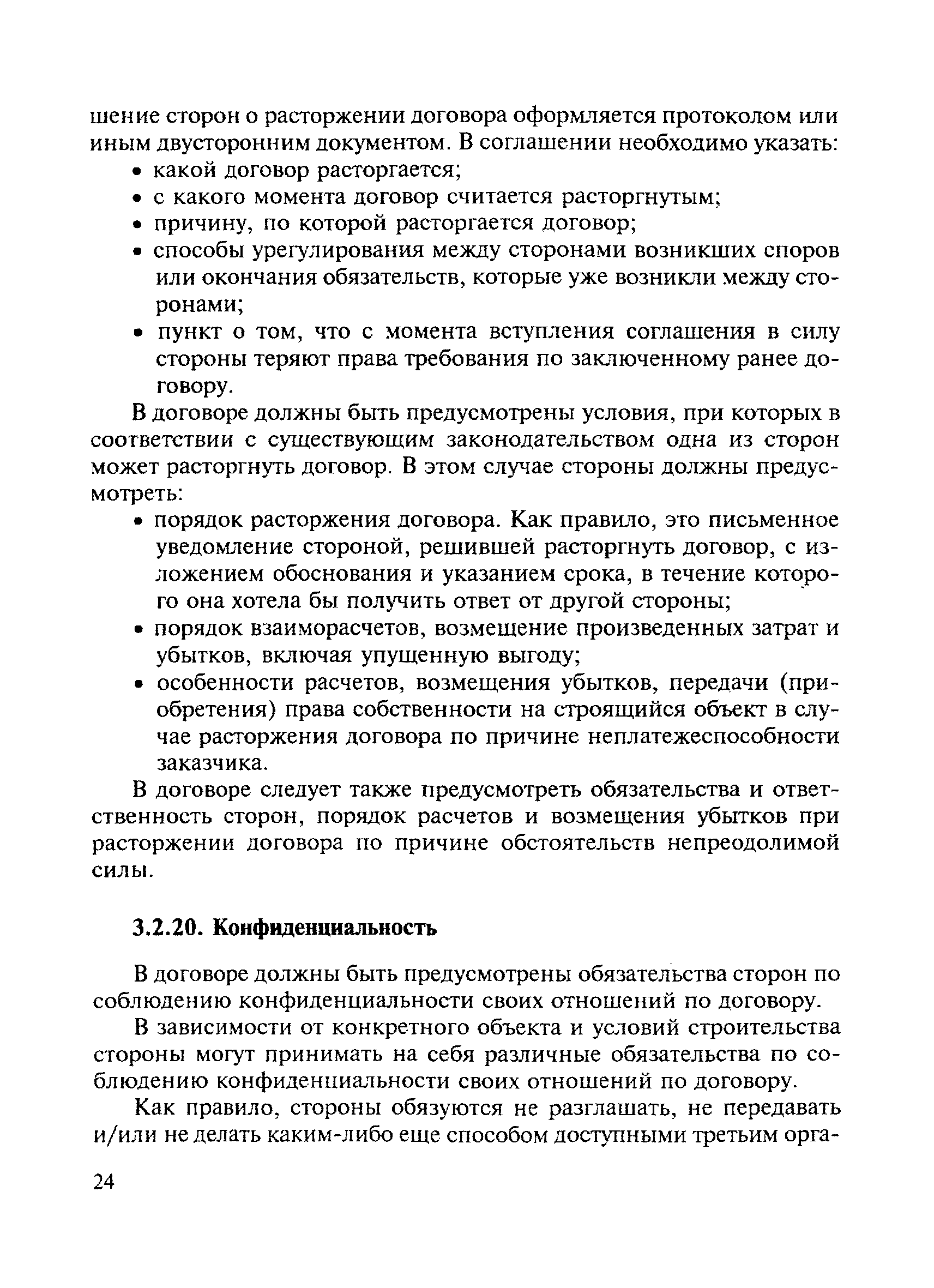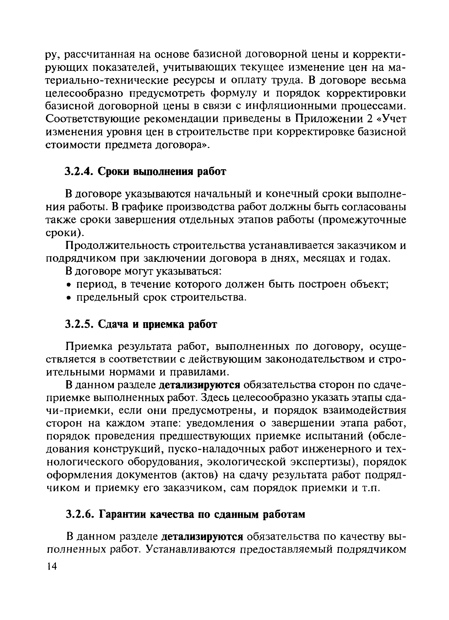 | Оглавление: | Введение 1 Основные положения 2 Преддоговорная работа 2.1. Порядок подготовки решений по договору, заключаемому по результатам конкурса на работы и услуги в строительстве 2.2. Порядок подготовки решений по договору, составлению которого не предшествует конкурс 22.1. Учет интересов сторон 2.2.2. Виды договоров и процедура их формирования 2.2.3. Принятие совместных решений 3. Составление текста договора подряда на строительство 3.1. Рекомендации по порядку составления договора 3.2. Рекомендации по условиям договора 3.2.1. Преамбула договора 3.2.2. Предмет договора 3.2.3. Стоимость работ по договору 3.2.4. Сроки выполнения работ 3.2.5. Сдача и приемка работ 3.2.6. Гарантии качества по сданным работам 3.2.7. Оплата работ и взаиморасчеты 3.2.8. Обязательства сторон 3.2.9. Имущественная ответственность сторон 3.2.10. Обеспечение строительства материалами и оборудованием 3.2.11. Охранные мероприятия 3.2.12. Страхование объекта строительства 3.2.13. Контроль и надзор за выполнением работ 3.2.14. Журнал производства работ 3.2.15. Строительная площадка 3.2.16. Скрытые работы 3.2.17. Изменение условий реализации договора 3.2.18. Гарантии и поручительства 3.2.19. Порядок расторжения договора 3.2.20. Конфиденциальность 3.2.21. Реквизиты сторон 3.2.22. Дополнительные условия 4. Рекомендуемая методическая литература и нормативные акты Приложение 1. Словарь терминов Приложение 2. Учет изменения уровня цен в строительстве при корректировке договорной цены, уставовленной на определенную дату Приложение 3. Договор подряда на строительство объекта Приложение 4. Договор подряда на выполнение комплекса строительных (монтажных) работ Приложение 5. Перечень источников, привлеченных для разработки |