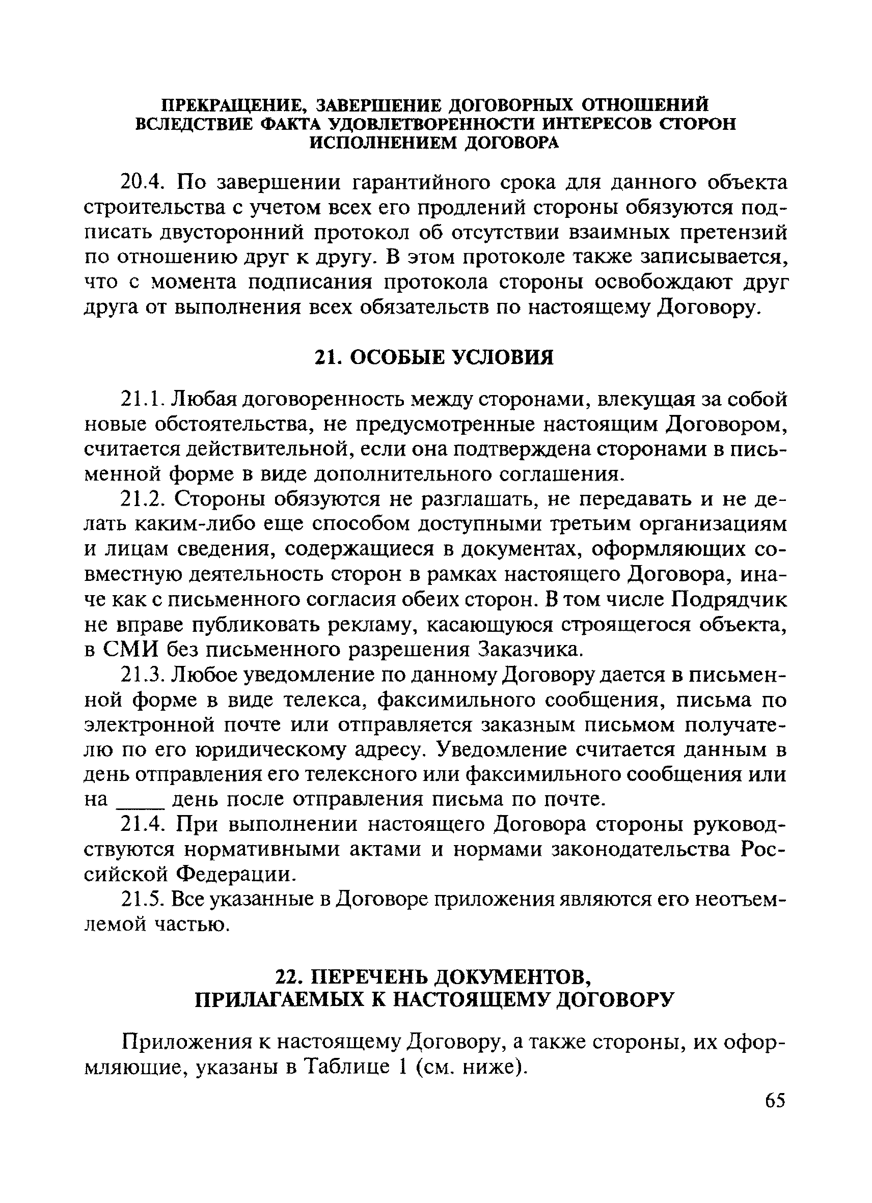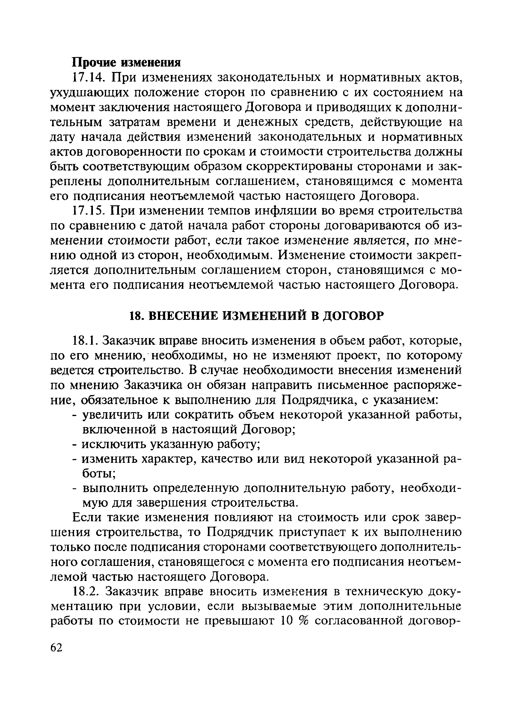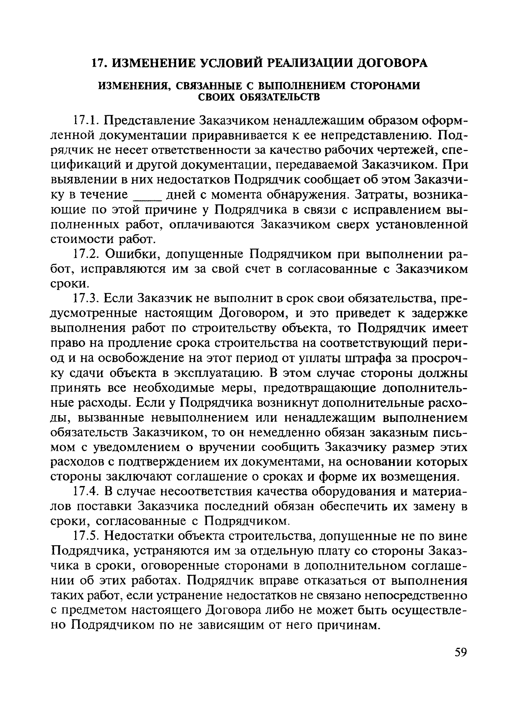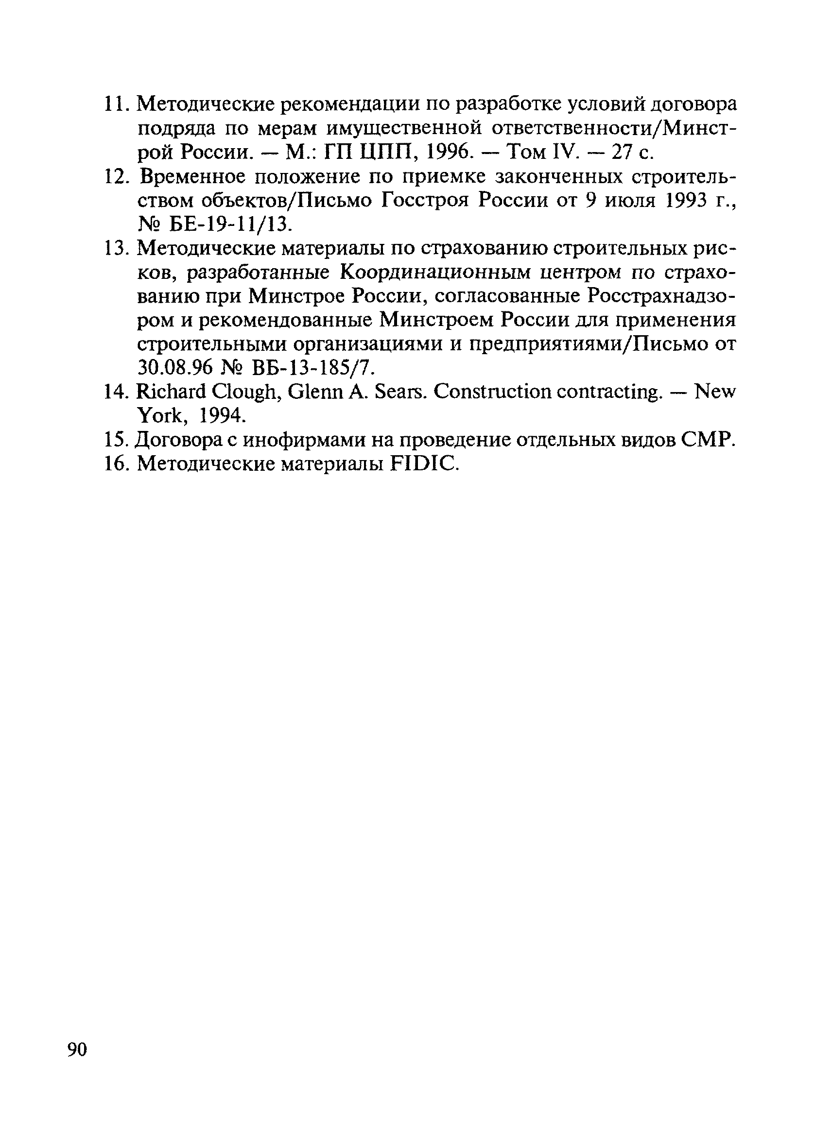| Оглавление: | Введение 1 Основные положения 2 Преддоговорная работа 2.1. Порядок подготовки решений по договору, заключаемому по результатам конкурса на работы и услуги в строительстве 2.2. Порядок подготовки решений по договору, составлению которого не предшествует конкурс 22.1. Учет интересов сторон 2.2.2. Виды договоров и процедура их формирования 2.2.3. Принятие совместных решений 3. Составление текста договора подряда на строительство 3.1. Рекомендации по порядку составления договора 3.2. Рекомендации по условиям договора 3.2.1. Преамбула договора 3.2.2. Предмет договора 3.2.3. Стоимость работ по договору 3.2.4. Сроки выполнения работ 3.2.5. Сдача и приемка работ 3.2.6. Гарантии качества по сданным работам 3.2.7. Оплата работ и взаиморасчеты 3.2.8. Обязательства сторон 3.2.9. Имущественная ответственность сторон 3.2.10. Обеспечение строительства материалами и оборудованием 3.2.11. Охранные мероприятия 3.2.12. Страхование объекта строительства 3.2.13. Контроль и надзор за выполнением работ 3.2.14. Журнал производства работ 3.2.15. Строительная площадка 3.2.16. Скрытые работы 3.2.17. Изменение условий реализации договора 3.2.18. Гарантии и поручительства 3.2.19. Порядок расторжения договора 3.2.20. Конфиденциальность 3.2.21. Реквизиты сторон 3.2.22. Дополнительные условия 4. Рекомендуемая методическая литература и нормативные акты Приложение 1. Словарь терминов Приложение 2. Учет изменения уровня цен в строительстве при корректировке договорной цены, уставовленной на определенную дату Приложение 3. Договор подряда на строительство объекта Приложение 4. Договор подряда на выполнение комплекса строительных (монтажных) работ Приложение 5. Перечень источников, привлеченных для разработки |