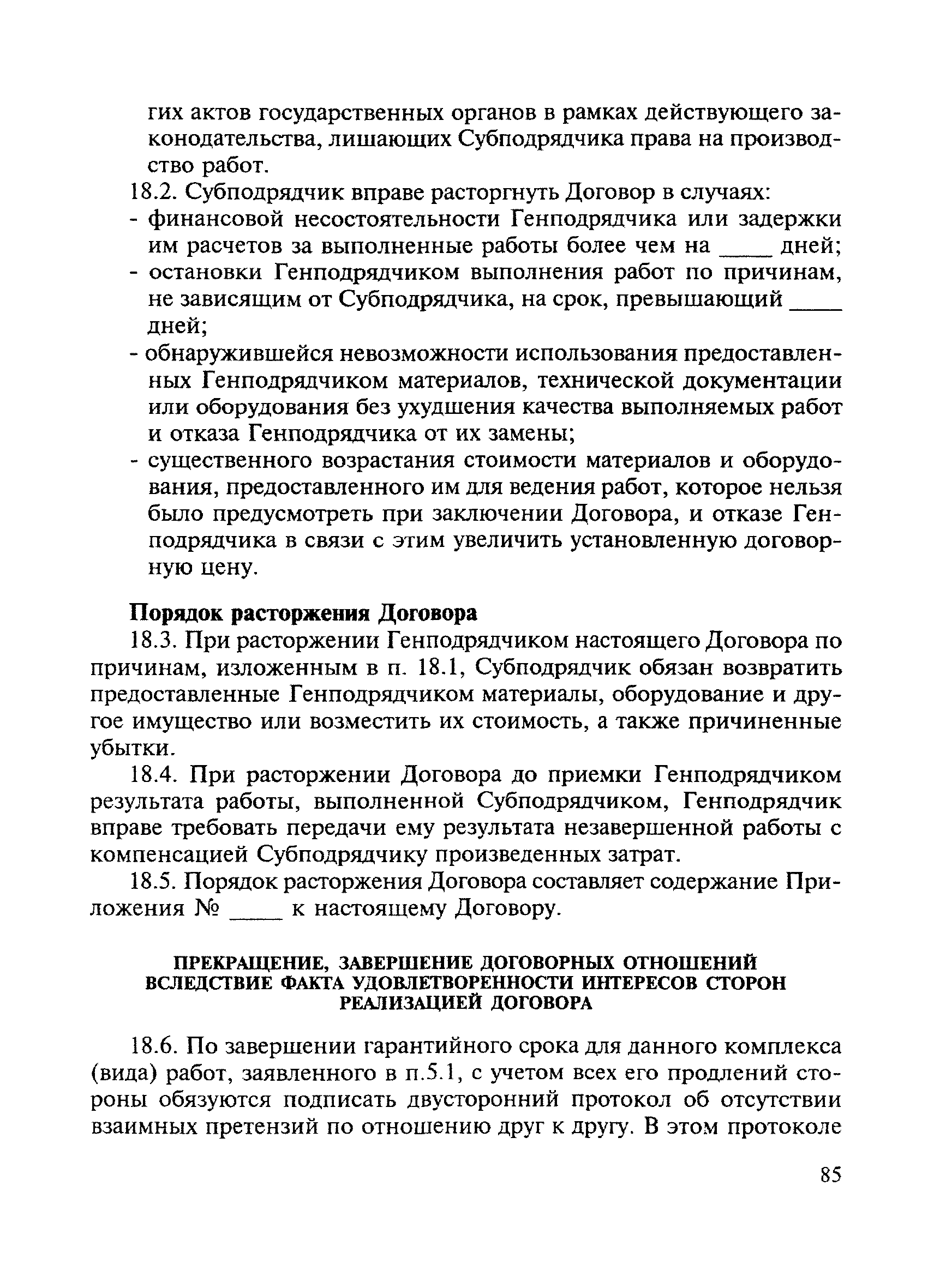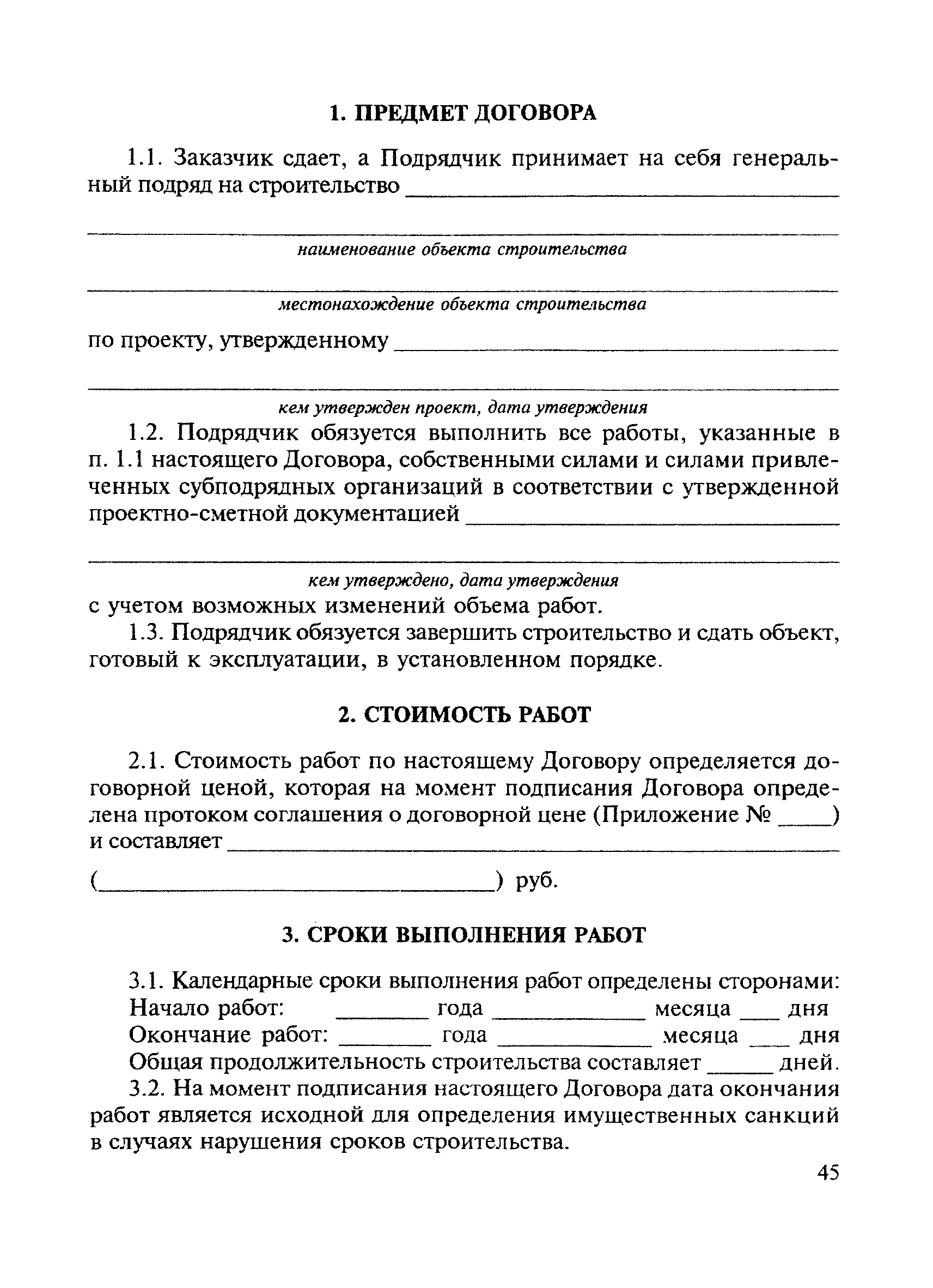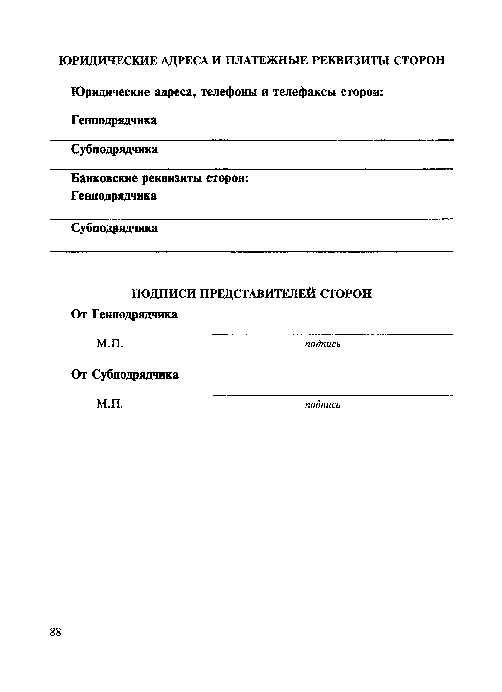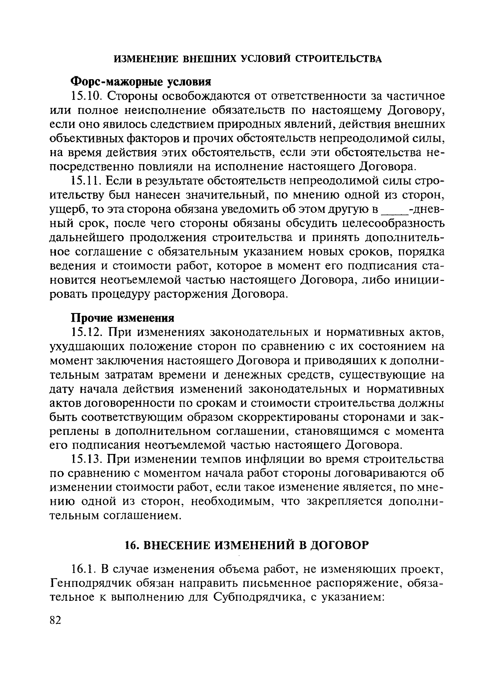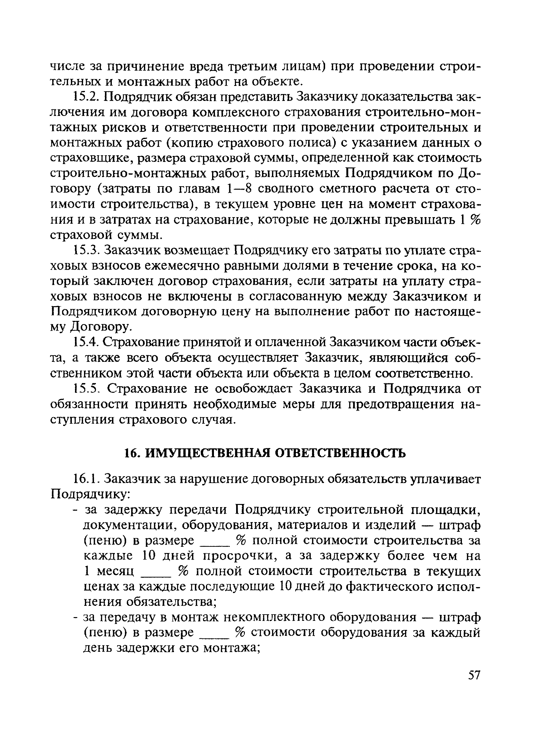 | Оглавление: | Введение 1 Основные положения 2 Преддоговорная работа 2.1. Порядок подготовки решений по договору, заключаемому по результатам конкурса на работы и услуги в строительстве 2.2. Порядок подготовки решений по договору, составлению которого не предшествует конкурс 22.1. Учет интересов сторон 2.2.2. Виды договоров и процедура их формирования 2.2.3. Принятие совместных решений 3. Составление текста договора подряда на строительство 3.1. Рекомендации по порядку составления договора 3.2. Рекомендации по условиям договора 3.2.1. Преамбула договора 3.2.2. Предмет договора 3.2.3. Стоимость работ по договору 3.2.4. Сроки выполнения работ 3.2.5. Сдача и приемка работ 3.2.6. Гарантии качества по сданным работам 3.2.7. Оплата работ и взаиморасчеты 3.2.8. Обязательства сторон 3.2.9. Имущественная ответственность сторон 3.2.10. Обеспечение строительства материалами и оборудованием 3.2.11. Охранные мероприятия 3.2.12. Страхование объекта строительства 3.2.13. Контроль и надзор за выполнением работ 3.2.14. Журнал производства работ 3.2.15. Строительная площадка 3.2.16. Скрытые работы 3.2.17. Изменение условий реализации договора 3.2.18. Гарантии и поручительства 3.2.19. Порядок расторжения договора 3.2.20. Конфиденциальность 3.2.21. Реквизиты сторон 3.2.22. Дополнительные условия 4. Рекомендуемая методическая литература и нормативные акты Приложение 1. Словарь терминов Приложение 2. Учет изменения уровня цен в строительстве при корректировке договорной цены, уставовленной на определенную дату Приложение 3. Договор подряда на строительство объекта Приложение 4. Договор подряда на выполнение комплекса строительных (монтажных) работ Приложение 5. Перечень источников, привлеченных для разработки |