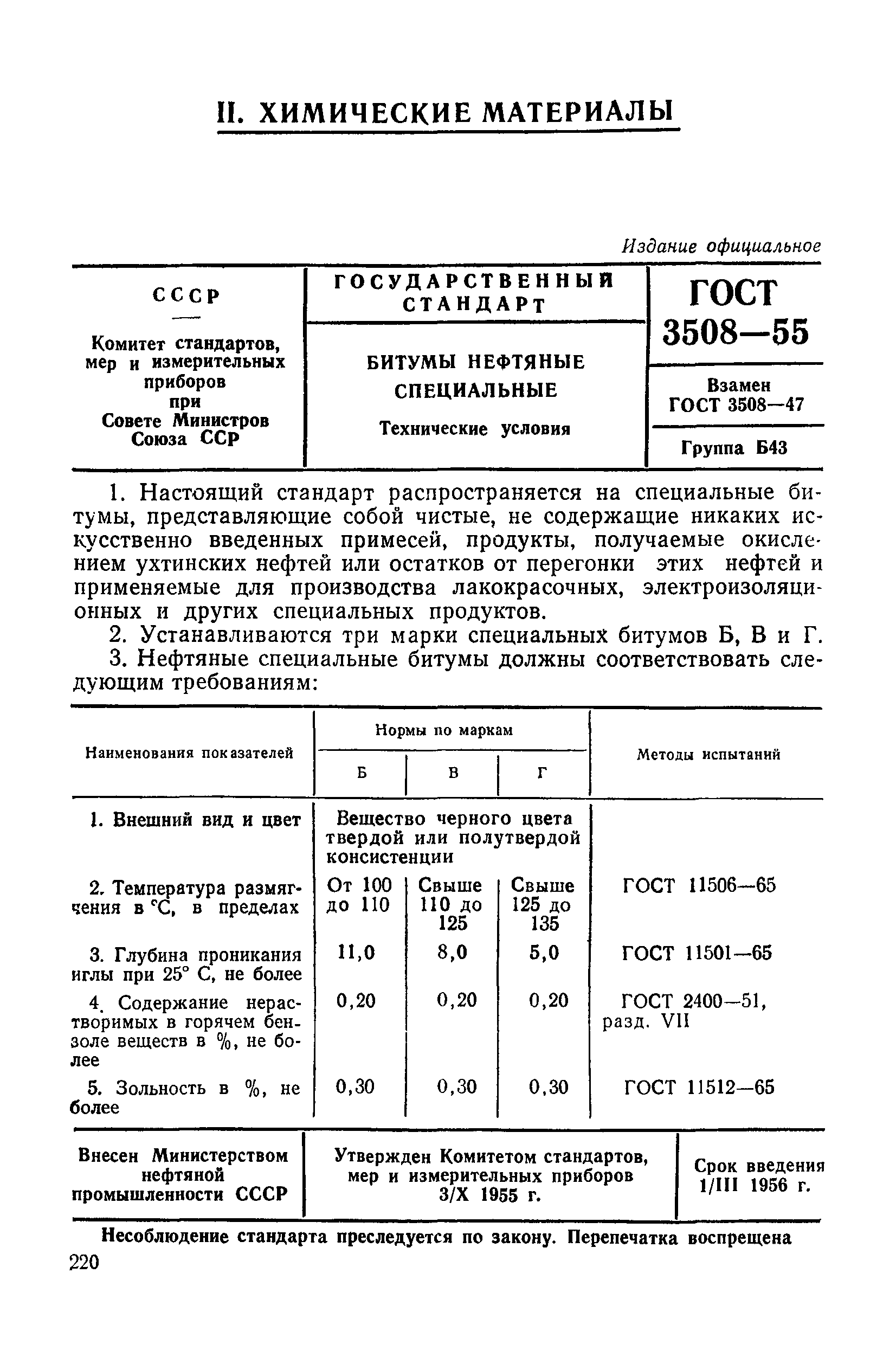 Скачать ГОСТ 3508-55 Битумы нефтяные специальные. Технические условияДата актуализации: 01.01.2021
