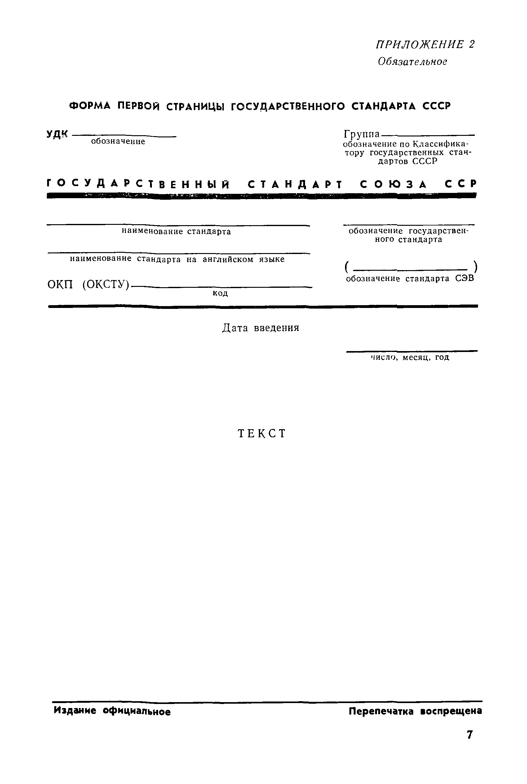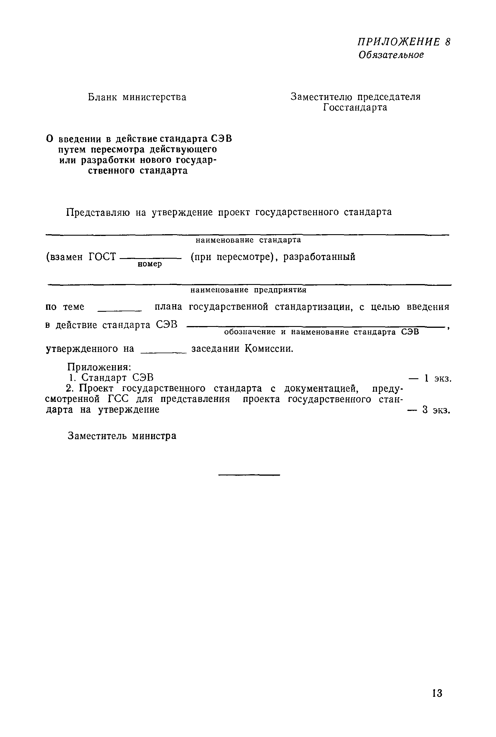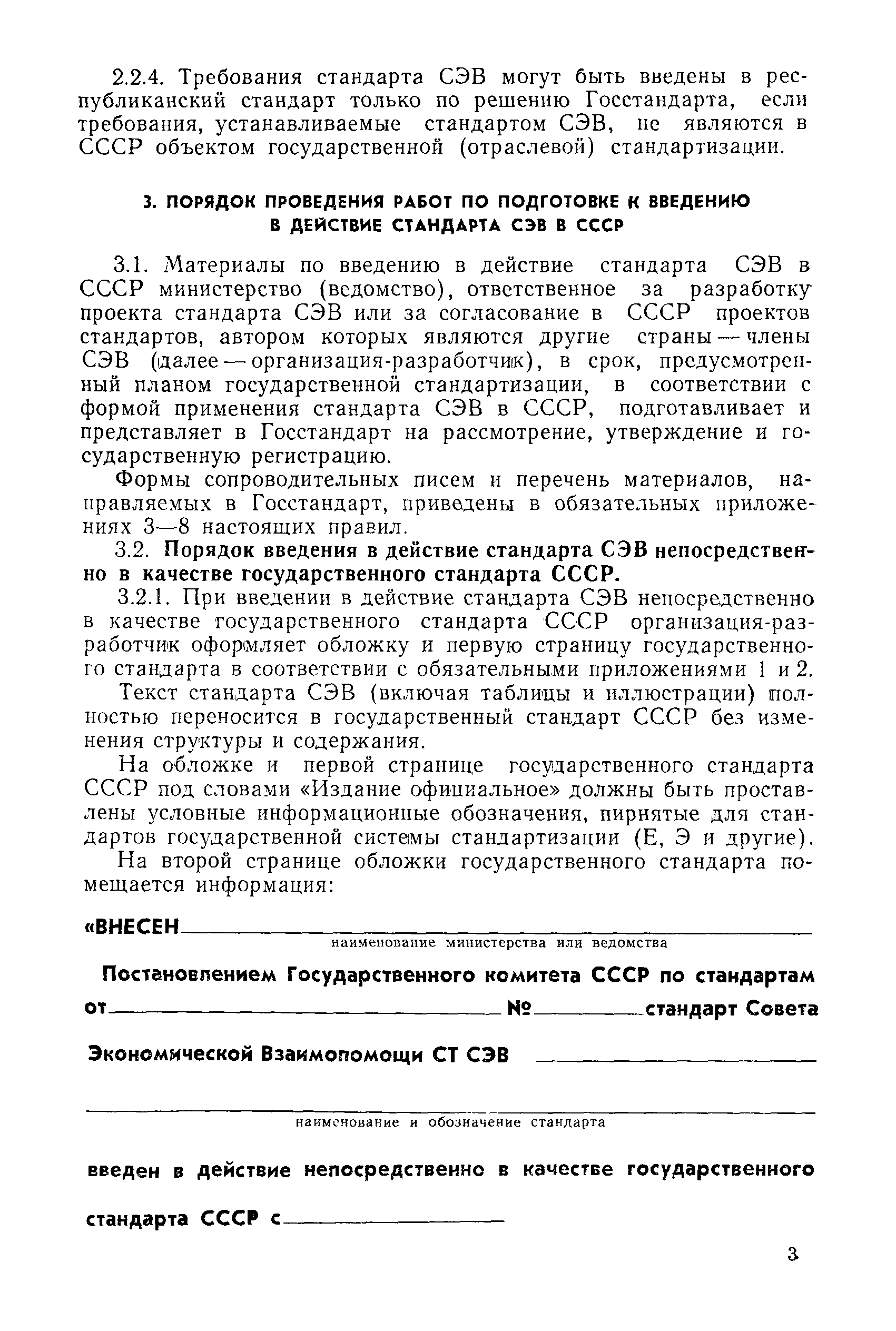 | Оглавление: | 1 Общие положения 2 Формы применения стандартов СЭВ в народном хозяйстве СССР 2.1 Применение стандарта СЭВ непосредственно в качестве государственного стандарта СССР. 2.2 Применение стандарта СЭВ путем введения его в государственный (отраслевой) стандарт. 3 Порядок проведения работ по подготовке к введению в действие стандарта СЭВ в СССР Приложение 1 (обязательное). Форма обложки государственного стандарта СССР Приложение 2 (обязательное). Форма первой страницы государственного стандарта СССР Приложение 3 (обязательное). О введении в действие стандарта СЭВ непосредственно в качестве государственного стандарта СССР Приложение 4 (обязательное). О введении в действие стандарта СЭВ путем внесения изменения в действующий государственный стандарт (при полном соответствии показателей государственного стандарта показателям стандарта СЭВ) Приложение 5 (обязательное). О введении в действие стандарта СЭВ путем внесения изменения в действующий государственный стандарт (при необходимости внесения в государственный стандарт дополнительных требований) Приложение 6 (обязательное). О введении в действие стандарта СЭВ путем разработки нового или внесения изменения в действующий отраслевой стандарт (при полном соответствии показателей отраслевого стандарта показателям стандарта СЭВ) Приложение 7 (обязательное). О введении в действие стандарта СЭВ путем разработки нового, пересмотра или внесения изменения в действующий отраслевой стандарт (при необходимости внесения в отраслевой стандарт дополнительных требований) Приложение 8 (обязательное). О введении в действие стандарта СЭВ путем пересмотра действующего или разработки нового государственного стандарта Приложение 9 (обязательное). Сведения о соответствии ссылок на стандарты СЭВ ссылкам на государственные стандарты Приложение 10 (обязательное). Соответствие требовании СТ СЭВ требованиям ГОСТ (ОСТ) |