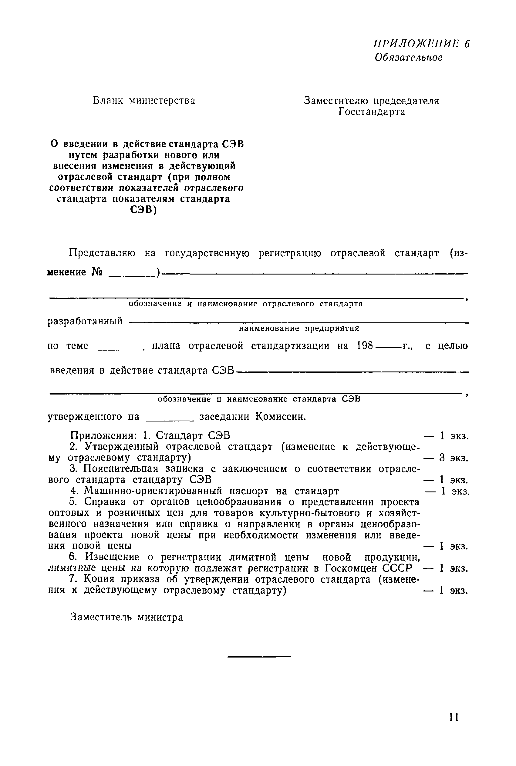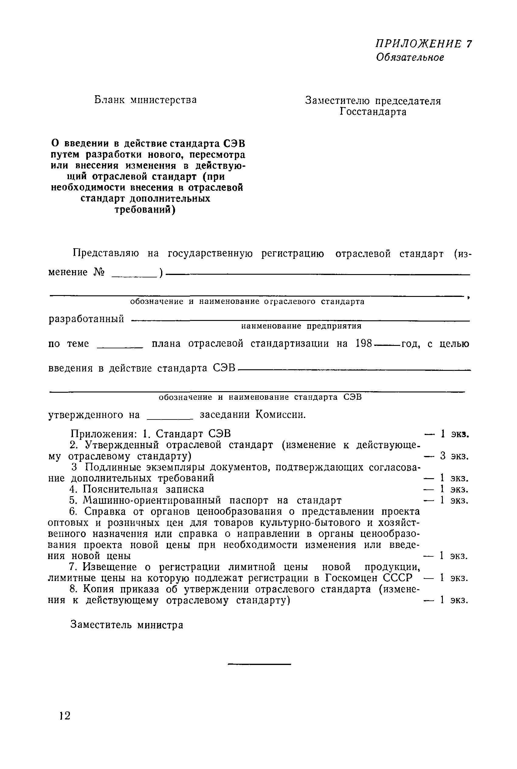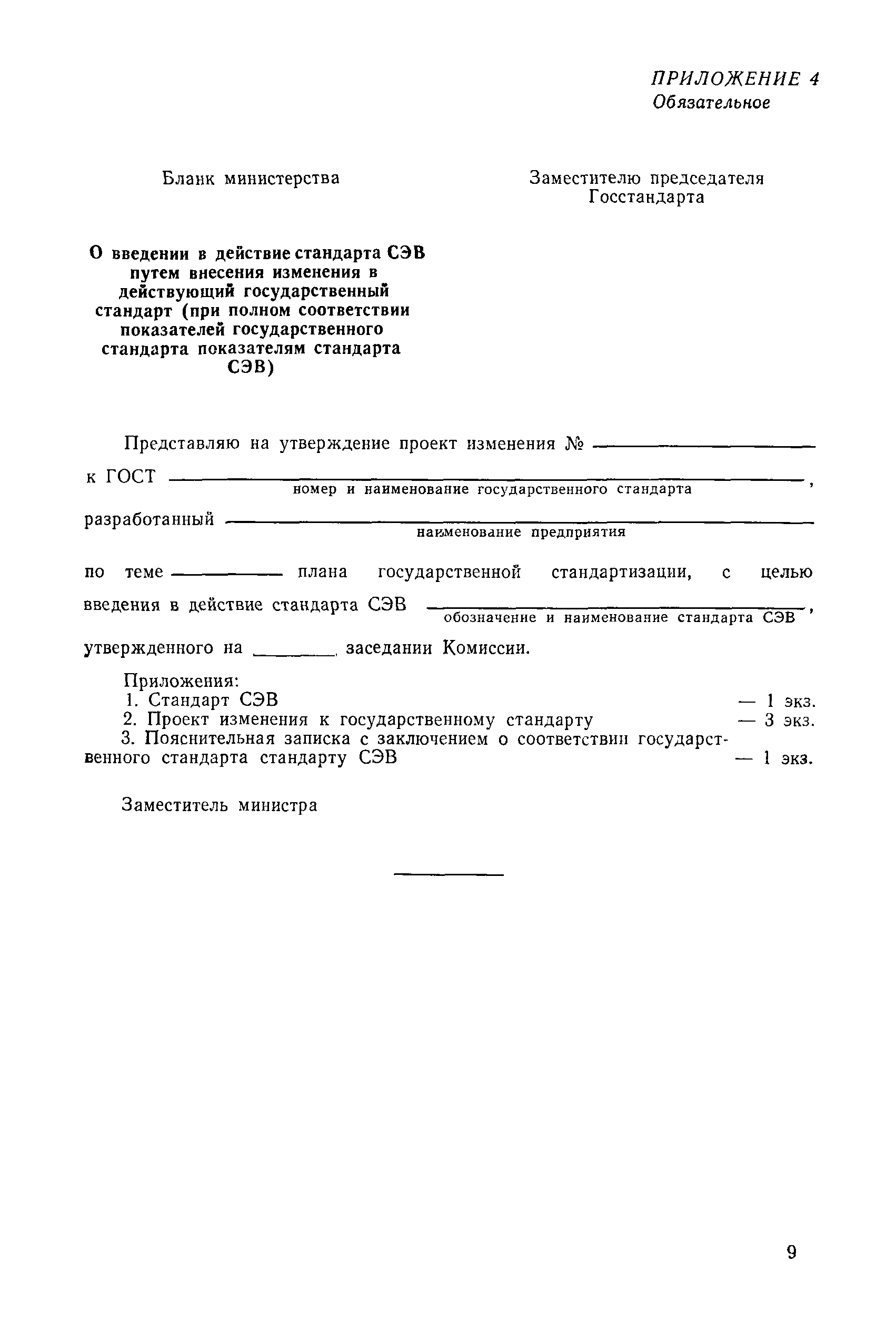 | Оглавление: | 1 Общие положения 2 Формы применения стандартов СЭВ в народном хозяйстве СССР 2.1 Применение стандарта СЭВ непосредственно в качестве государственного стандарта СССР. 2.2 Применение стандарта СЭВ путем введения его в государственный (отраслевой) стандарт. 3 Порядок проведения работ по подготовке к введению в действие стандарта СЭВ в СССР Приложение 1 (обязательное). Форма обложки государственного стандарта СССР Приложение 2 (обязательное). Форма первой страницы государственного стандарта СССР Приложение 3 (обязательное). О введении в действие стандарта СЭВ непосредственно в качестве государственного стандарта СССР Приложение 4 (обязательное). О введении в действие стандарта СЭВ путем внесения изменения в действующий государственный стандарт (при полном соответствии показателей государственного стандарта показателям стандарта СЭВ) Приложение 5 (обязательное). О введении в действие стандарта СЭВ путем внесения изменения в действующий государственный стандарт (при необходимости внесения в государственный стандарт дополнительных требований) Приложение 6 (обязательное). О введении в действие стандарта СЭВ путем разработки нового или внесения изменения в действующий отраслевой стандарт (при полном соответствии показателей отраслевого стандарта показателям стандарта СЭВ) Приложение 7 (обязательное). О введении в действие стандарта СЭВ путем разработки нового, пересмотра или внесения изменения в действующий отраслевой стандарт (при необходимости внесения в отраслевой стандарт дополнительных требований) Приложение 8 (обязательное). О введении в действие стандарта СЭВ путем пересмотра действующего или разработки нового государственного стандарта Приложение 9 (обязательное). Сведения о соответствии ссылок на стандарты СЭВ ссылкам на государственные стандарты Приложение 10 (обязательное). Соответствие требовании СТ СЭВ требованиям ГОСТ (ОСТ) |