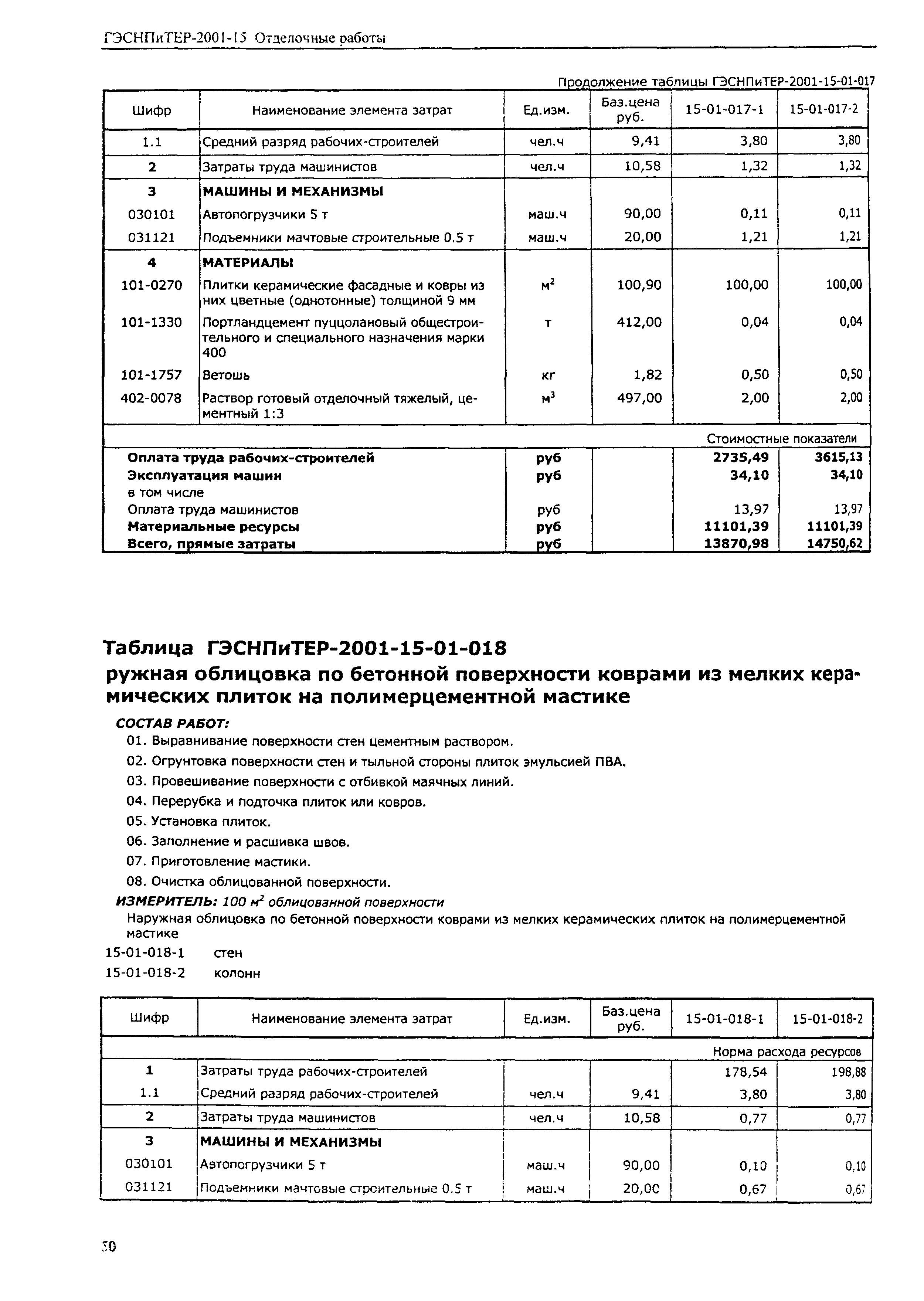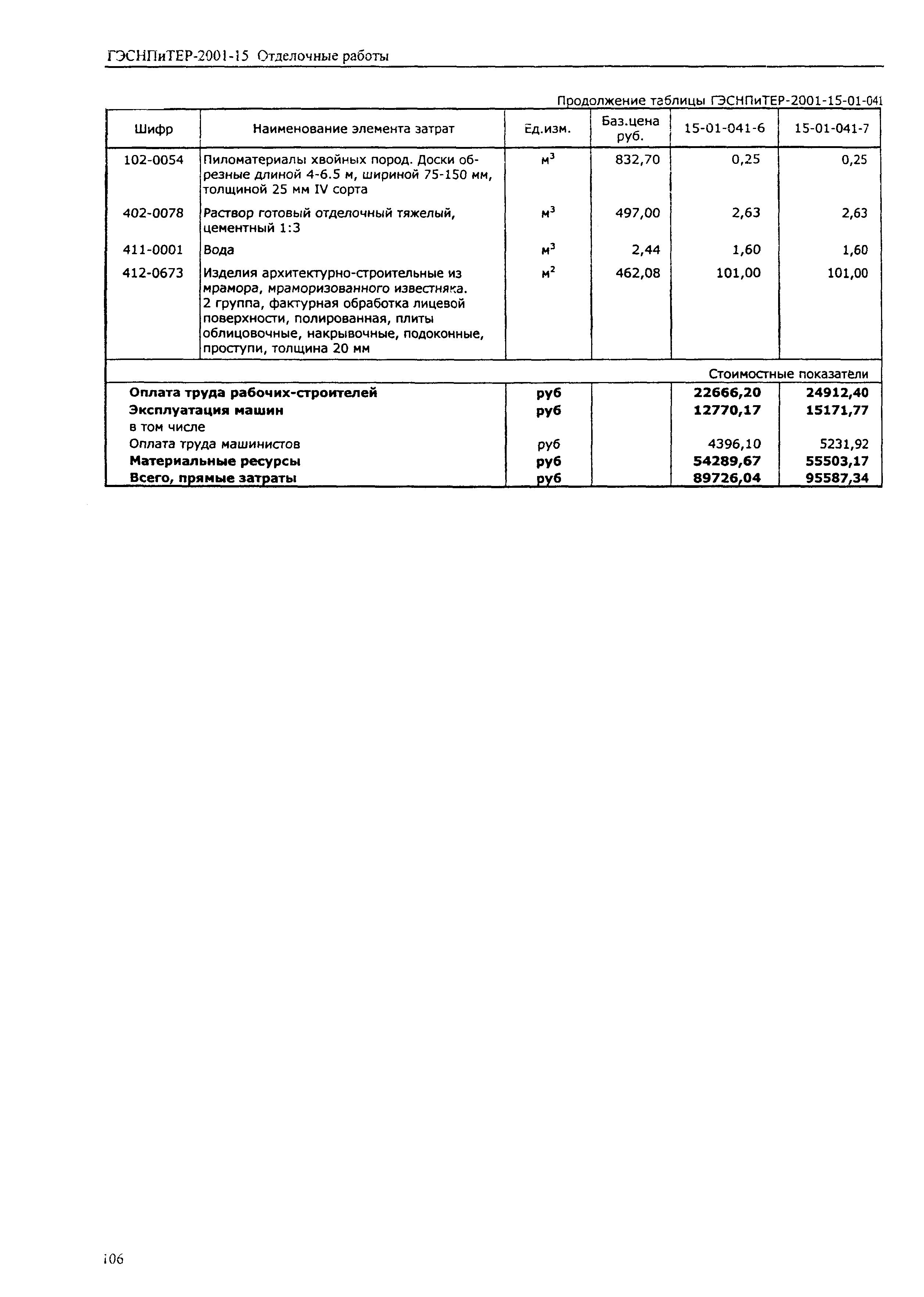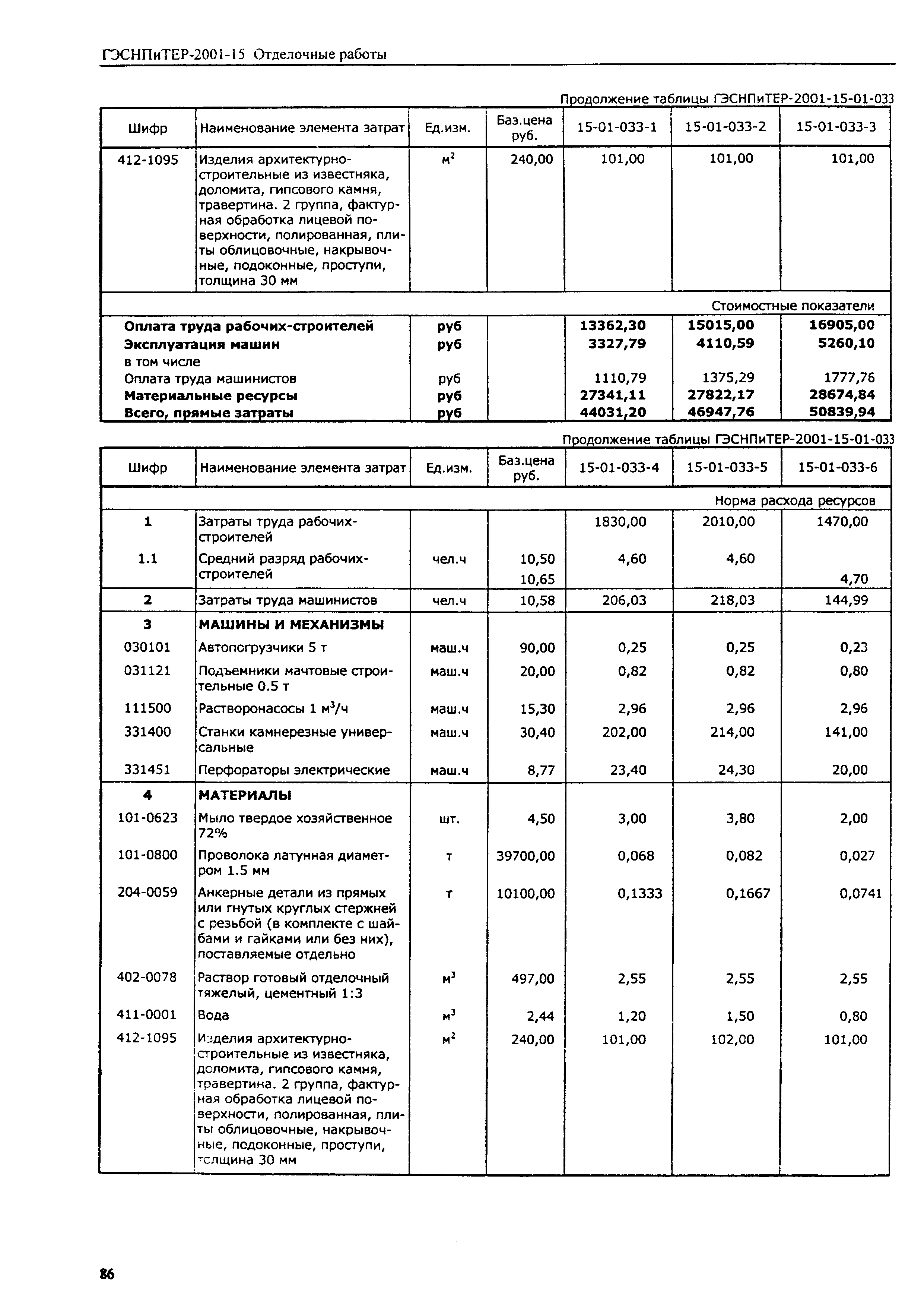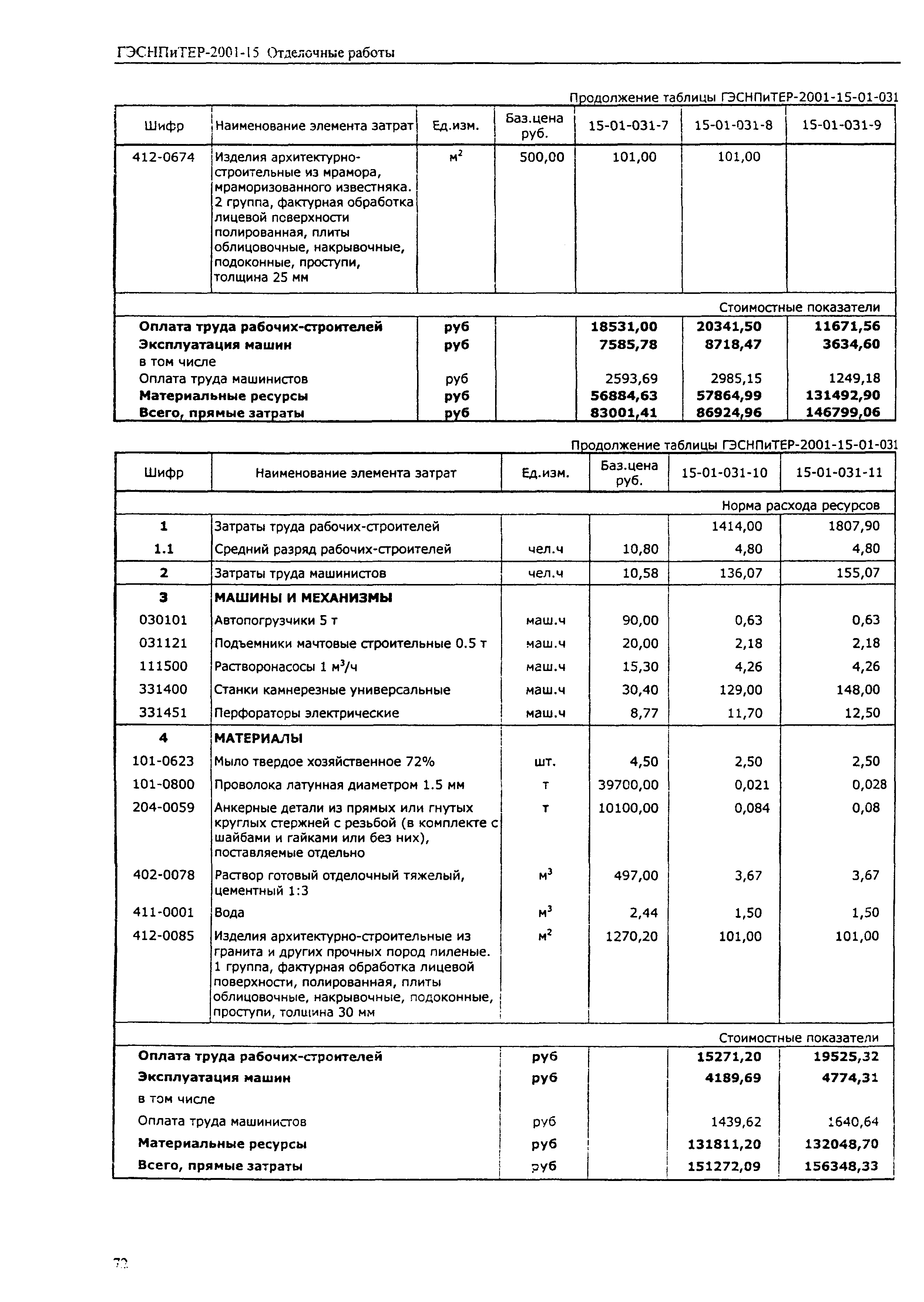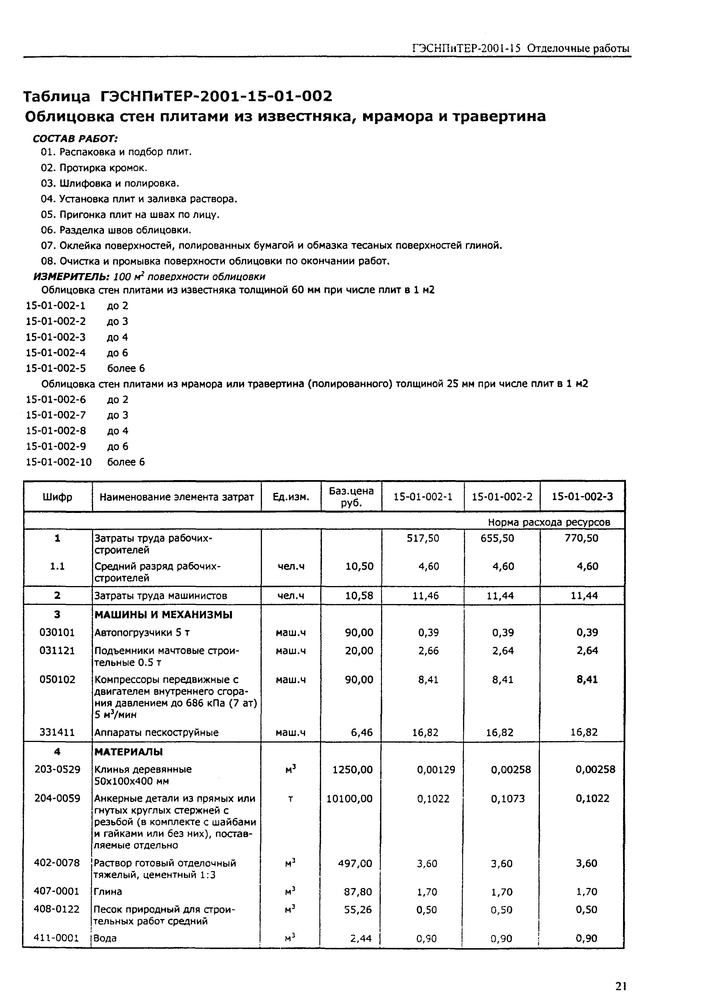 | Оглавление: | Техническая часть 1. Общие указания 2. Правила исчисления объемов работ 3. Коэффициенты к нормам и расценкам Таблица ГЭСНПиТЕР-2001-15-01-001 Облицовка стен гранитными плитами Таблица ГЭСНПиТЕР-2001-15-01-002 Облицовка стен плитами из известняка, мрамора и травертина Таблица ГЭСНПиТЕР-2001-15-01-003 Облицовка гранитными плитами Таблица ГЭСНПиТЕР-2001-15-01-004 Облицовка плитами из известняка, мрамора и травертина Таблица ГЭСНПиТЕР-2001-15-01-005 каждые 10 мм изменения толщины плит при облицовке стен и колонн Таблица ГЭСНПиТЕР-2001-15-01-006 При облицовке поверхностей природным камнем с прокладкой в горизонтальных швах свинца добавлять Таблица ГЭСНПиТЕР-2001-15-01-007 Облицовка поверхностей линейными полированными фасонными камнями Таблица ГЭСНПиТЕР-2001-15-01-008 Облицовка поверхностей линейными чистотесанными фасонными камнями Таблица ГЭСНПиТЕР-2001-15-01-009 Облицовка поверхностей полированными плитами толщиной 10 мм Таблица ГЭСНПиТЕР-2001-15-01-010 Облицовка мрамором ступеней и укладка мрамором плит Таблица ГЭСНПиТЕР-2001-15-01-016 Наружная облицовка по бетонной поверхности керамическими отдельными плитками Таблица ГЭСНПиТЕР-2001-15-01-017 Наружная облицовка по бетонной поверхности фасадными керамическими цветными плитками (типа "кабанчик") на цементном растворе Таблица ГЭСНПиТЕР-2001-15-01-018 Наружная облицовка по бетонной поверхности коврами из мелких керамических плиток на полимерцементной мастике Таблица ГЭСНПиТЕР-2001-15-01-019 Гладкая облицовка стен, столбов, пилястр и откосов (без карнизных, плинтусных и угловых плиток) Таблица ГЭСНПиТЕР-2001-15-01-020 Облицовка поверхностей с карнизными, плинтусными и угловыми плитками Таблица ГЭСНПиТЕР-2001-15-01-021 Устройство основания под облицовку искусственным мрамором Таблица ГЭСНПиТЕР-2001-15-01-022 Облицовка оселковым мрамором стен, столбов, колонн и пилястр Таблица ГЭСНПиТЕР-2001-15-01-023 Облицовка оселковым мрамором откосов, тяг, поясков, плинтусов и капителей Таблица ГЭСНПиТЕР-2001-15-01-024 Облицовка утюжным мрамором стен, столбов, колонн и пилястр Таблица ГЭСНПиТЕР-2001-15-01-025 Облицовка утюжным мрамором откосов, тяг, поясков, плинтусов и капителей Таблица ГЭСНПиТЕР-2001-15-01-031 Облицовка стен полированными плитами Таблица ГЭСНПиТЕР-2001-15-01-032 Облицовка полированными плитами колонн Таблица ГЭСНПиТЕР-2001-15-01-033 Облицовка плитами толщиной до 40 мм из туфа, известняка и ракушечника стен, пилястр, откосов, проемов Таблица ГЭСНПиТЕР-2001-15-01-034 Облицовка плитами толщиной до 40 мм из туфа, известняка и ракушечника колонн Таблица ГЭСНПиТЕР-2001-15-01-035 Устройство полов из полированных плит различной формы Таблица ГЭСНПиТЕР-2001-15-01-036 Облицовка арок полированными плитами Таблица ГЭСНПиТЕР-2001-15-01-037 Облицовка крышками парапета гранитными полированными плитами толщиной 40-60 мм Таблица ГЭСНПиТЕР-2001-15-01-038 Облицовка ступеней гранитными плитами Таблица ГЭСНПиТЕР-2001-15-01-039 Установка цельных гранитных ступеней толщиной 150 мм Таблица ГЭСНПиТЕР-2001-15-01-040 Устройство полов гладких или орнаментированных из полированных плит Таблица ГЭСНПиТЕР-2001-15-01-041 Облицовка пилястр, откосов полированными плитами из мрамора |