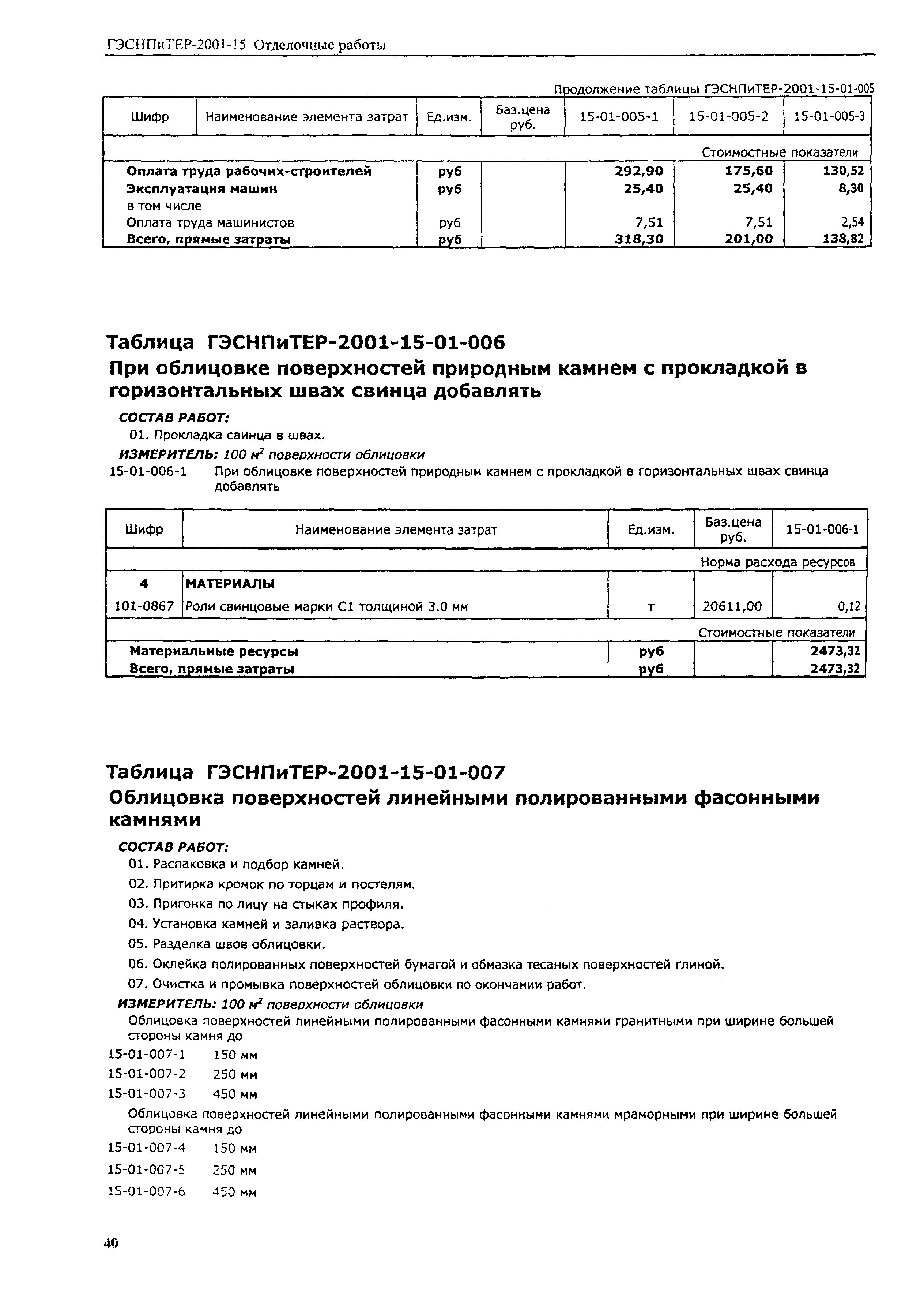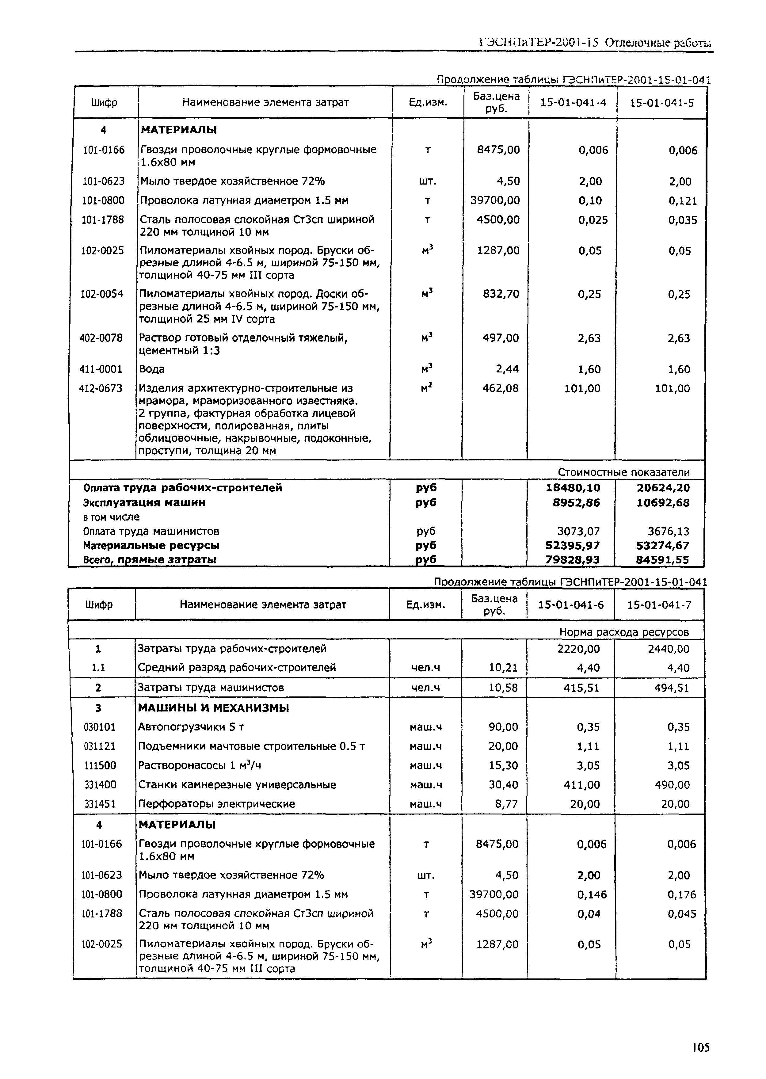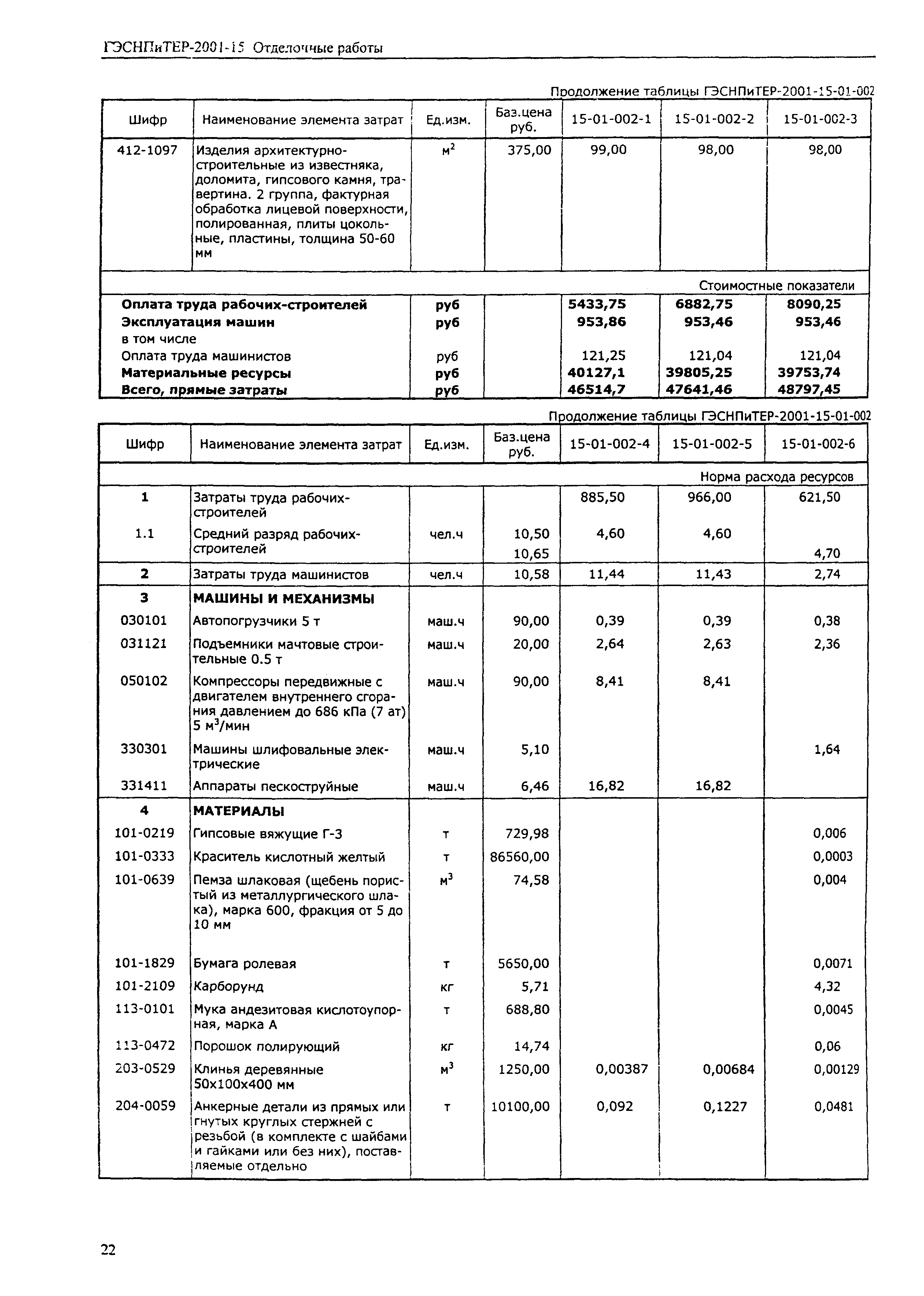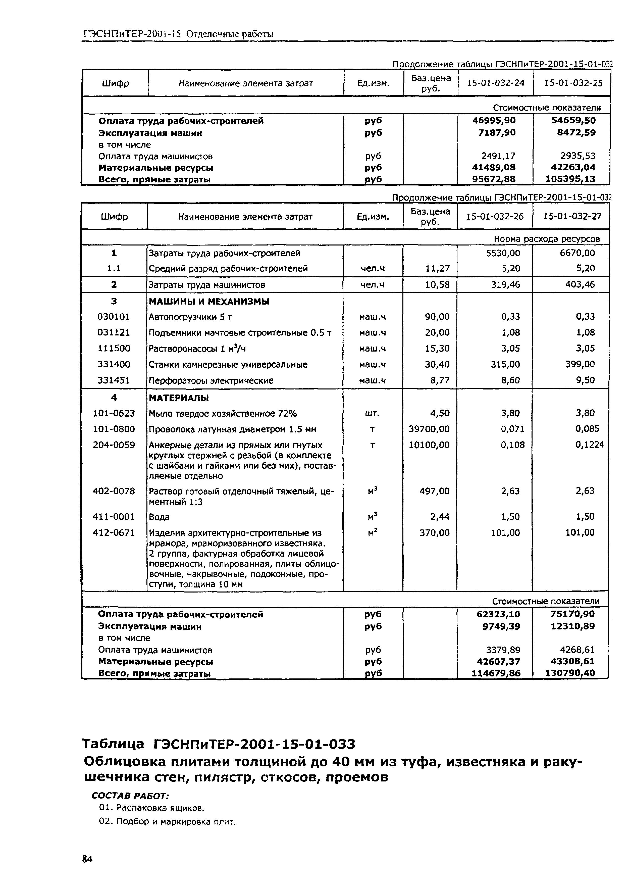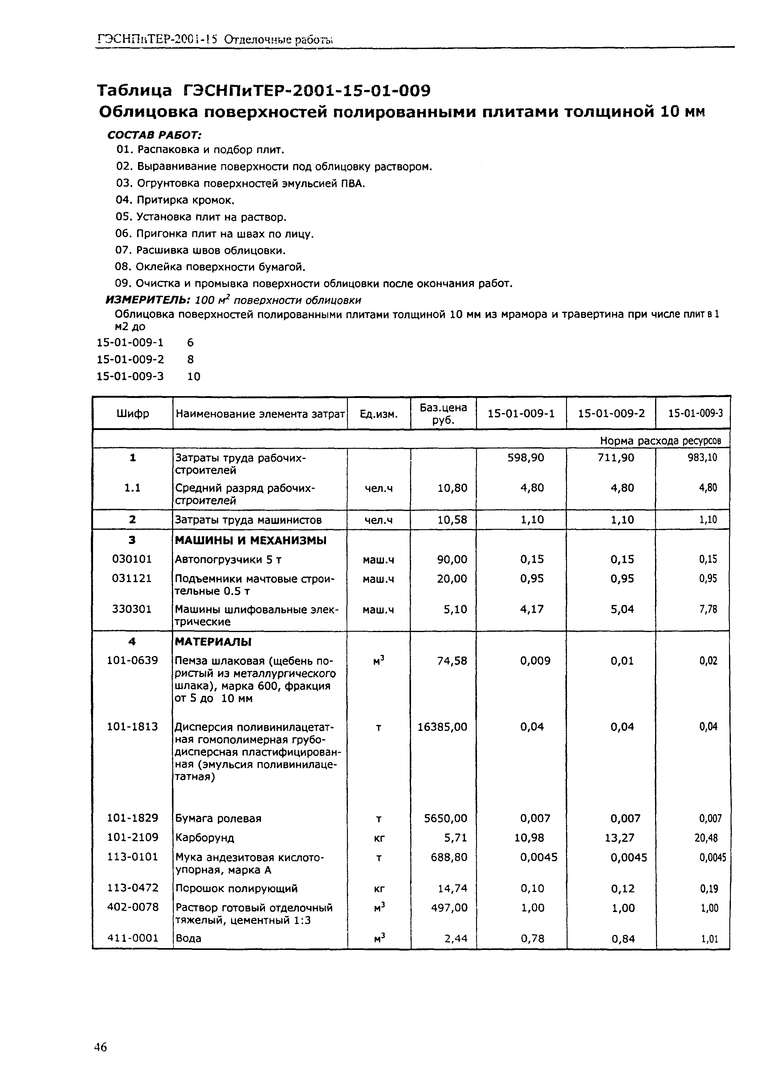 | Оглавление: | Техническая часть 1. Общие указания 2. Правила исчисления объемов работ 3. Коэффициенты к нормам и расценкам Таблица ГЭСНПиТЕР-2001-15-01-001 Облицовка стен гранитными плитами Таблица ГЭСНПиТЕР-2001-15-01-002 Облицовка стен плитами из известняка, мрамора и травертина Таблица ГЭСНПиТЕР-2001-15-01-003 Облицовка гранитными плитами Таблица ГЭСНПиТЕР-2001-15-01-004 Облицовка плитами из известняка, мрамора и травертина Таблица ГЭСНПиТЕР-2001-15-01-005 каждые 10 мм изменения толщины плит при облицовке стен и колонн Таблица ГЭСНПиТЕР-2001-15-01-006 При облицовке поверхностей природным камнем с прокладкой в горизонтальных швах свинца добавлять Таблица ГЭСНПиТЕР-2001-15-01-007 Облицовка поверхностей линейными полированными фасонными камнями Таблица ГЭСНПиТЕР-2001-15-01-008 Облицовка поверхностей линейными чистотесанными фасонными камнями Таблица ГЭСНПиТЕР-2001-15-01-009 Облицовка поверхностей полированными плитами толщиной 10 мм Таблица ГЭСНПиТЕР-2001-15-01-010 Облицовка мрамором ступеней и укладка мрамором плит Таблица ГЭСНПиТЕР-2001-15-01-016 Наружная облицовка по бетонной поверхности керамическими отдельными плитками Таблица ГЭСНПиТЕР-2001-15-01-017 Наружная облицовка по бетонной поверхности фасадными керамическими цветными плитками (типа "кабанчик") на цементном растворе Таблица ГЭСНПиТЕР-2001-15-01-018 Наружная облицовка по бетонной поверхности коврами из мелких керамических плиток на полимерцементной мастике Таблица ГЭСНПиТЕР-2001-15-01-019 Гладкая облицовка стен, столбов, пилястр и откосов (без карнизных, плинтусных и угловых плиток) Таблица ГЭСНПиТЕР-2001-15-01-020 Облицовка поверхностей с карнизными, плинтусными и угловыми плитками Таблица ГЭСНПиТЕР-2001-15-01-021 Устройство основания под облицовку искусственным мрамором Таблица ГЭСНПиТЕР-2001-15-01-022 Облицовка оселковым мрамором стен, столбов, колонн и пилястр Таблица ГЭСНПиТЕР-2001-15-01-023 Облицовка оселковым мрамором откосов, тяг, поясков, плинтусов и капителей Таблица ГЭСНПиТЕР-2001-15-01-024 Облицовка утюжным мрамором стен, столбов, колонн и пилястр Таблица ГЭСНПиТЕР-2001-15-01-025 Облицовка утюжным мрамором откосов, тяг, поясков, плинтусов и капителей Таблица ГЭСНПиТЕР-2001-15-01-031 Облицовка стен полированными плитами Таблица ГЭСНПиТЕР-2001-15-01-032 Облицовка полированными плитами колонн Таблица ГЭСНПиТЕР-2001-15-01-033 Облицовка плитами толщиной до 40 мм из туфа, известняка и ракушечника стен, пилястр, откосов, проемов Таблица ГЭСНПиТЕР-2001-15-01-034 Облицовка плитами толщиной до 40 мм из туфа, известняка и ракушечника колонн Таблица ГЭСНПиТЕР-2001-15-01-035 Устройство полов из полированных плит различной формы Таблица ГЭСНПиТЕР-2001-15-01-036 Облицовка арок полированными плитами Таблица ГЭСНПиТЕР-2001-15-01-037 Облицовка крышками парапета гранитными полированными плитами толщиной 40-60 мм Таблица ГЭСНПиТЕР-2001-15-01-038 Облицовка ступеней гранитными плитами Таблица ГЭСНПиТЕР-2001-15-01-039 Установка цельных гранитных ступеней толщиной 150 мм Таблица ГЭСНПиТЕР-2001-15-01-040 Устройство полов гладких или орнаментированных из полированных плит Таблица ГЭСНПиТЕР-2001-15-01-041 Облицовка пилястр, откосов полированными плитами из мрамора |