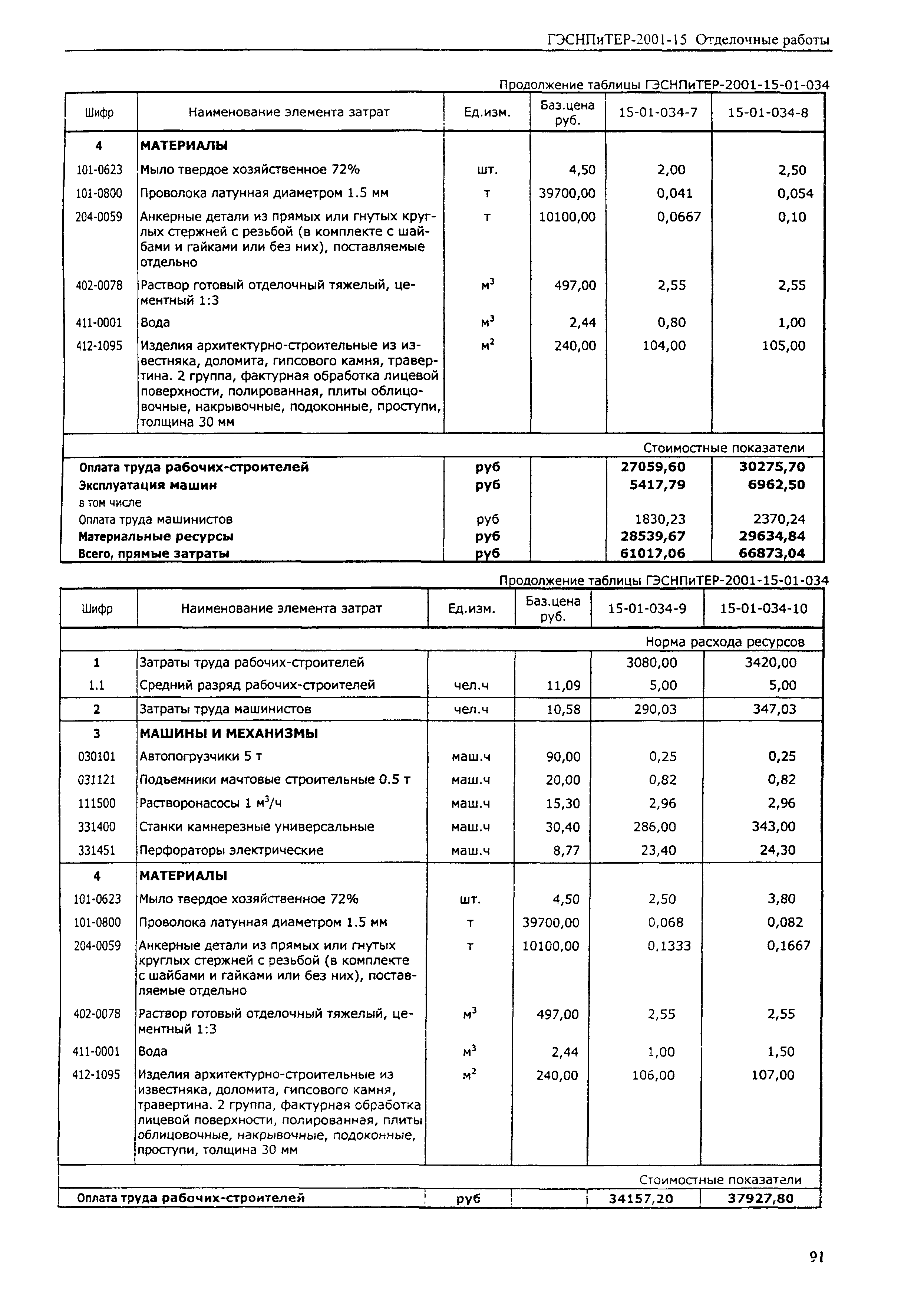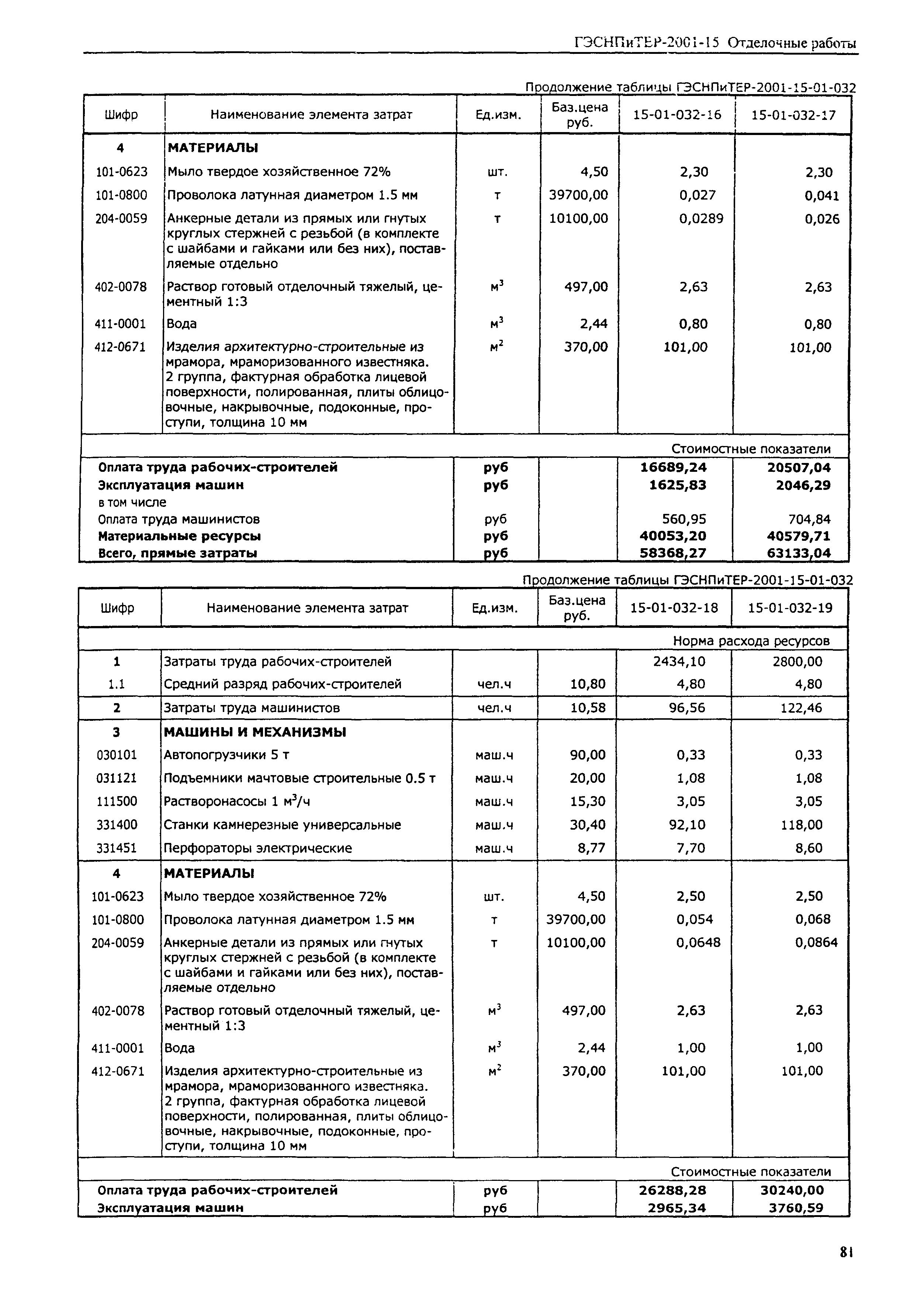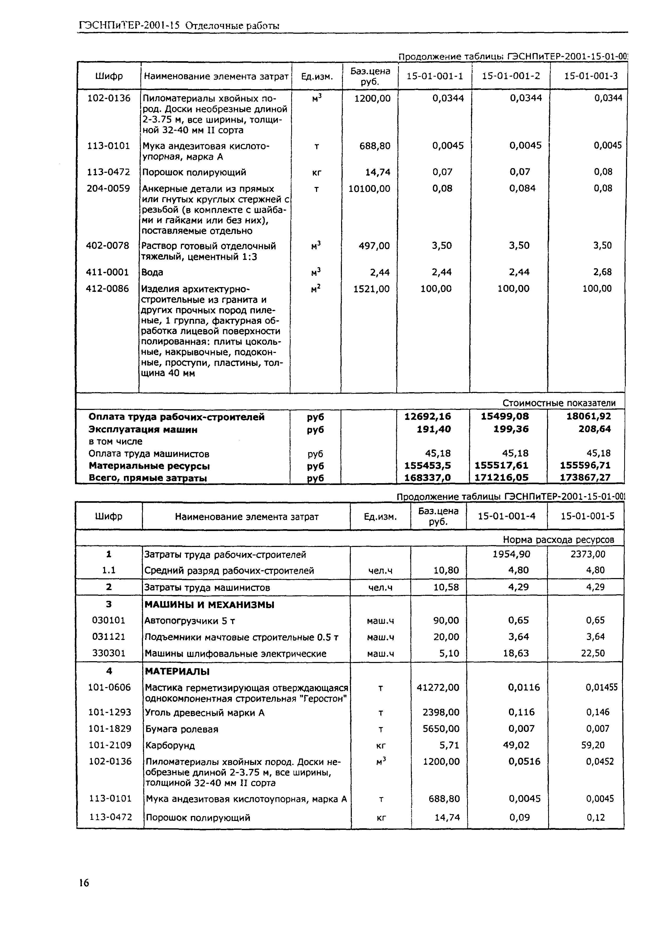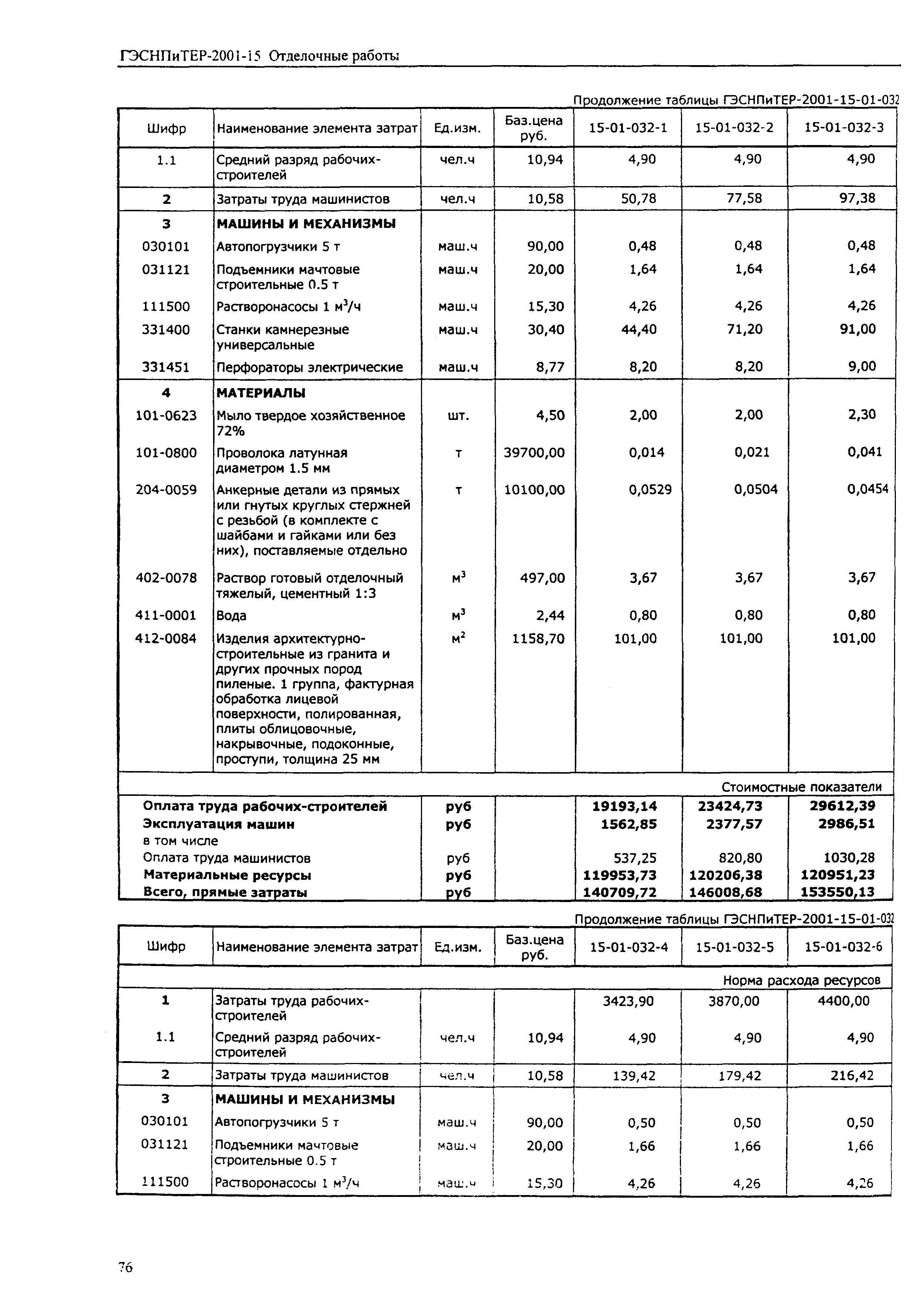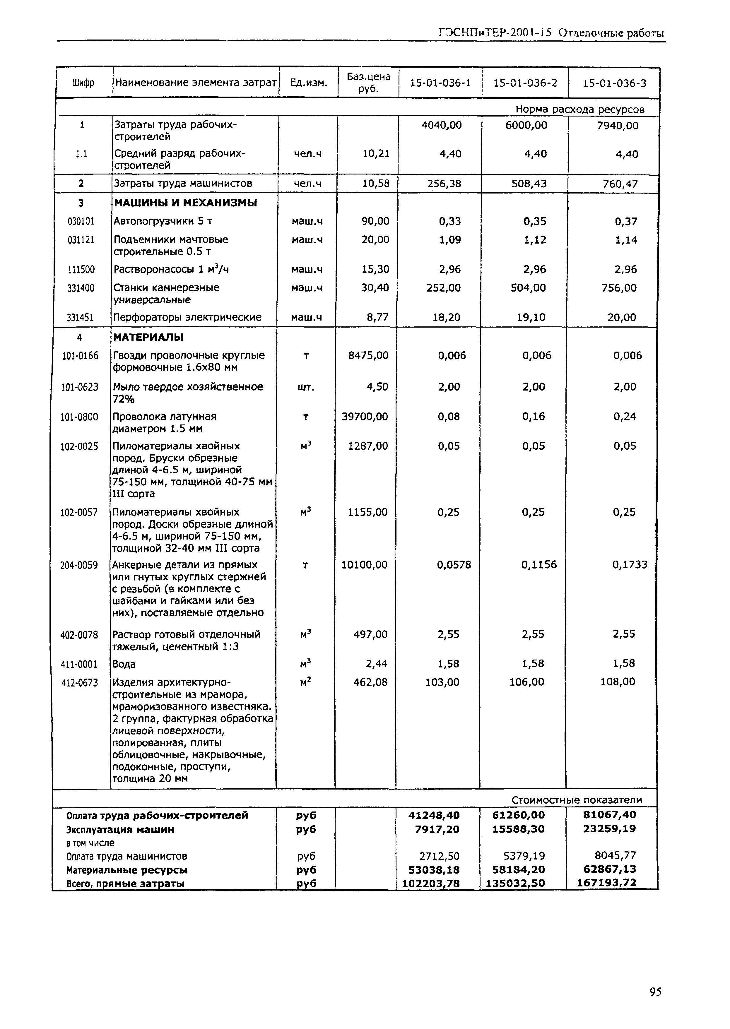| Оглавление: | Техническая часть 1. Общие указания 2. Правила исчисления объемов работ 3. Коэффициенты к нормам и расценкам Таблица ГЭСНПиТЕР-2001-15-01-001 Облицовка стен гранитными плитами Таблица ГЭСНПиТЕР-2001-15-01-002 Облицовка стен плитами из известняка, мрамора и травертина Таблица ГЭСНПиТЕР-2001-15-01-003 Облицовка гранитными плитами Таблица ГЭСНПиТЕР-2001-15-01-004 Облицовка плитами из известняка, мрамора и травертина Таблица ГЭСНПиТЕР-2001-15-01-005 каждые 10 мм изменения толщины плит при облицовке стен и колонн Таблица ГЭСНПиТЕР-2001-15-01-006 При облицовке поверхностей природным камнем с прокладкой в горизонтальных швах свинца добавлять Таблица ГЭСНПиТЕР-2001-15-01-007 Облицовка поверхностей линейными полированными фасонными камнями Таблица ГЭСНПиТЕР-2001-15-01-008 Облицовка поверхностей линейными чистотесанными фасонными камнями Таблица ГЭСНПиТЕР-2001-15-01-009 Облицовка поверхностей полированными плитами толщиной 10 мм Таблица ГЭСНПиТЕР-2001-15-01-010 Облицовка мрамором ступеней и укладка мрамором плит Таблица ГЭСНПиТЕР-2001-15-01-016 Наружная облицовка по бетонной поверхности керамическими отдельными плитками Таблица ГЭСНПиТЕР-2001-15-01-017 Наружная облицовка по бетонной поверхности фасадными керамическими цветными плитками (типа "кабанчик") на цементном растворе Таблица ГЭСНПиТЕР-2001-15-01-018 Наружная облицовка по бетонной поверхности коврами из мелких керамических плиток на полимерцементной мастике Таблица ГЭСНПиТЕР-2001-15-01-019 Гладкая облицовка стен, столбов, пилястр и откосов (без карнизных, плинтусных и угловых плиток) Таблица ГЭСНПиТЕР-2001-15-01-020 Облицовка поверхностей с карнизными, плинтусными и угловыми плитками Таблица ГЭСНПиТЕР-2001-15-01-021 Устройство основания под облицовку искусственным мрамором Таблица ГЭСНПиТЕР-2001-15-01-022 Облицовка оселковым мрамором стен, столбов, колонн и пилястр Таблица ГЭСНПиТЕР-2001-15-01-023 Облицовка оселковым мрамором откосов, тяг, поясков, плинтусов и капителей Таблица ГЭСНПиТЕР-2001-15-01-024 Облицовка утюжным мрамором стен, столбов, колонн и пилястр Таблица ГЭСНПиТЕР-2001-15-01-025 Облицовка утюжным мрамором откосов, тяг, поясков, плинтусов и капителей Таблица ГЭСНПиТЕР-2001-15-01-031 Облицовка стен полированными плитами Таблица ГЭСНПиТЕР-2001-15-01-032 Облицовка полированными плитами колонн Таблица ГЭСНПиТЕР-2001-15-01-033 Облицовка плитами толщиной до 40 мм из туфа, известняка и ракушечника стен, пилястр, откосов, проемов Таблица ГЭСНПиТЕР-2001-15-01-034 Облицовка плитами толщиной до 40 мм из туфа, известняка и ракушечника колонн Таблица ГЭСНПиТЕР-2001-15-01-035 Устройство полов из полированных плит различной формы Таблица ГЭСНПиТЕР-2001-15-01-036 Облицовка арок полированными плитами Таблица ГЭСНПиТЕР-2001-15-01-037 Облицовка крышками парапета гранитными полированными плитами толщиной 40-60 мм Таблица ГЭСНПиТЕР-2001-15-01-038 Облицовка ступеней гранитными плитами Таблица ГЭСНПиТЕР-2001-15-01-039 Установка цельных гранитных ступеней толщиной 150 мм Таблица ГЭСНПиТЕР-2001-15-01-040 Устройство полов гладких или орнаментированных из полированных плит Таблица ГЭСНПиТЕР-2001-15-01-041 Облицовка пилястр, откосов полированными плитами из мрамора |
