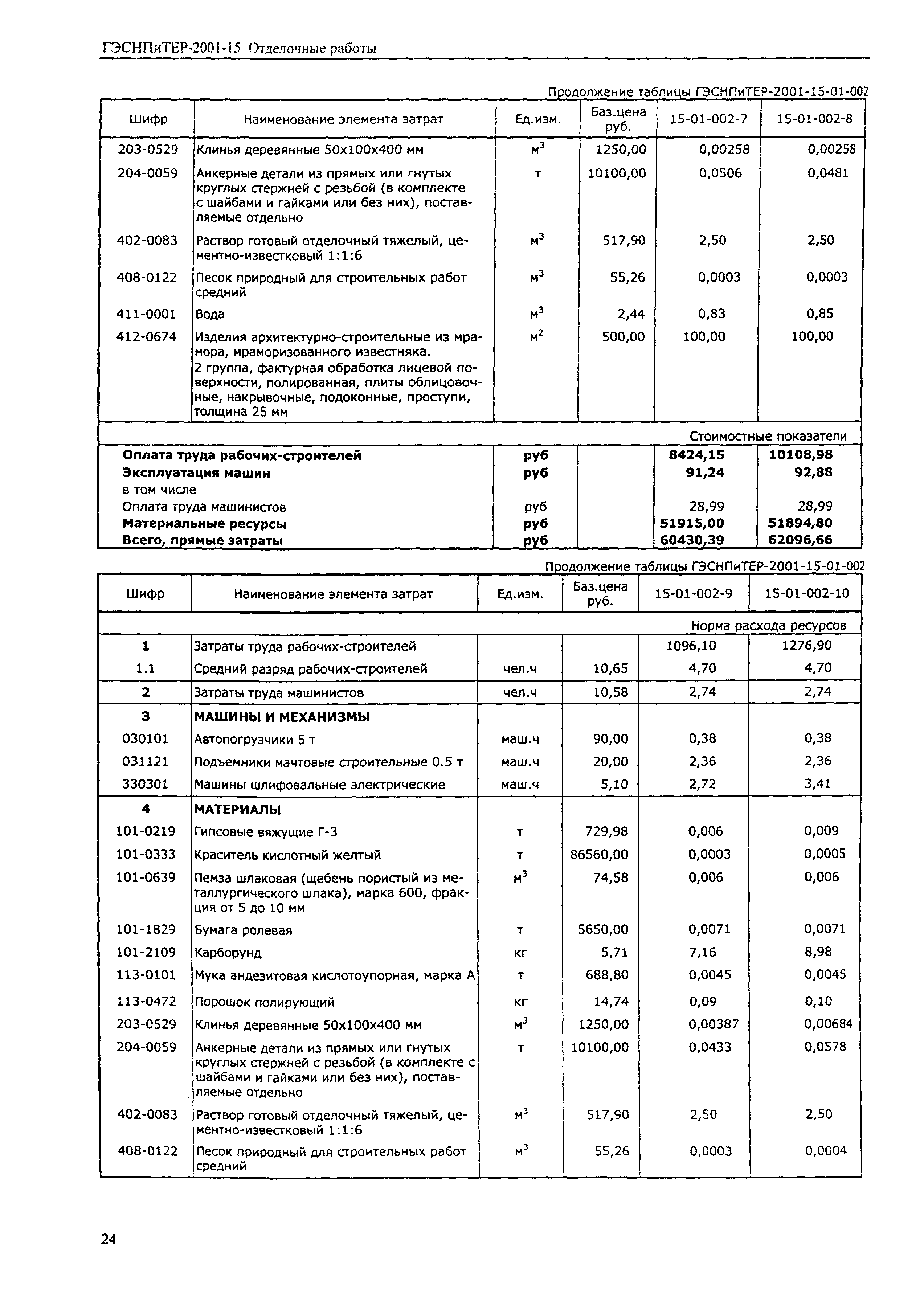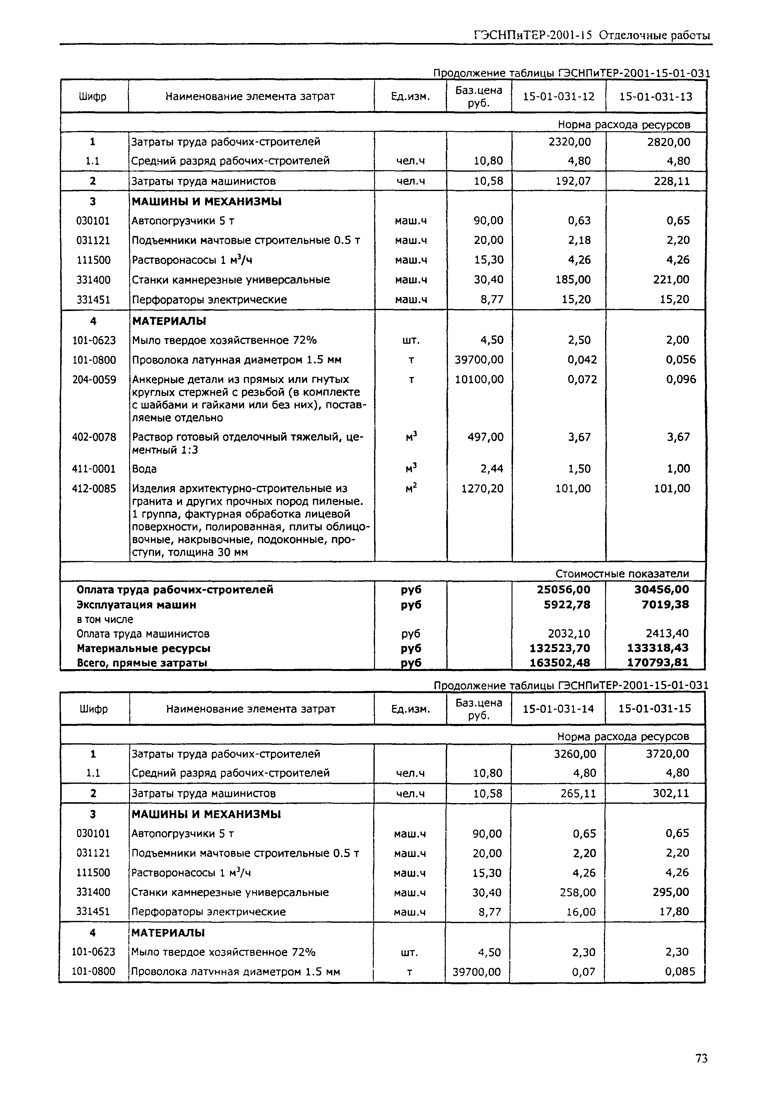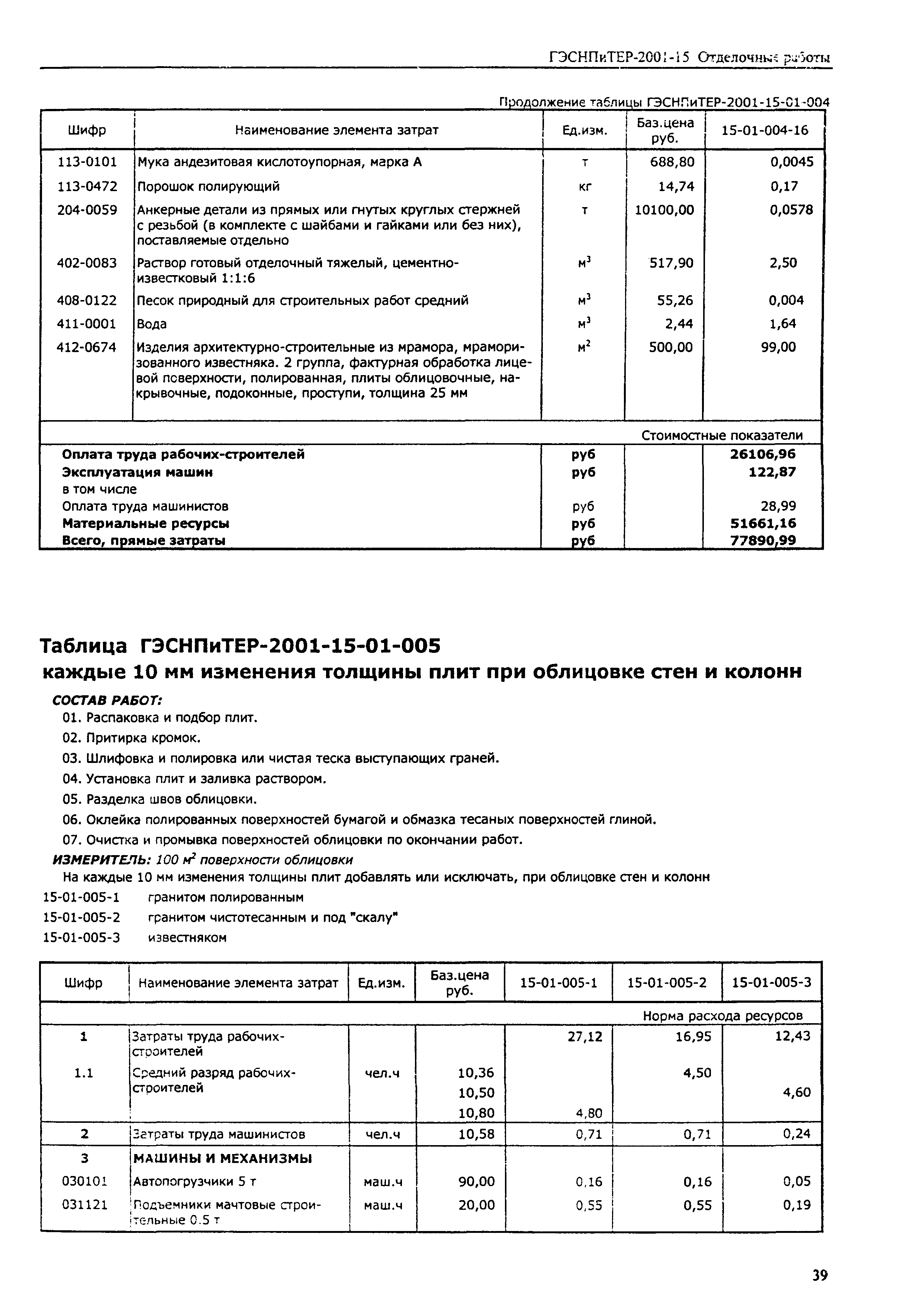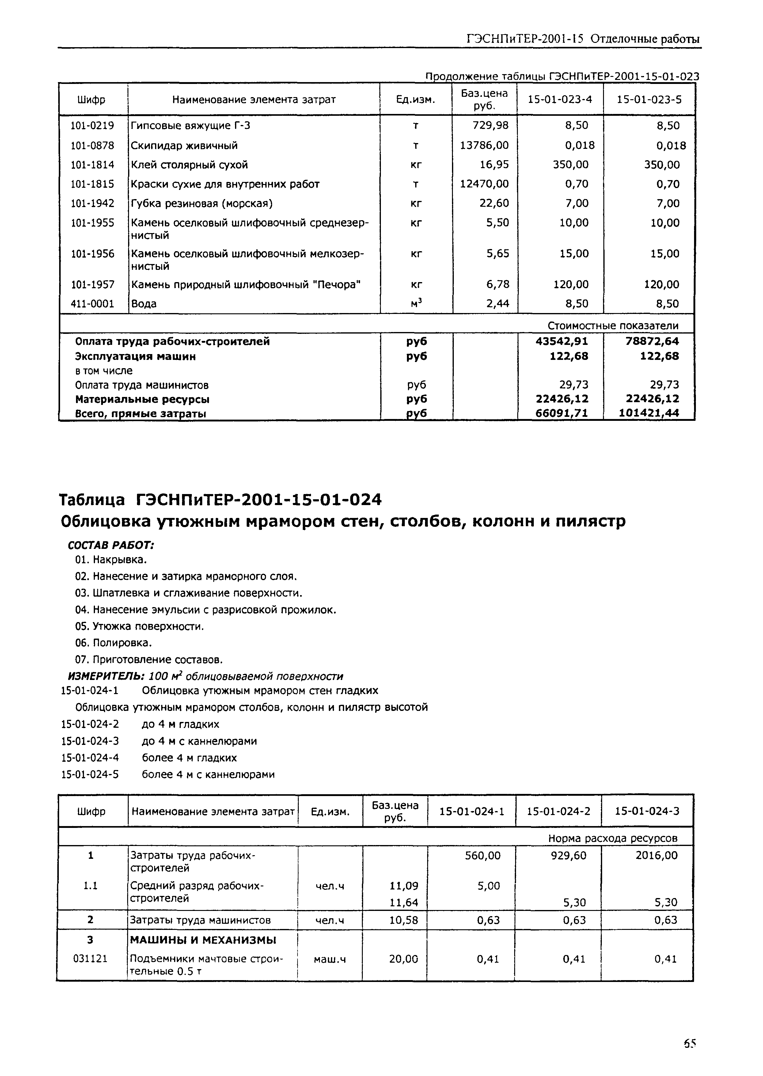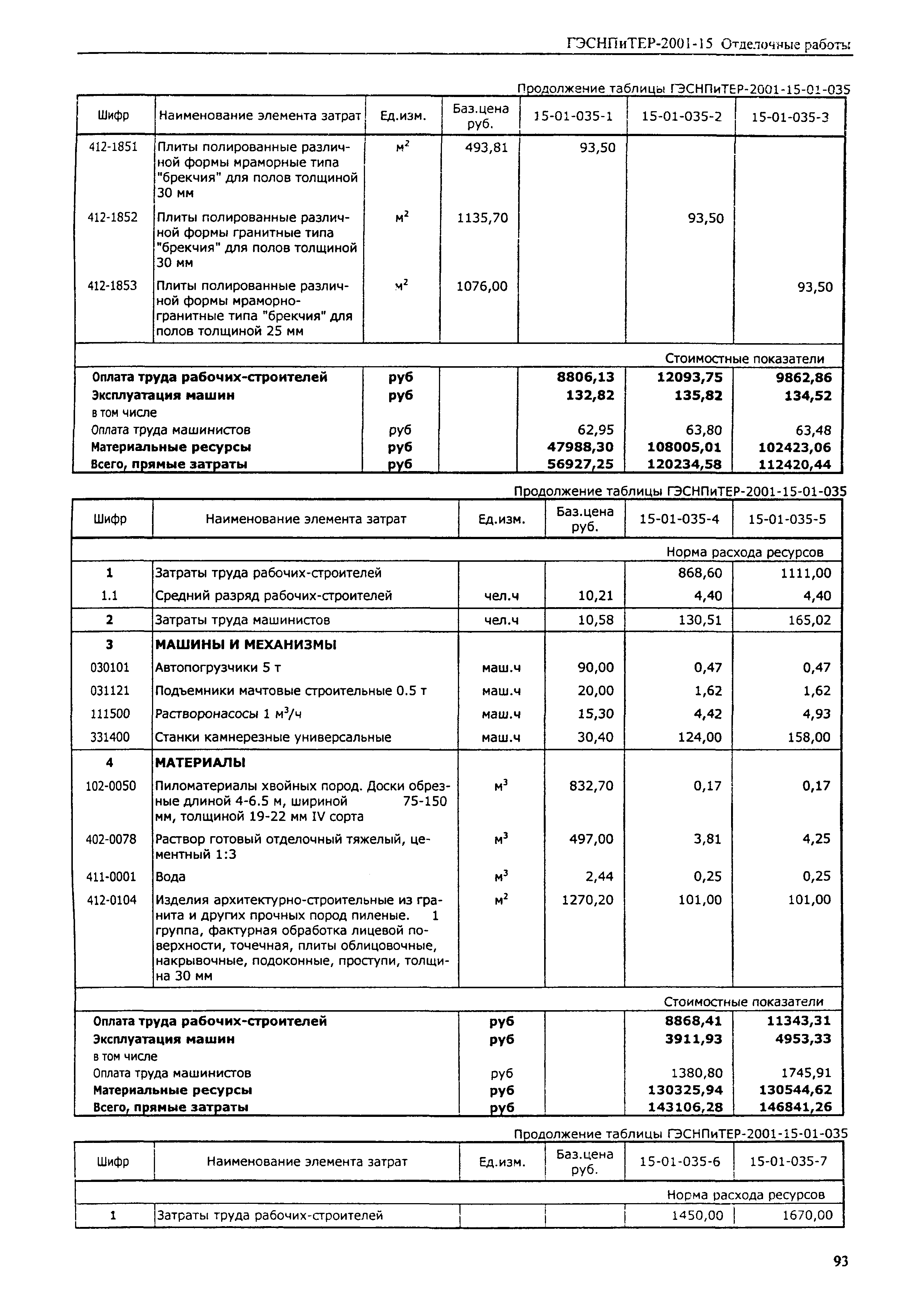 | Оглавление: | Техническая часть 1. Общие указания 2. Правила исчисления объемов работ 3. Коэффициенты к нормам и расценкам Таблица ГЭСНПиТЕР-2001-15-01-001 Облицовка стен гранитными плитами Таблица ГЭСНПиТЕР-2001-15-01-002 Облицовка стен плитами из известняка, мрамора и травертина Таблица ГЭСНПиТЕР-2001-15-01-003 Облицовка гранитными плитами Таблица ГЭСНПиТЕР-2001-15-01-004 Облицовка плитами из известняка, мрамора и травертина Таблица ГЭСНПиТЕР-2001-15-01-005 каждые 10 мм изменения толщины плит при облицовке стен и колонн Таблица ГЭСНПиТЕР-2001-15-01-006 При облицовке поверхностей природным камнем с прокладкой в горизонтальных швах свинца добавлять Таблица ГЭСНПиТЕР-2001-15-01-007 Облицовка поверхностей линейными полированными фасонными камнями Таблица ГЭСНПиТЕР-2001-15-01-008 Облицовка поверхностей линейными чистотесанными фасонными камнями Таблица ГЭСНПиТЕР-2001-15-01-009 Облицовка поверхностей полированными плитами толщиной 10 мм Таблица ГЭСНПиТЕР-2001-15-01-010 Облицовка мрамором ступеней и укладка мрамором плит Таблица ГЭСНПиТЕР-2001-15-01-016 Наружная облицовка по бетонной поверхности керамическими отдельными плитками Таблица ГЭСНПиТЕР-2001-15-01-017 Наружная облицовка по бетонной поверхности фасадными керамическими цветными плитками (типа "кабанчик") на цементном растворе Таблица ГЭСНПиТЕР-2001-15-01-018 Наружная облицовка по бетонной поверхности коврами из мелких керамических плиток на полимерцементной мастике Таблица ГЭСНПиТЕР-2001-15-01-019 Гладкая облицовка стен, столбов, пилястр и откосов (без карнизных, плинтусных и угловых плиток) Таблица ГЭСНПиТЕР-2001-15-01-020 Облицовка поверхностей с карнизными, плинтусными и угловыми плитками Таблица ГЭСНПиТЕР-2001-15-01-021 Устройство основания под облицовку искусственным мрамором Таблица ГЭСНПиТЕР-2001-15-01-022 Облицовка оселковым мрамором стен, столбов, колонн и пилястр Таблица ГЭСНПиТЕР-2001-15-01-023 Облицовка оселковым мрамором откосов, тяг, поясков, плинтусов и капителей Таблица ГЭСНПиТЕР-2001-15-01-024 Облицовка утюжным мрамором стен, столбов, колонн и пилястр Таблица ГЭСНПиТЕР-2001-15-01-025 Облицовка утюжным мрамором откосов, тяг, поясков, плинтусов и капителей Таблица ГЭСНПиТЕР-2001-15-01-031 Облицовка стен полированными плитами Таблица ГЭСНПиТЕР-2001-15-01-032 Облицовка полированными плитами колонн Таблица ГЭСНПиТЕР-2001-15-01-033 Облицовка плитами толщиной до 40 мм из туфа, известняка и ракушечника стен, пилястр, откосов, проемов Таблица ГЭСНПиТЕР-2001-15-01-034 Облицовка плитами толщиной до 40 мм из туфа, известняка и ракушечника колонн Таблица ГЭСНПиТЕР-2001-15-01-035 Устройство полов из полированных плит различной формы Таблица ГЭСНПиТЕР-2001-15-01-036 Облицовка арок полированными плитами Таблица ГЭСНПиТЕР-2001-15-01-037 Облицовка крышками парапета гранитными полированными плитами толщиной 40-60 мм Таблица ГЭСНПиТЕР-2001-15-01-038 Облицовка ступеней гранитными плитами Таблица ГЭСНПиТЕР-2001-15-01-039 Установка цельных гранитных ступеней толщиной 150 мм Таблица ГЭСНПиТЕР-2001-15-01-040 Устройство полов гладких или орнаментированных из полированных плит Таблица ГЭСНПиТЕР-2001-15-01-041 Облицовка пилястр, откосов полированными плитами из мрамора |