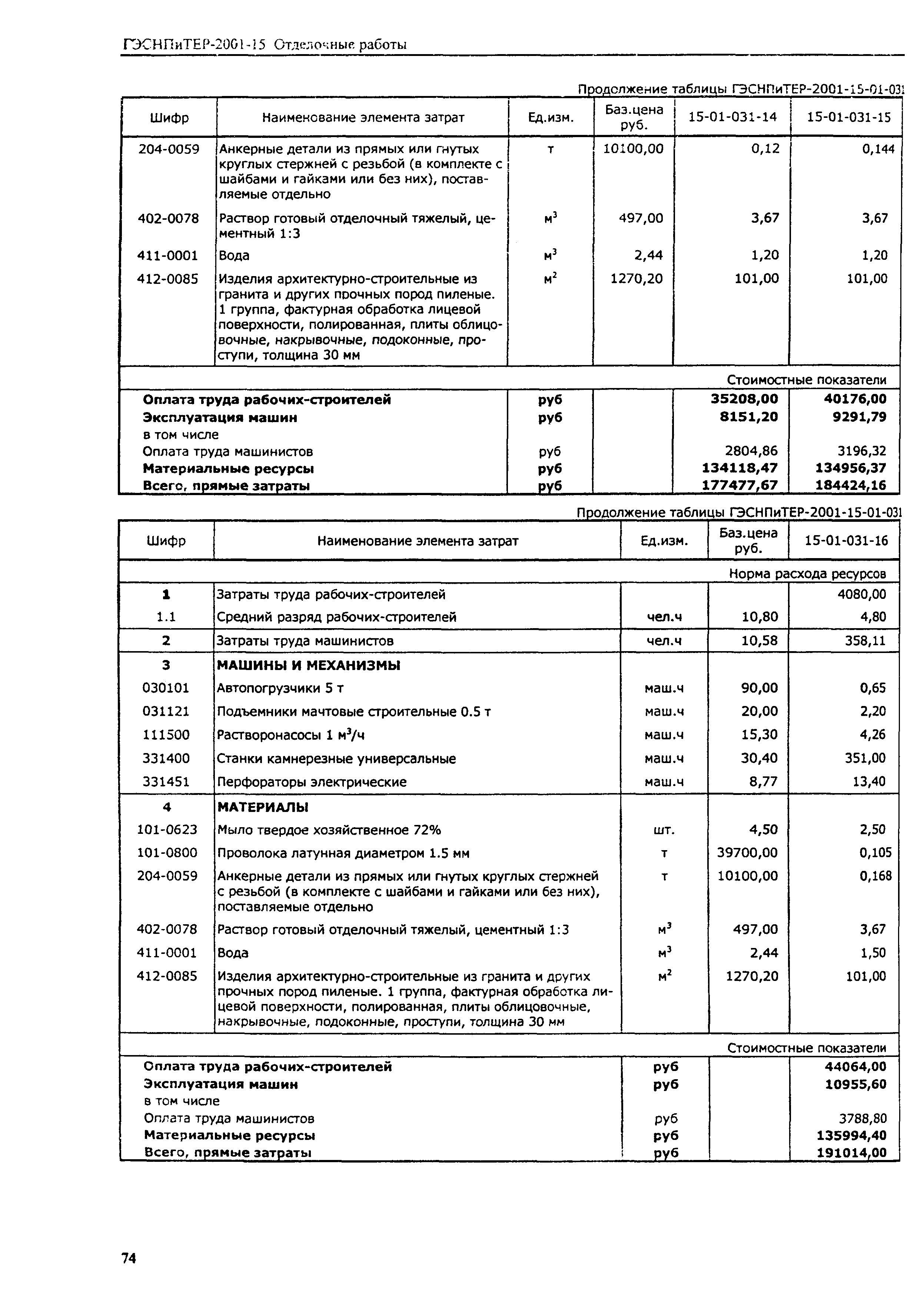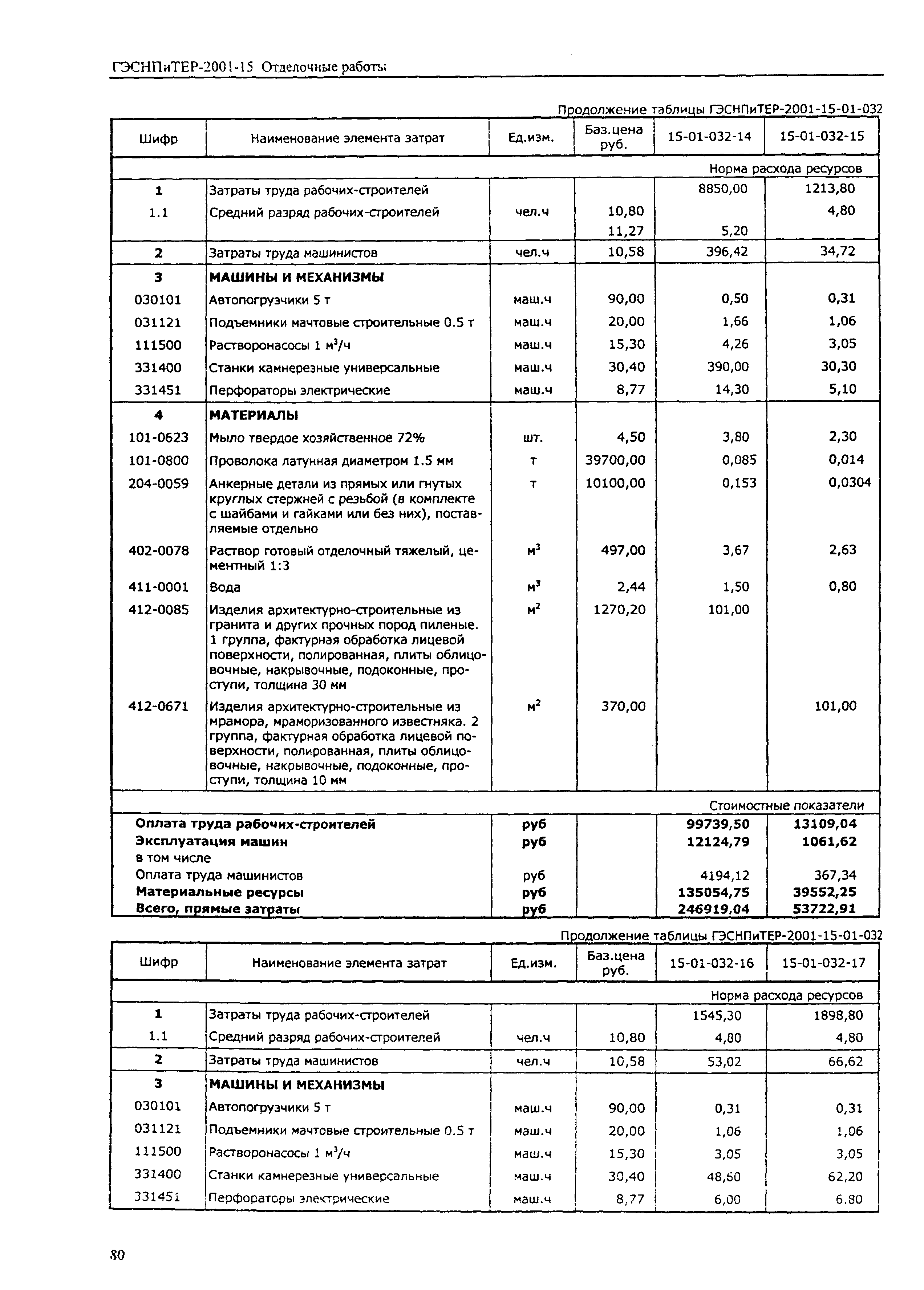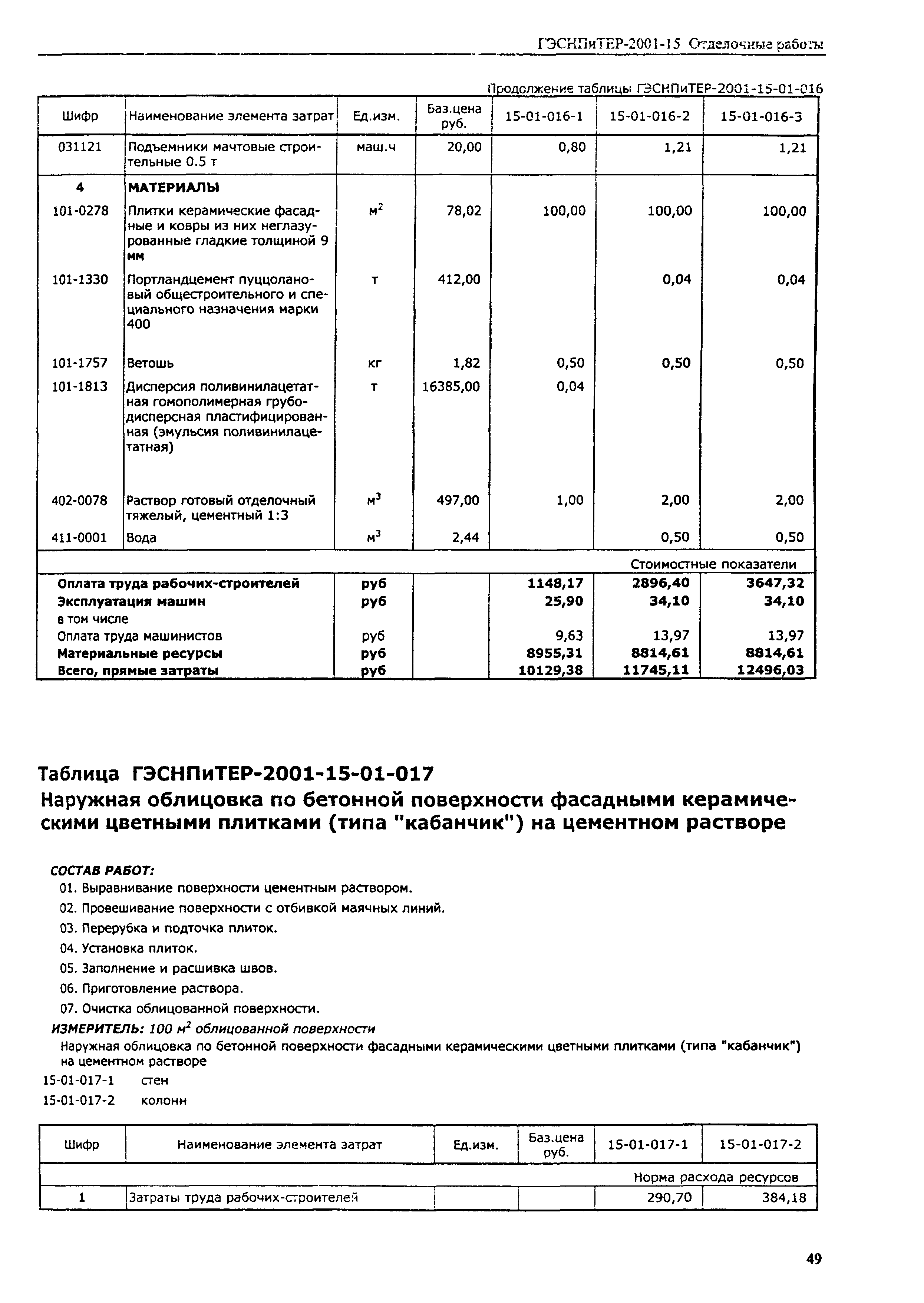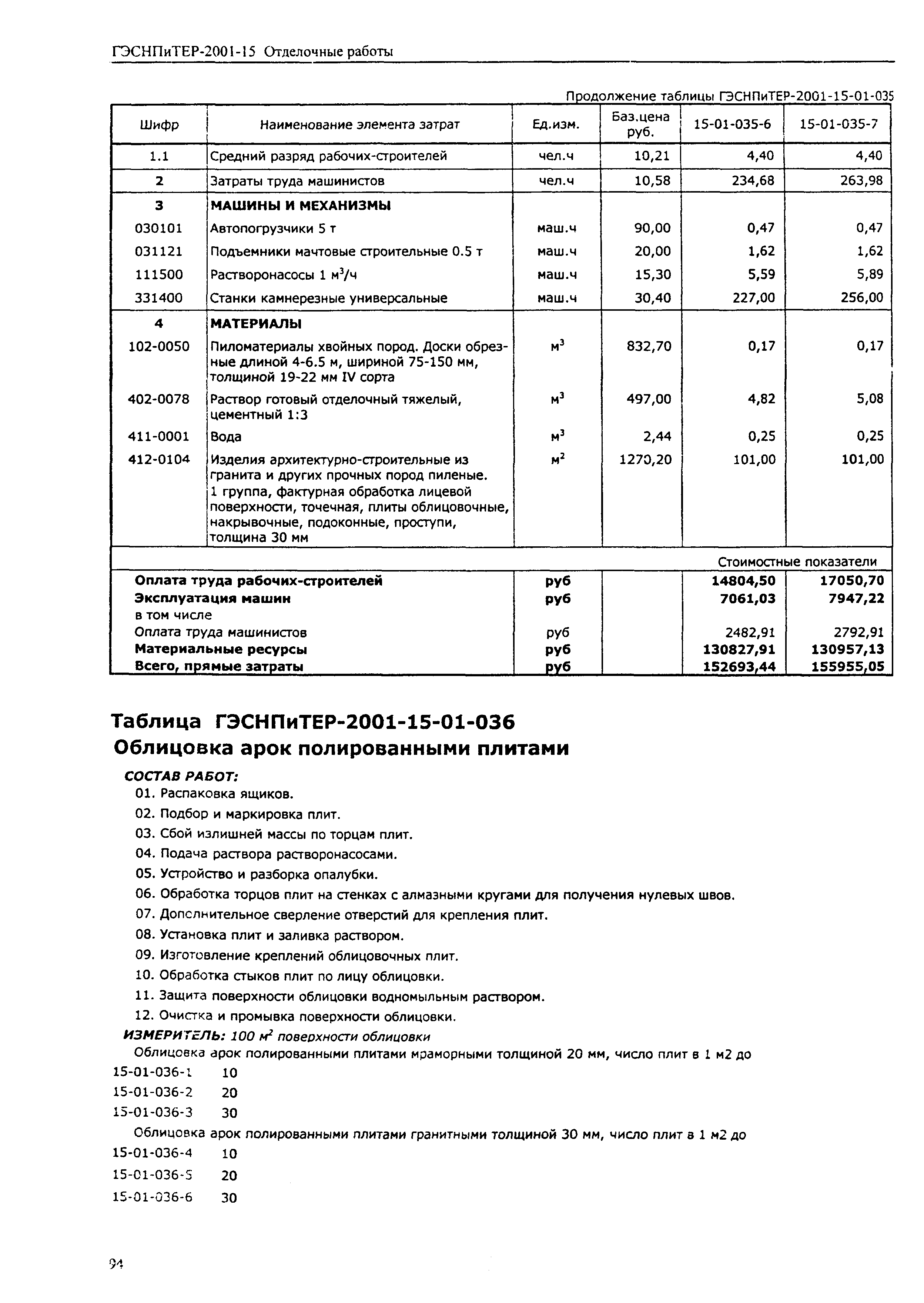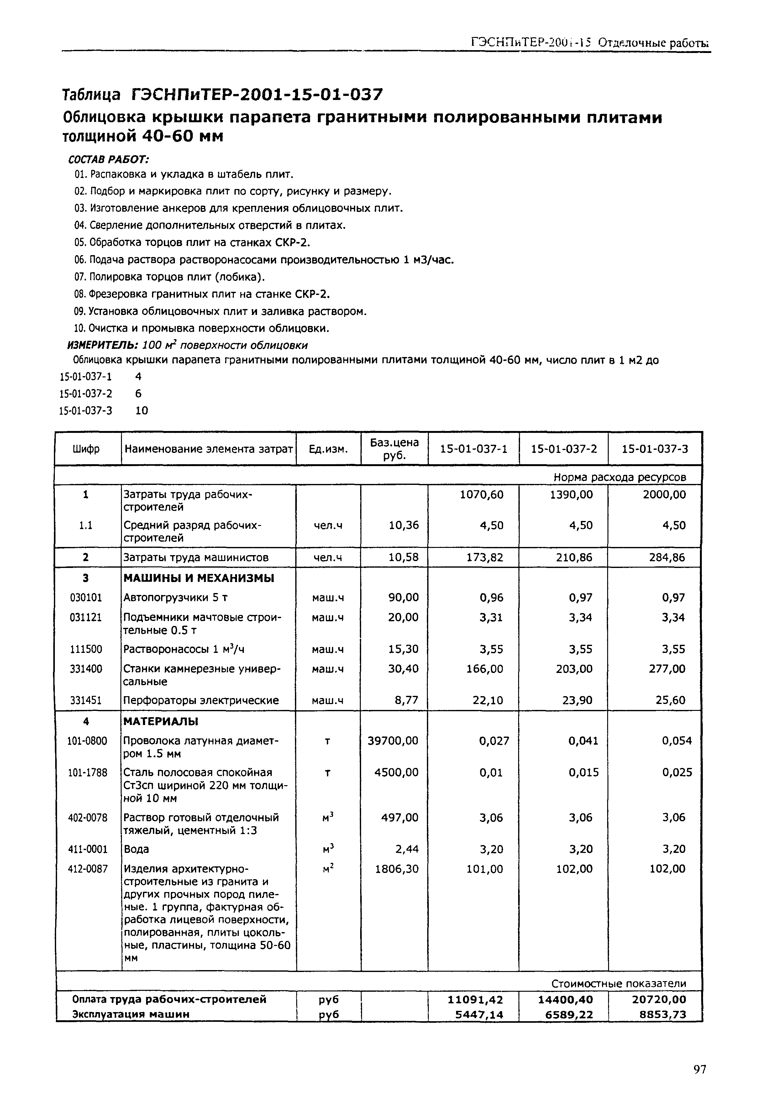 | Оглавление: | Техническая часть 1. Общие указания 2. Правила исчисления объемов работ 3. Коэффициенты к нормам и расценкам Таблица ГЭСНПиТЕР-2001-15-01-001 Облицовка стен гранитными плитами Таблица ГЭСНПиТЕР-2001-15-01-002 Облицовка стен плитами из известняка, мрамора и травертина Таблица ГЭСНПиТЕР-2001-15-01-003 Облицовка гранитными плитами Таблица ГЭСНПиТЕР-2001-15-01-004 Облицовка плитами из известняка, мрамора и травертина Таблица ГЭСНПиТЕР-2001-15-01-005 каждые 10 мм изменения толщины плит при облицовке стен и колонн Таблица ГЭСНПиТЕР-2001-15-01-006 При облицовке поверхностей природным камнем с прокладкой в горизонтальных швах свинца добавлять Таблица ГЭСНПиТЕР-2001-15-01-007 Облицовка поверхностей линейными полированными фасонными камнями Таблица ГЭСНПиТЕР-2001-15-01-008 Облицовка поверхностей линейными чистотесанными фасонными камнями Таблица ГЭСНПиТЕР-2001-15-01-009 Облицовка поверхностей полированными плитами толщиной 10 мм Таблица ГЭСНПиТЕР-2001-15-01-010 Облицовка мрамором ступеней и укладка мрамором плит Таблица ГЭСНПиТЕР-2001-15-01-016 Наружная облицовка по бетонной поверхности керамическими отдельными плитками Таблица ГЭСНПиТЕР-2001-15-01-017 Наружная облицовка по бетонной поверхности фасадными керамическими цветными плитками (типа "кабанчик") на цементном растворе Таблица ГЭСНПиТЕР-2001-15-01-018 Наружная облицовка по бетонной поверхности коврами из мелких керамических плиток на полимерцементной мастике Таблица ГЭСНПиТЕР-2001-15-01-019 Гладкая облицовка стен, столбов, пилястр и откосов (без карнизных, плинтусных и угловых плиток) Таблица ГЭСНПиТЕР-2001-15-01-020 Облицовка поверхностей с карнизными, плинтусными и угловыми плитками Таблица ГЭСНПиТЕР-2001-15-01-021 Устройство основания под облицовку искусственным мрамором Таблица ГЭСНПиТЕР-2001-15-01-022 Облицовка оселковым мрамором стен, столбов, колонн и пилястр Таблица ГЭСНПиТЕР-2001-15-01-023 Облицовка оселковым мрамором откосов, тяг, поясков, плинтусов и капителей Таблица ГЭСНПиТЕР-2001-15-01-024 Облицовка утюжным мрамором стен, столбов, колонн и пилястр Таблица ГЭСНПиТЕР-2001-15-01-025 Облицовка утюжным мрамором откосов, тяг, поясков, плинтусов и капителей Таблица ГЭСНПиТЕР-2001-15-01-031 Облицовка стен полированными плитами Таблица ГЭСНПиТЕР-2001-15-01-032 Облицовка полированными плитами колонн Таблица ГЭСНПиТЕР-2001-15-01-033 Облицовка плитами толщиной до 40 мм из туфа, известняка и ракушечника стен, пилястр, откосов, проемов Таблица ГЭСНПиТЕР-2001-15-01-034 Облицовка плитами толщиной до 40 мм из туфа, известняка и ракушечника колонн Таблица ГЭСНПиТЕР-2001-15-01-035 Устройство полов из полированных плит различной формы Таблица ГЭСНПиТЕР-2001-15-01-036 Облицовка арок полированными плитами Таблица ГЭСНПиТЕР-2001-15-01-037 Облицовка крышками парапета гранитными полированными плитами толщиной 40-60 мм Таблица ГЭСНПиТЕР-2001-15-01-038 Облицовка ступеней гранитными плитами Таблица ГЭСНПиТЕР-2001-15-01-039 Установка цельных гранитных ступеней толщиной 150 мм Таблица ГЭСНПиТЕР-2001-15-01-040 Устройство полов гладких или орнаментированных из полированных плит Таблица ГЭСНПиТЕР-2001-15-01-041 Облицовка пилястр, откосов полированными плитами из мрамора |