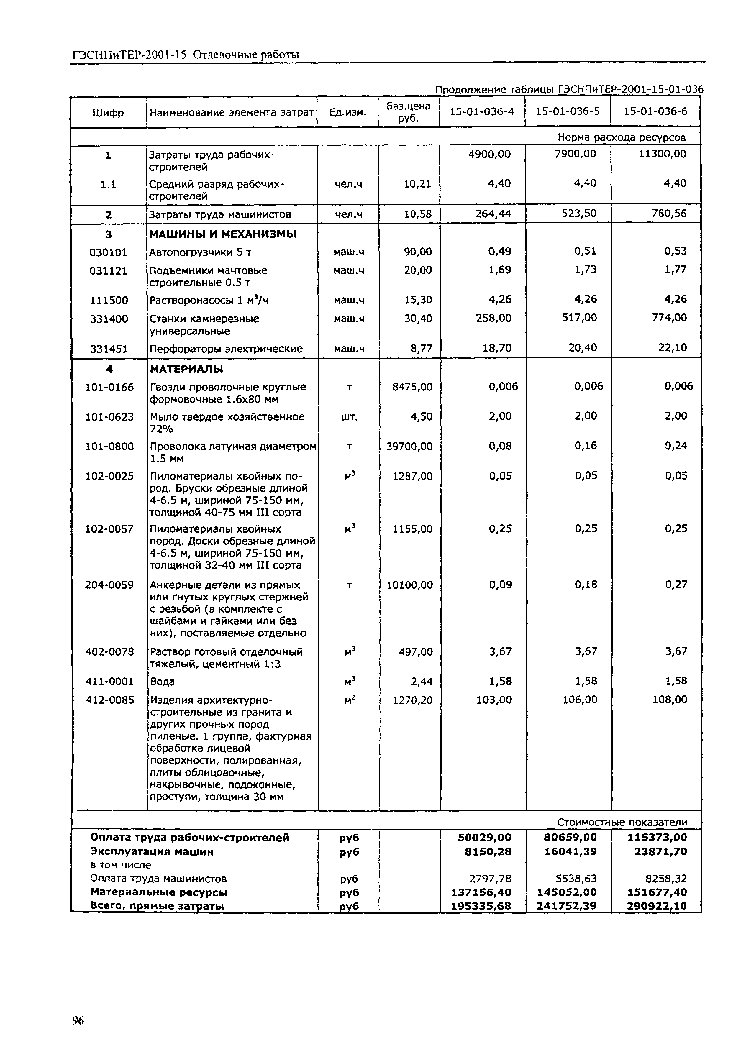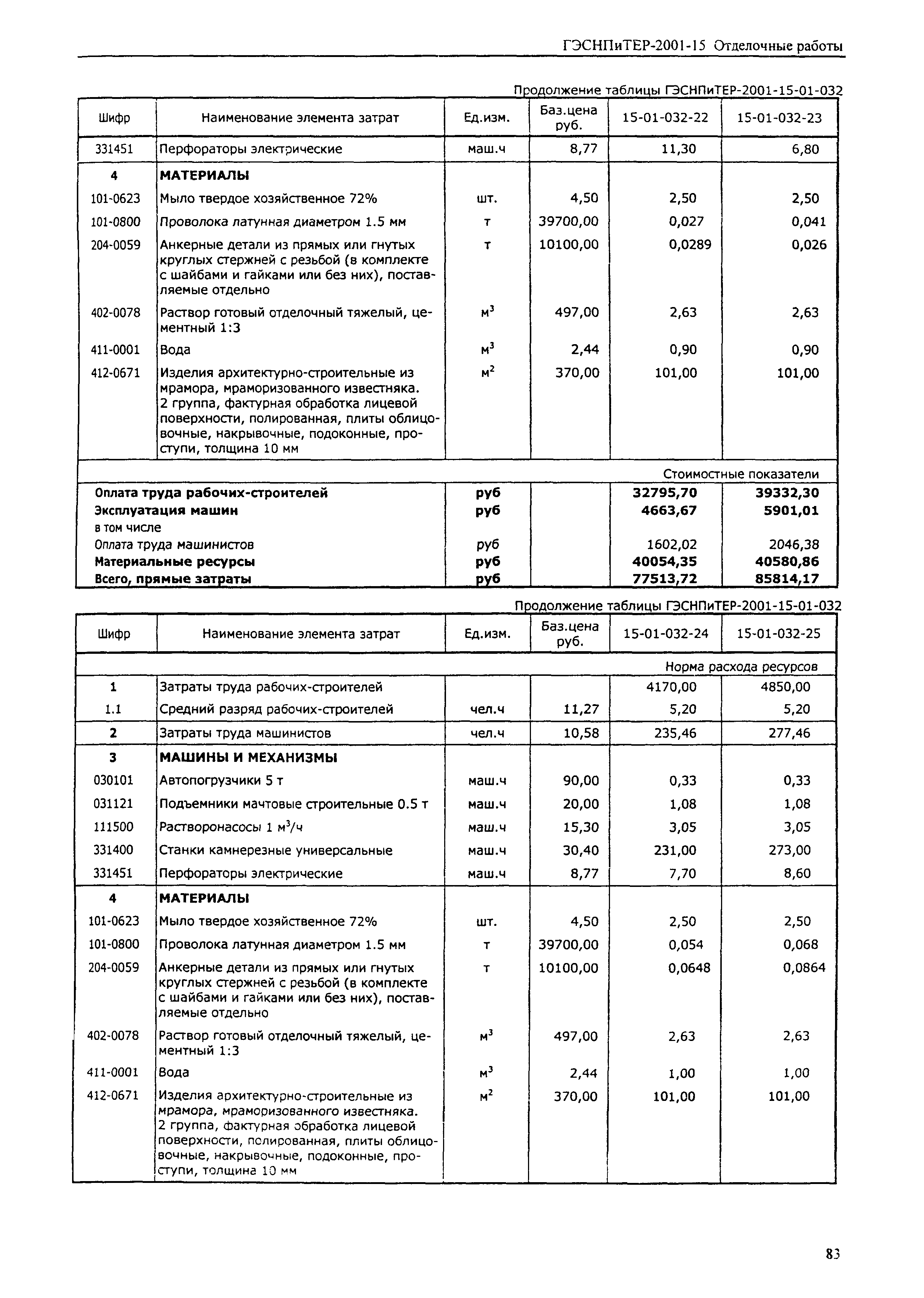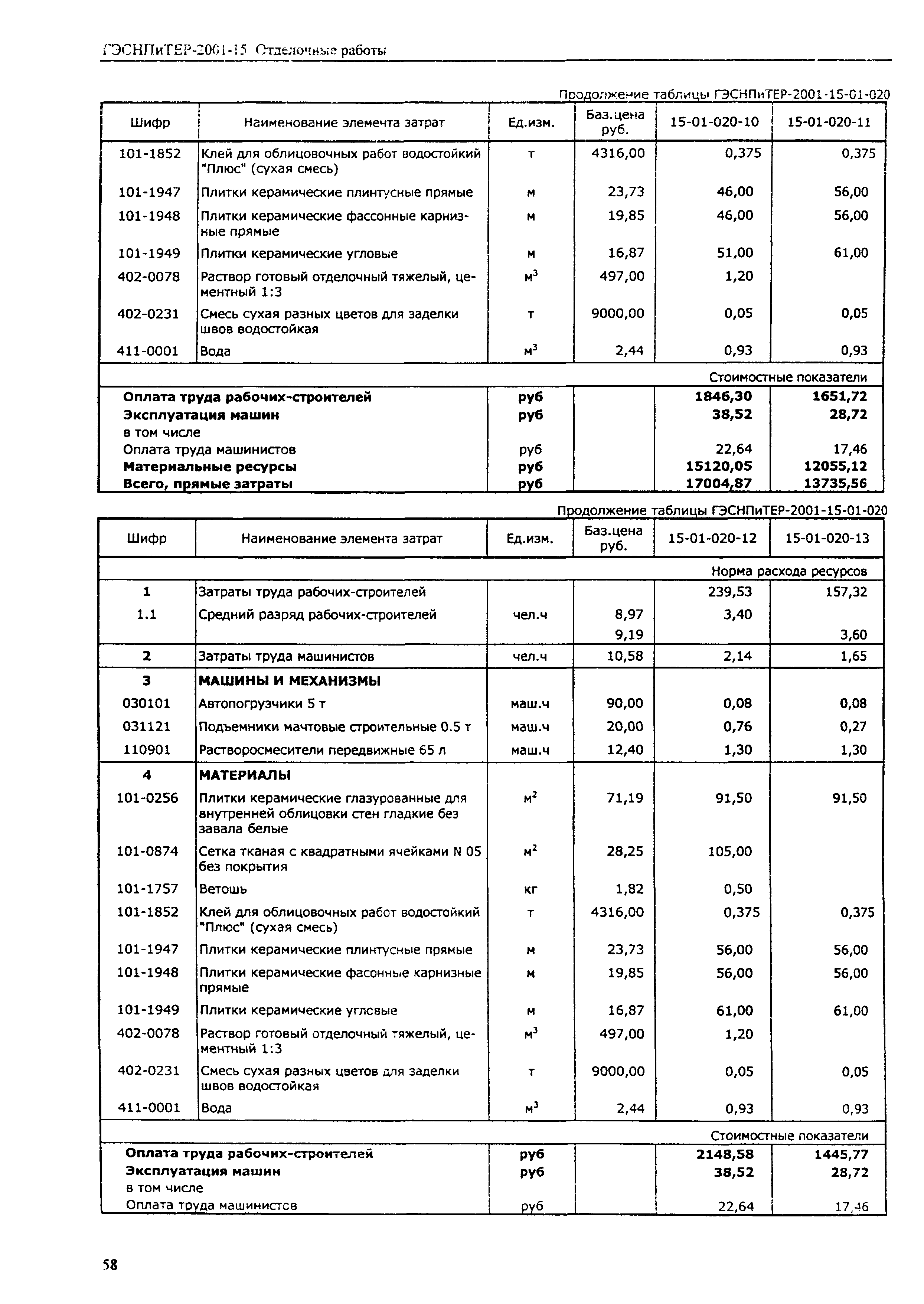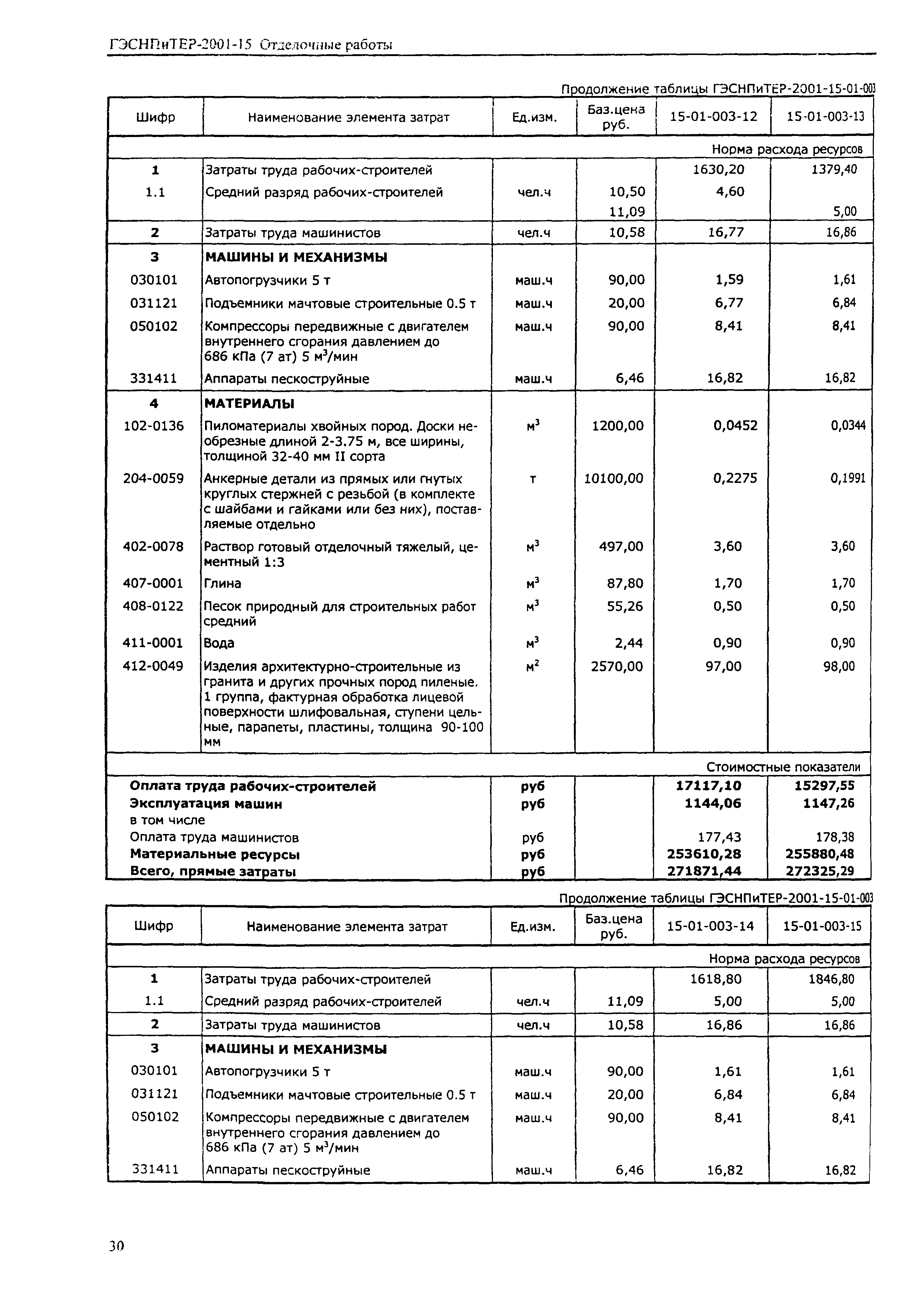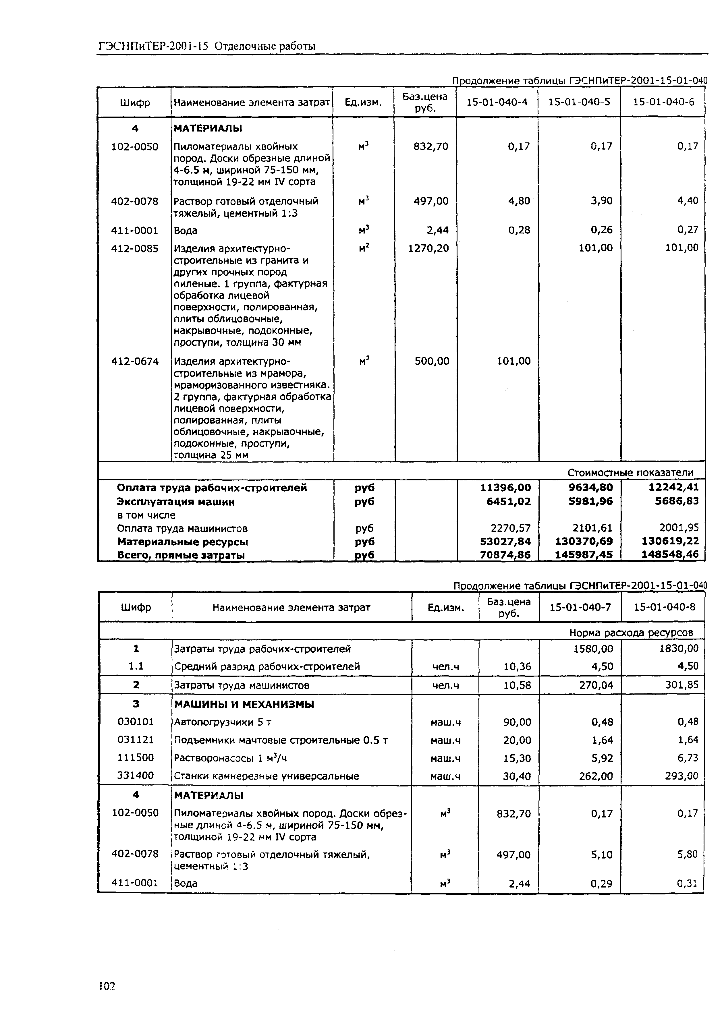 | Оглавление: | Техническая часть 1. Общие указания 2. Правила исчисления объемов работ 3. Коэффициенты к нормам и расценкам Таблица ГЭСНПиТЕР-2001-15-01-001 Облицовка стен гранитными плитами Таблица ГЭСНПиТЕР-2001-15-01-002 Облицовка стен плитами из известняка, мрамора и травертина Таблица ГЭСНПиТЕР-2001-15-01-003 Облицовка гранитными плитами Таблица ГЭСНПиТЕР-2001-15-01-004 Облицовка плитами из известняка, мрамора и травертина Таблица ГЭСНПиТЕР-2001-15-01-005 каждые 10 мм изменения толщины плит при облицовке стен и колонн Таблица ГЭСНПиТЕР-2001-15-01-006 При облицовке поверхностей природным камнем с прокладкой в горизонтальных швах свинца добавлять Таблица ГЭСНПиТЕР-2001-15-01-007 Облицовка поверхностей линейными полированными фасонными камнями Таблица ГЭСНПиТЕР-2001-15-01-008 Облицовка поверхностей линейными чистотесанными фасонными камнями Таблица ГЭСНПиТЕР-2001-15-01-009 Облицовка поверхностей полированными плитами толщиной 10 мм Таблица ГЭСНПиТЕР-2001-15-01-010 Облицовка мрамором ступеней и укладка мрамором плит Таблица ГЭСНПиТЕР-2001-15-01-016 Наружная облицовка по бетонной поверхности керамическими отдельными плитками Таблица ГЭСНПиТЕР-2001-15-01-017 Наружная облицовка по бетонной поверхности фасадными керамическими цветными плитками (типа "кабанчик") на цементном растворе Таблица ГЭСНПиТЕР-2001-15-01-018 Наружная облицовка по бетонной поверхности коврами из мелких керамических плиток на полимерцементной мастике Таблица ГЭСНПиТЕР-2001-15-01-019 Гладкая облицовка стен, столбов, пилястр и откосов (без карнизных, плинтусных и угловых плиток) Таблица ГЭСНПиТЕР-2001-15-01-020 Облицовка поверхностей с карнизными, плинтусными и угловыми плитками Таблица ГЭСНПиТЕР-2001-15-01-021 Устройство основания под облицовку искусственным мрамором Таблица ГЭСНПиТЕР-2001-15-01-022 Облицовка оселковым мрамором стен, столбов, колонн и пилястр Таблица ГЭСНПиТЕР-2001-15-01-023 Облицовка оселковым мрамором откосов, тяг, поясков, плинтусов и капителей Таблица ГЭСНПиТЕР-2001-15-01-024 Облицовка утюжным мрамором стен, столбов, колонн и пилястр Таблица ГЭСНПиТЕР-2001-15-01-025 Облицовка утюжным мрамором откосов, тяг, поясков, плинтусов и капителей Таблица ГЭСНПиТЕР-2001-15-01-031 Облицовка стен полированными плитами Таблица ГЭСНПиТЕР-2001-15-01-032 Облицовка полированными плитами колонн Таблица ГЭСНПиТЕР-2001-15-01-033 Облицовка плитами толщиной до 40 мм из туфа, известняка и ракушечника стен, пилястр, откосов, проемов Таблица ГЭСНПиТЕР-2001-15-01-034 Облицовка плитами толщиной до 40 мм из туфа, известняка и ракушечника колонн Таблица ГЭСНПиТЕР-2001-15-01-035 Устройство полов из полированных плит различной формы Таблица ГЭСНПиТЕР-2001-15-01-036 Облицовка арок полированными плитами Таблица ГЭСНПиТЕР-2001-15-01-037 Облицовка крышками парапета гранитными полированными плитами толщиной 40-60 мм Таблица ГЭСНПиТЕР-2001-15-01-038 Облицовка ступеней гранитными плитами Таблица ГЭСНПиТЕР-2001-15-01-039 Установка цельных гранитных ступеней толщиной 150 мм Таблица ГЭСНПиТЕР-2001-15-01-040 Устройство полов гладких или орнаментированных из полированных плит Таблица ГЭСНПиТЕР-2001-15-01-041 Облицовка пилястр, откосов полированными плитами из мрамора |