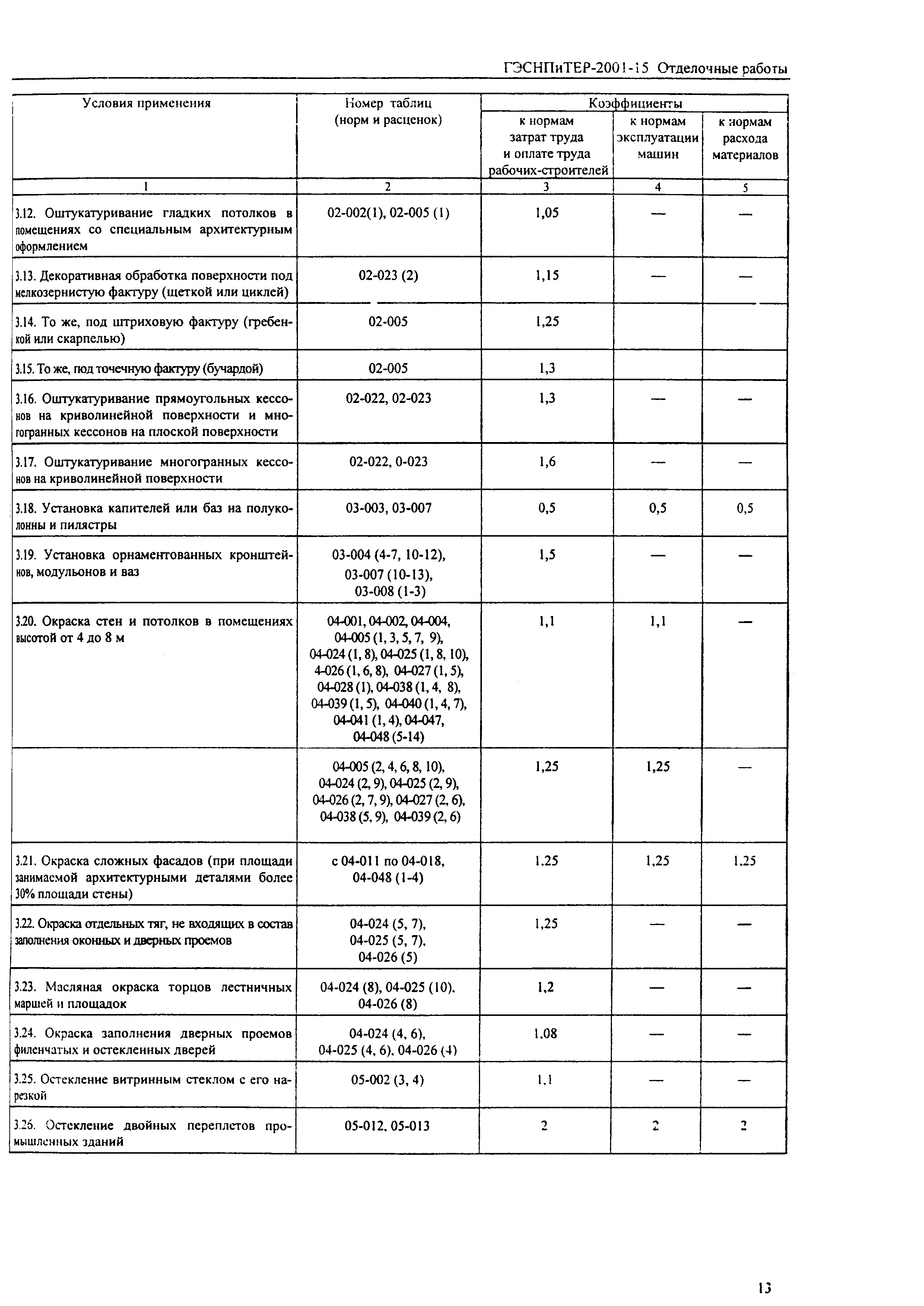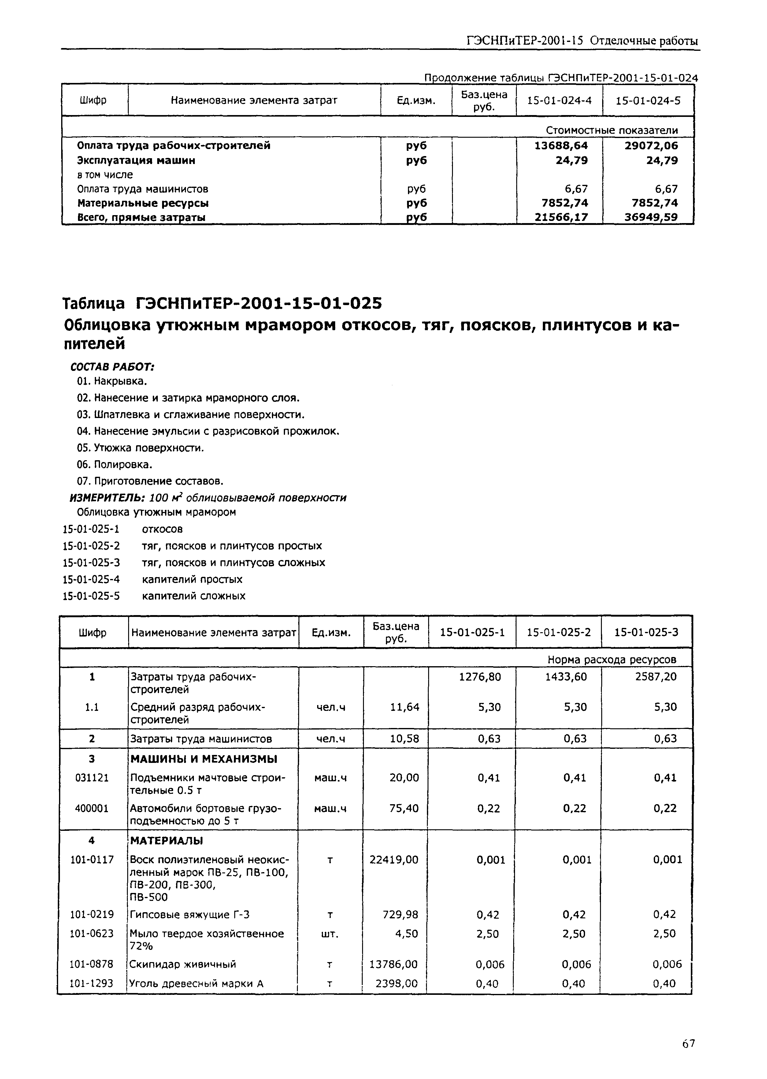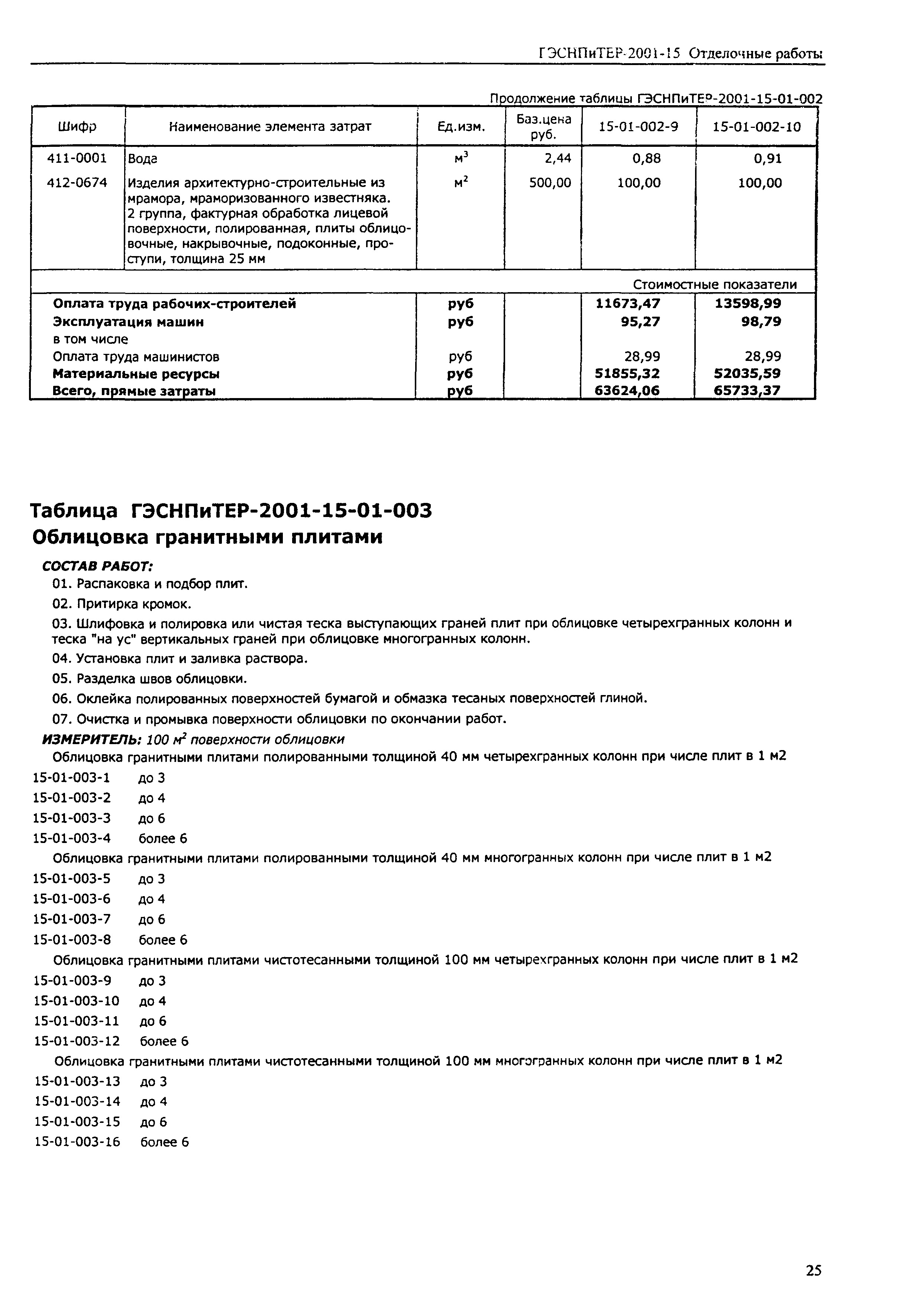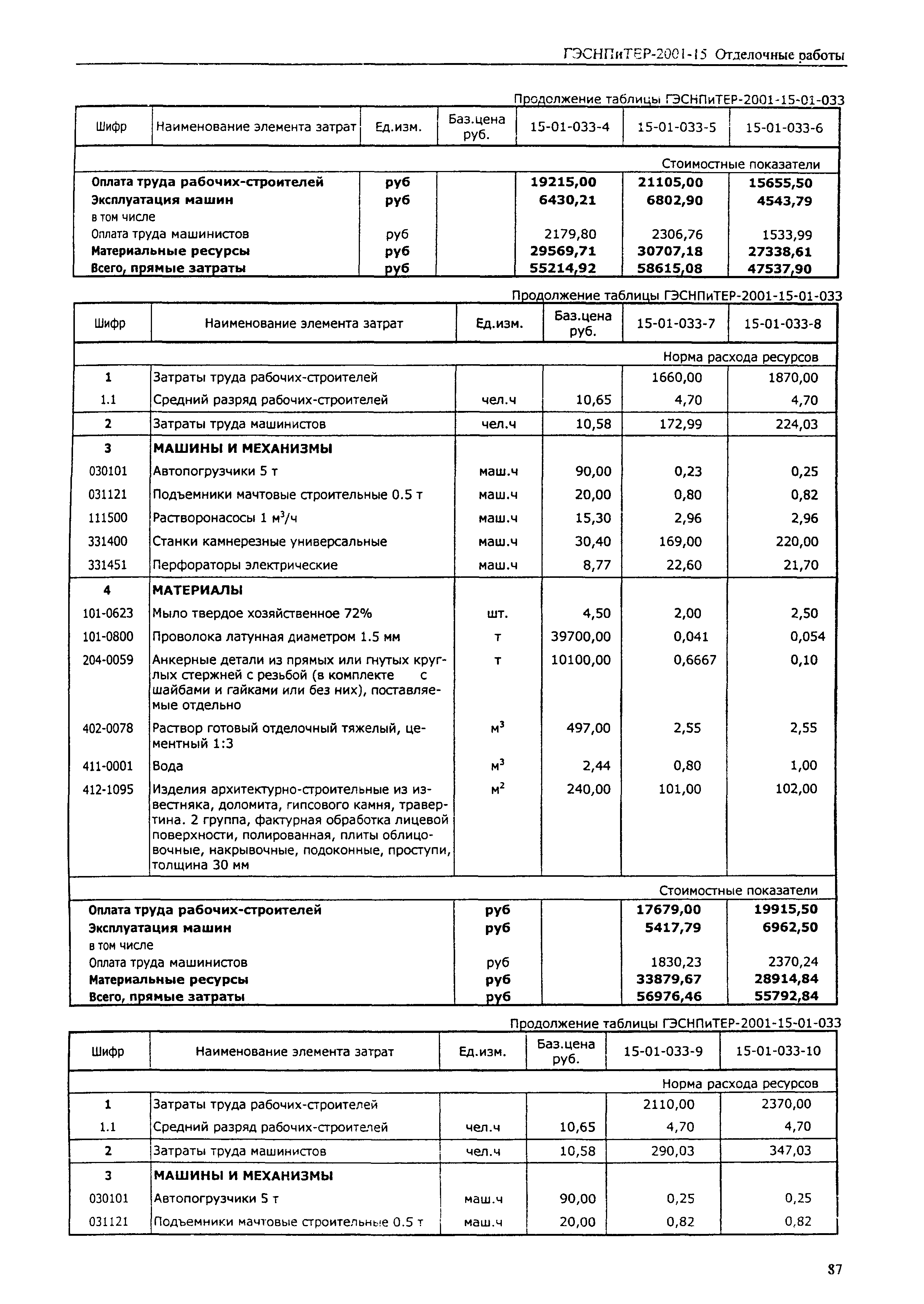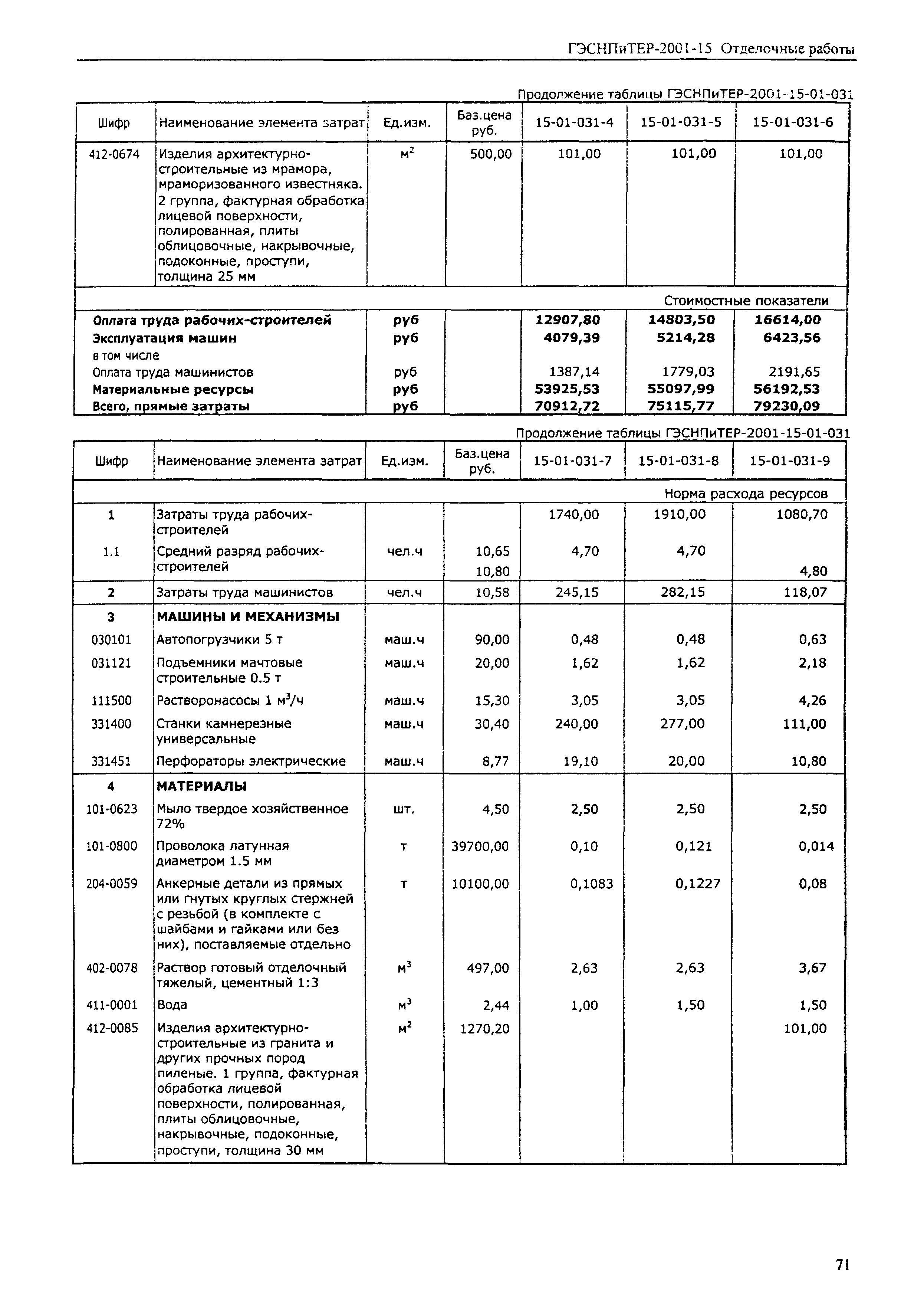 | Оглавление: | Техническая часть 1. Общие указания 2. Правила исчисления объемов работ 3. Коэффициенты к нормам и расценкам Таблица ГЭСНПиТЕР-2001-15-01-001 Облицовка стен гранитными плитами Таблица ГЭСНПиТЕР-2001-15-01-002 Облицовка стен плитами из известняка, мрамора и травертина Таблица ГЭСНПиТЕР-2001-15-01-003 Облицовка гранитными плитами Таблица ГЭСНПиТЕР-2001-15-01-004 Облицовка плитами из известняка, мрамора и травертина Таблица ГЭСНПиТЕР-2001-15-01-005 каждые 10 мм изменения толщины плит при облицовке стен и колонн Таблица ГЭСНПиТЕР-2001-15-01-006 При облицовке поверхностей природным камнем с прокладкой в горизонтальных швах свинца добавлять Таблица ГЭСНПиТЕР-2001-15-01-007 Облицовка поверхностей линейными полированными фасонными камнями Таблица ГЭСНПиТЕР-2001-15-01-008 Облицовка поверхностей линейными чистотесанными фасонными камнями Таблица ГЭСНПиТЕР-2001-15-01-009 Облицовка поверхностей полированными плитами толщиной 10 мм Таблица ГЭСНПиТЕР-2001-15-01-010 Облицовка мрамором ступеней и укладка мрамором плит Таблица ГЭСНПиТЕР-2001-15-01-016 Наружная облицовка по бетонной поверхности керамическими отдельными плитками Таблица ГЭСНПиТЕР-2001-15-01-017 Наружная облицовка по бетонной поверхности фасадными керамическими цветными плитками (типа "кабанчик") на цементном растворе Таблица ГЭСНПиТЕР-2001-15-01-018 Наружная облицовка по бетонной поверхности коврами из мелких керамических плиток на полимерцементной мастике Таблица ГЭСНПиТЕР-2001-15-01-019 Гладкая облицовка стен, столбов, пилястр и откосов (без карнизных, плинтусных и угловых плиток) Таблица ГЭСНПиТЕР-2001-15-01-020 Облицовка поверхностей с карнизными, плинтусными и угловыми плитками Таблица ГЭСНПиТЕР-2001-15-01-021 Устройство основания под облицовку искусственным мрамором Таблица ГЭСНПиТЕР-2001-15-01-022 Облицовка оселковым мрамором стен, столбов, колонн и пилястр Таблица ГЭСНПиТЕР-2001-15-01-023 Облицовка оселковым мрамором откосов, тяг, поясков, плинтусов и капителей Таблица ГЭСНПиТЕР-2001-15-01-024 Облицовка утюжным мрамором стен, столбов, колонн и пилястр Таблица ГЭСНПиТЕР-2001-15-01-025 Облицовка утюжным мрамором откосов, тяг, поясков, плинтусов и капителей Таблица ГЭСНПиТЕР-2001-15-01-031 Облицовка стен полированными плитами Таблица ГЭСНПиТЕР-2001-15-01-032 Облицовка полированными плитами колонн Таблица ГЭСНПиТЕР-2001-15-01-033 Облицовка плитами толщиной до 40 мм из туфа, известняка и ракушечника стен, пилястр, откосов, проемов Таблица ГЭСНПиТЕР-2001-15-01-034 Облицовка плитами толщиной до 40 мм из туфа, известняка и ракушечника колонн Таблица ГЭСНПиТЕР-2001-15-01-035 Устройство полов из полированных плит различной формы Таблица ГЭСНПиТЕР-2001-15-01-036 Облицовка арок полированными плитами Таблица ГЭСНПиТЕР-2001-15-01-037 Облицовка крышками парапета гранитными полированными плитами толщиной 40-60 мм Таблица ГЭСНПиТЕР-2001-15-01-038 Облицовка ступеней гранитными плитами Таблица ГЭСНПиТЕР-2001-15-01-039 Установка цельных гранитных ступеней толщиной 150 мм Таблица ГЭСНПиТЕР-2001-15-01-040 Устройство полов гладких или орнаментированных из полированных плит Таблица ГЭСНПиТЕР-2001-15-01-041 Облицовка пилястр, откосов полированными плитами из мрамора |