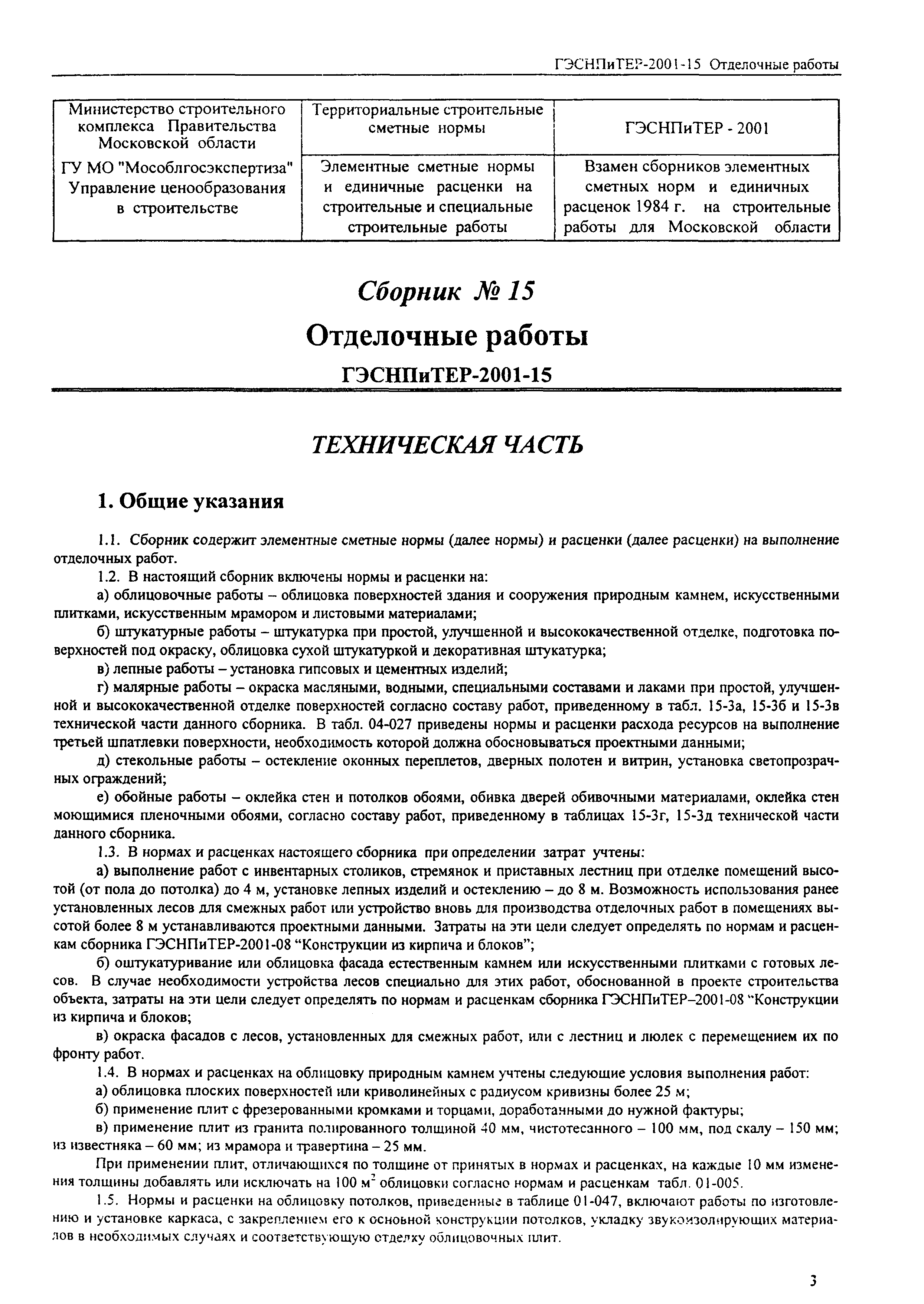 Скачать ГЭСНПиТЕР 2001-15 (I) Отделочные работы. Часть I. Территориальные единичные расценки, сметные нормы и цены на строительные и специальные строительные работы. Пособие для сметчиков к ТЕР 81-02-2001Дата актуализации: 01.01.2021