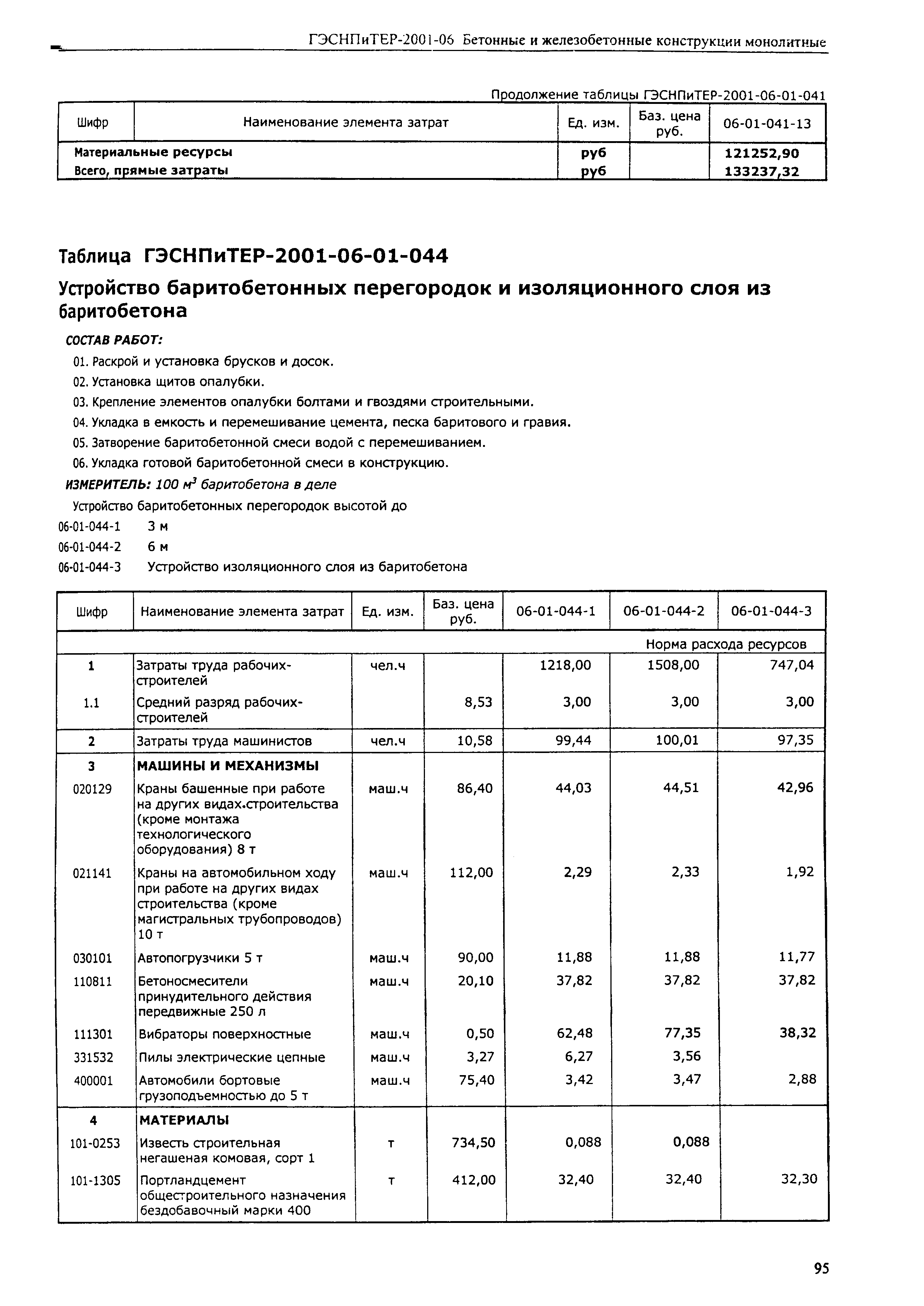 | Оглавление: | Техническая часть 1. Общие указания 2. Правила исчисления объемов работ 3. Коэффициенты к нормам и расценкам Таблица ГЭСНПиТЕР-2001-06-01-001 Устройство бетонной подготовки и фундаментов общего назначения Таблица ГЭСНПиТЕР-2001-06-01-002 Устройство фундаментов под фабрично-заводские трубы и под доменные печи Таблица ГЭСНПиТЕР-2001-06-01-005 Устройство фундаментов общего назначения Таблица ГЭСНПиТЕР-2001-06-01-006 Устройство фундаментов под оборудование прокатных цехов с листовыми станами Таблица ГЭСНПиТЕР-2001-06-01-007 Устройство фундаментов под оборудование прокатных цехов с сортовыми станами Таблица ГЭСНПиТЕР-2001-06-01-008 Устройство сгустителей обогатительных и агломерационных фабрик Таблица ГЭСНПиТЕР-2001-06-01-009 Устройство фундаментов и сооружений на предприятиях целлюлозно-бумажной промышленности Таблица ГЭСНПиТЕР-2001-06-01-012 Устройство опалубки (снизу) и поддерживающих ее конструкций для высоких ростверков Таблица ГЭСНПиТЕР-2001-06-01-013 Устройство подливки толщиной 20 мм Таблица ГЭСНПиТЕР-2001-06-01-014 Укладка бетона по перекрытиям толщиной 100 мм Таблица ГЭСНПиТЕР-2001-06-01-015 Установка анкерных болтов Таблица ГЭСНПиТЕР-2001-06-01-016 Сварка арматуры ванным способом Таблица ГЭСНПиТЕР-2001-06-01-017 Технологический электропрогрев бетона Таблица ГЭСНПиТЕР-2001-06-01-018 Устройство деформационного осадочного шва фундаментов под оборудование с заполнением битумом Таблица ГЭСНПиТЕР-2001-06-01-024 Устройство стен подвалов и подпорных стен Таблица ГЭСНПиТЕР-2001-06-01-026 Устройство колонн в деревянной опалубке Таблица ГЭСНПиТЕР-2001-06-01-027 Устройство колонн гражданских зданий в металлической опалубке Таблица ГЭСНПиТЕР-2001-06-01-030 Устройство стен и перегородок бетонных и легкобетонных Таблица ГЭСНПиТЕР-2001-06-01-031 Устройство железобетонных стен и перегородок Таблица ГЭСНПиТЕР-2001-06-01-034 Устройство балок, перемычек Таблица ГЭСНПиТЕР-2001-06-01-035 Устройство поясов Таблица ГЭСНПиТЕР-2001-06-01-036 Устройство засыпки фундаментных балок Таблица ГЭСНПиТЕР-2001-06-01-037 Устройство ригелей гражданских зданий в металлической опалубке Таблица ГЭСНПиТЕР-2001-06-01-041 Устройство перекрытий Таблица ГЭСНПиТЕР-2001-06-01-044 Устройство баритобетонных перегородок и изоляционного слоя из баритобетона Таблица ГЭСНПиТЕР-2001-06-01-046 Устройство стен, днищ и перекрытий тоннелей и проходных каналов Таблица ГЭСНПиТЕР-2001-06-01-049 Устройство бункеров общего назначения |