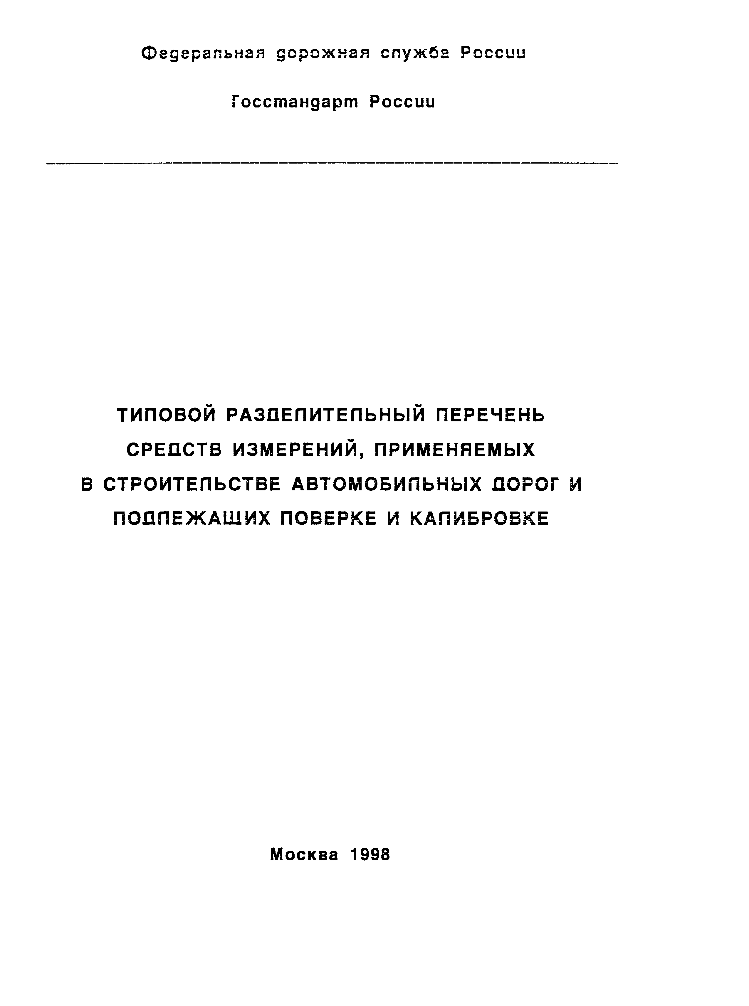 Типовой разделительный перечень средств измерений, применяемых в строительстве автомобильных дорог и подлежащих поверке и калибровке| Статус: | введен впервые | | Название рус.: | Типовой разделительный перечень средств измерений, применяемых в строительстве автомобильных дорог и подлежащих поверке и калибровке | | Дата добавления в базу: | 01.09.2013 | | Дата актуализации: | 01.01.2021 | | Дата введения: | 04.08.1997 | | Оглавление: | 1. Средства измерения механических величин 2. Средства измерения геометрических величин 3. Средства измерений объема, вместимости, параметров, расхода и уровня 4. Средства измерения давления и вакуума 5. Средства физико-химического состава и специальных свойств материалов и веществ 6. Средства измерения температуры и теплофизических характеристик 7. Средства измерения времени и частоты 8. Средства измерения электрических, магнитных и радиотехнических величин 9. Оптические и оптико-физические средства измерений 10. Средства измерения акустических и вибрационных характеристик 11. Средства измерения характеристик ионизирующих излучений 12. Средства измерений, применяемые в неразрушающем контроле и ускоренных испытаниях строительных материалов, изделий и конструкций | | Разработан: | Федеральная дирекция лабораторного контроля и обследования автомобильных дорог Федеральной дорожной службы России